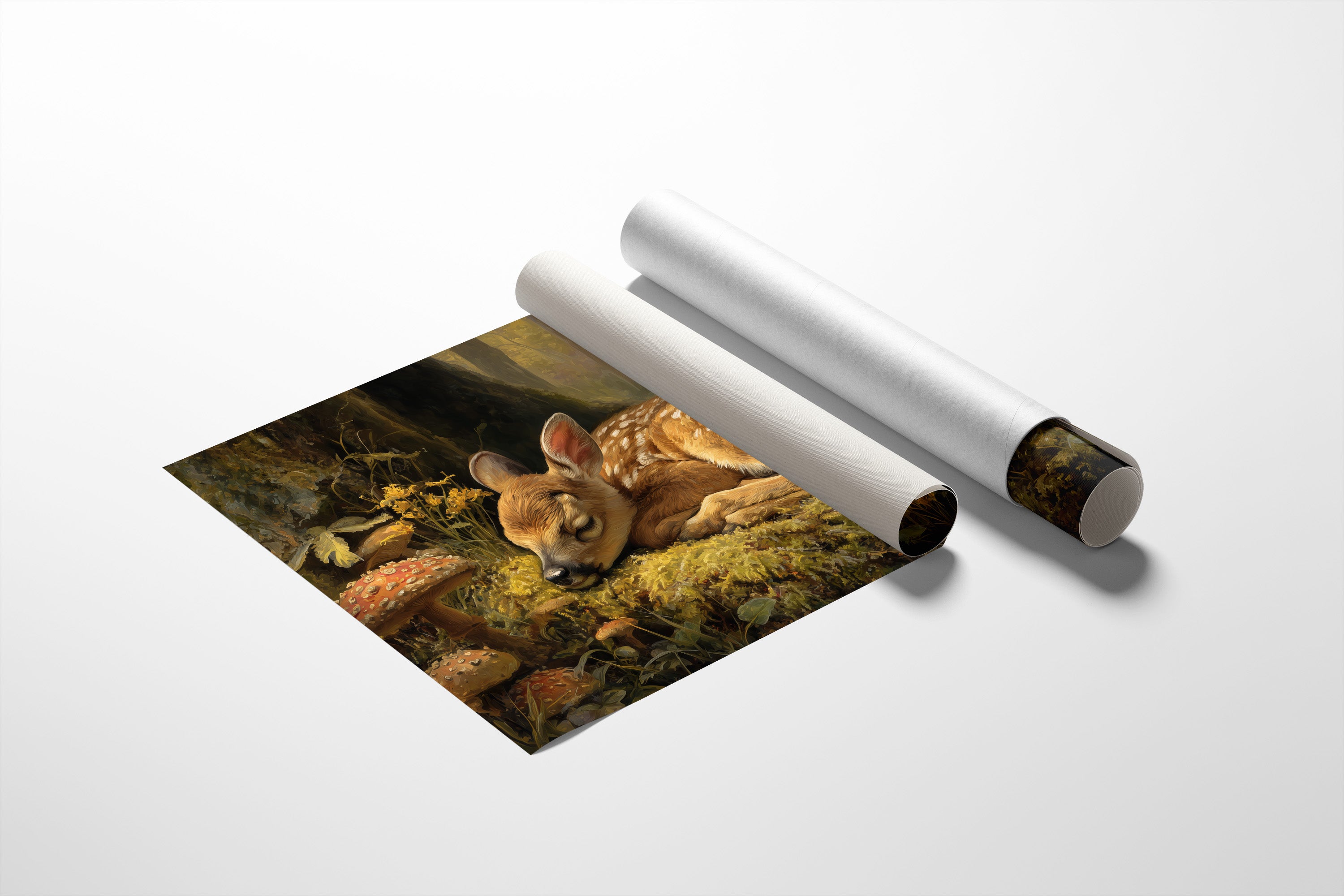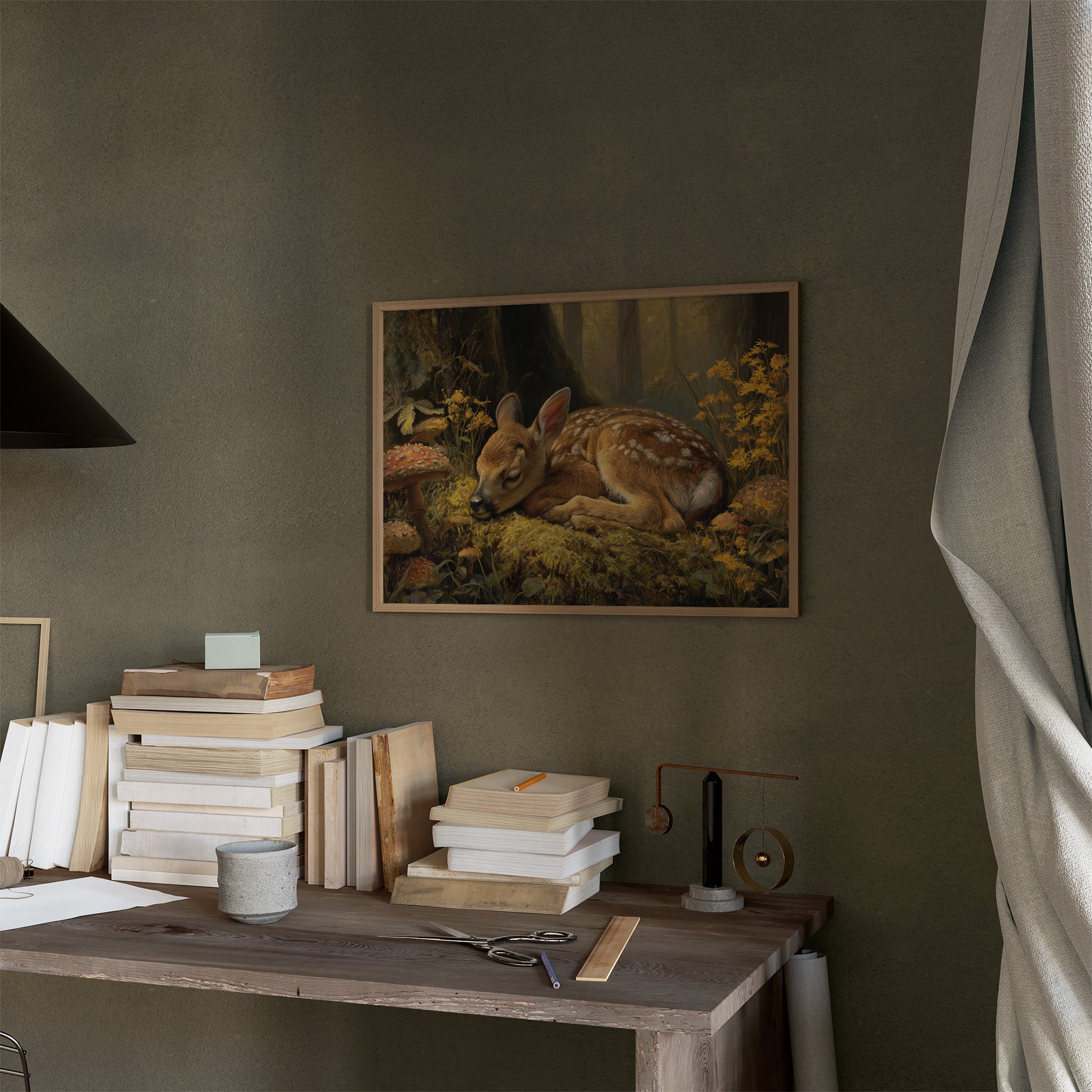 Sunlight filters through a misty forest, illuminating a peaceful scene where a spotted fawn rests among wildflowers. The painting captures that fleeting moment of perfect tranquility, with mushrooms and moss creating a natural cradle for the sleeping deer. Rich amber tones blend with forest greens and delicate yellow blooms, creating a harmonious sanctuary that feels both protected and wild. This nostalgic piece brings a touch of woodland serenity to a home library, study, or reading nook.