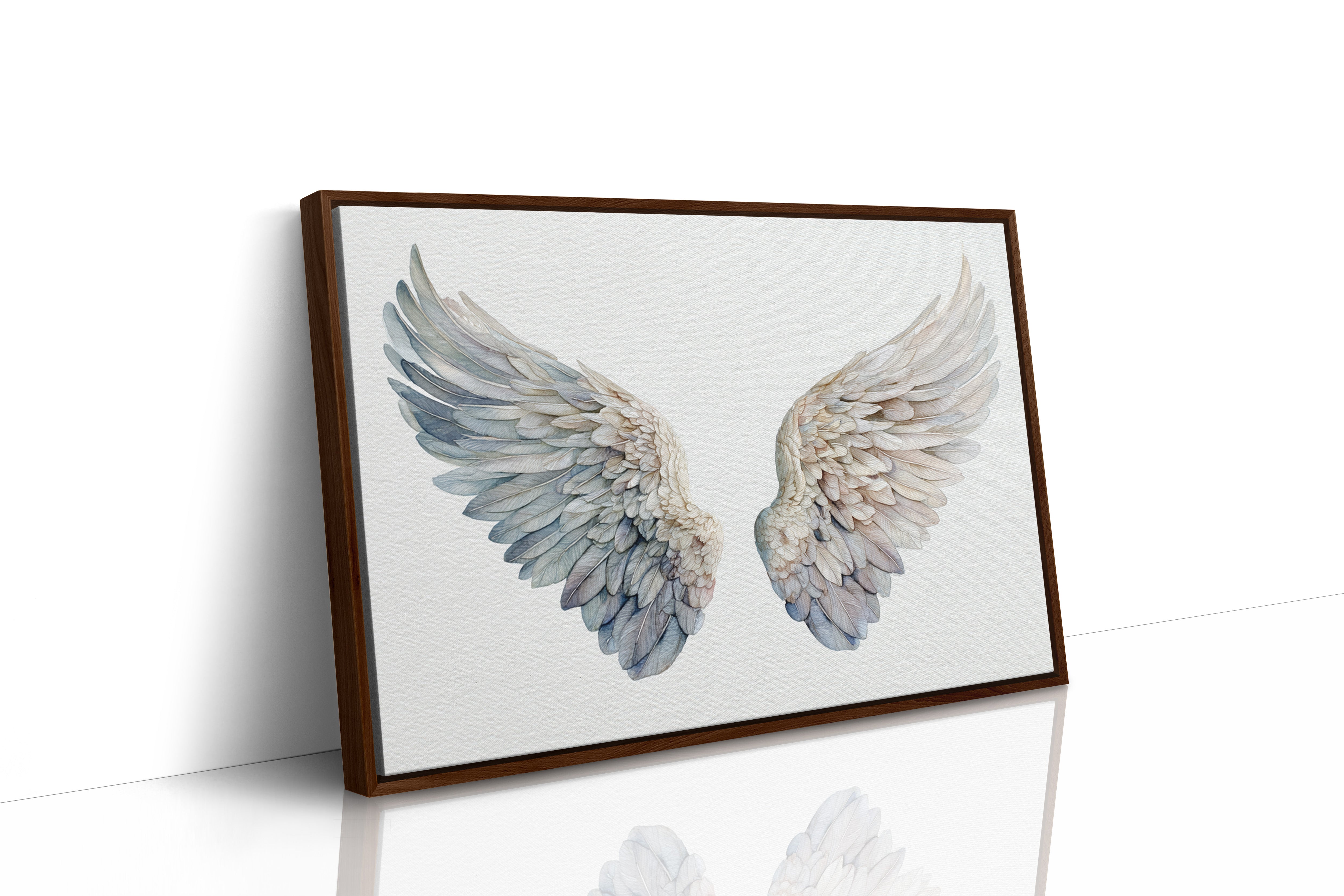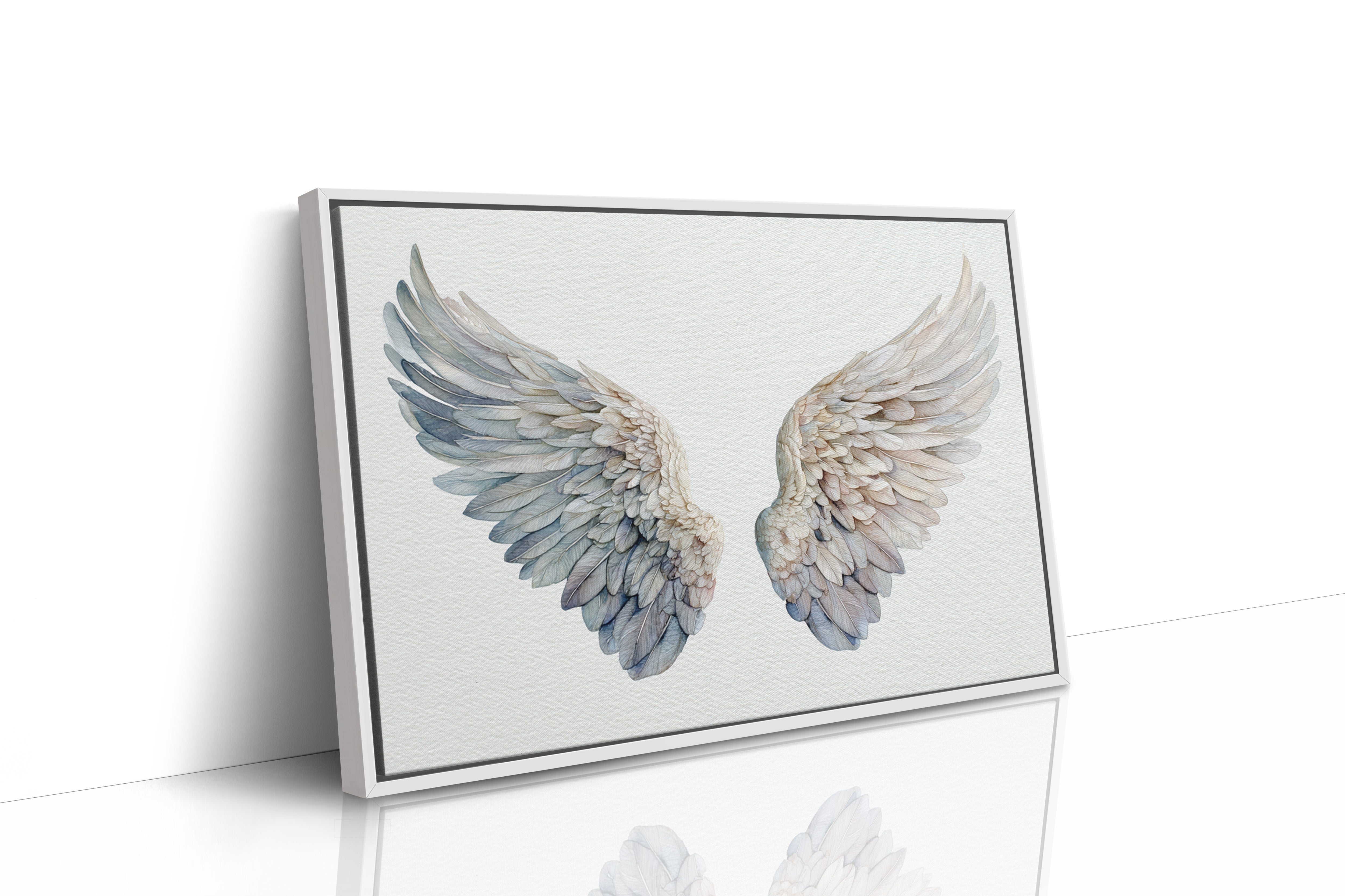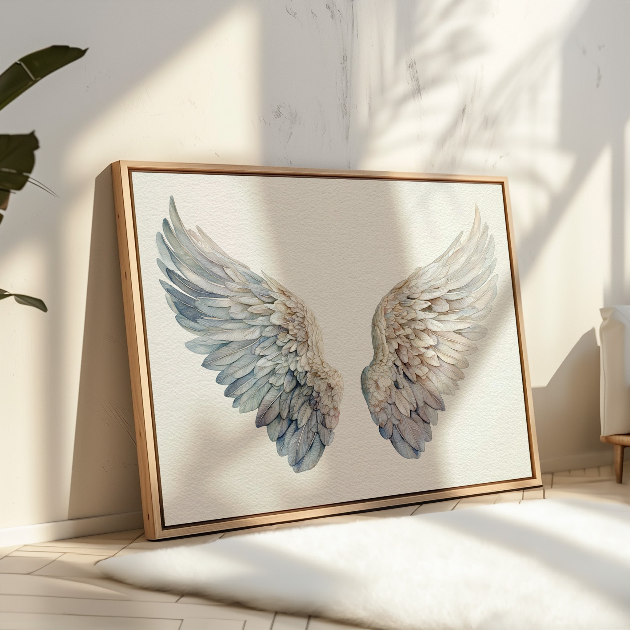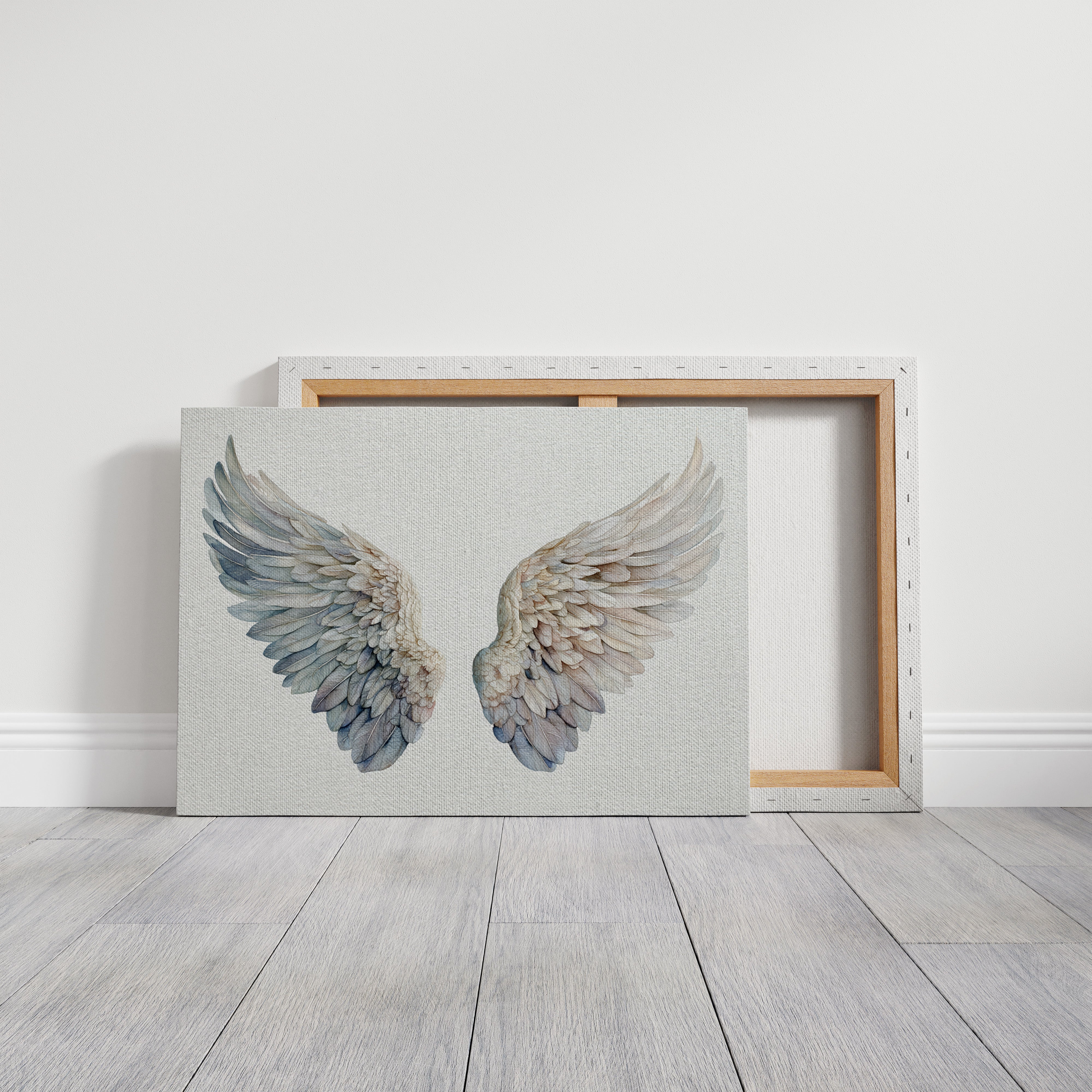 Delicate watercolors blend seamlessly across angelic wings, creating a ethereal dance of blue-grey and cream tones. Each feather is meticulously detailed, revealing the intricate layers and subtle curves that nature perfects. The composition speaks to both strength and fragility, with the wings spread in perfect symmetry against the pure white background. This piece brings a sense of peace and elevation to any space, making it ideal for a serene bedroom sanctuary or meditation room where its gentle presence can inspire moments of reflection.