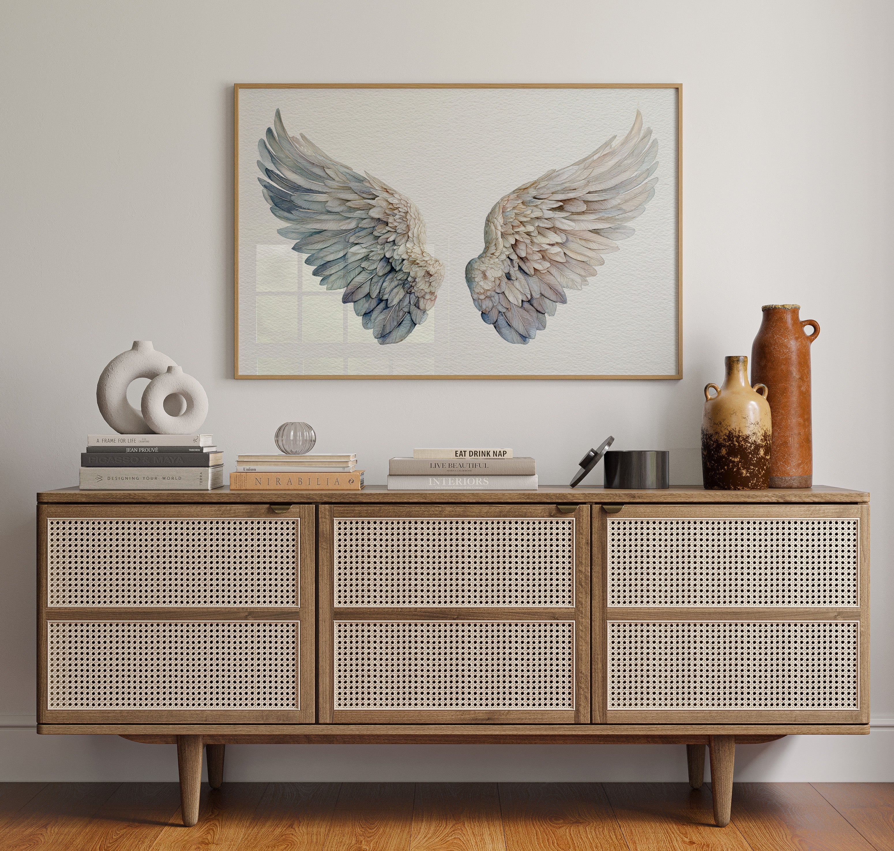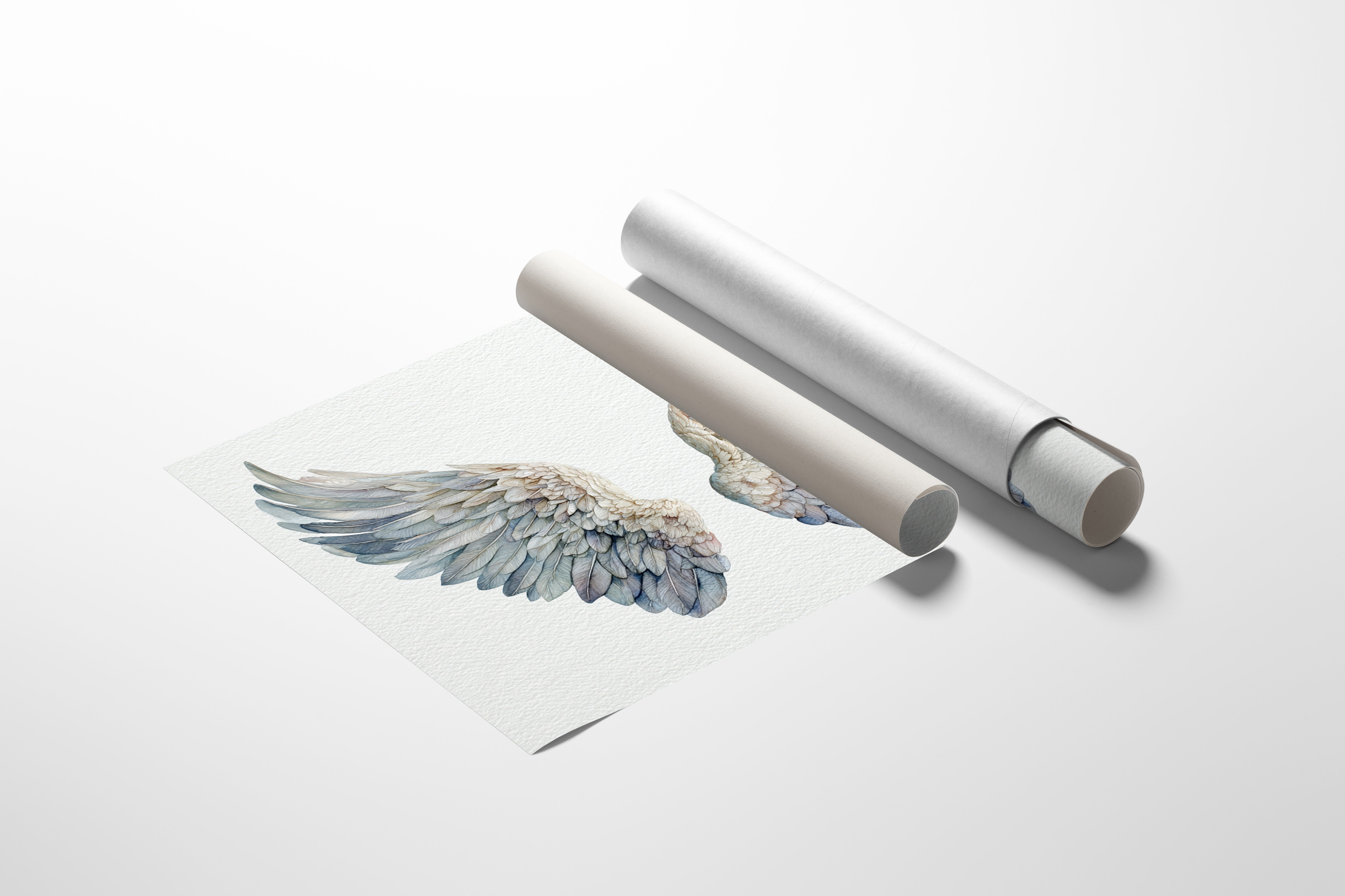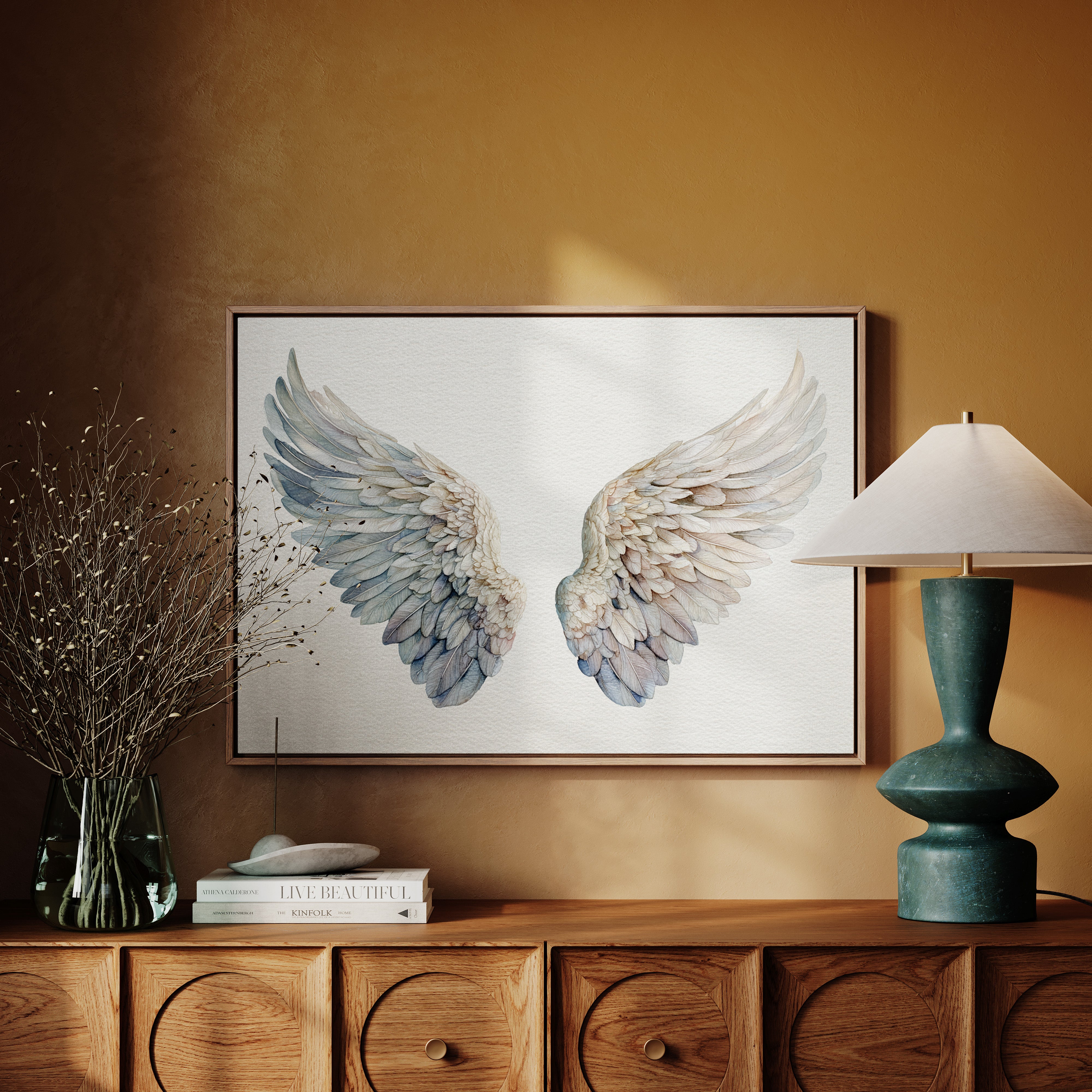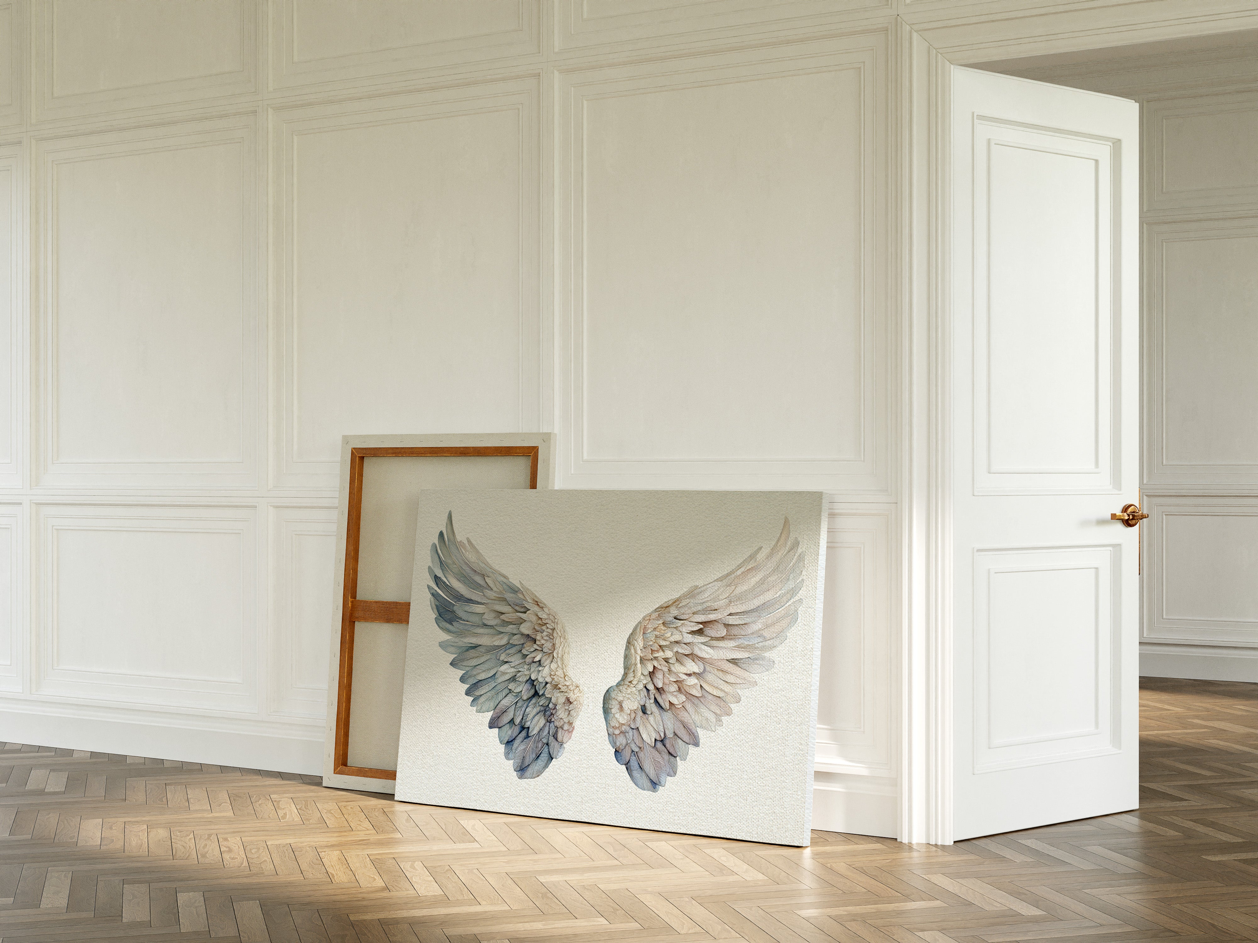 Delicate watercolors blend seamlessly across angelic wings, creating a ethereal dance of blue-grey and cream tones. Each feather is meticulously detailed, revealing the intricate layers and subtle curves that nature perfects. The composition speaks to both strength and fragility, with the wings spread in perfect symmetry against the pure white background. This piece brings a sense of peace and elevation to any space, making it ideal for a serene bedroom sanctuary or meditation room where its gentle presence can inspire moments of reflection.