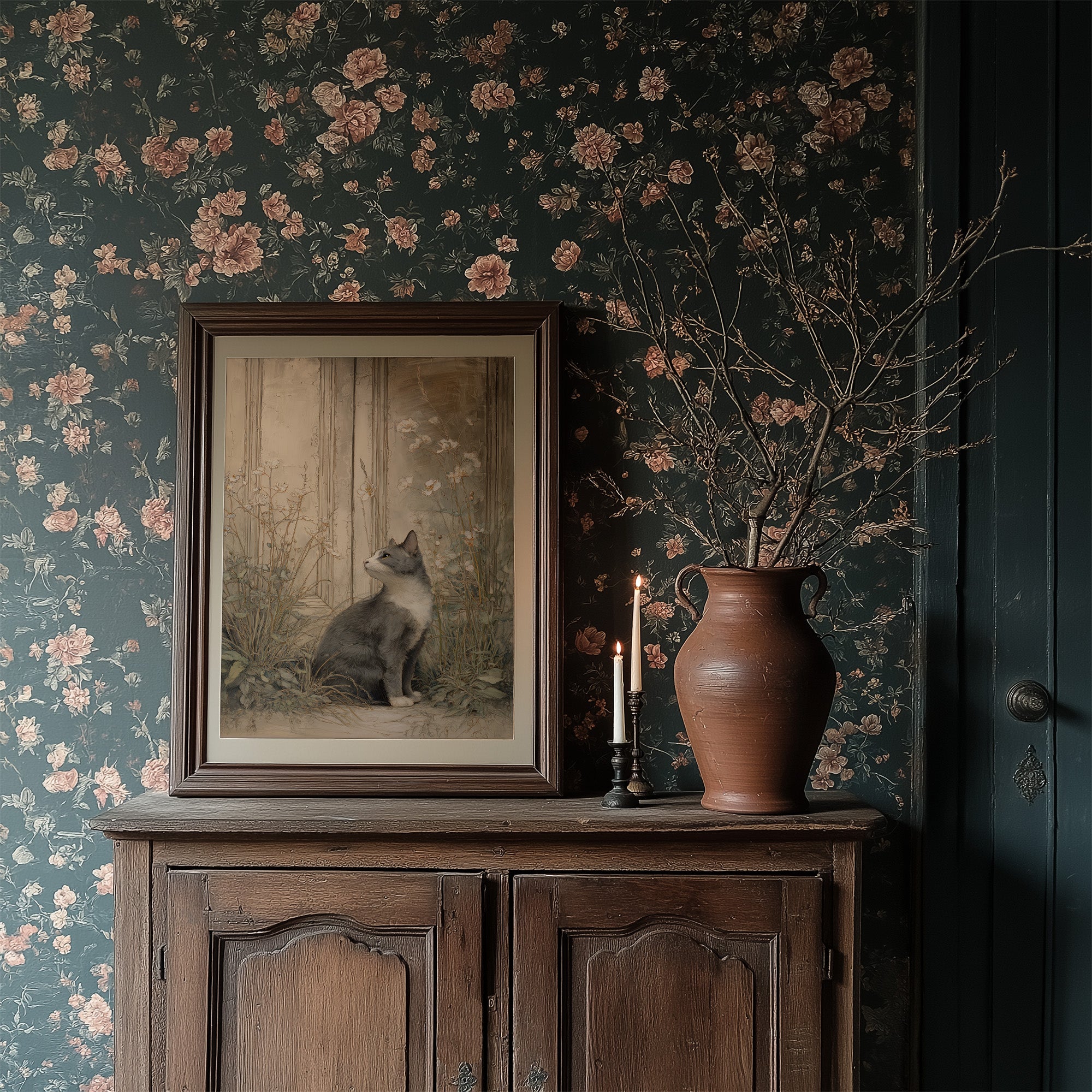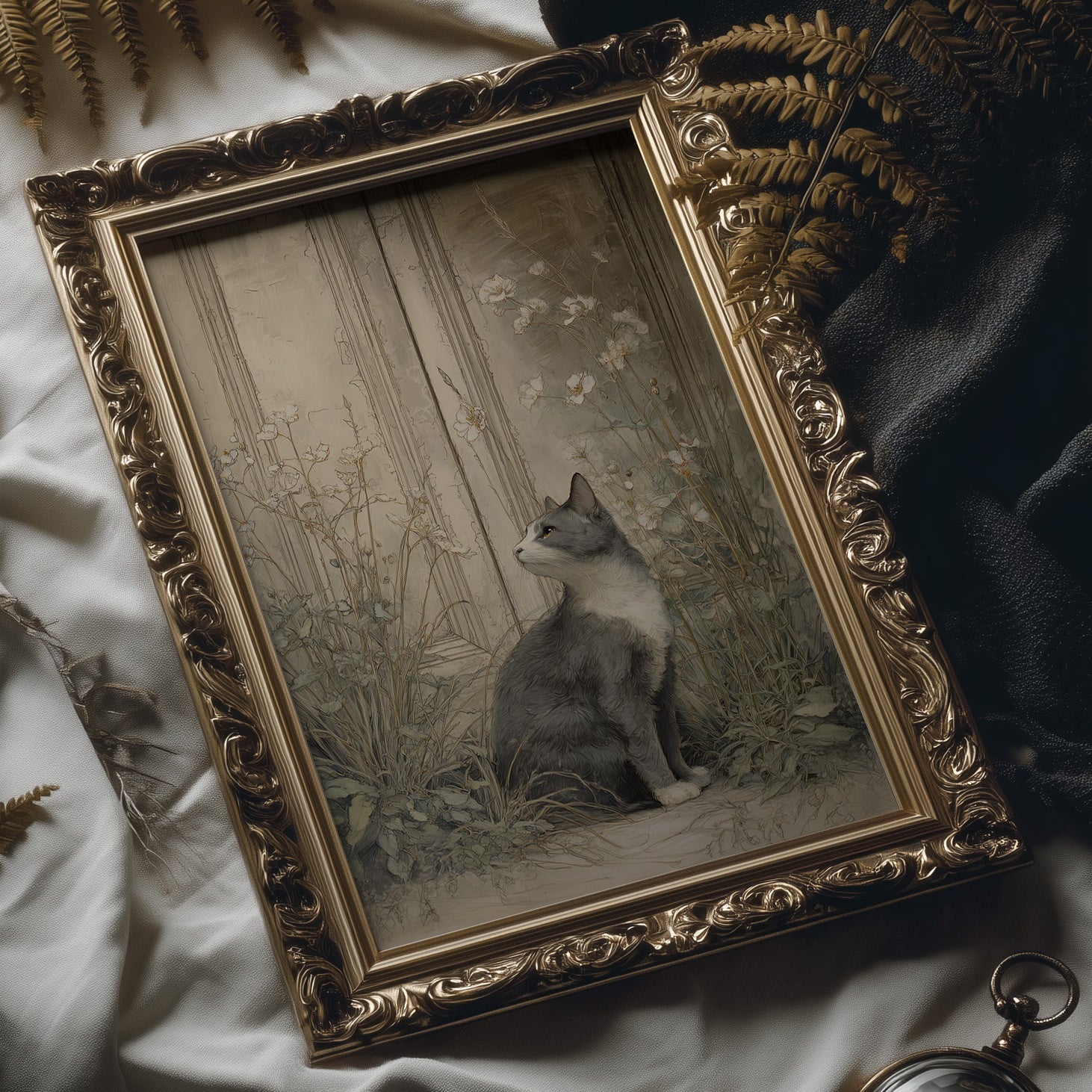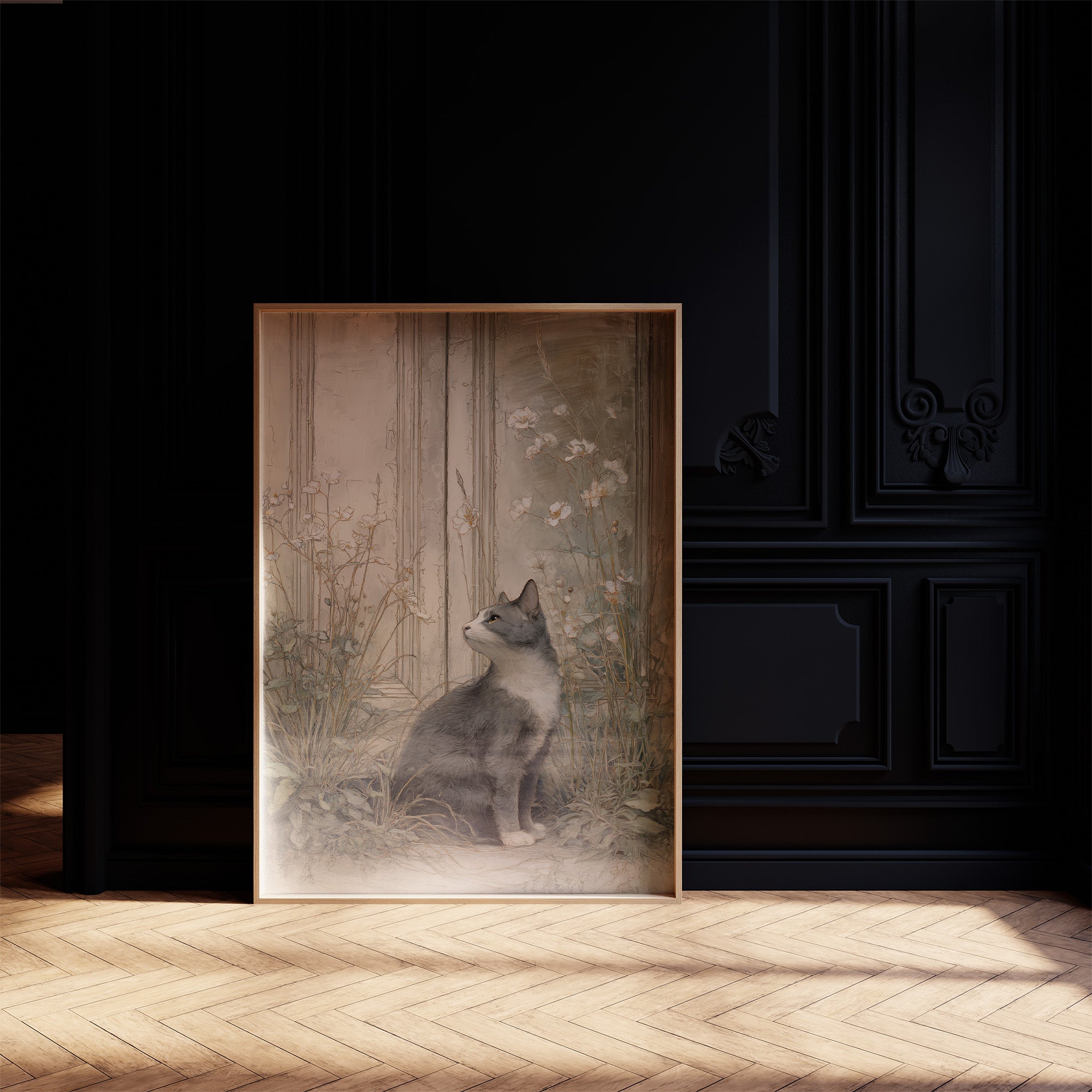 Light filters through the scene, catching the curious gaze of a gray and white cat surrounded by delicate wildflowers. The soft, muted palette creates a dreamy atmosphere where time seems suspended, with botanical elements framing the feline in a moment of quiet contemplation. Against the dramatic black wall, this ethereal portrait balances the untamed spirit of nature with elegant simplicity. This piece brings serene sophistication to living rooms, reading nooks, or anywhere requiring a touch of refined tranquility.