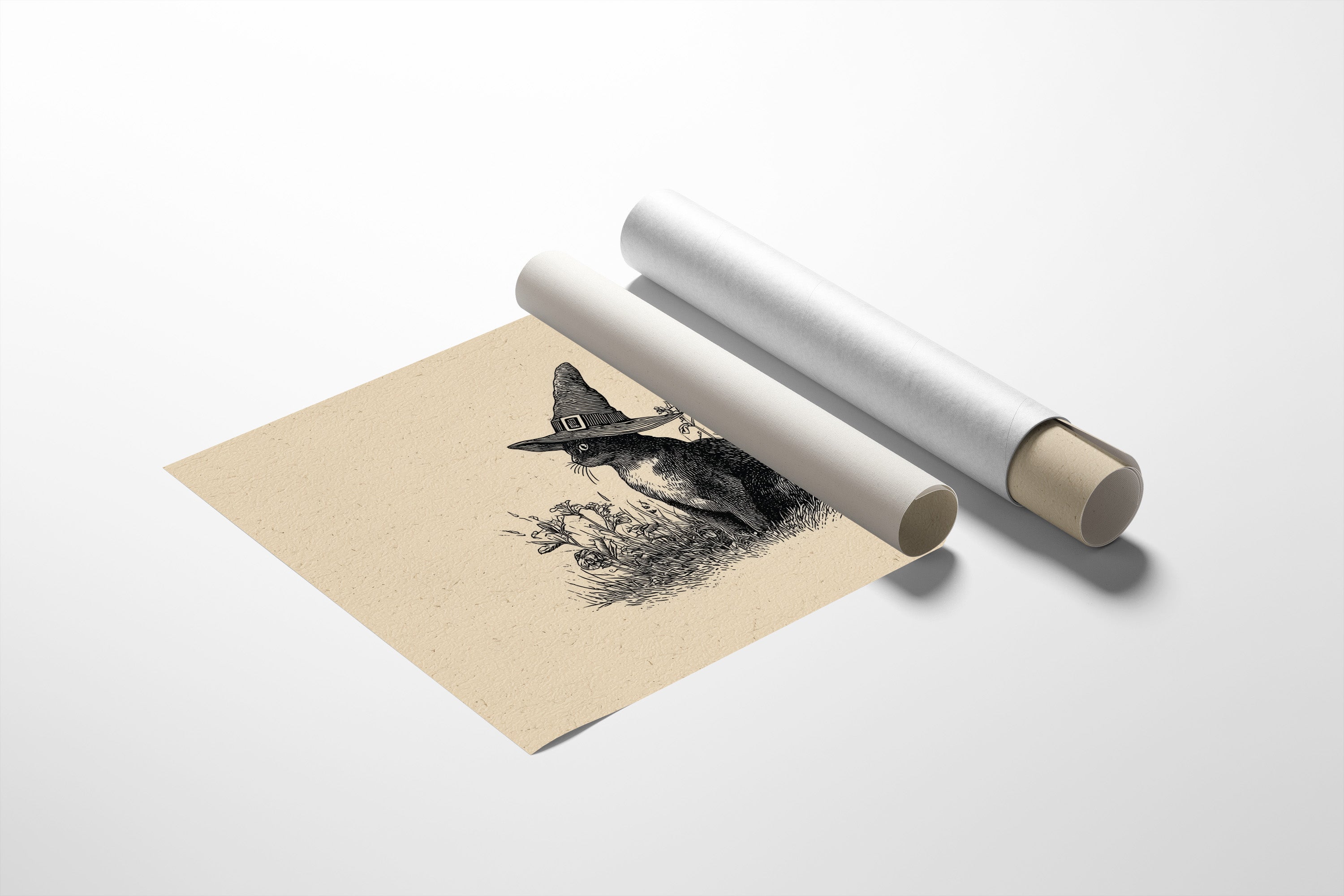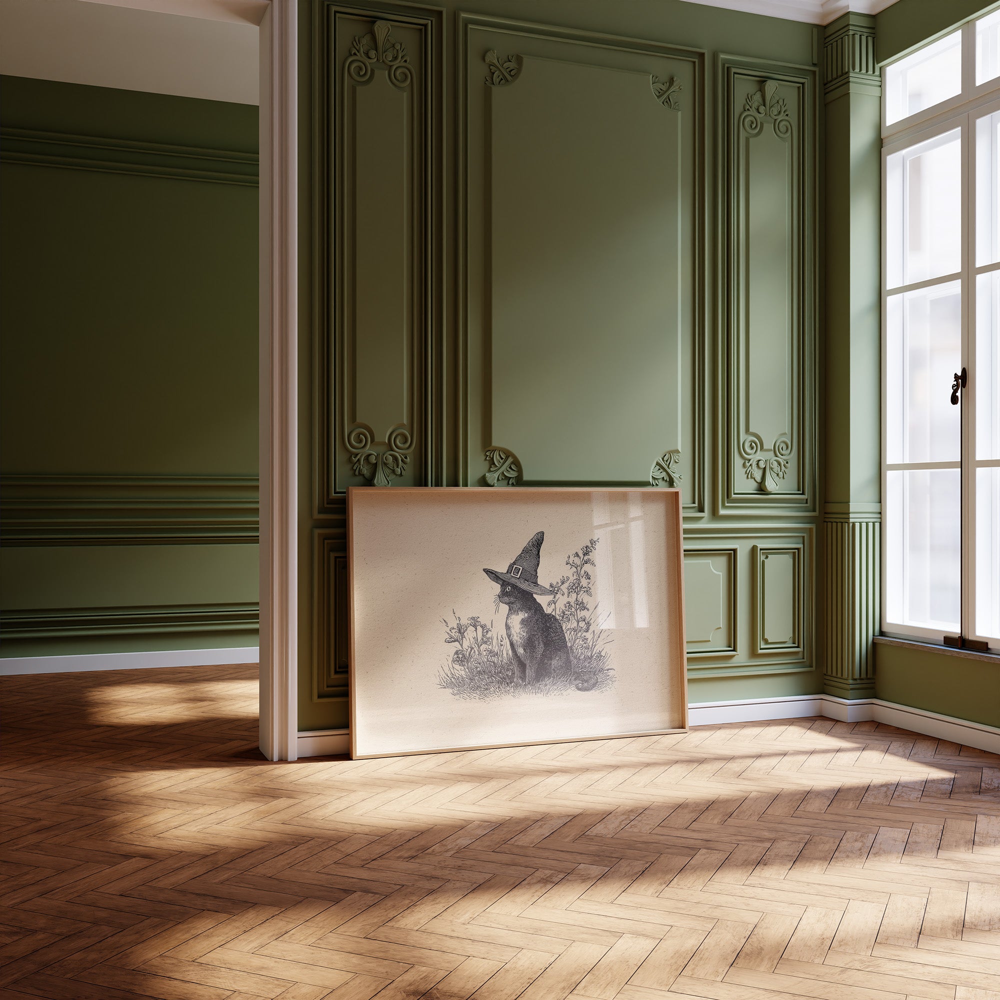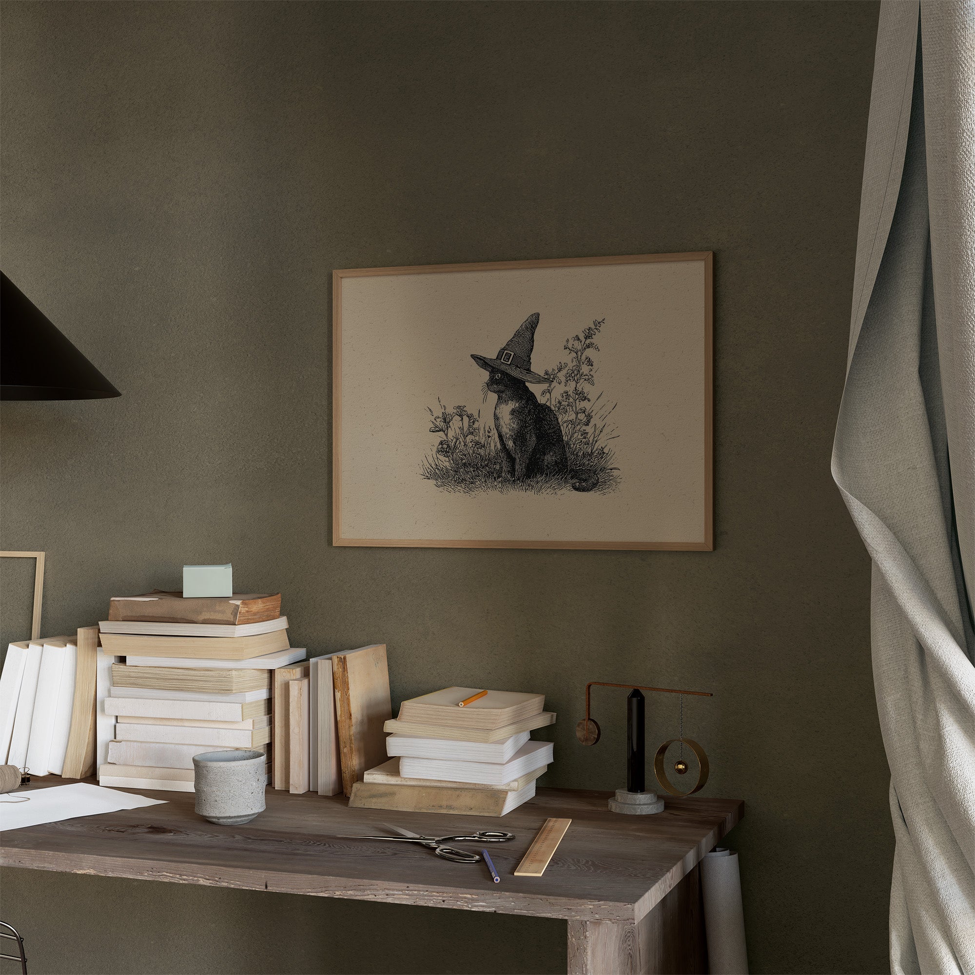 A moment of whimsical enchantment captured in delicate pen strokes. The black cat sits poised in tall grass, its pointed witch hat creating an air of mischievous magic against the aged parchment background. Intricate line work details the cat's fur and surrounding wildflowers, offering a nostalgic blend of folklore and nature rendered in a vintage illustration style. Perfect for adding a touch of literary charm to a home library, reading nook, or any space where stories and imagination are treasured.