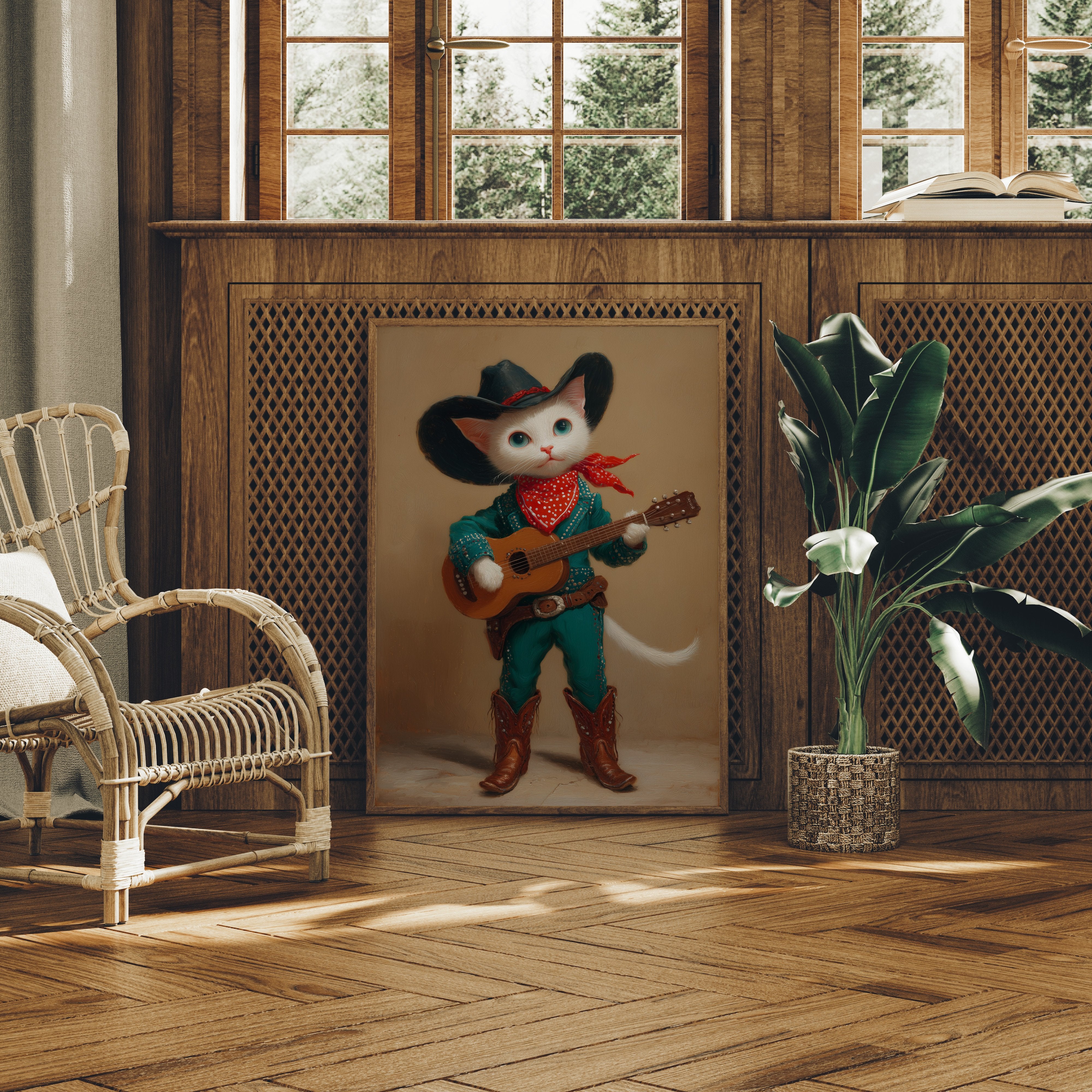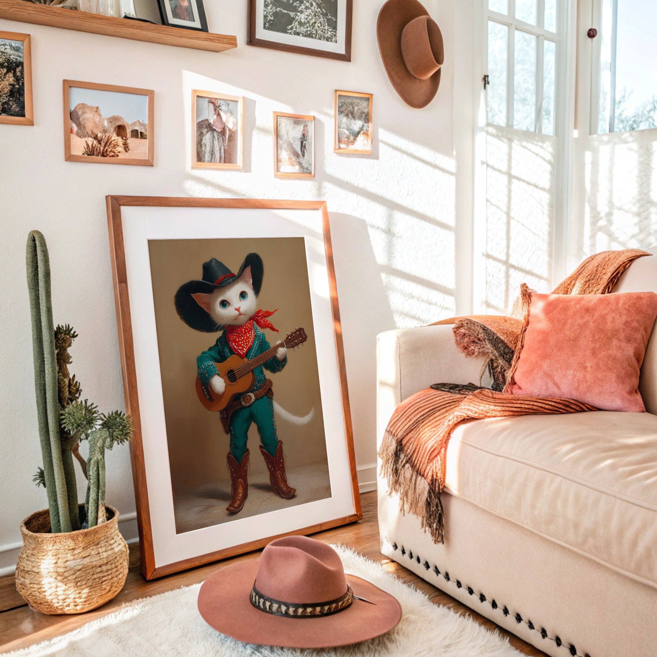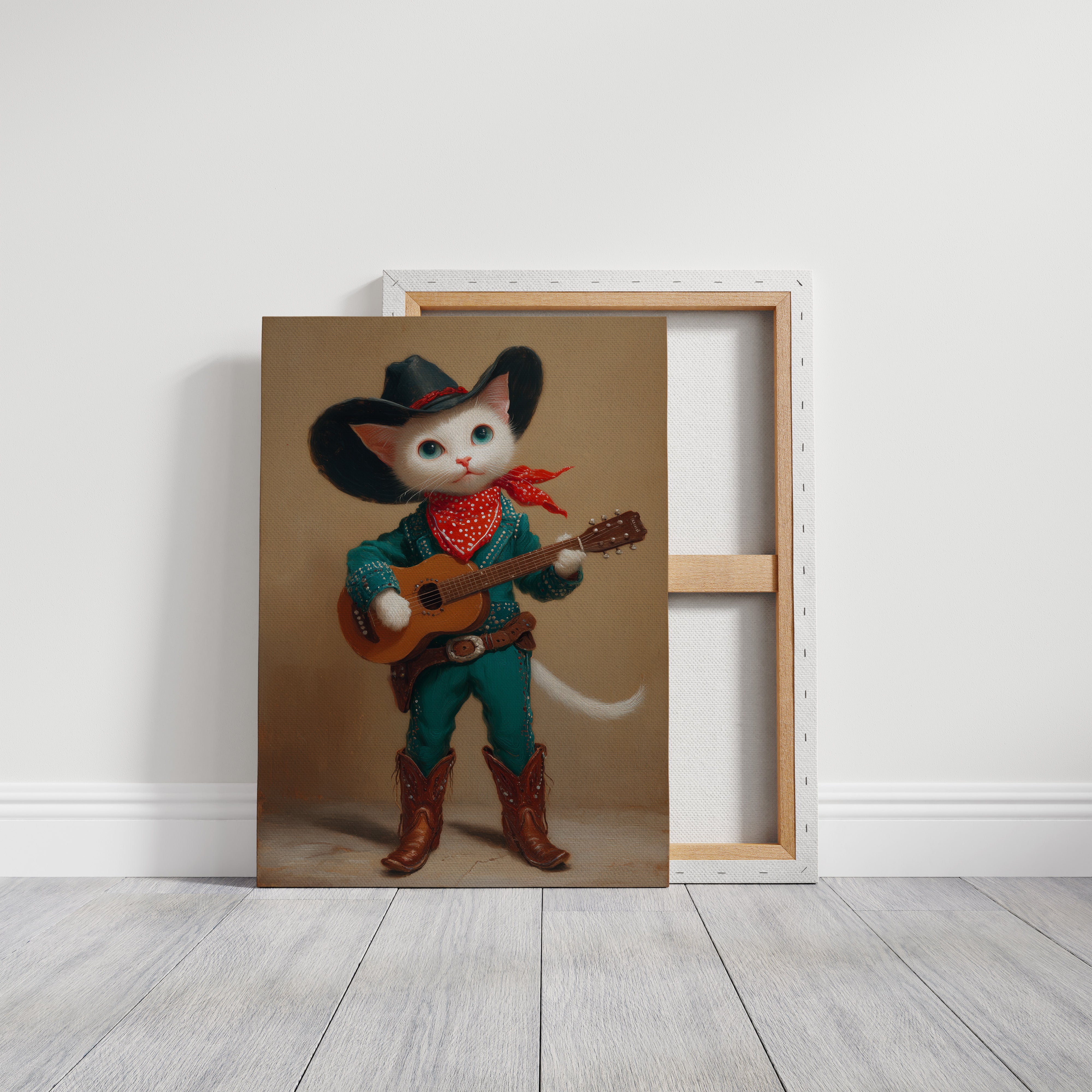A charming white cat, dressed in full western regalia, cradles an acoustic guitar with the confidence of a seasoned performer. This whimsical portrait from our Contemporary Collection blends playful anthropomorphic art with classic country western style. Adorned in a striking turquoise outfit studded with silver details, a black cowboy hat, and authentic leather boots, our feline musician stands ready to serenade. The rich amber background and careful attention to textures - from the soft fur to the weathered leather - create a sophisticated yet wonderfully quirky narrative. This conversation-starting piece brings charm and character to a child's room, playroom, or any space seeking a touch of imaginative delight.