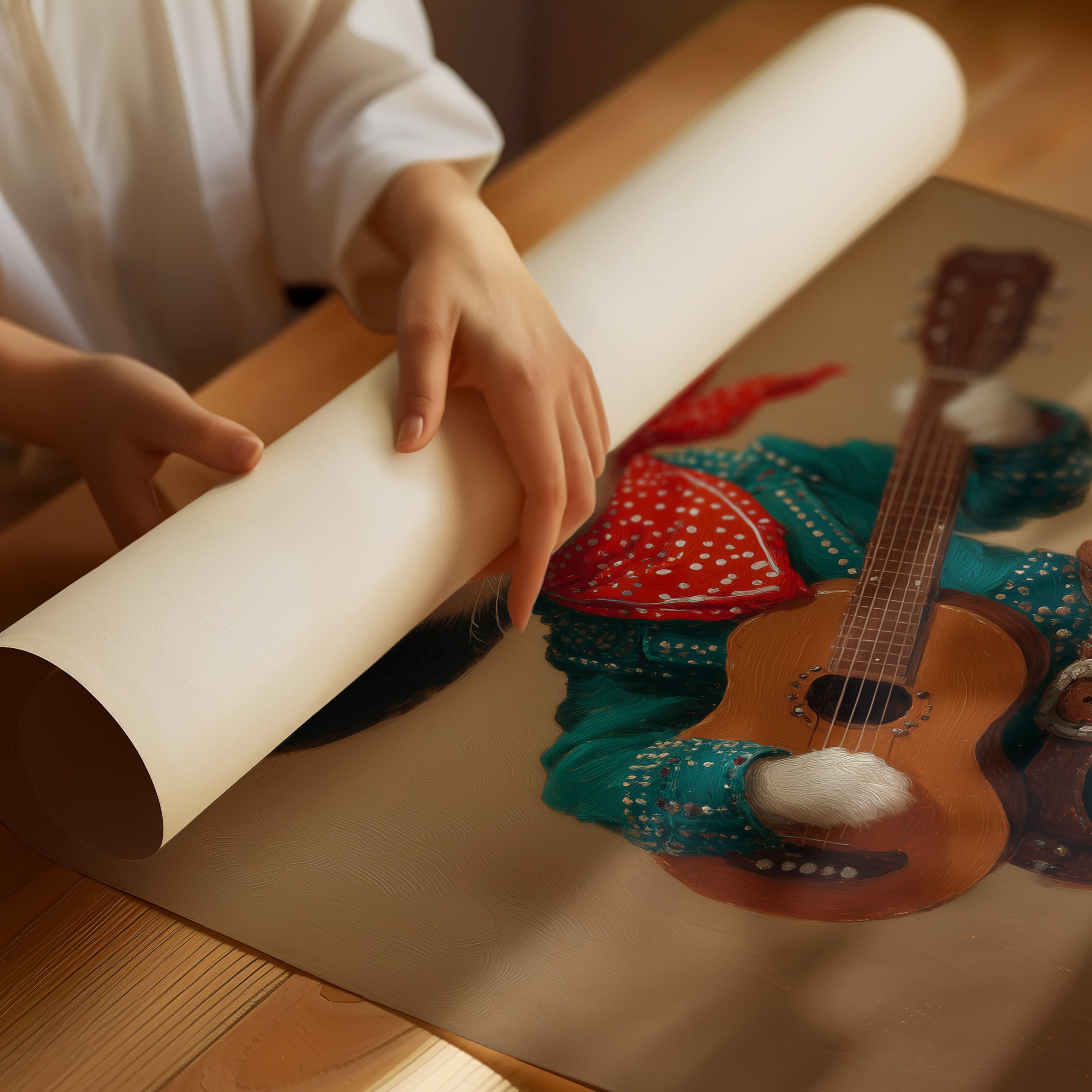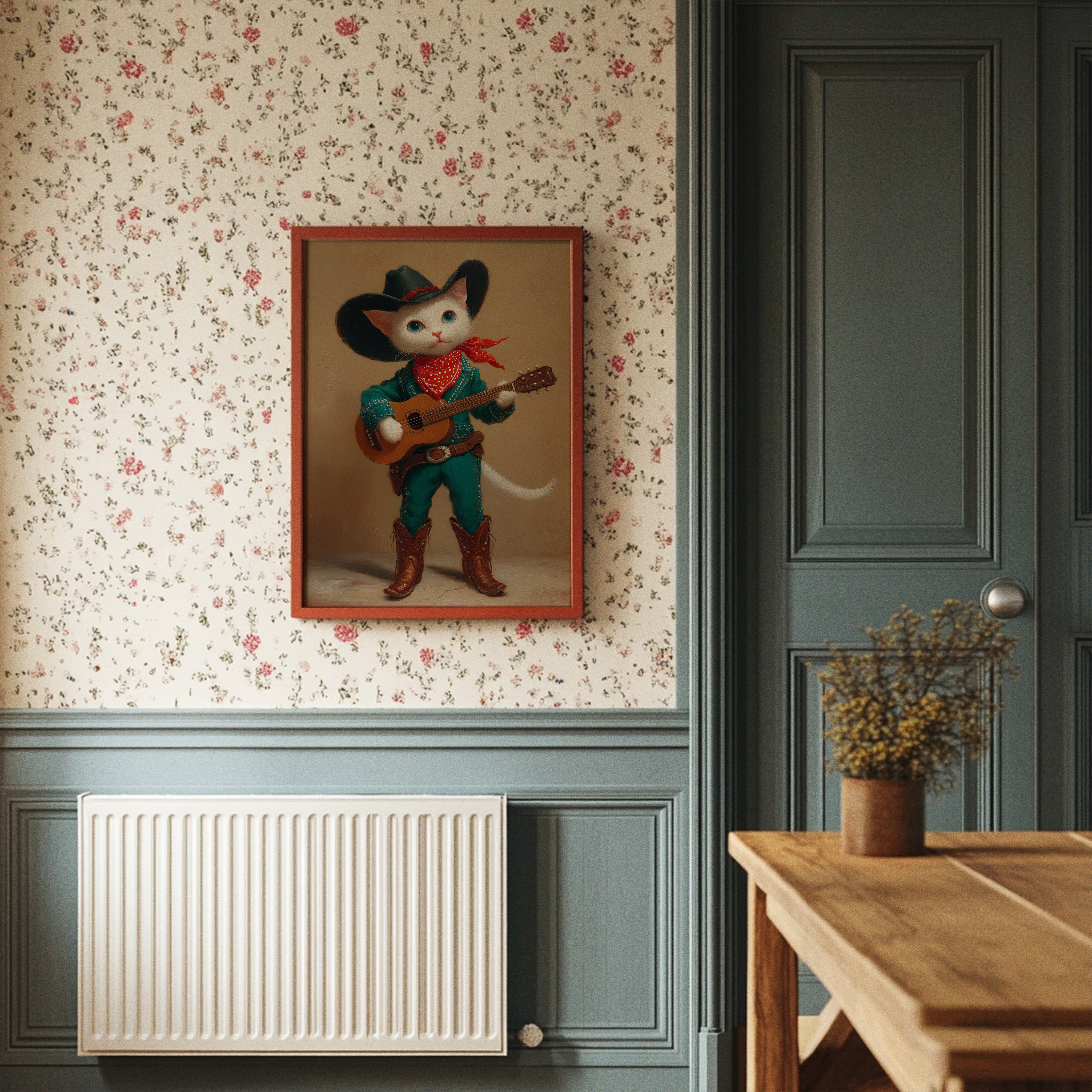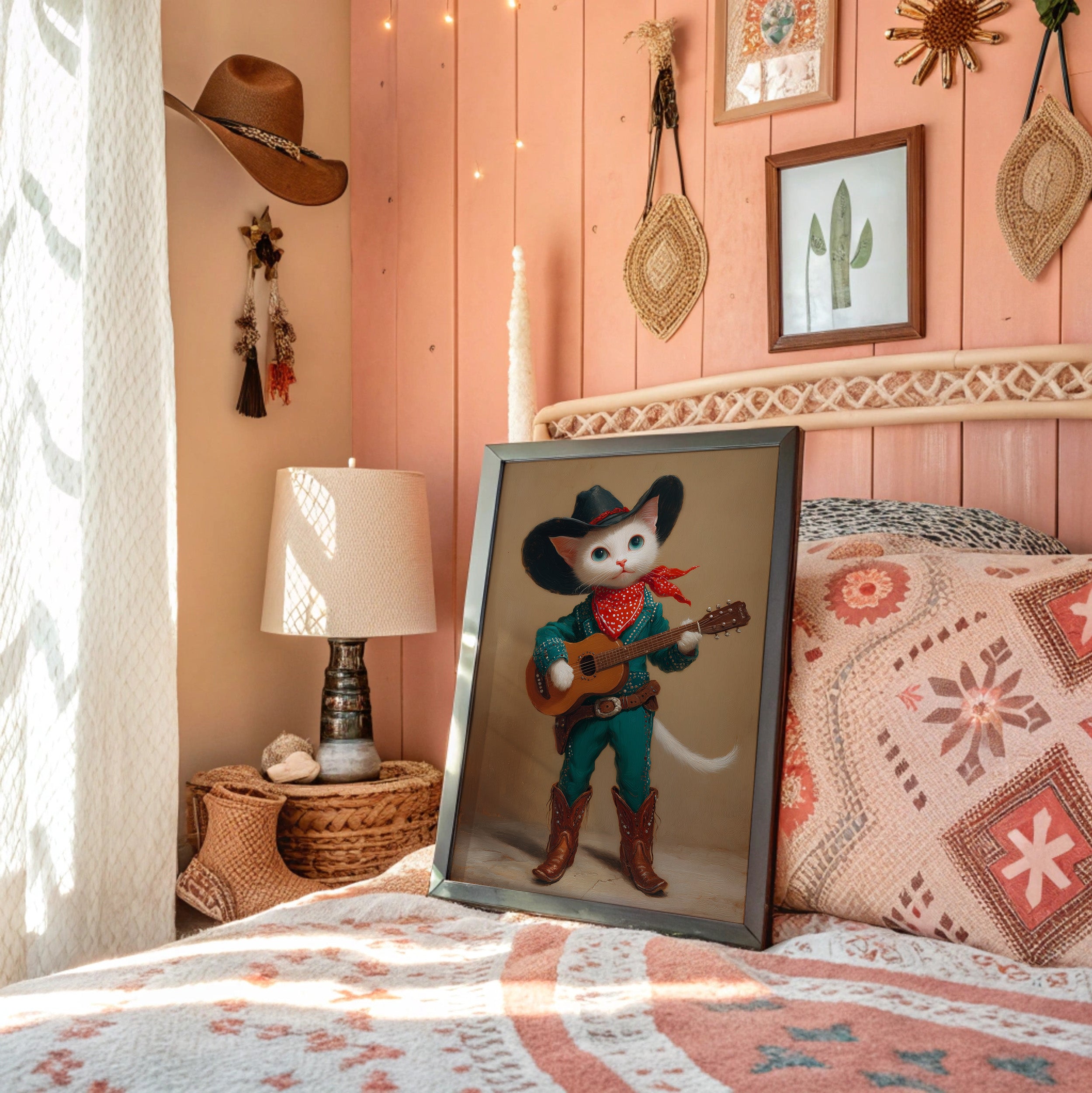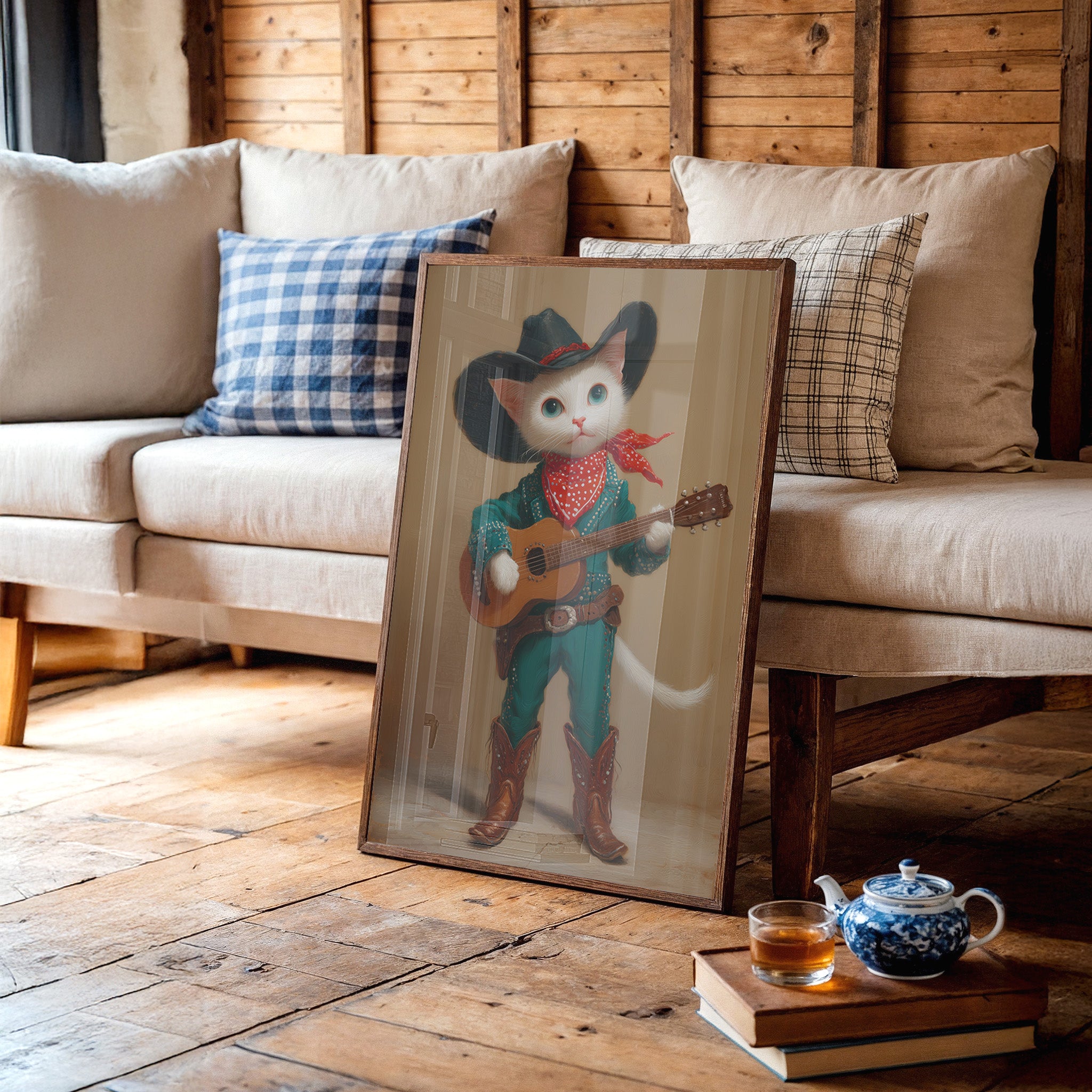 A charming white cat, dressed in full western regalia, cradles an acoustic guitar with the confidence of a seasoned performer. This whimsical portrait from our Contemporary Collection blends playful anthropomorphic art with classic country western style. Adorned in a striking turquoise outfit studded with silver details, a black cowboy hat, and authentic leather boots, our feline musician stands ready to serenade. The rich amber background and careful attention to textures - from the soft fur to the weathered leather - create a sophisticated yet wonderfully quirky narrative. This conversation-starting piece brings charm and character to a child's room, playroom, or any space seeking a touch of imaginative delight.