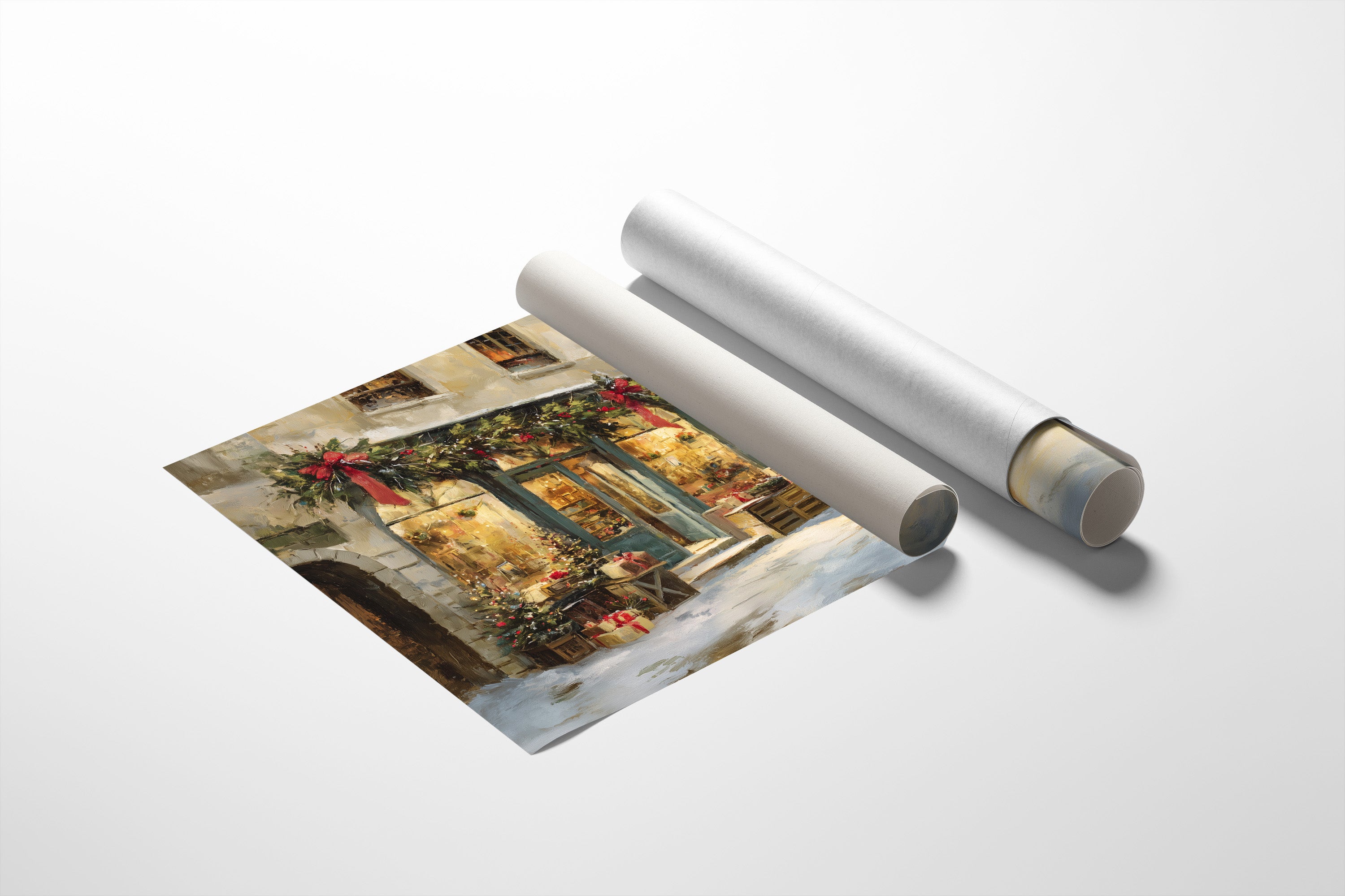 Warm golden light spills onto fresh snow from charming storefronts adorned with holiday garlands. The painting captures a nostalgic winter scene where small shops beckon with decorated windows and festive treasures, their red ribbons and evergreen boughs creating a welcoming contrast against the snowy street. Displayed against a backdrop of leather-bound classics and contemporary volumes, this piece invites quiet contemplation of simpler times and seasonal joy. This framed artwork would bring timeless charm to a reading nook, study, or living room where holiday memories are cherished.