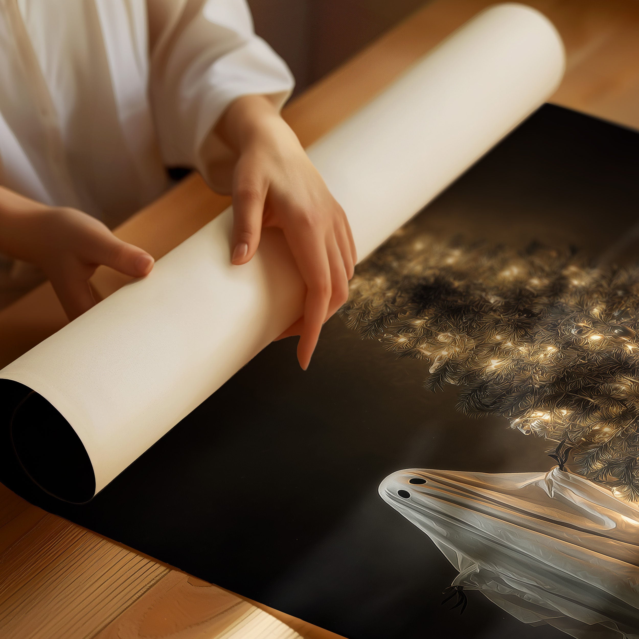 A playful twist on holiday tradition emerges as a ghostly figure stands sentinel before a glowing Christmas tree. The ethereal scene captures the magic where whimsy meets wonder, with twinkling lights casting a warm golden glow through the darkness. Wrapped presents rest beneath branches adorned with shimmering ornaments, while the sheet-draped specter adds an element of endearing mischief to the classical holiday setting. This contemporary piece brings an unexpected narrative to seasonal decor, perfect for those who appreciate both holiday charm and a touch of Halloween spirit.