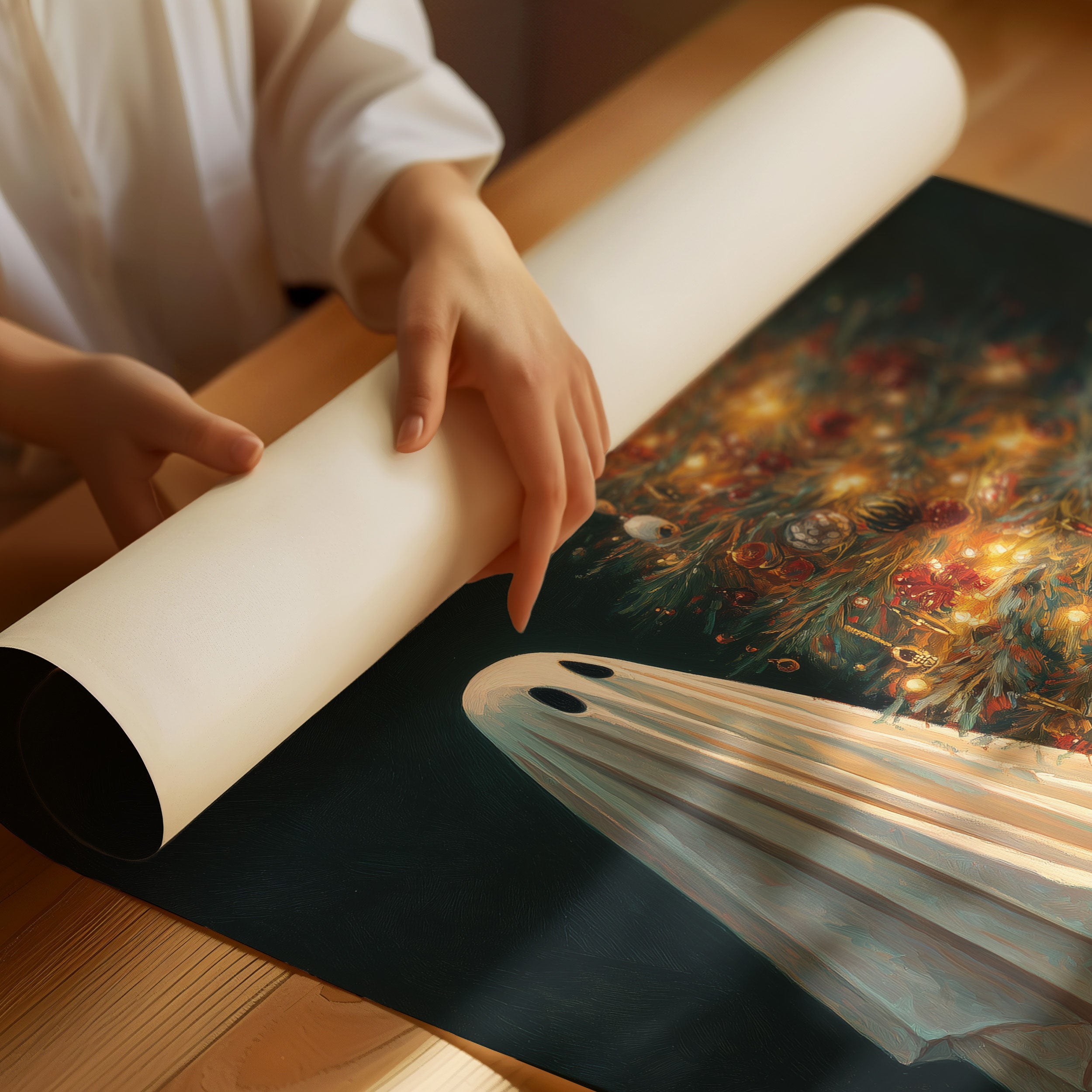 A whimsical scene unfolds where a sheet-draped ghost stands in playful contrast to a traditionally decorated Christmas tree. The warm glow of string lights creates a cozy atmosphere, casting gentle shadows across the scene while illuminating wrapped presents below. Deep emerald tones and golden lights merge to create an unexpectedly charming holiday narrative that balances spooky fun with seasonal warmth. This contemporary piece masterfully blends humor with holiday tradition, featuring rich colors and dramatic lighting that draw the eye from the ethereal ghost to the meticulously decorated tree. The composition plays with light and shadow, creating depth and intrigue in every corner. Perfect for adding a touch of unexpected whimsy to a modern living room or bringing a smile to a cozy den during the holiday season.