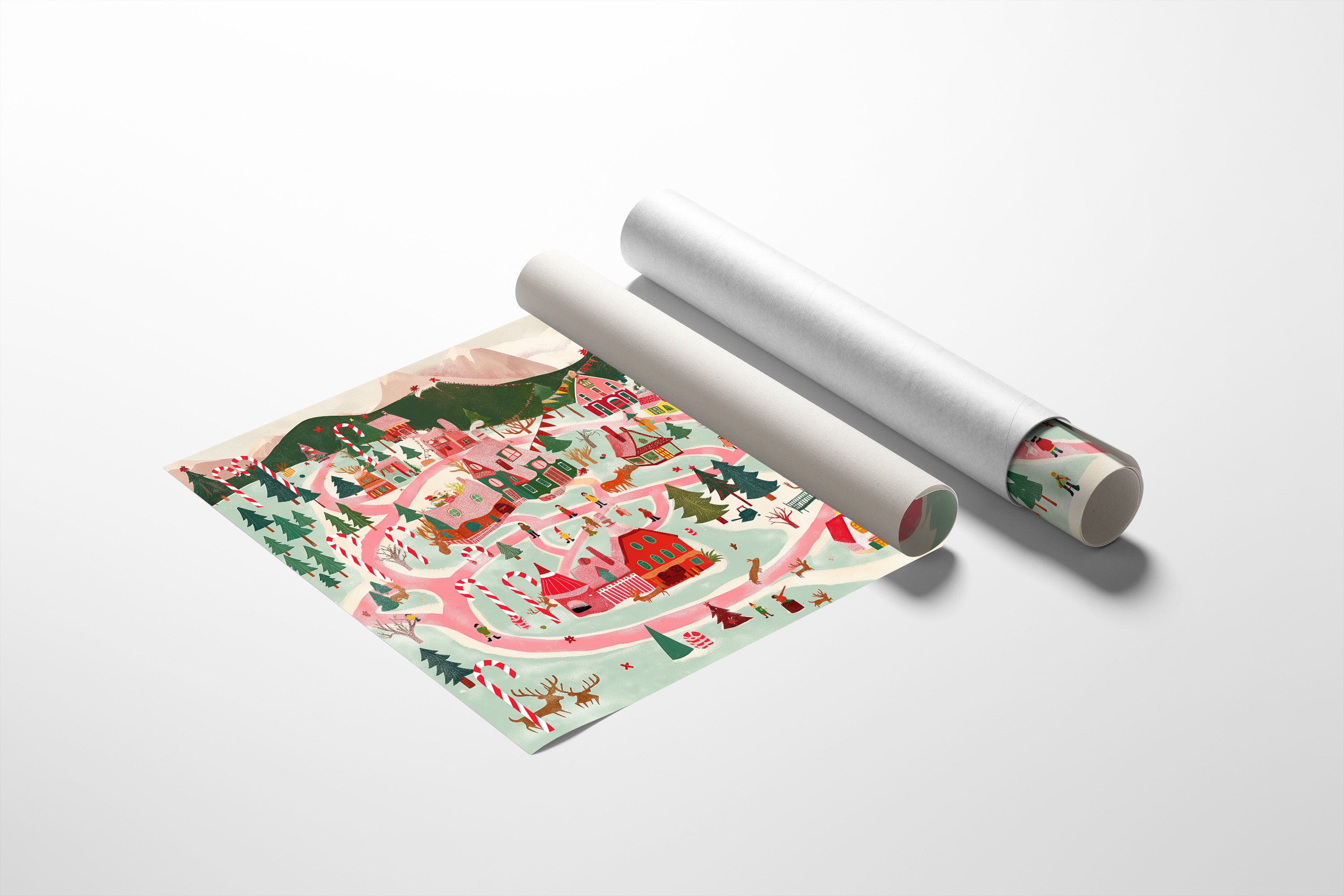 A charming wonderland of candy-colored cottages nestles between gentle mountains, connected by winding pink paths. The folk art scene buzzes with tiny figures moving through this whimsical community, where evergreen trees stand sentinel among coral and mint-hued buildings. This playful panorama captures the joy of an idealized village life, with each structure telling its own story within the collective tapestry.
