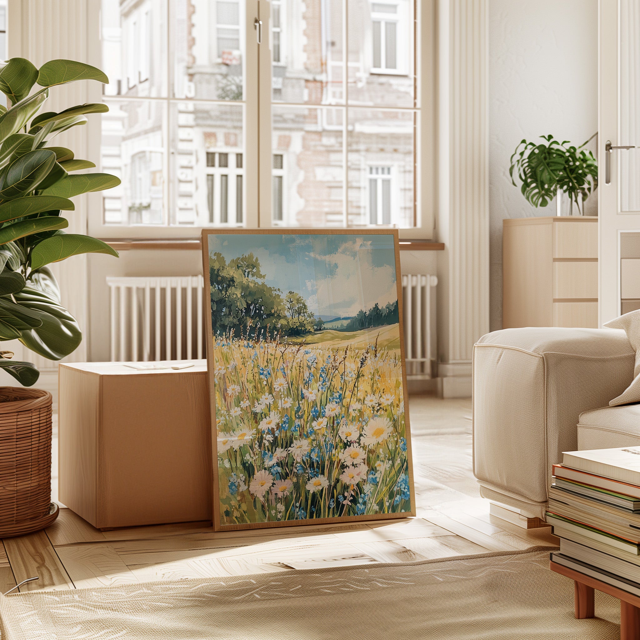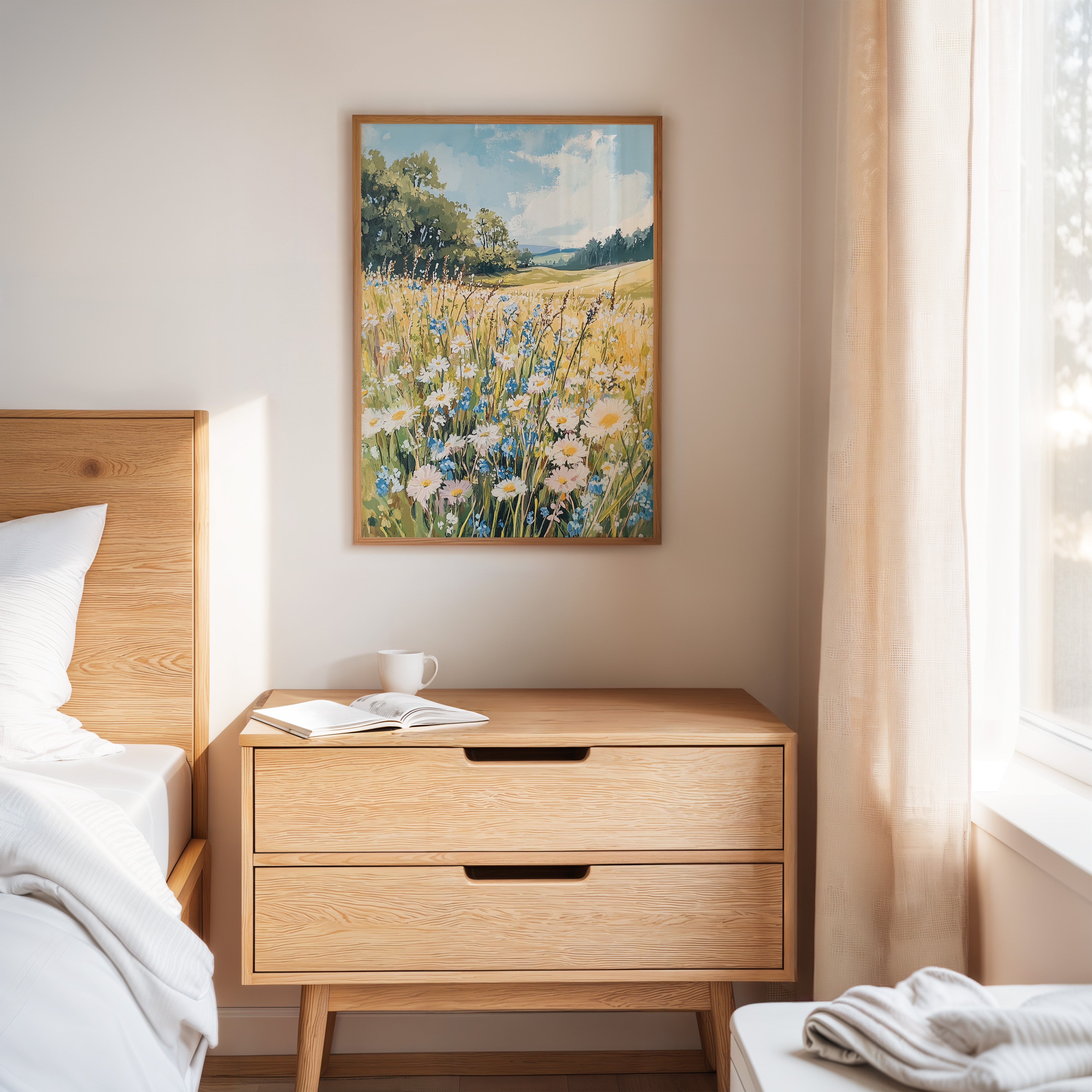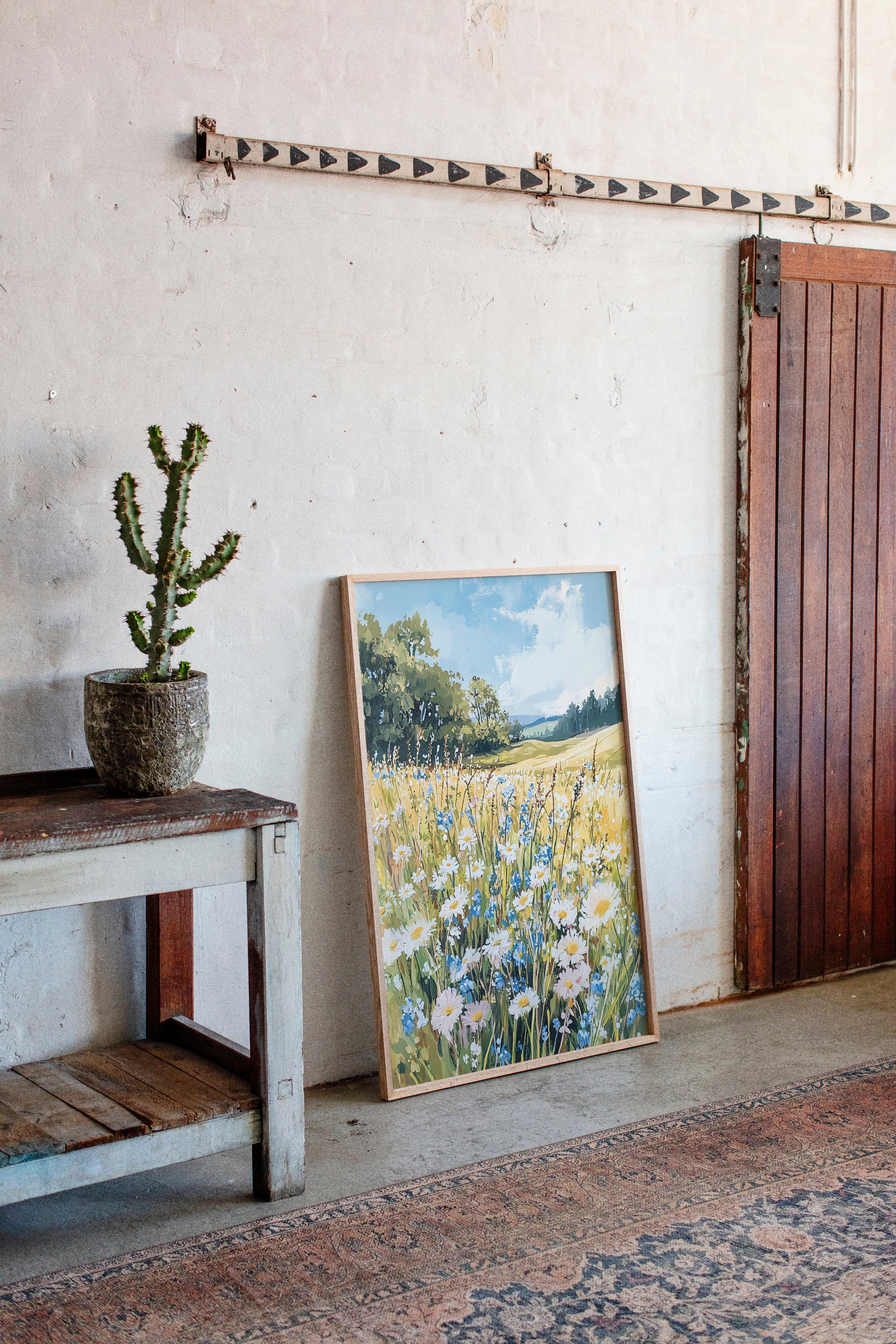 Beneath a vast cerulean sky, wildflowers sway in playful harmony, their vibrant colors singing a melody of summer's warmth. This piece embodies the essence of the artisanal collection, celebrating nature's delicate artistry. Each bloom is a brushstroke in a canvas of life, where daisies and blues intertwine, inviting a sense of joy and tranquility. Perfect for a sunlit dining nook or a cozy reading corner, this piece brings the spirit of the outdoors inside.