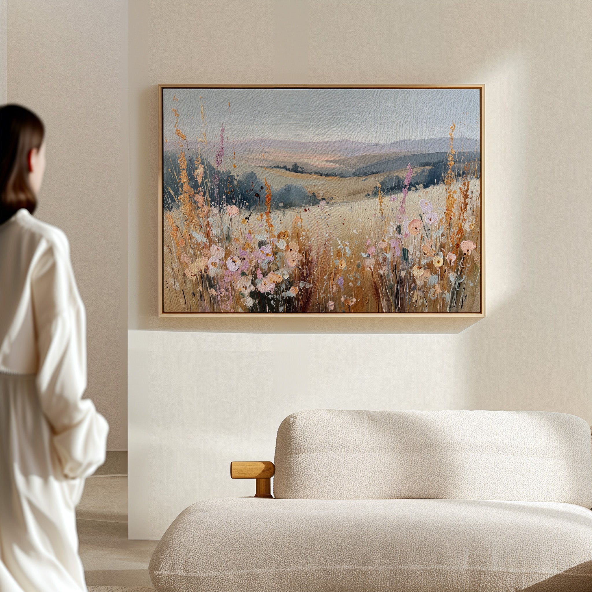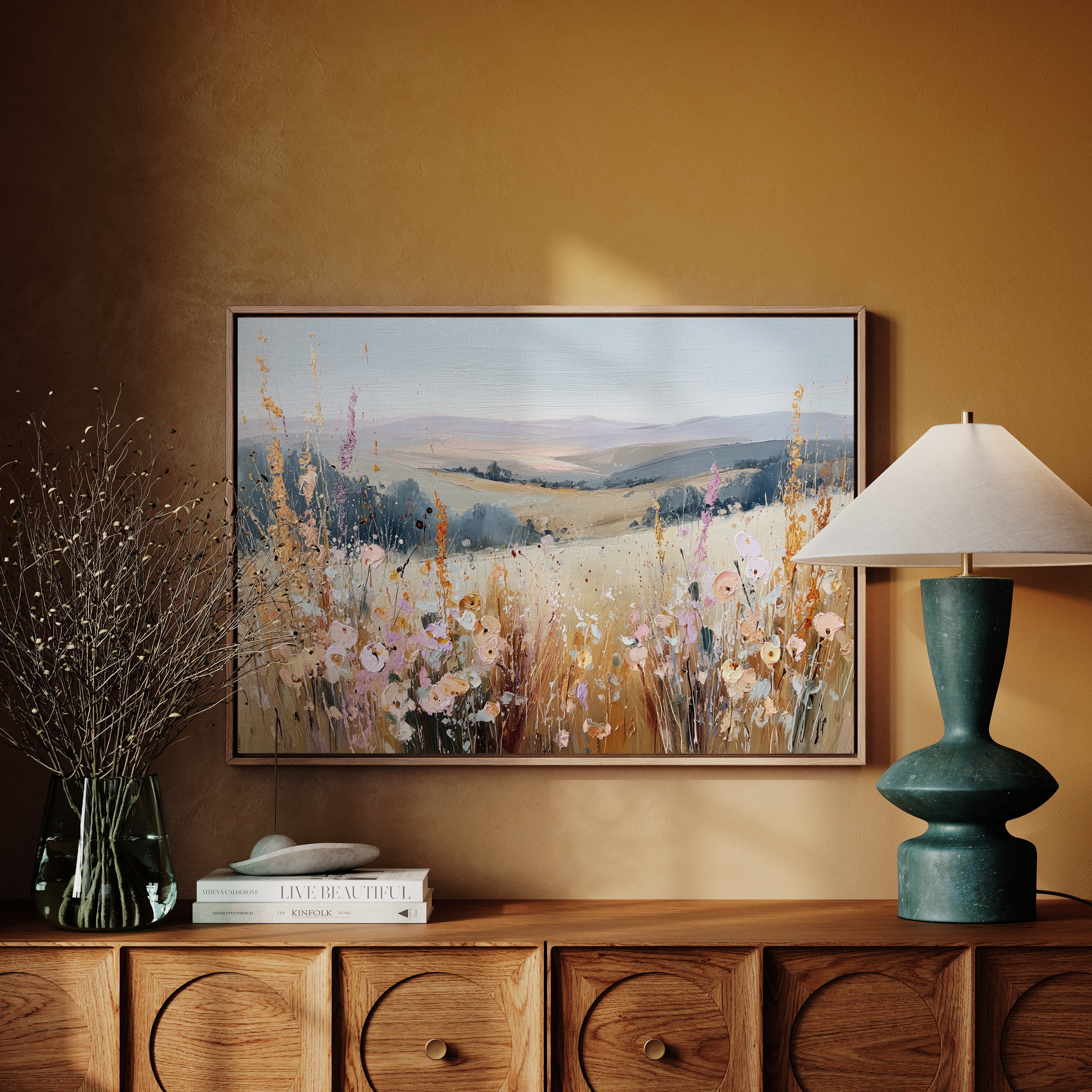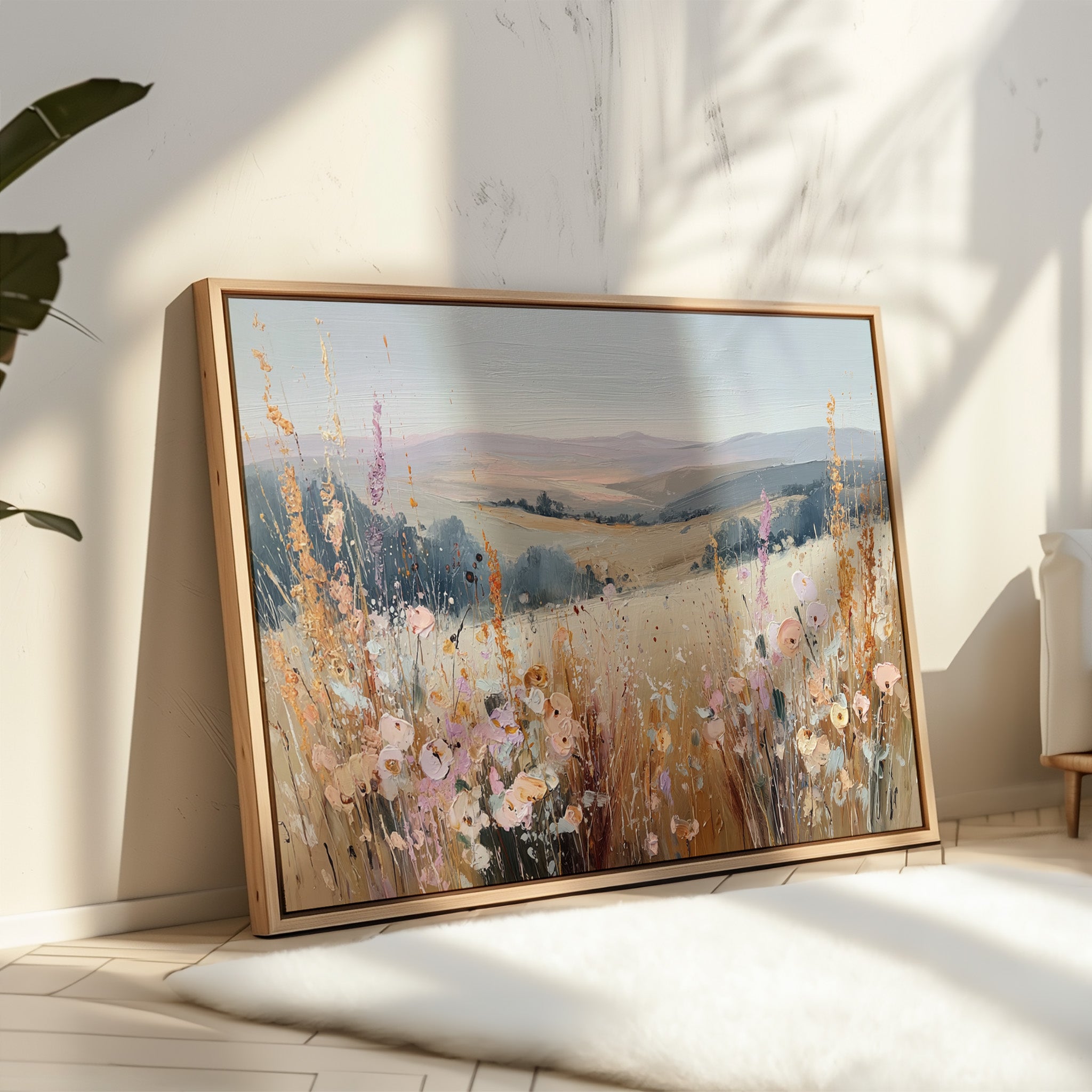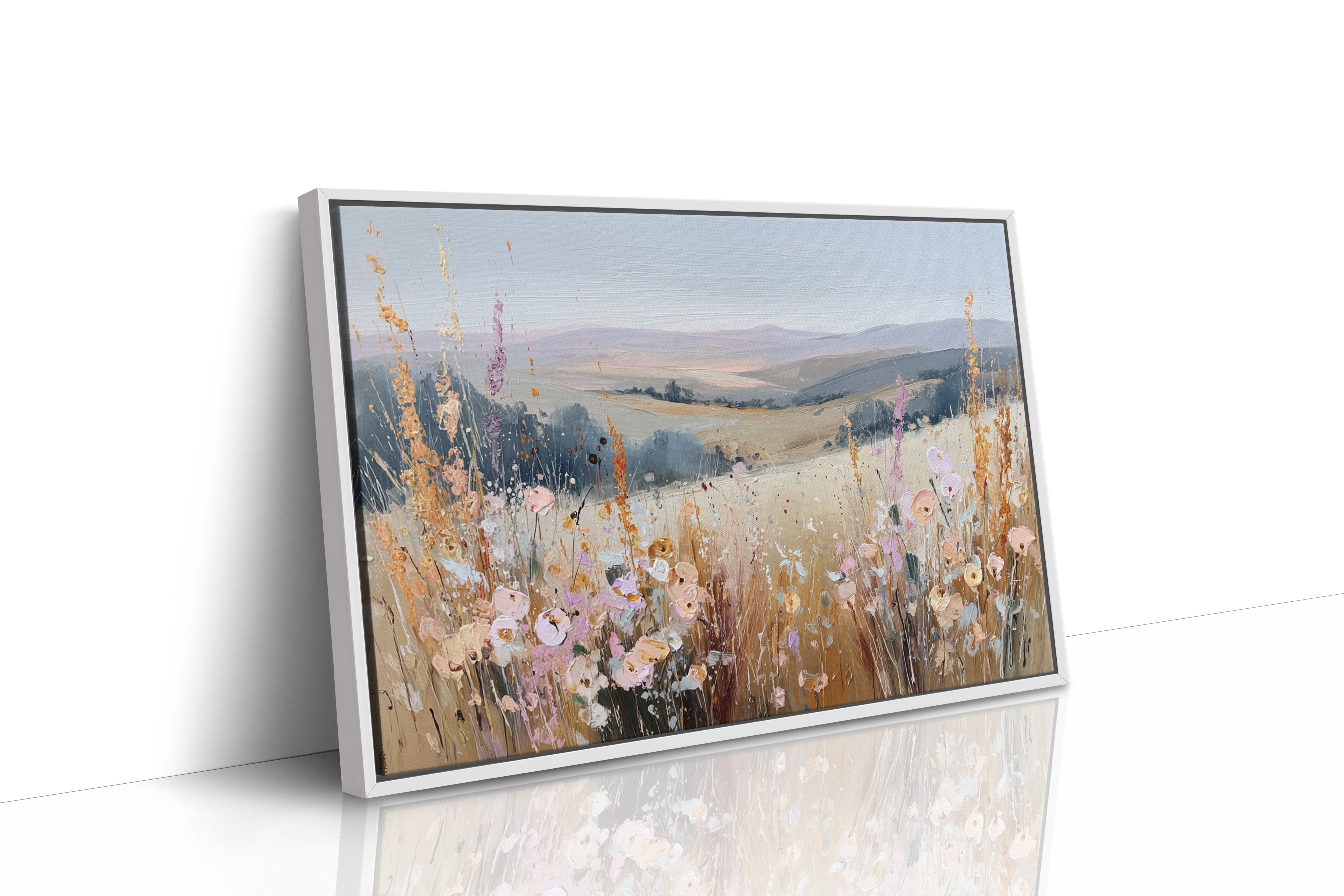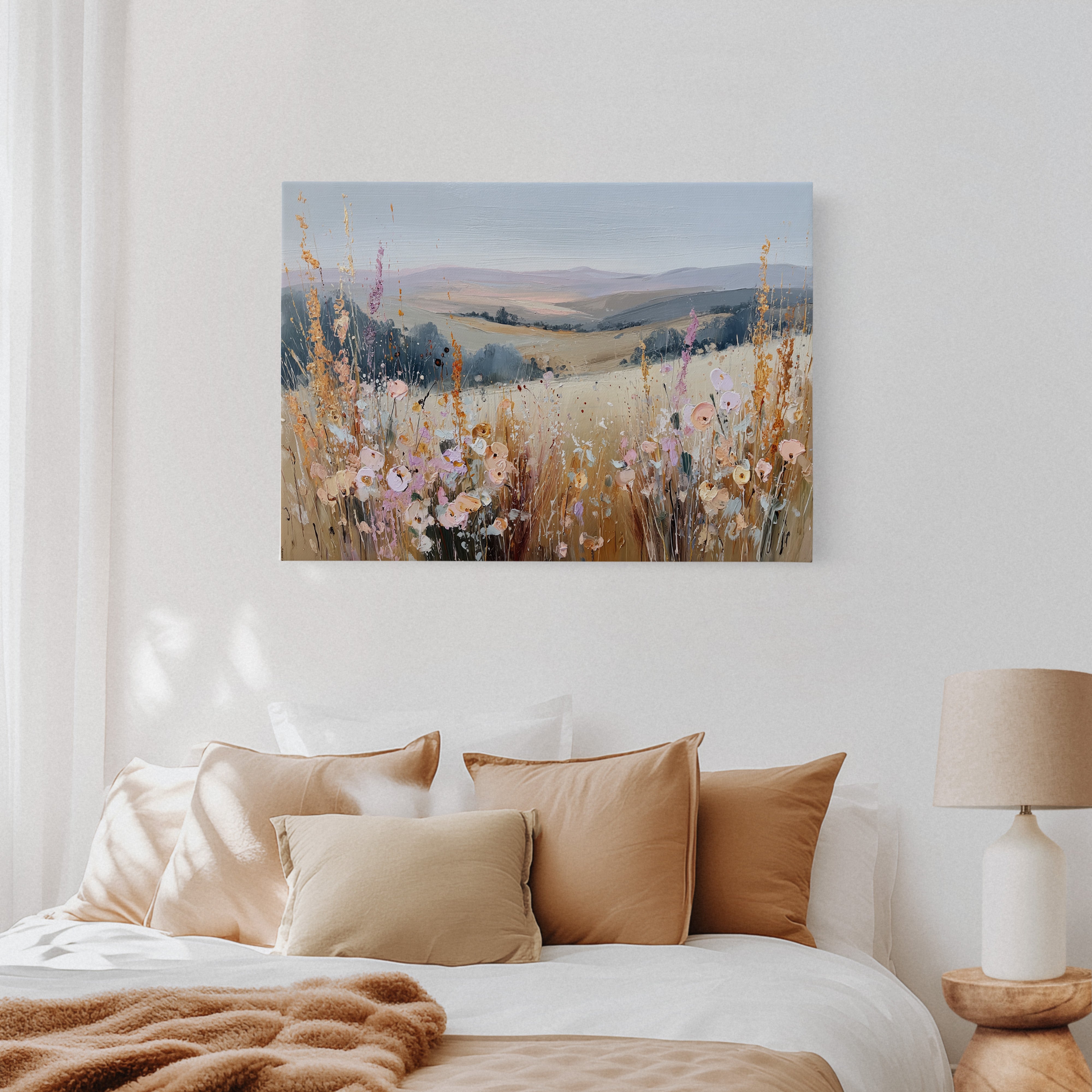 In a sun-kissed meadow, vibrant blooms sway gently in the breeze, their hues dancing against the golden backdrop. This piece embodies the essence of artisanal charm, celebrating nature's spontaneous beauty. Each brushstroke reveals a tapestry of colors, from soft pastels to warm earth tones, evoking a sense of freedom and peace. Perfect for brightening a serene bedroom or creating a welcoming foyer, this artwork invites tranquility into any space.