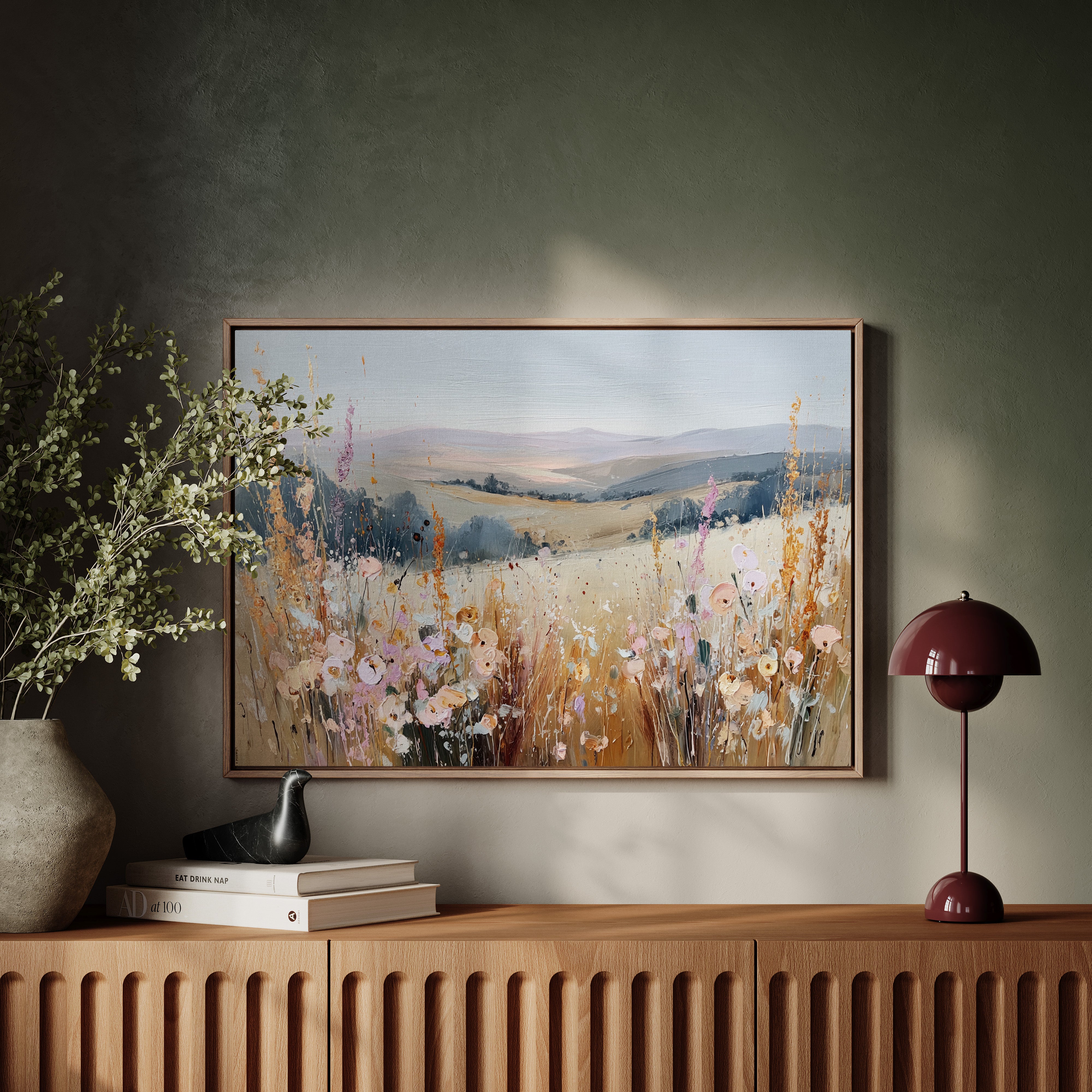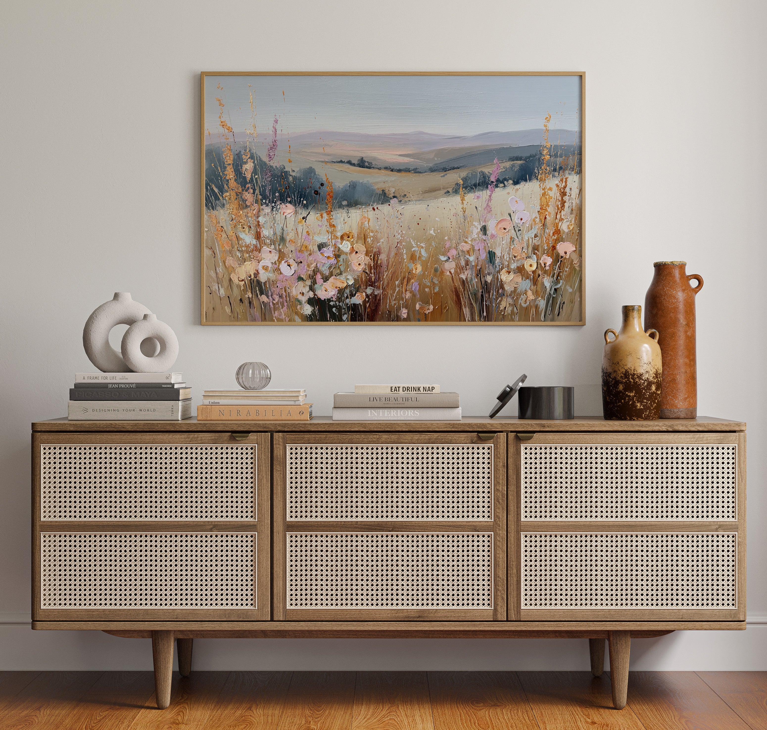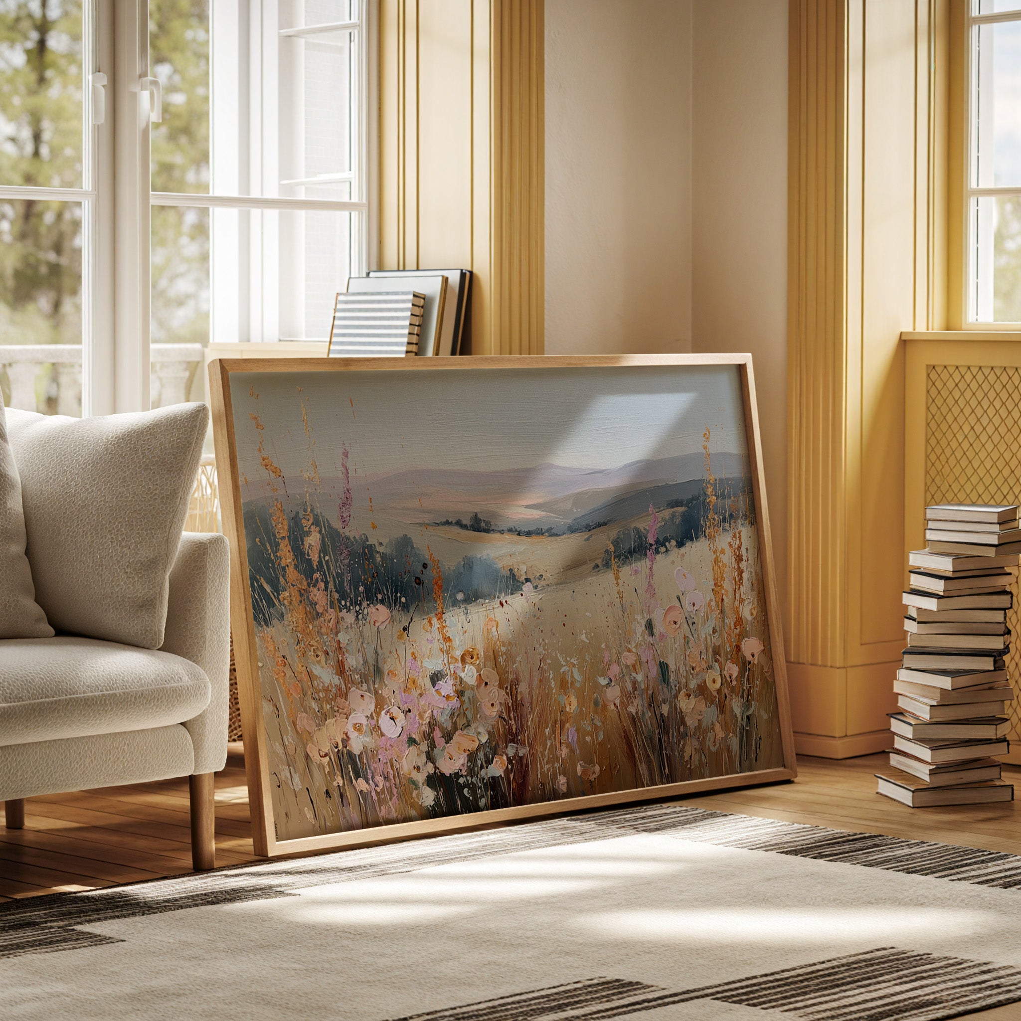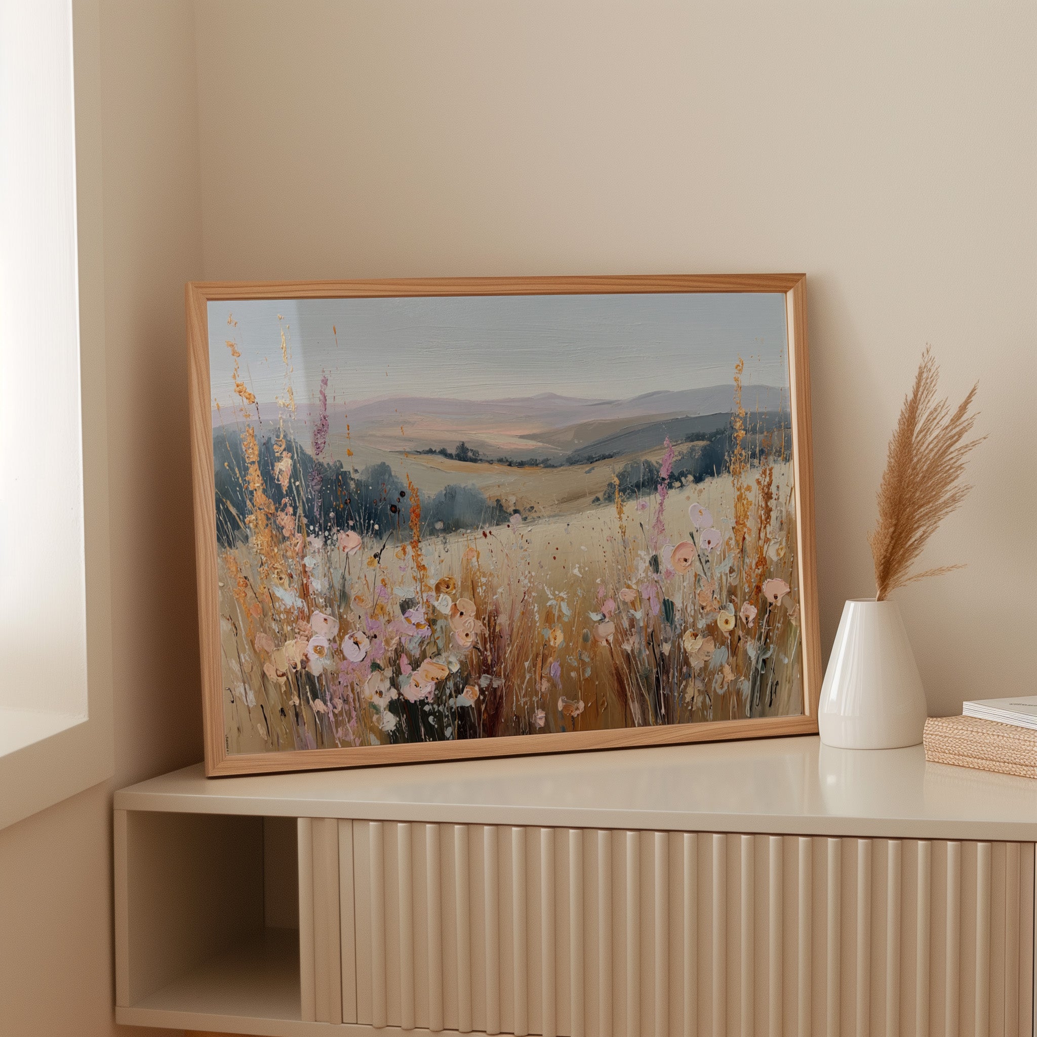 In a sun-kissed meadow, vibrant blooms sway gently in the breeze, their hues dancing against the golden backdrop. This piece embodies the essence of artisanal charm, celebrating nature's spontaneous beauty. Each brushstroke reveals a tapestry of colors, from soft pastels to warm earth tones, evoking a sense of freedom and peace. Perfect for brightening a serene bedroom or creating a welcoming foyer, this artwork invites tranquility into any space.