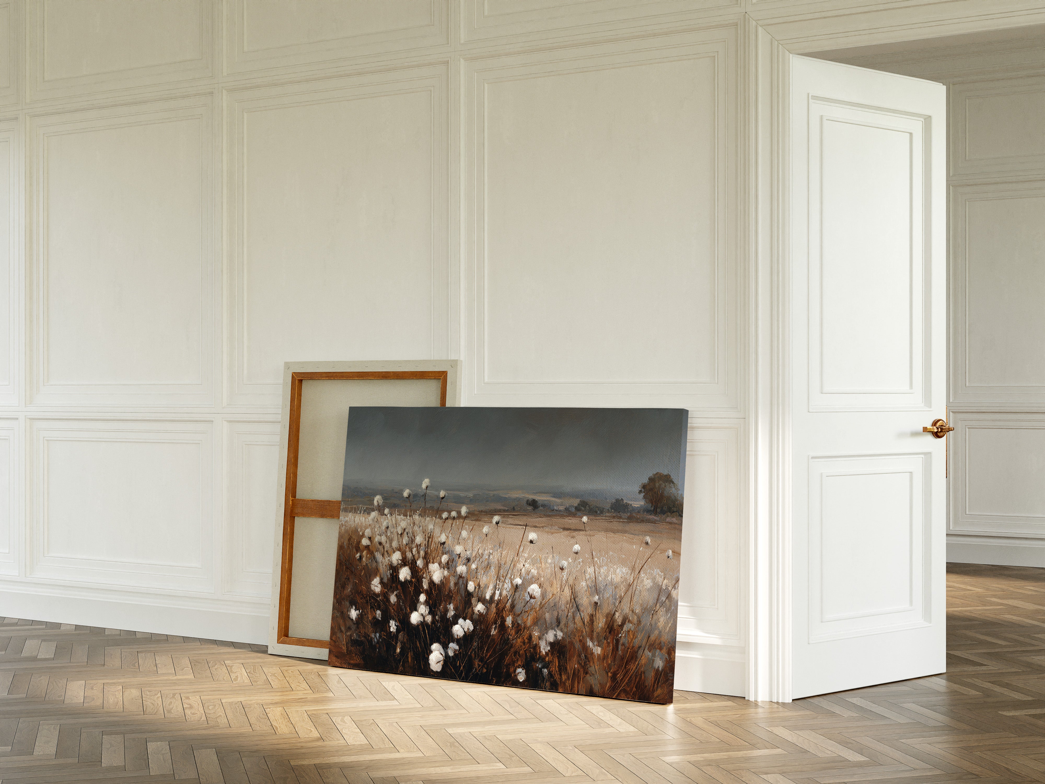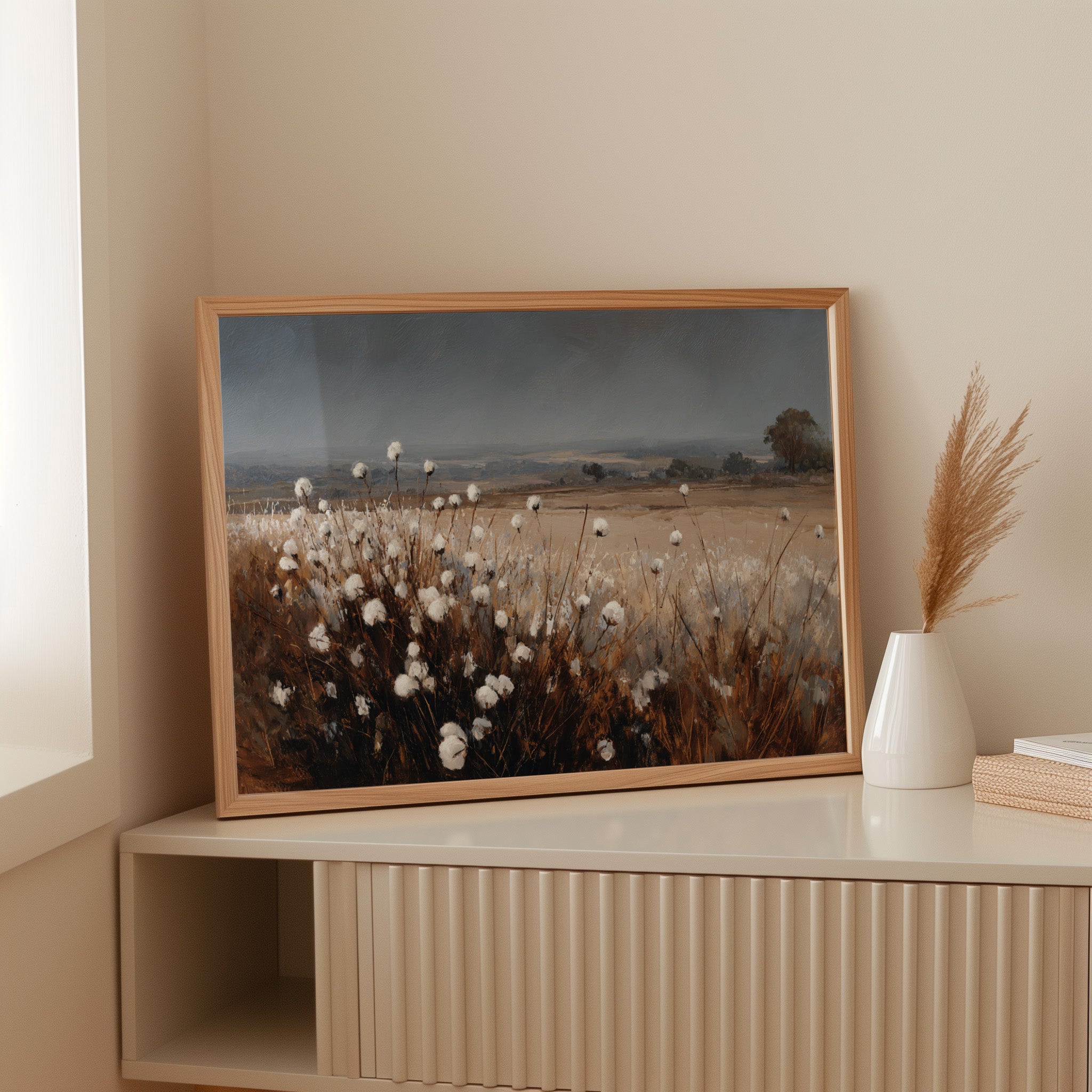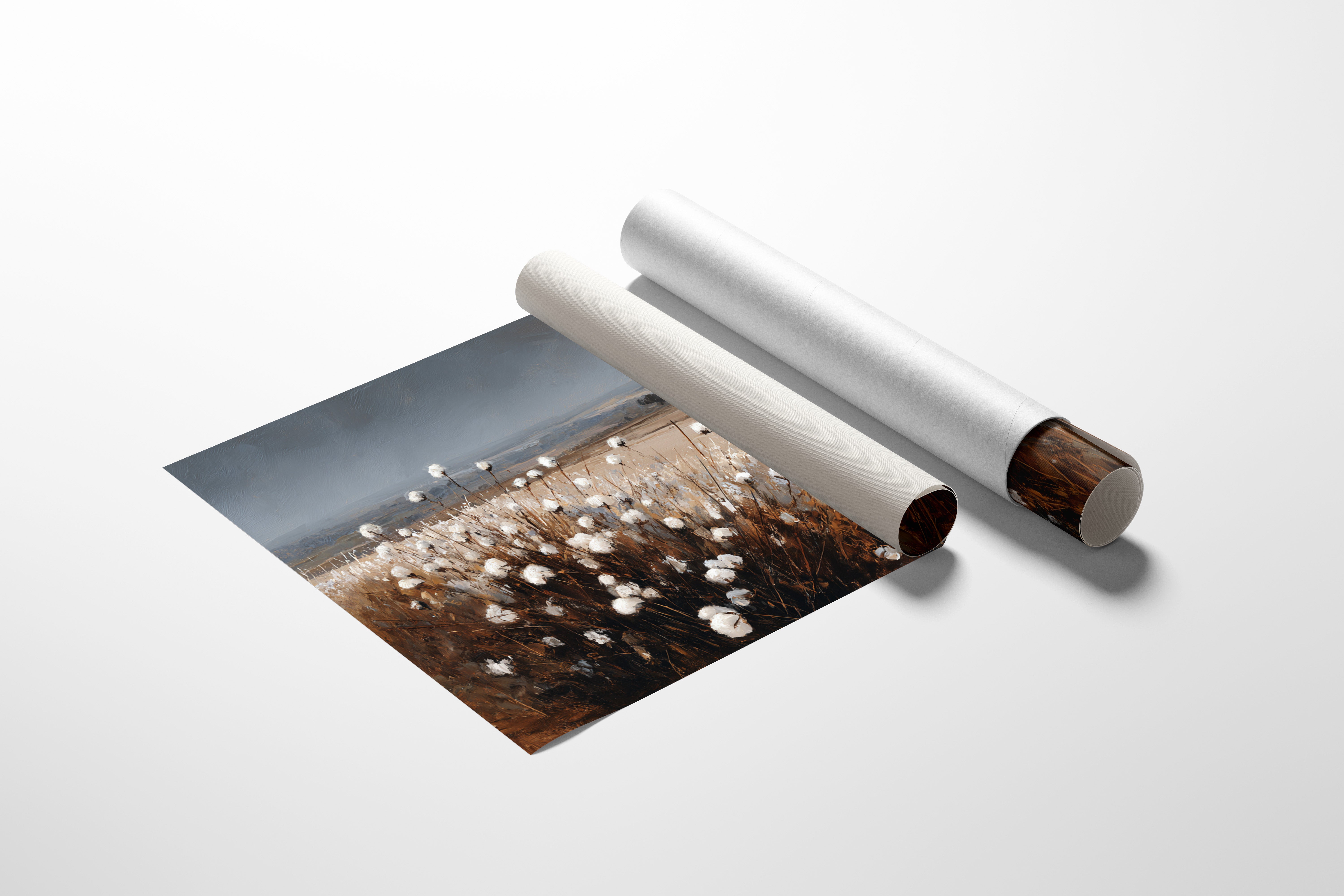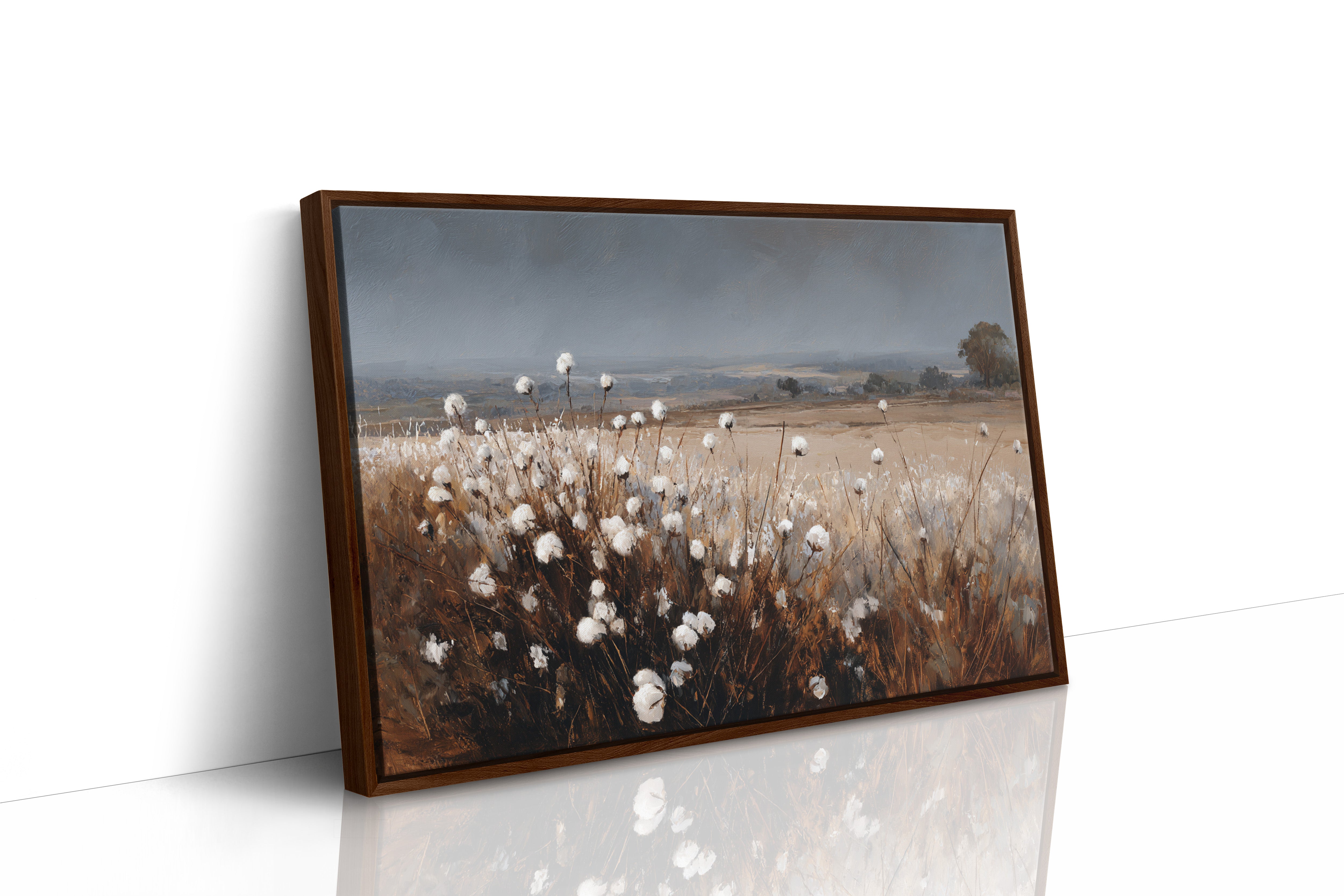 In the quiet of dusk, cotton blooms sway gently, their soft white heads reaching for the fading light. This piece celebrates the artisanal beauty found in nature's simplest offerings. Rich browns contrast with the delicate whites, creating a tactile landscape that invites reflection and appreciation. The horizon stretches wide, hinting at journeys yet to unfold, while the gentle rustle of the cotton whispers stories of growth and renewal. Ideal for a cozy den or a sunlit nook, this piece brings warmth and tranquility to any space.