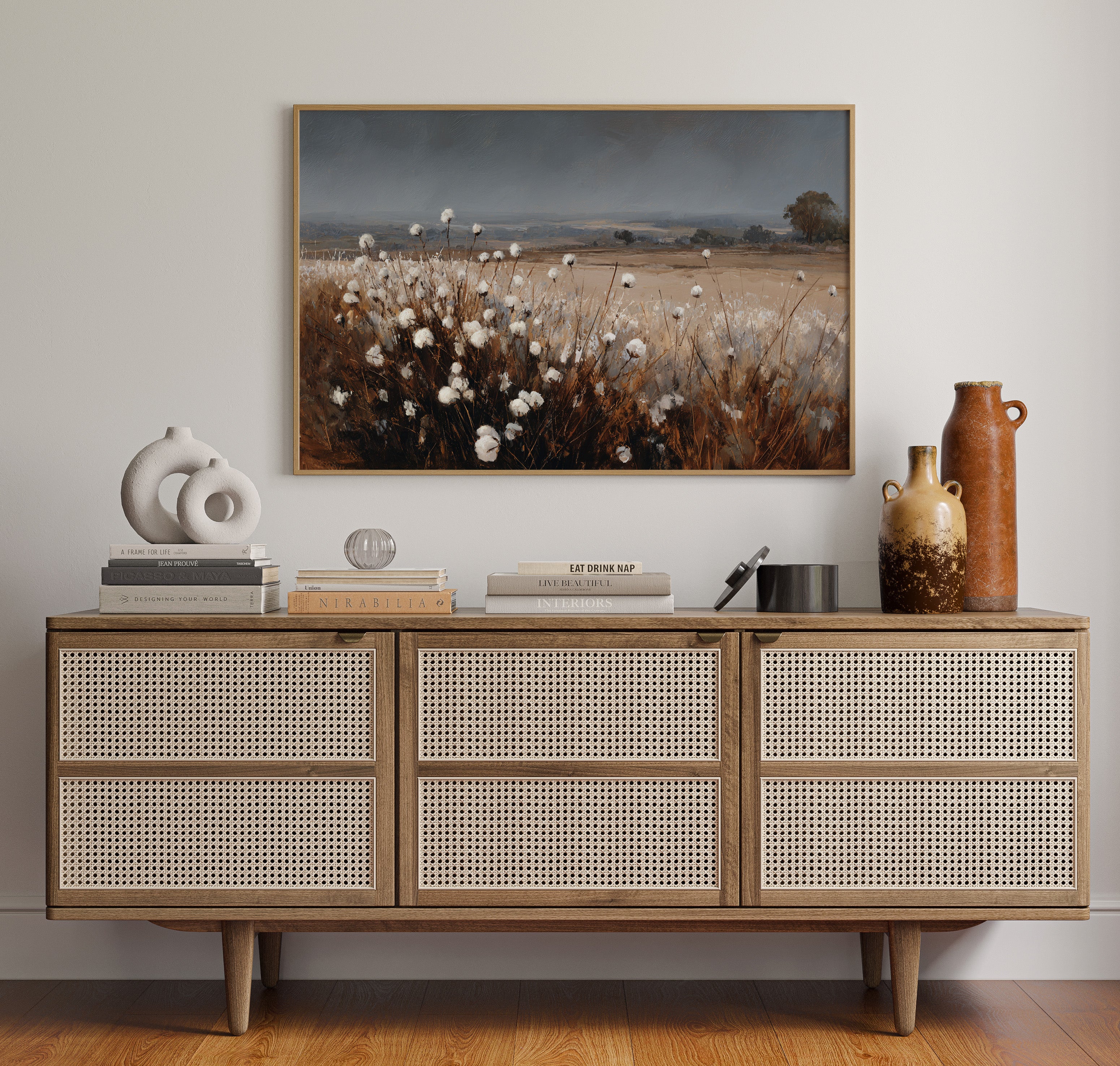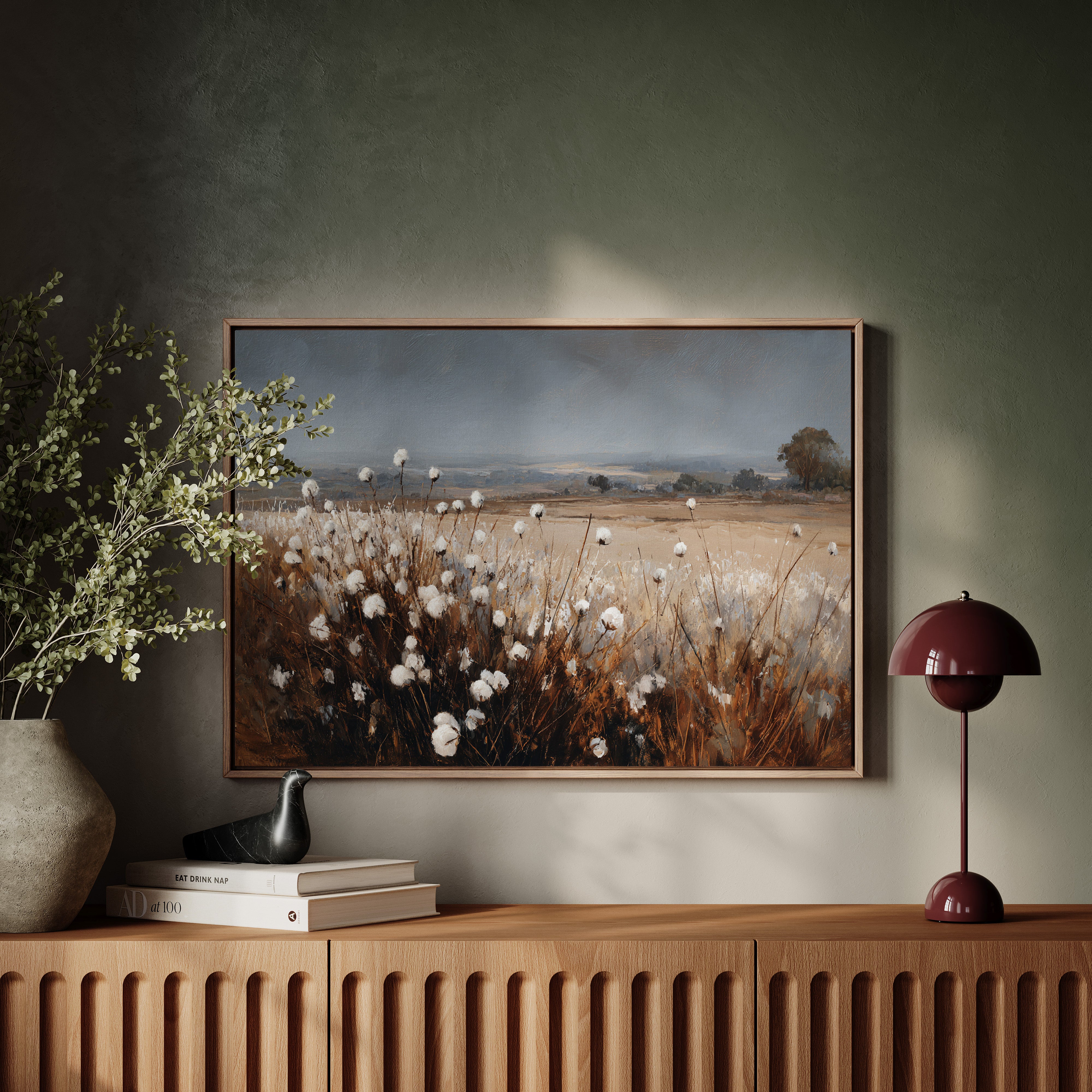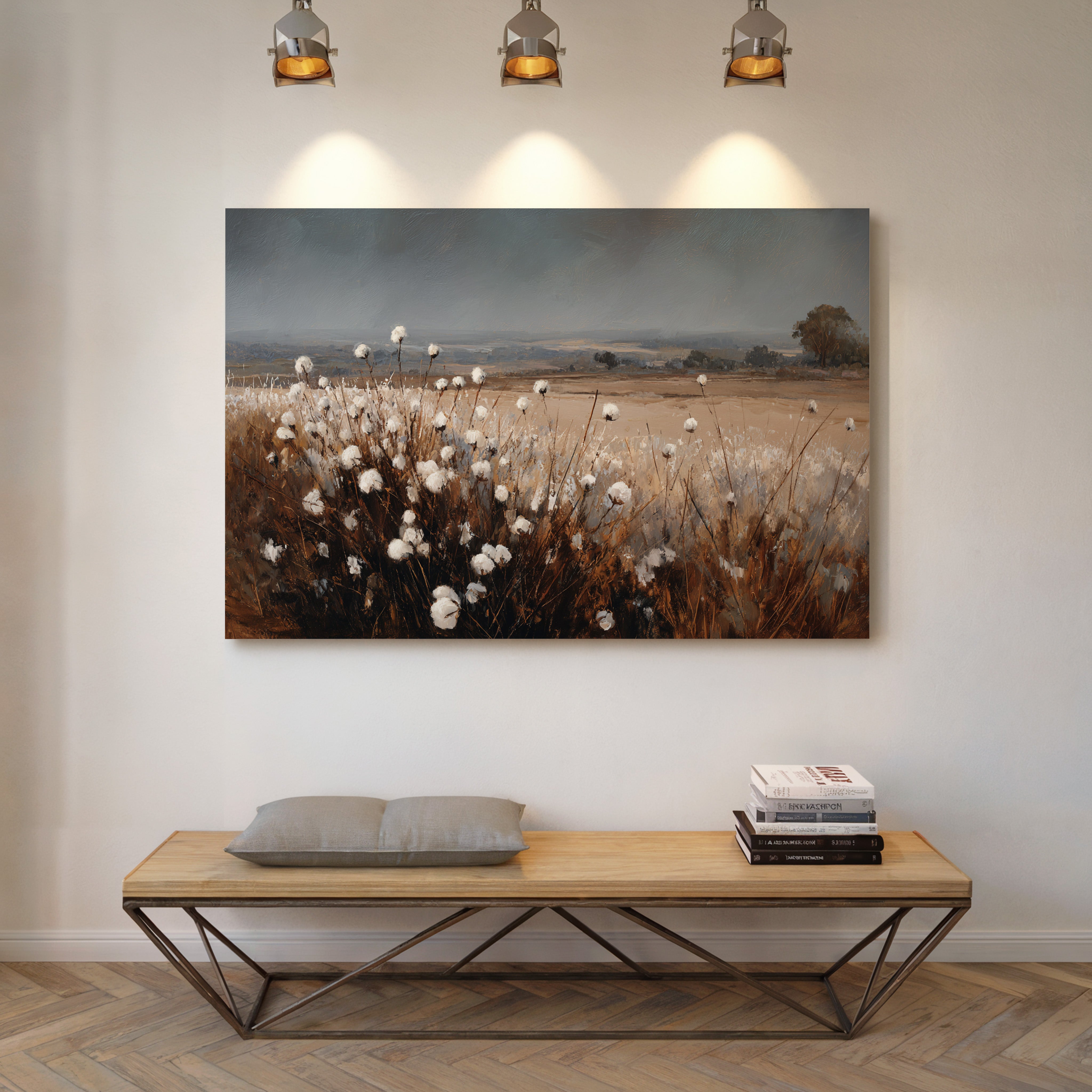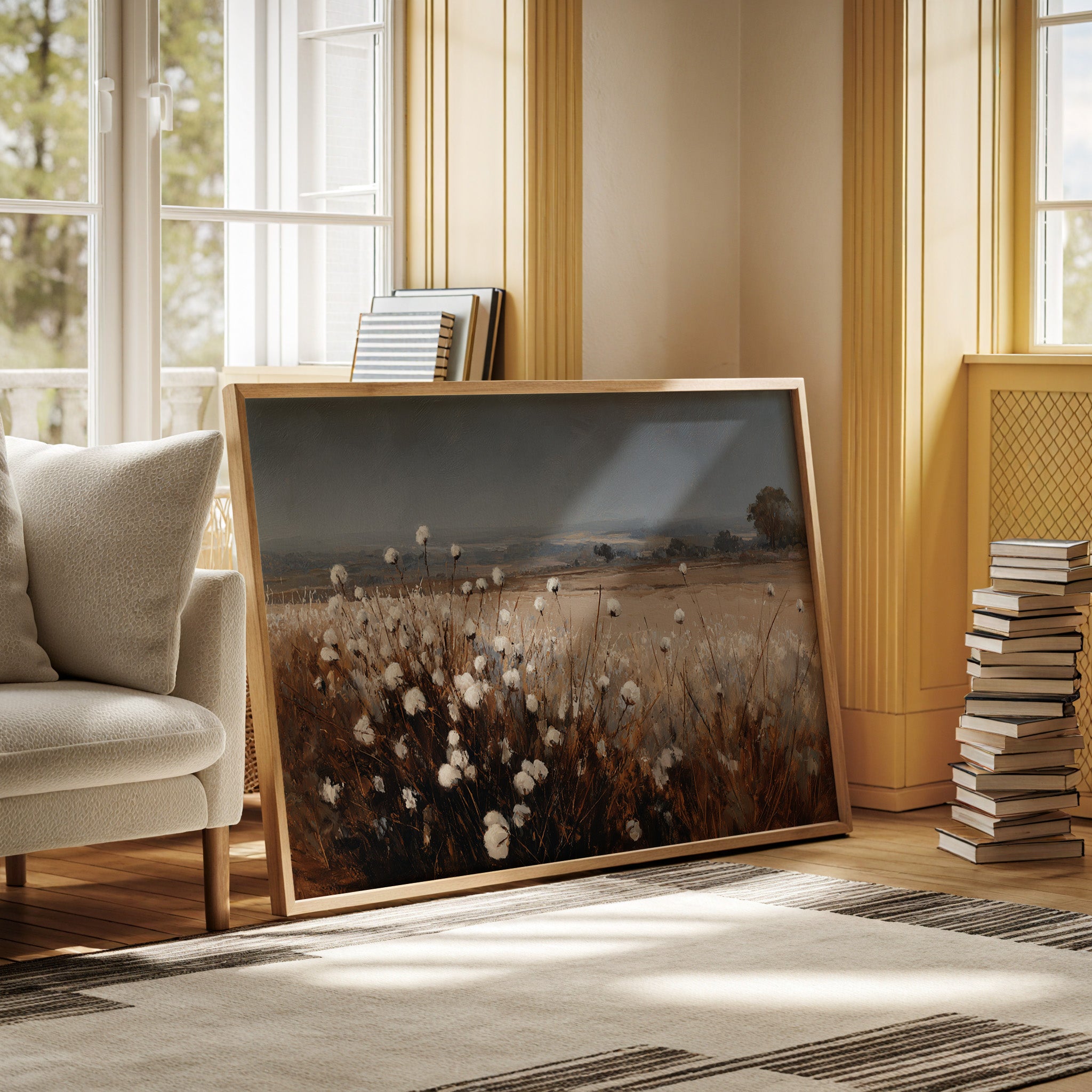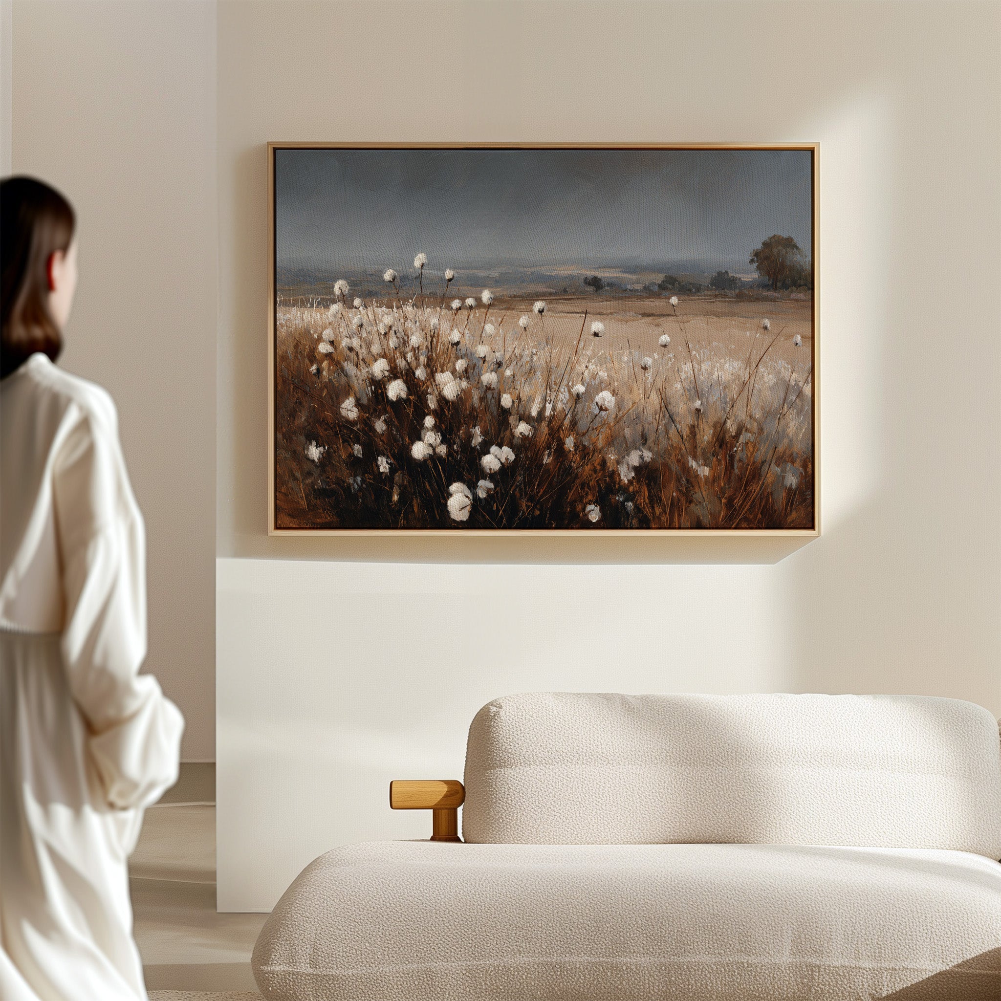 In the quiet of dusk, cotton blooms sway gently, their soft white heads reaching for the fading light. This piece celebrates the artisanal beauty found in nature's simplest offerings. Rich browns contrast with the delicate whites, creating a tactile landscape that invites reflection and appreciation. The horizon stretches wide, hinting at journeys yet to unfold, while the gentle rustle of the cotton whispers stories of growth and renewal. Ideal for a cozy den or a sunlit nook, this piece brings warmth and tranquility to any space.