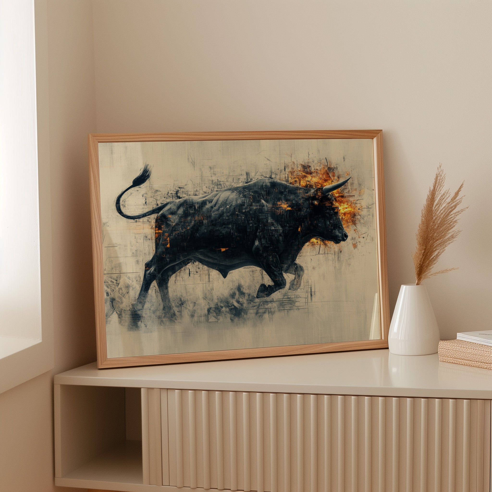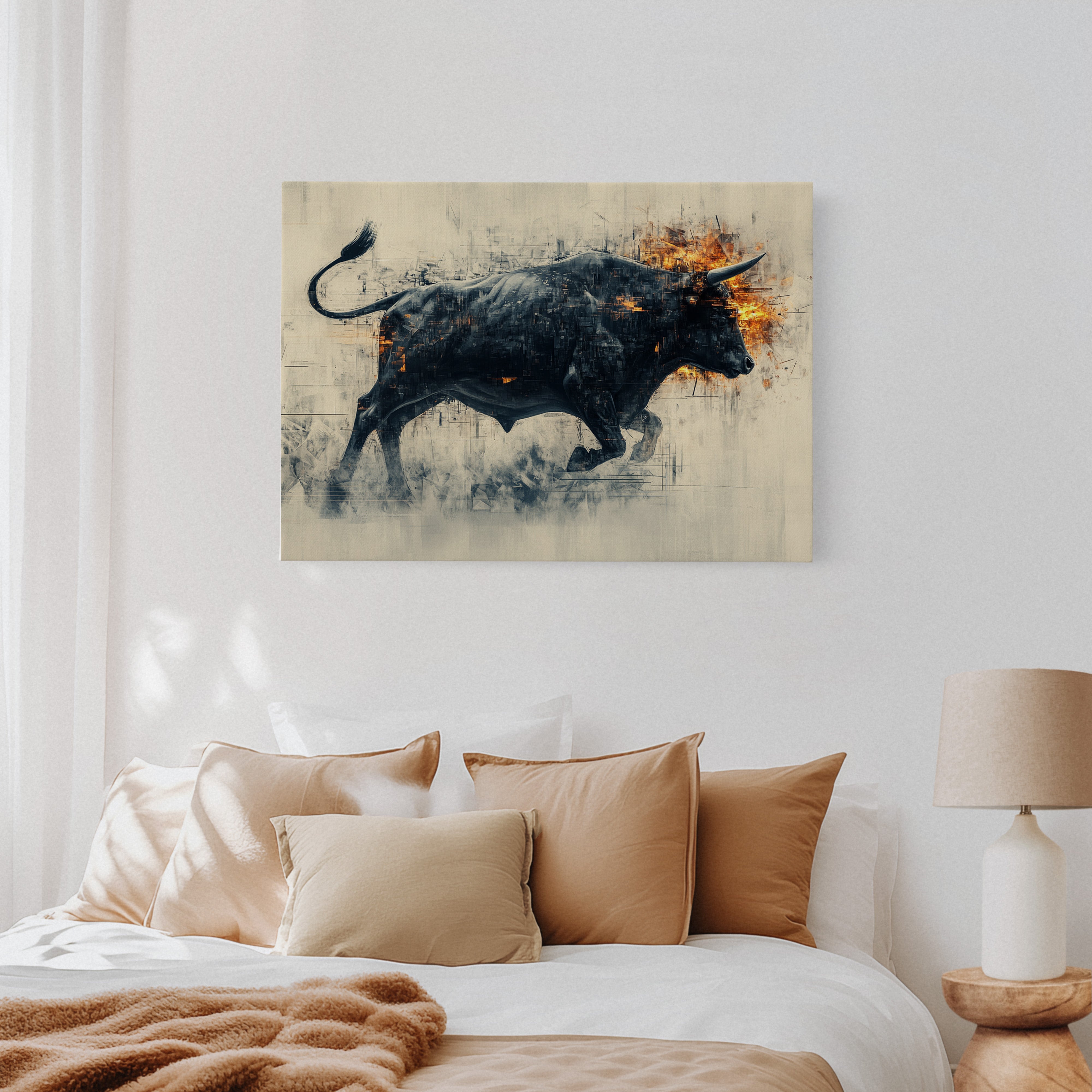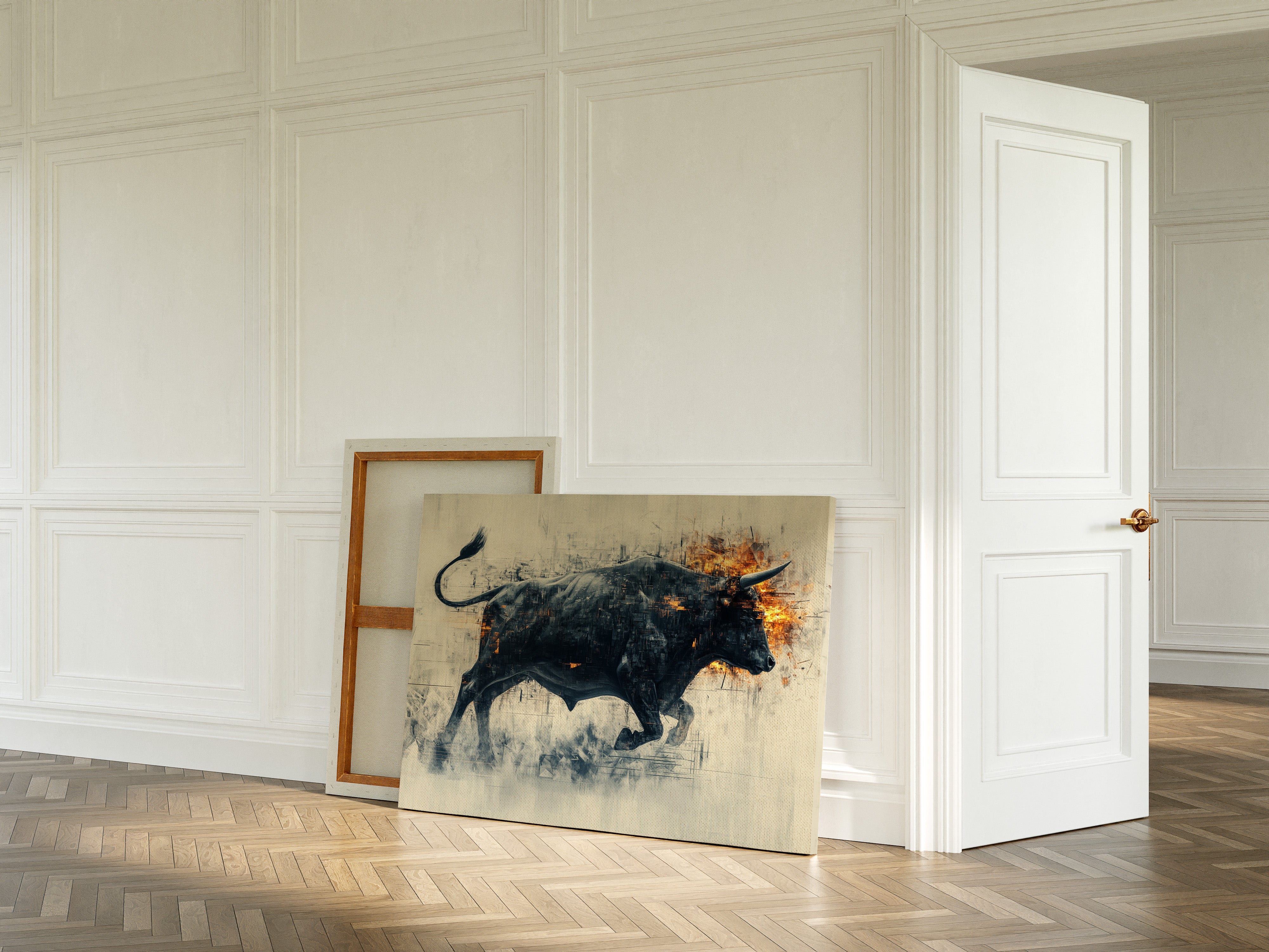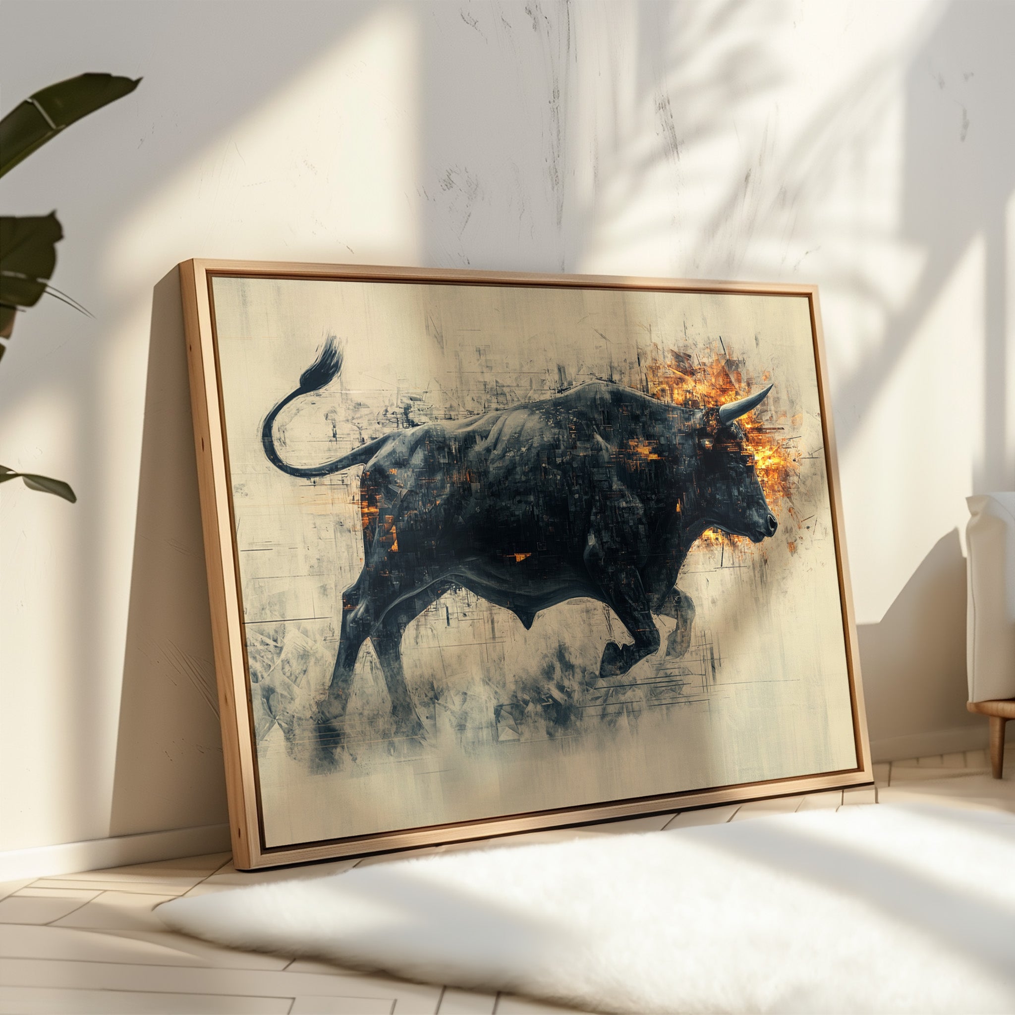 A powerful black bull emerges from textured shadows, its form both solid and ethereal against a misty backdrop. Flames dance across its head and shoulders, creating a stunning contrast between the cool darkness of its body and the warm intensity of the fire. The artistic technique blends sharp geometric fragments with fluid motion, capturing raw power in mid-stride.