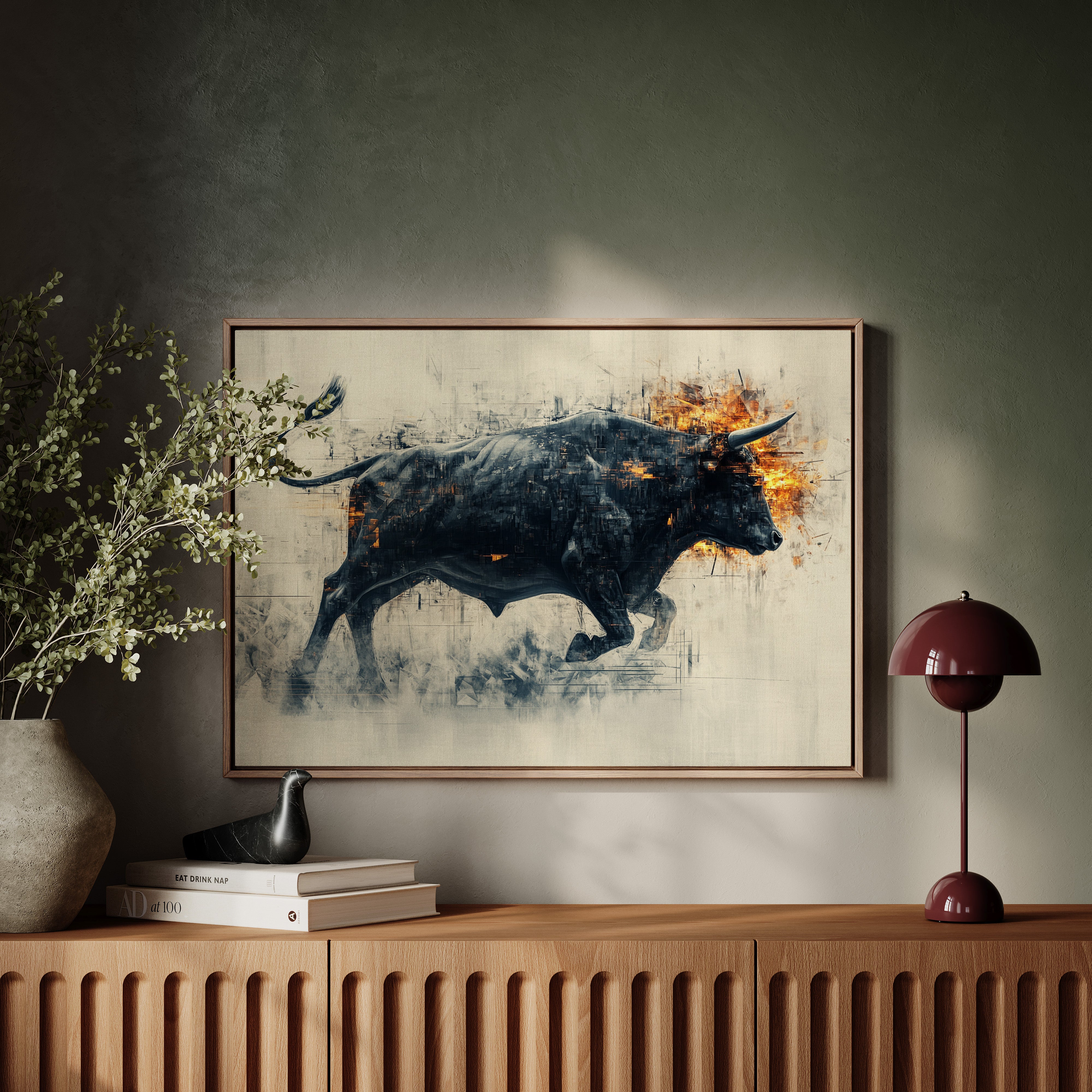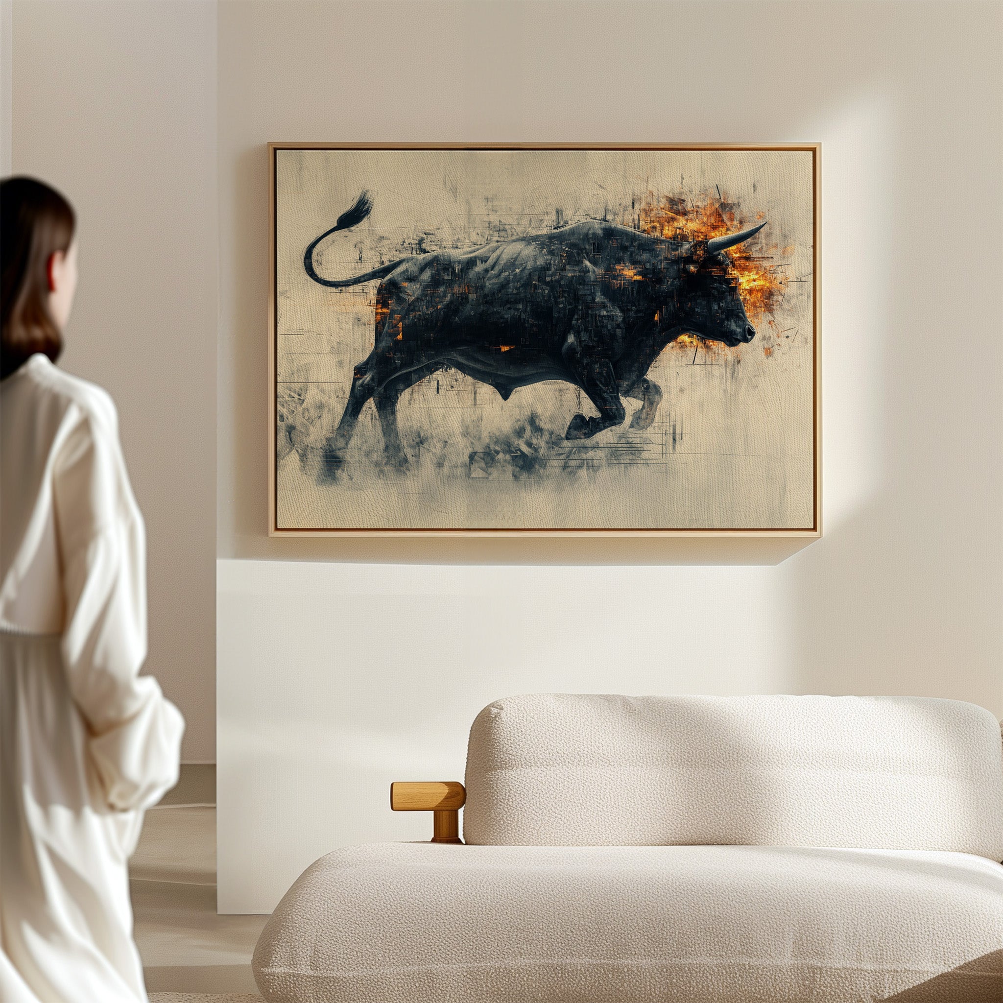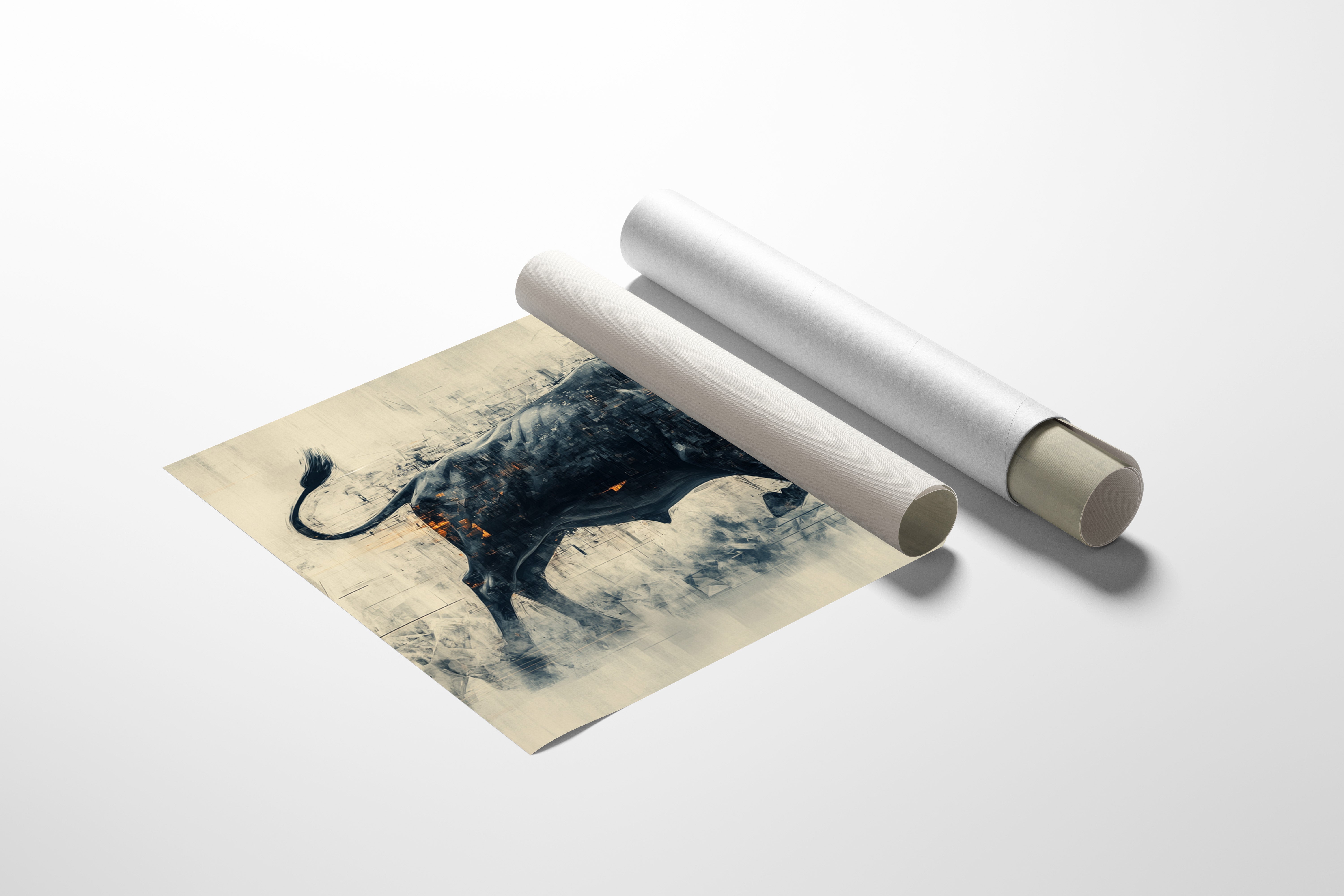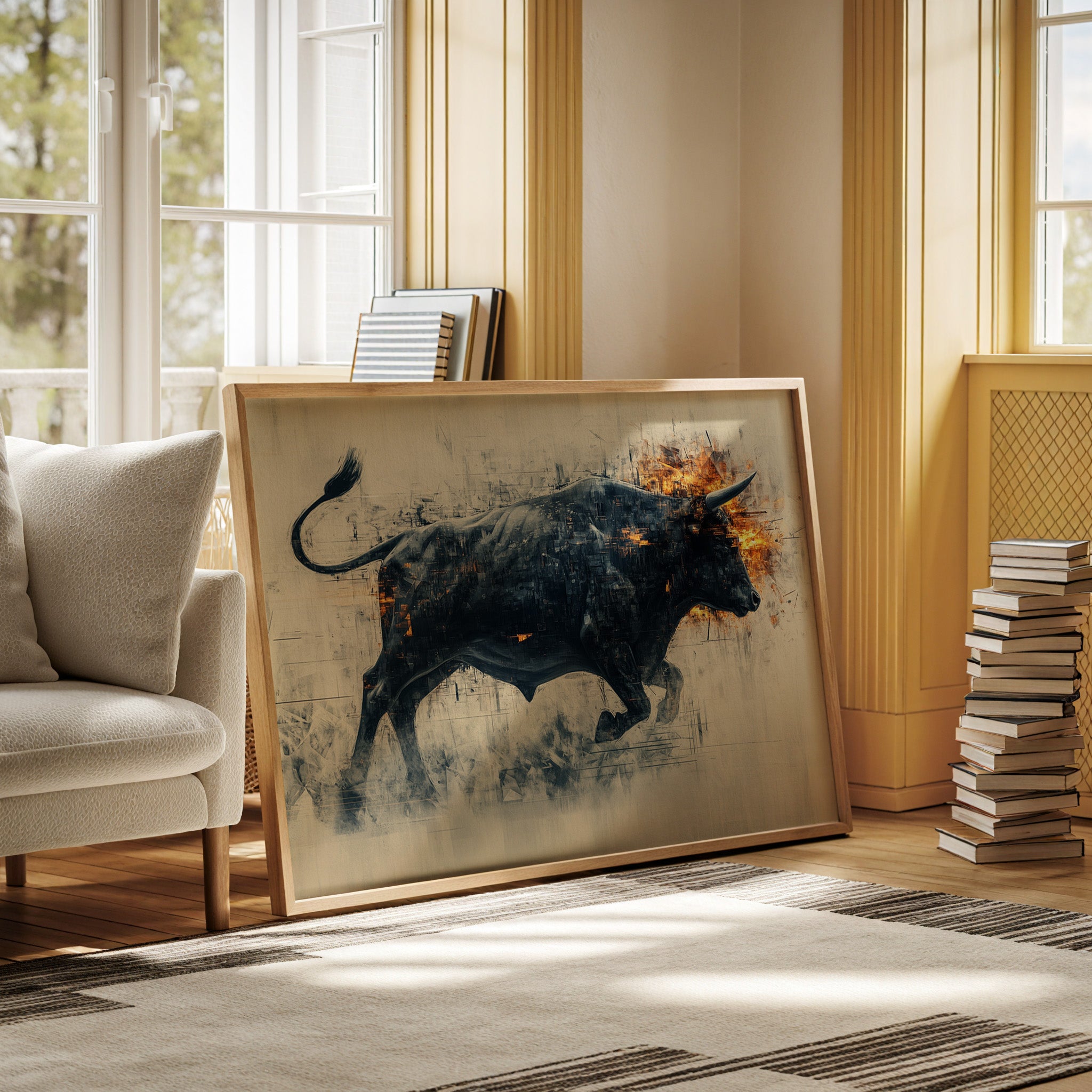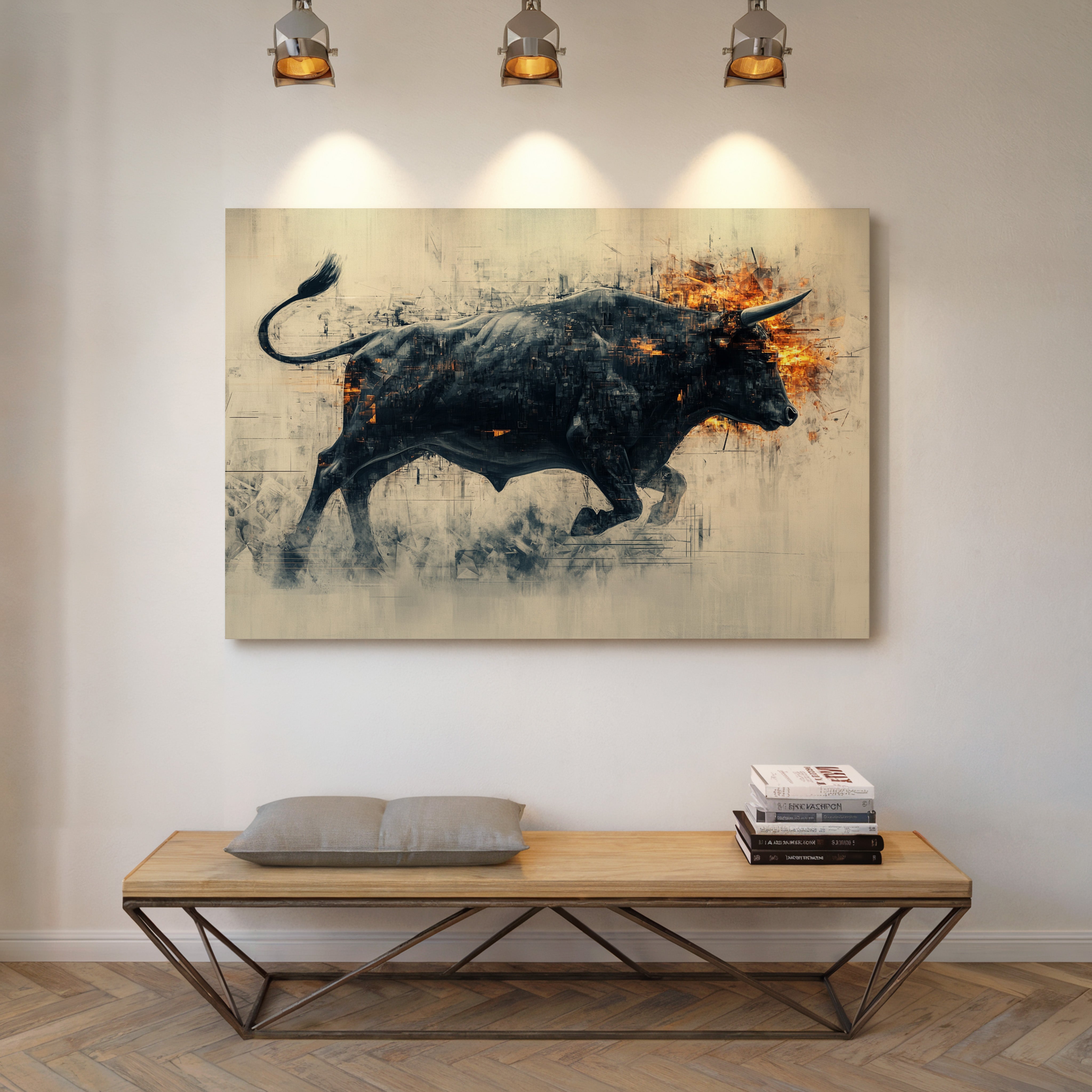 A powerful black bull emerges from textured shadows, its form both solid and ethereal against a misty backdrop. Flames dance across its head and shoulders, creating a stunning contrast between the cool darkness of its body and the warm intensity of the fire. The artistic technique blends sharp geometric fragments with fluid motion, capturing raw power in mid-stride.