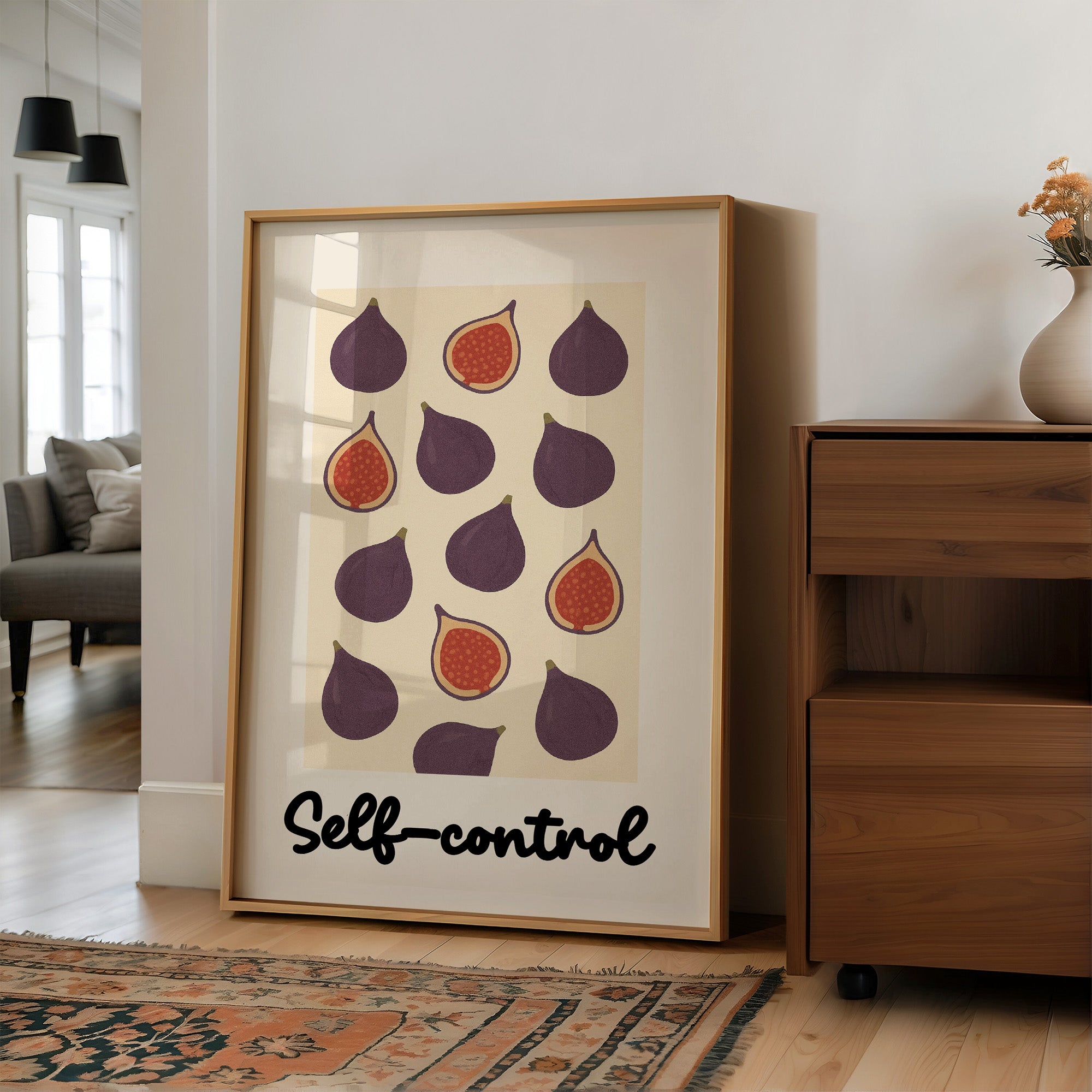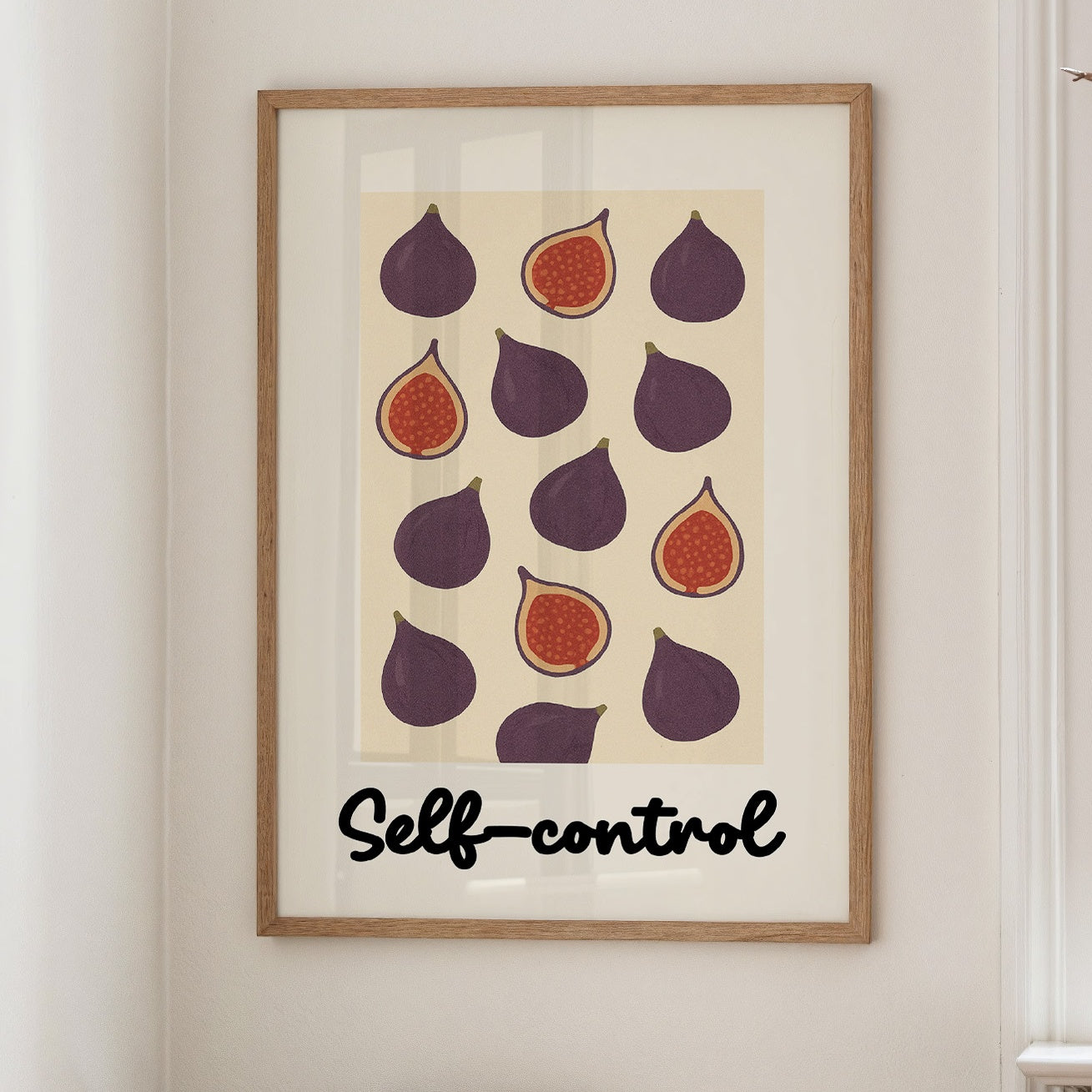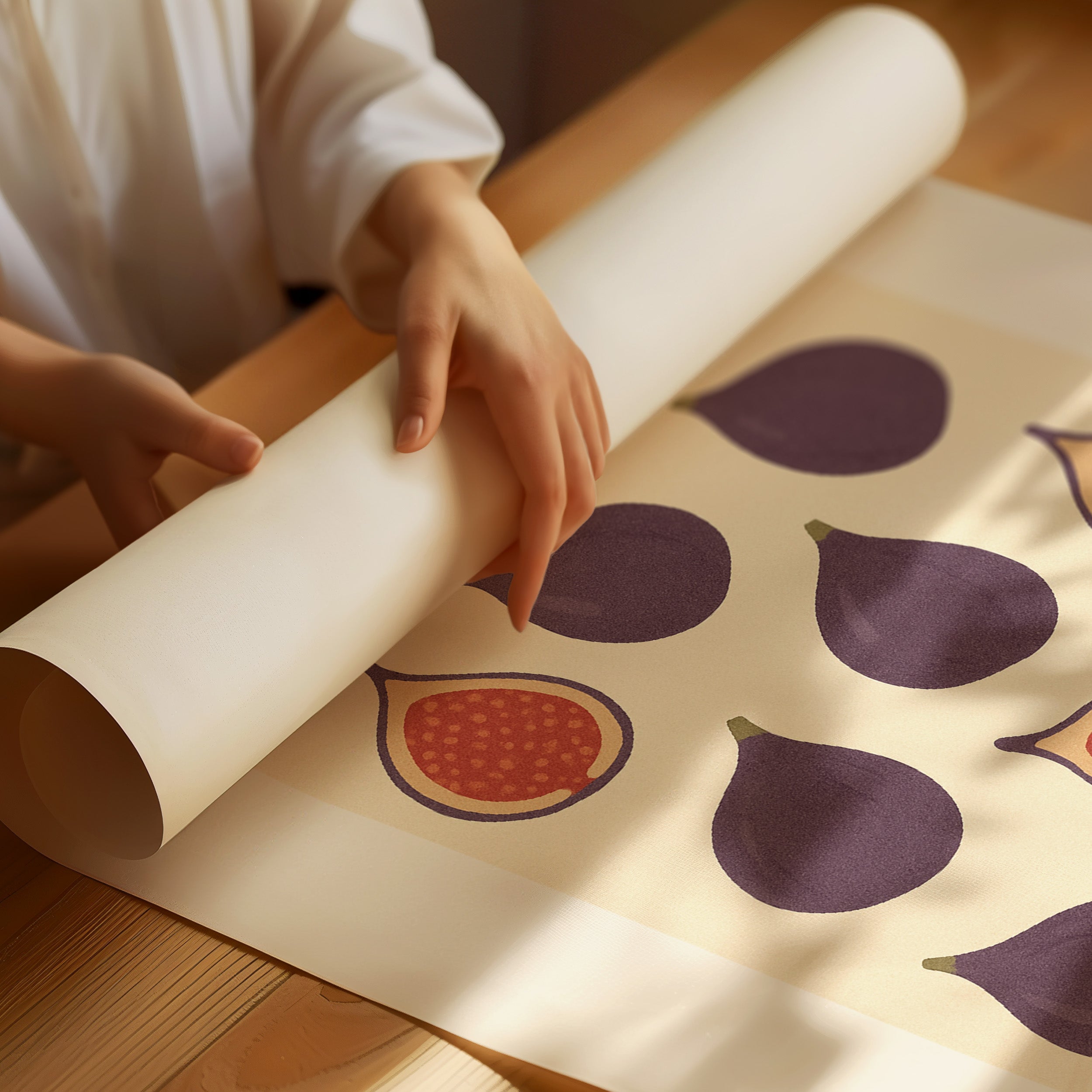 The warm cream background cradles deep purple figs, some split open to reveal their crimson secrets inside. The simple, stylized illustration captures that perfect late summer moment when Mediterranean fruits reach their peak sweetness. Each fig is rendered with gentle curves and subtle texture, the contrast between the dark exteriors and vibrant interiors creating a visual rhythm across the composition.