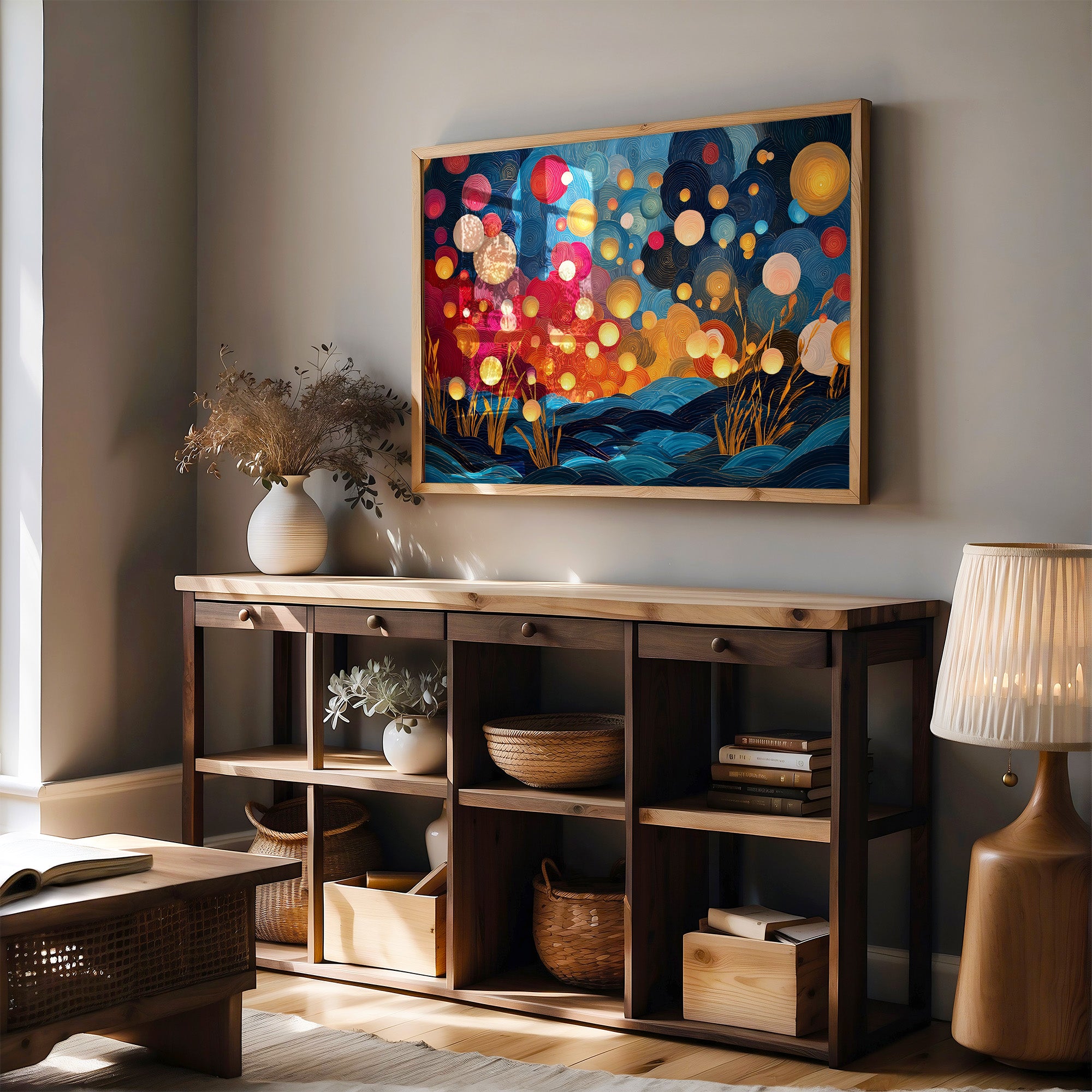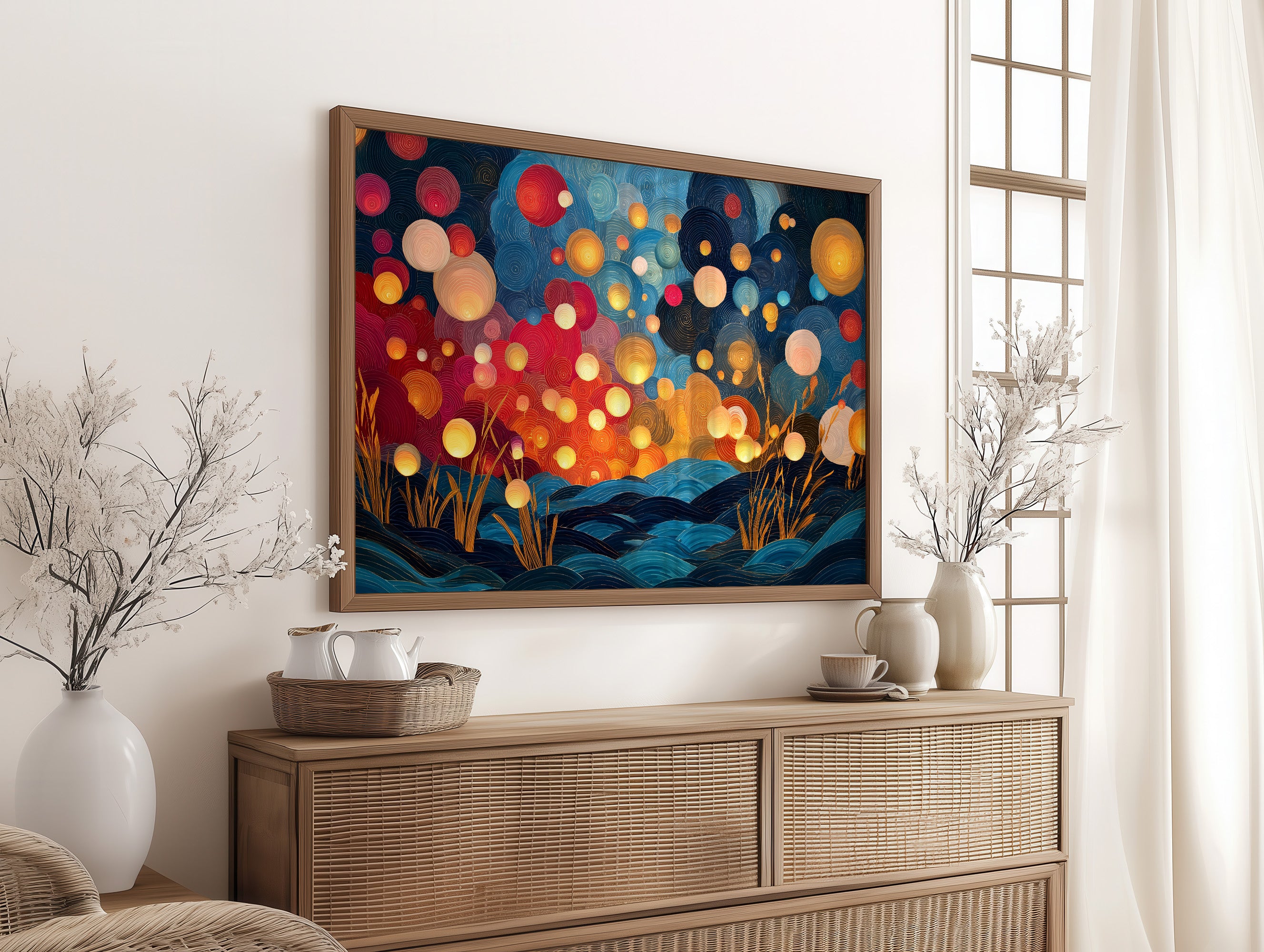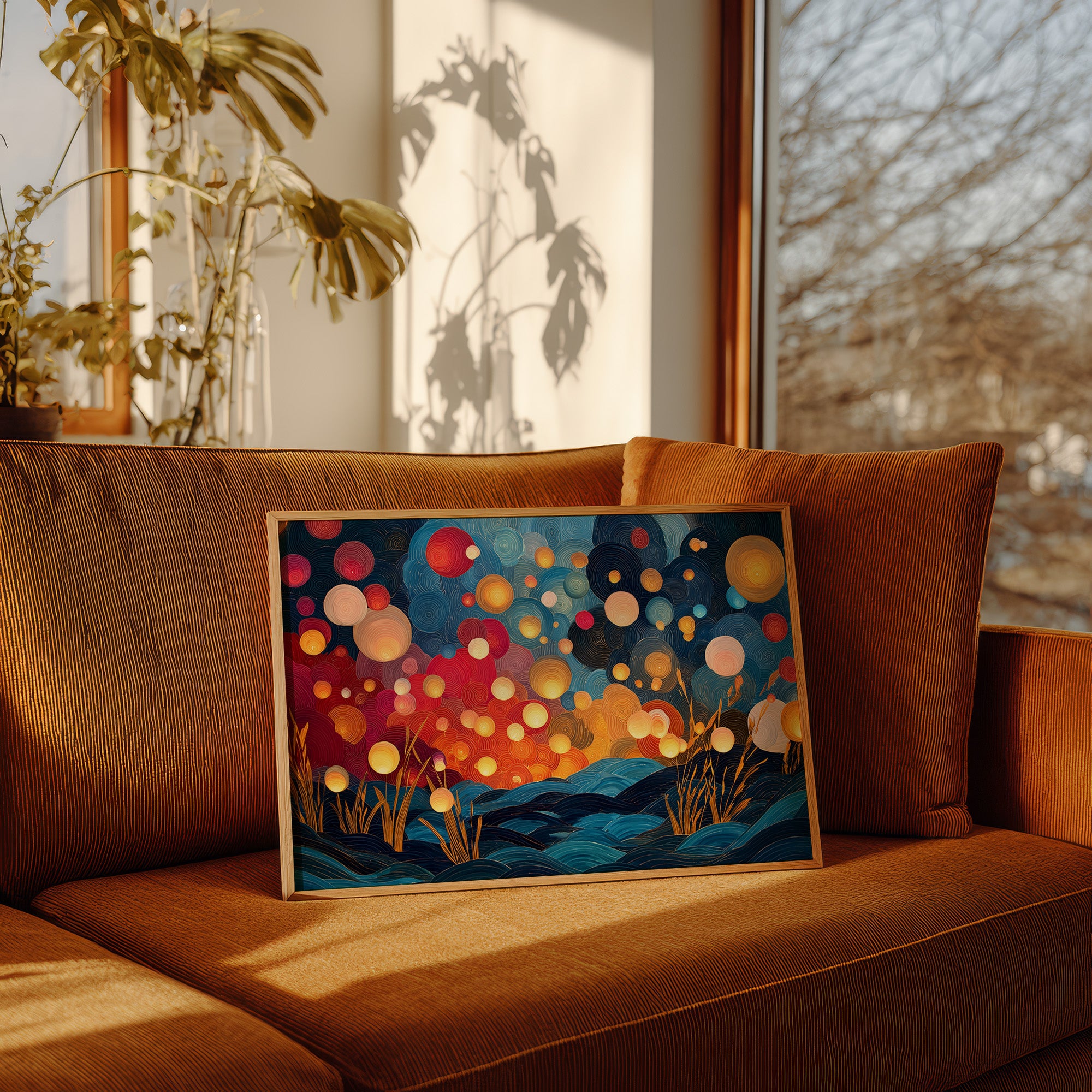 Luminous orbs float like summer memories against a deep turquoise sky, each circle a captured moment of magic. The scene unfolds in layers of rich blues and warm oranges, with delicate reeds swaying beneath a constellation of glowing spheres. The textured waves roll beneath like a midnight ocean, creating a dreamlike landscape where reality meets imagination. This piece brings a touch of enchantment to any room, perfect for a reading nook or meditation space where one seeks both comfort and inspiration.
