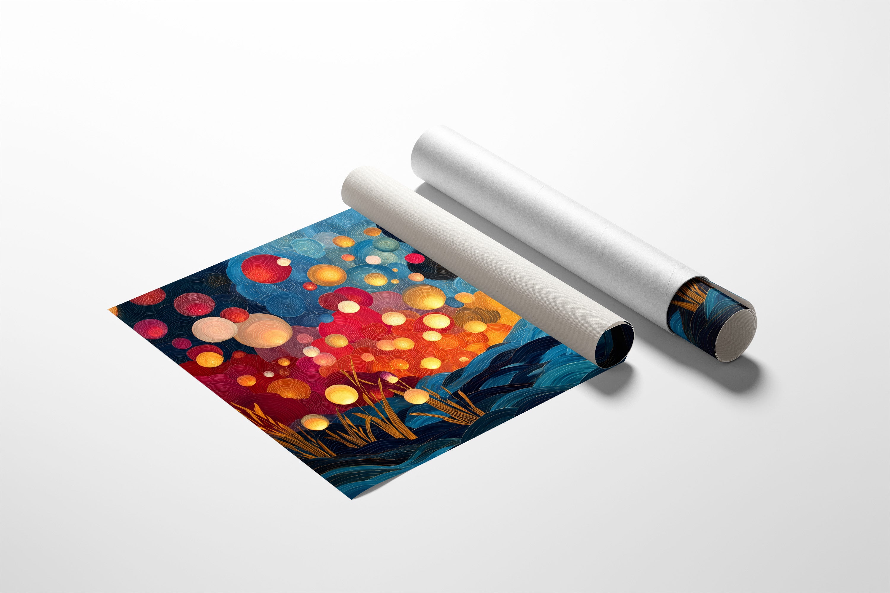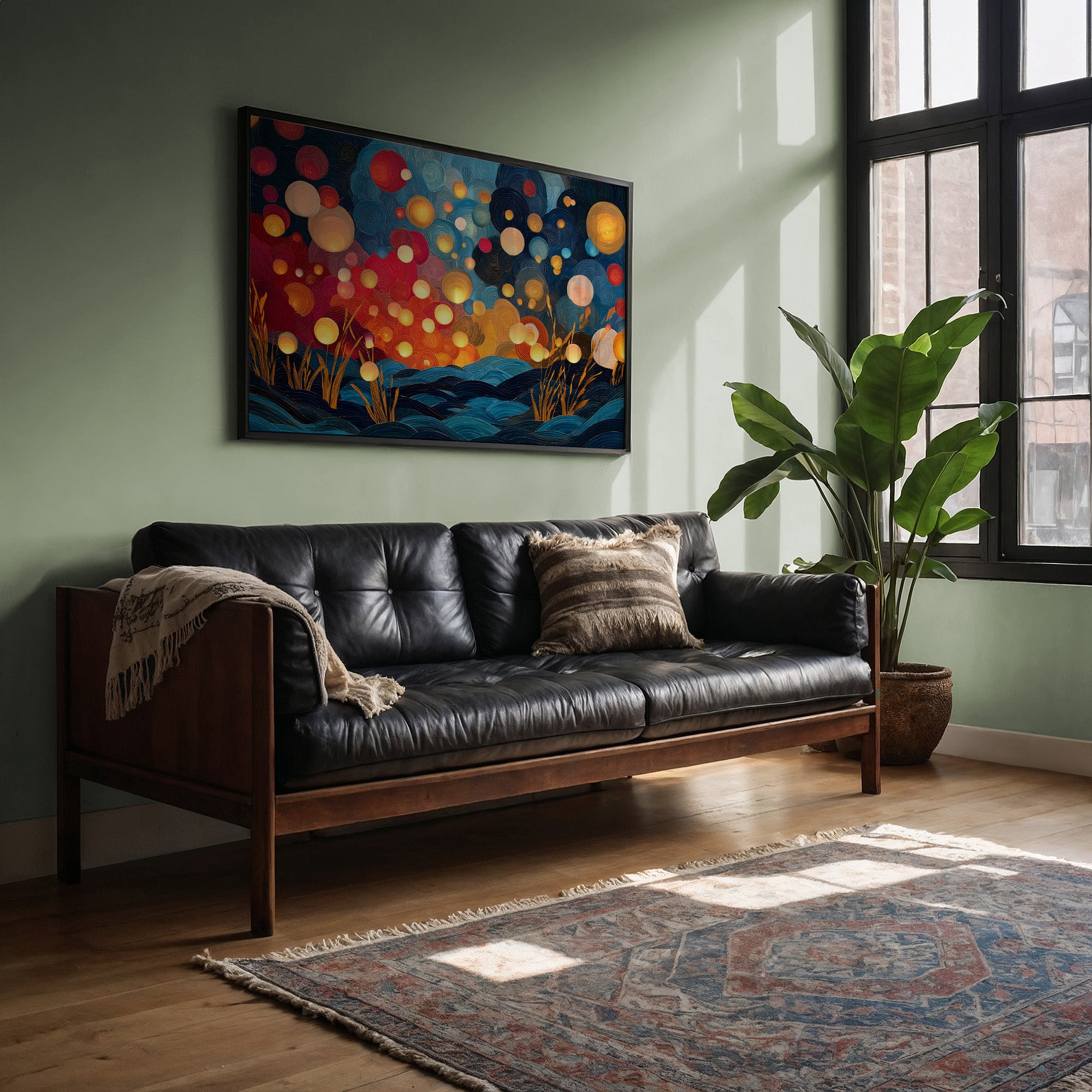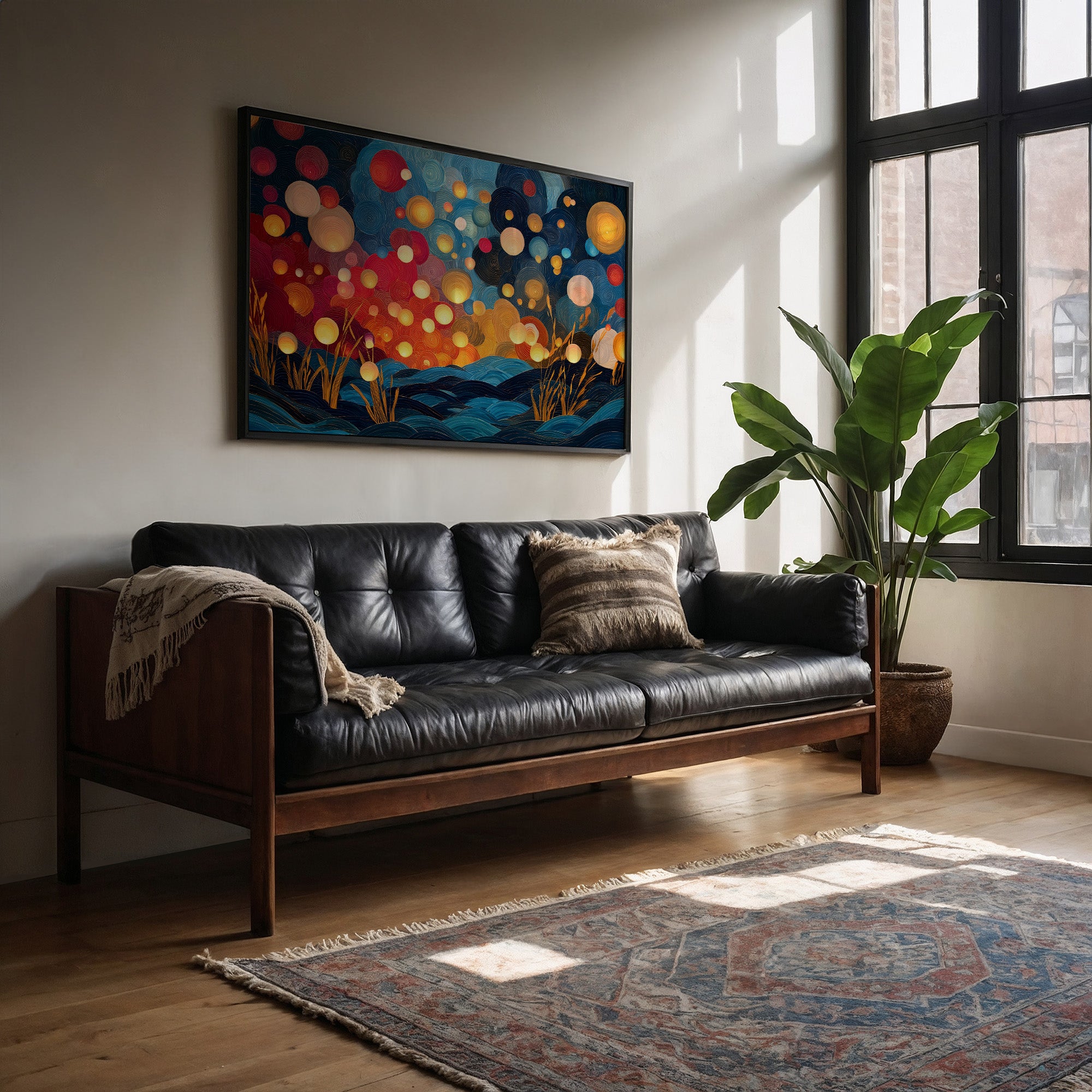 Luminous orbs float like summer memories against a deep turquoise sky, each circle a captured moment of magic. The scene unfolds in layers of rich blues and warm oranges, with delicate reeds swaying beneath a constellation of glowing spheres. The textured waves roll beneath like a midnight ocean, creating a dreamlike landscape where reality meets imagination. This piece brings a touch of enchantment to any room, perfect for a reading nook or meditation space where one seeks both comfort and inspiration.