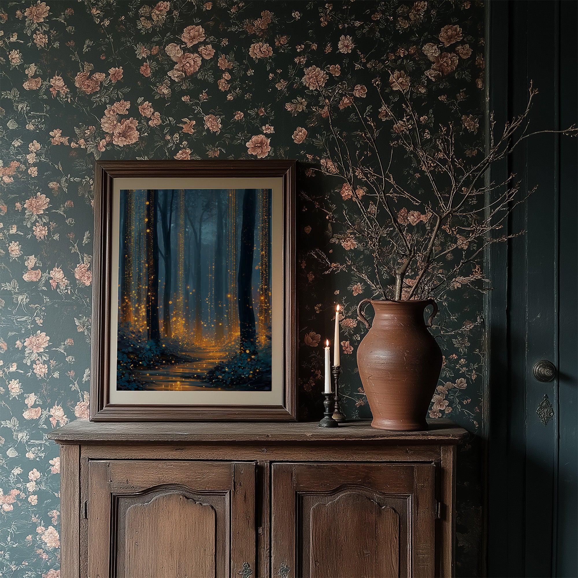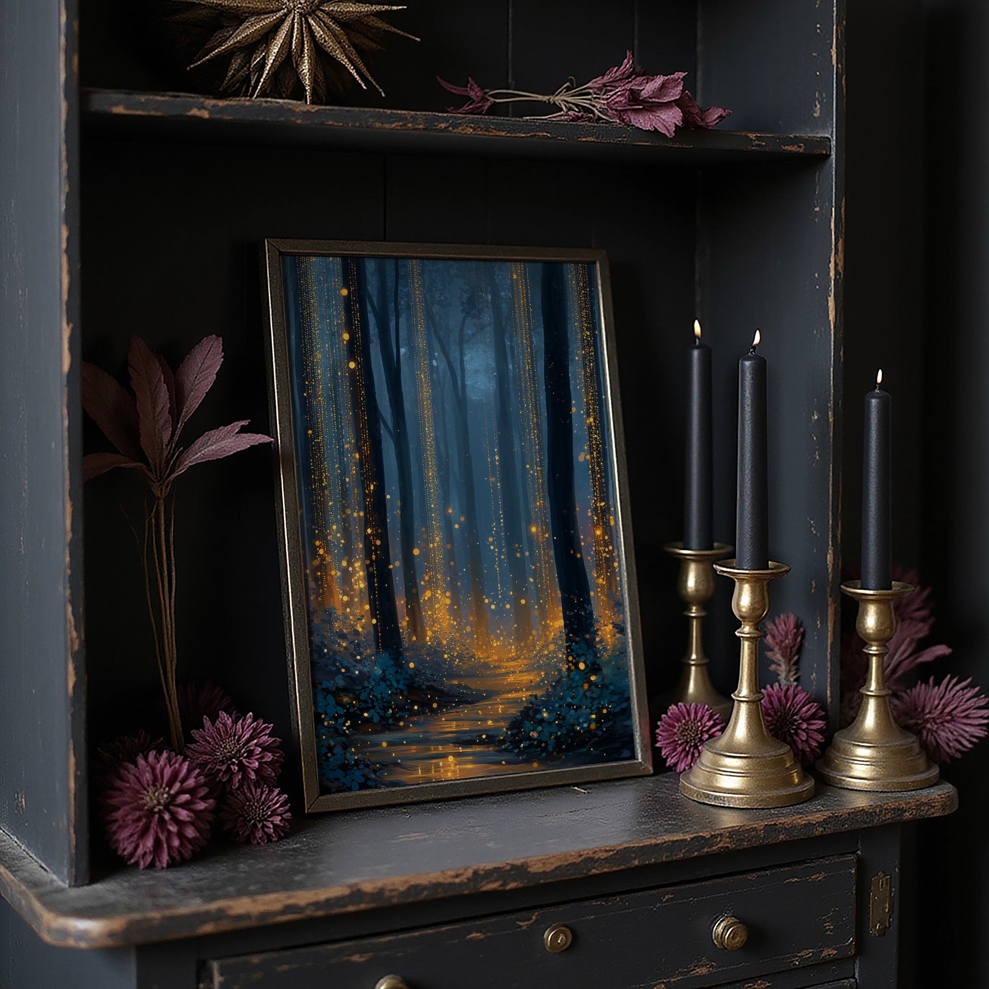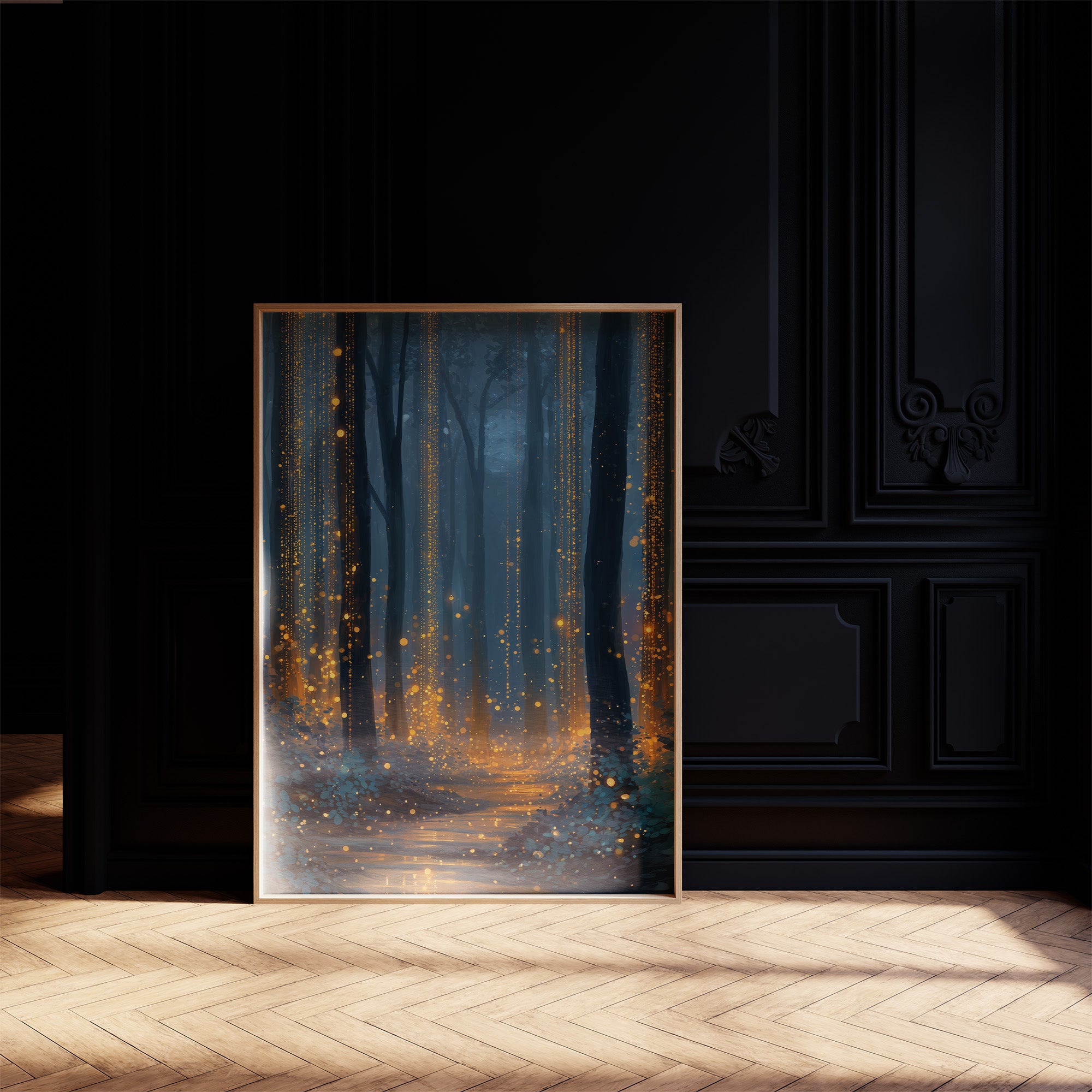 Golden light spills across the forest floor like scattered coins, illuminating a path through the blue-tinted darkness. The misty woodland transforms into an ethereal corridor where reality blurs with fantasy, as amber particles drift between ancient tree trunks like nocturnal fireflies finding their way home. This enchanted scene captures that magical hour when the forest holds its secrets closest, inviting viewers into a world where nature and dreams converge.