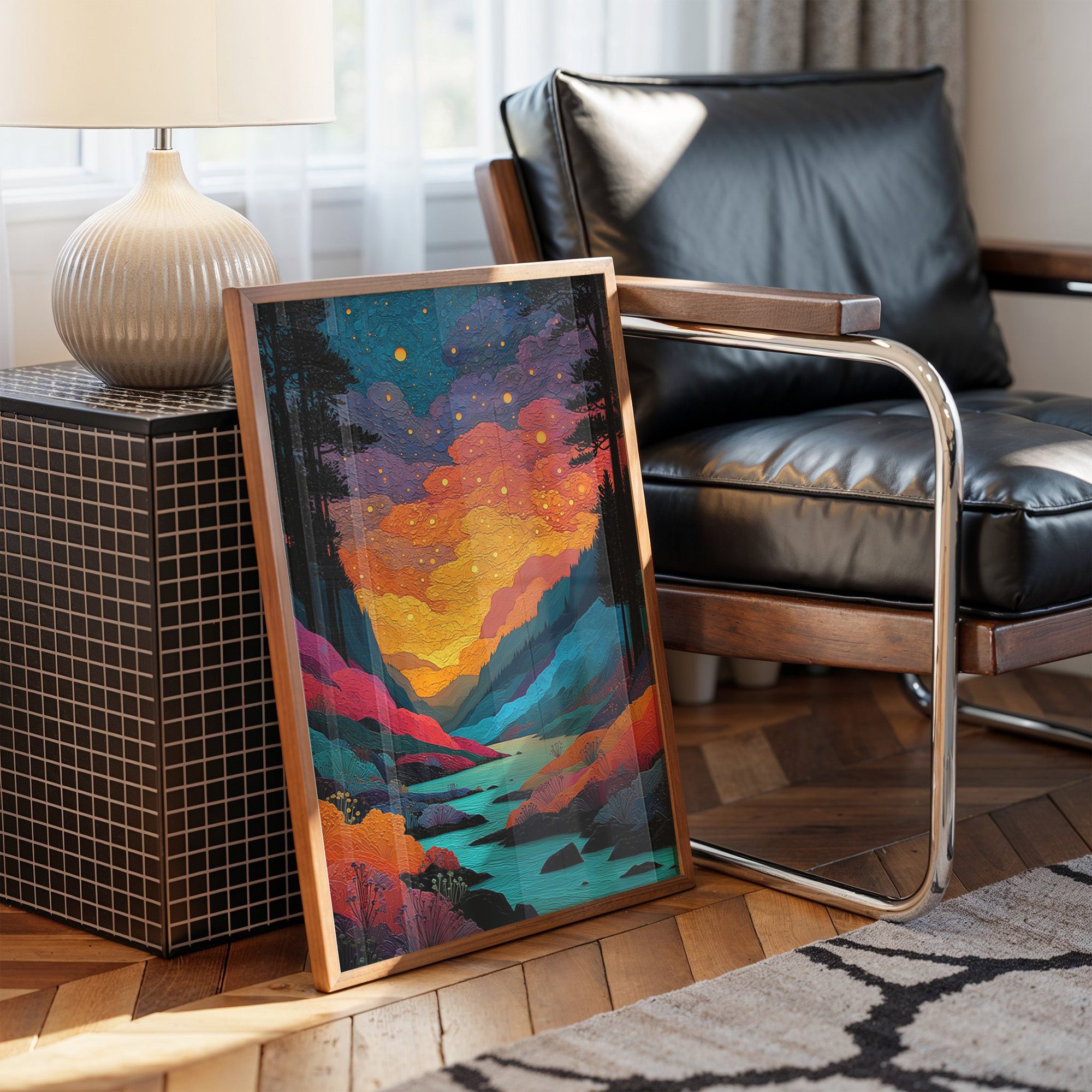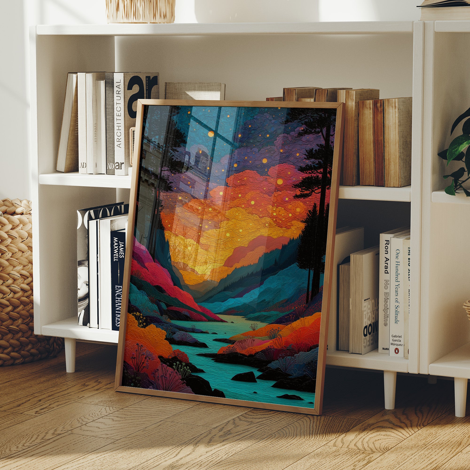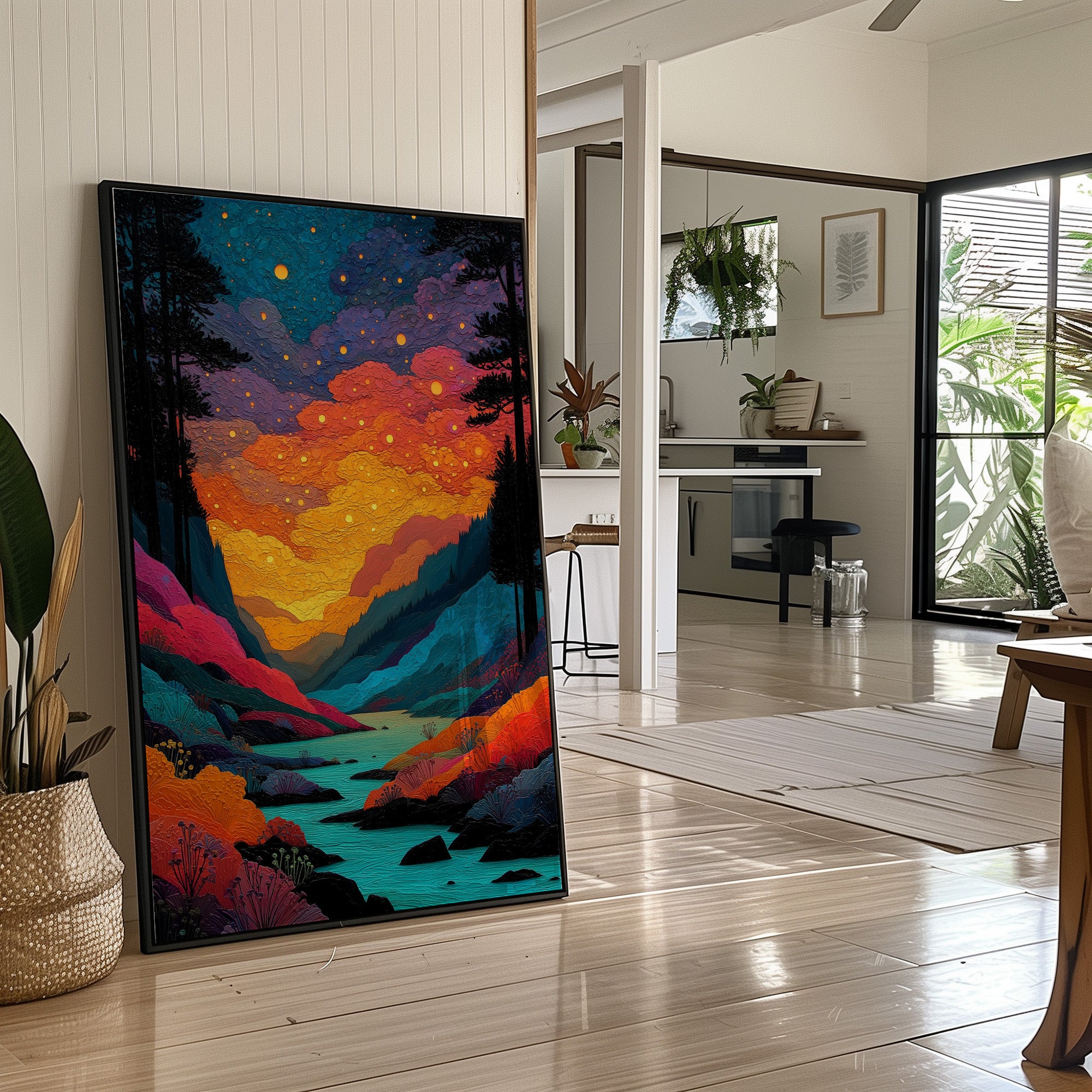 A magical twilight scene unfolds as countless fireflies dance across a vibrant landscape. The sky blazes with deep oranges and teals, while a winding turquoise river cuts through crimson-hued valleys. The composition draws viewers into a dreamlike wilderness where reality and fantasy merge in a symphony of bold, contemporary colors. This piece captures the ethereal moment when day surrenders to night, rendered in rich, saturated hues that seem to pulse with their own inner light. The silhouetted pines stand sentinel along the edges, framing the spectacular view of glowing dots scattered like stars fallen to earth. This statement piece would transform a modern living room or bedroom into a portal of wonder, especially when mounted where evening light can play across its surface. Perfect for spaces seeking to blend bold contemporary design with natural themes.