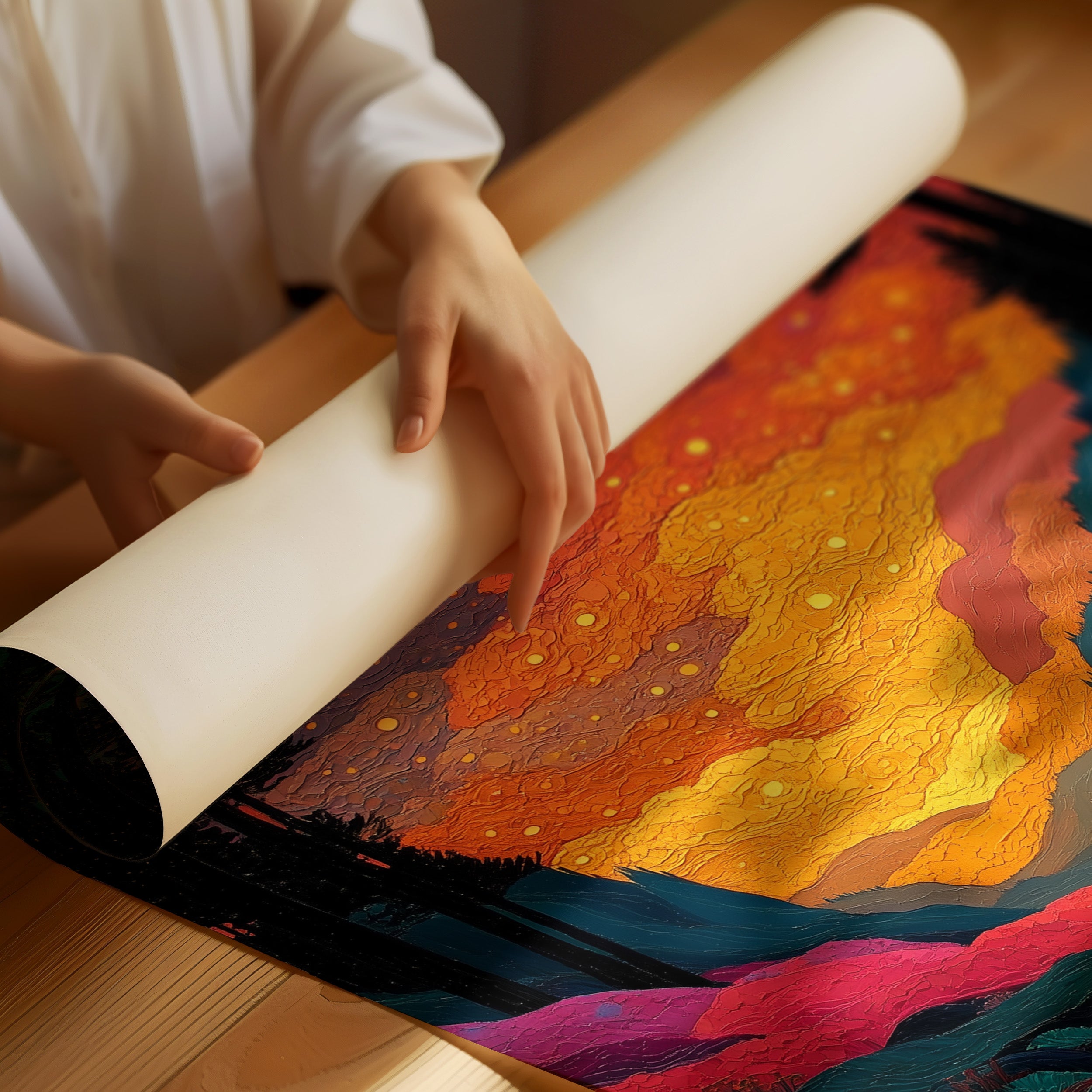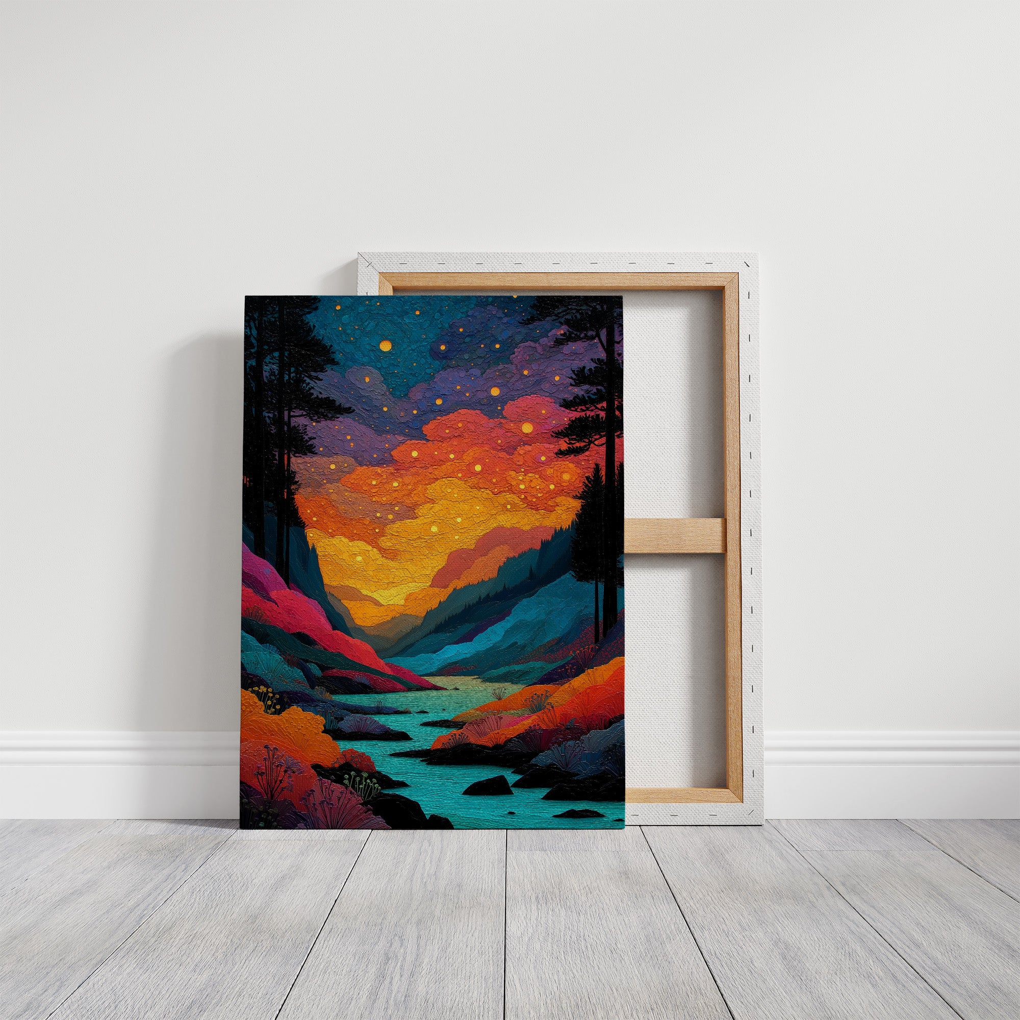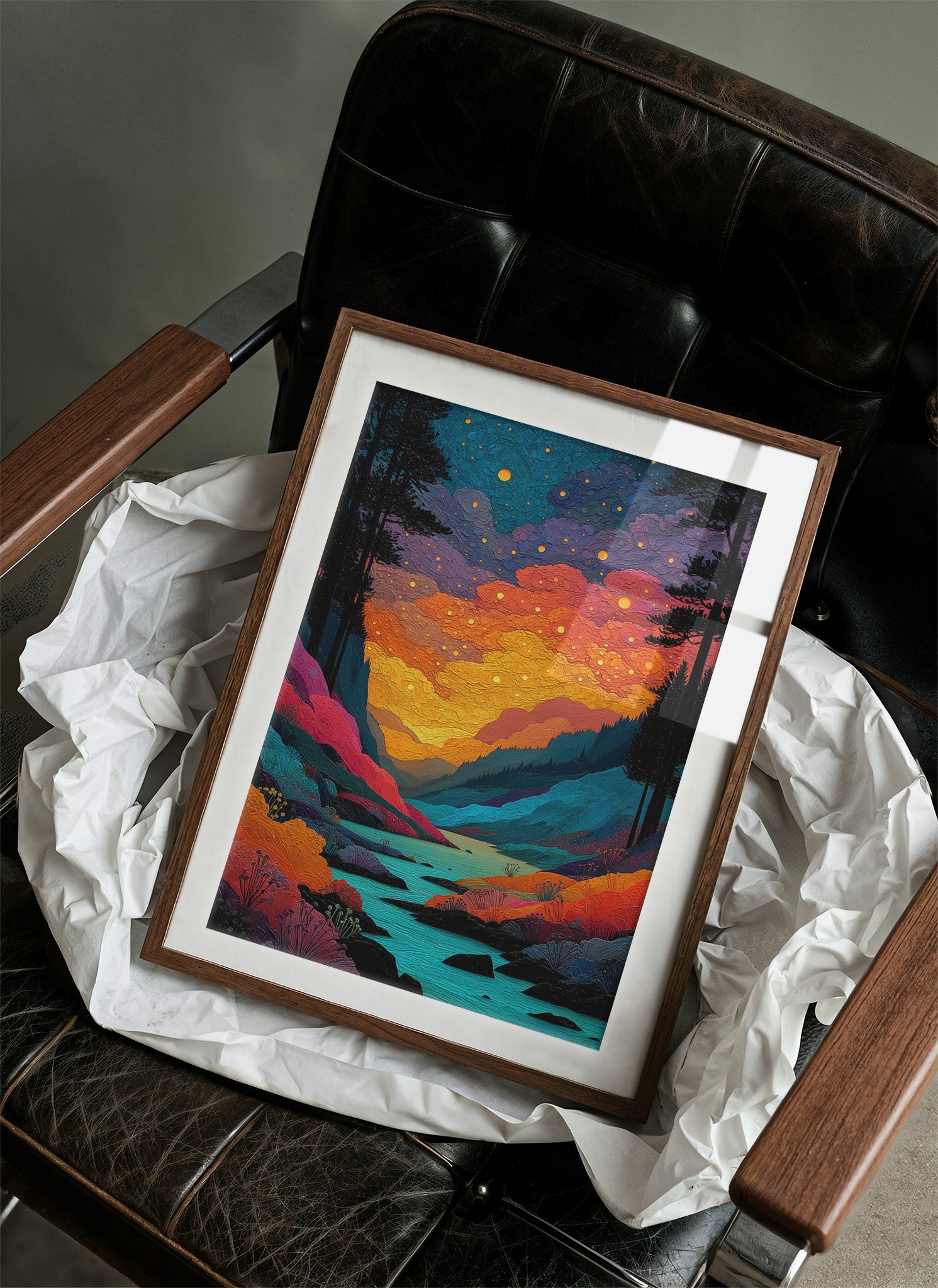 A magical twilight scene unfolds as countless fireflies dance across a vibrant landscape. The sky blazes with deep oranges and teals, while a winding turquoise river cuts through crimson-hued valleys. The composition draws viewers into a dreamlike wilderness where reality and fantasy merge in a symphony of bold, contemporary colors. This piece captures the ethereal moment when day surrenders to night, rendered in rich, saturated hues that seem to pulse with their own inner light. The silhouetted pines stand sentinel along the edges, framing the spectacular view of glowing dots scattered like stars fallen to earth. This statement piece would transform a modern living room or bedroom into a portal of wonder, especially when mounted where evening light can play across its surface. Perfect for spaces seeking to blend bold contemporary design with natural themes.