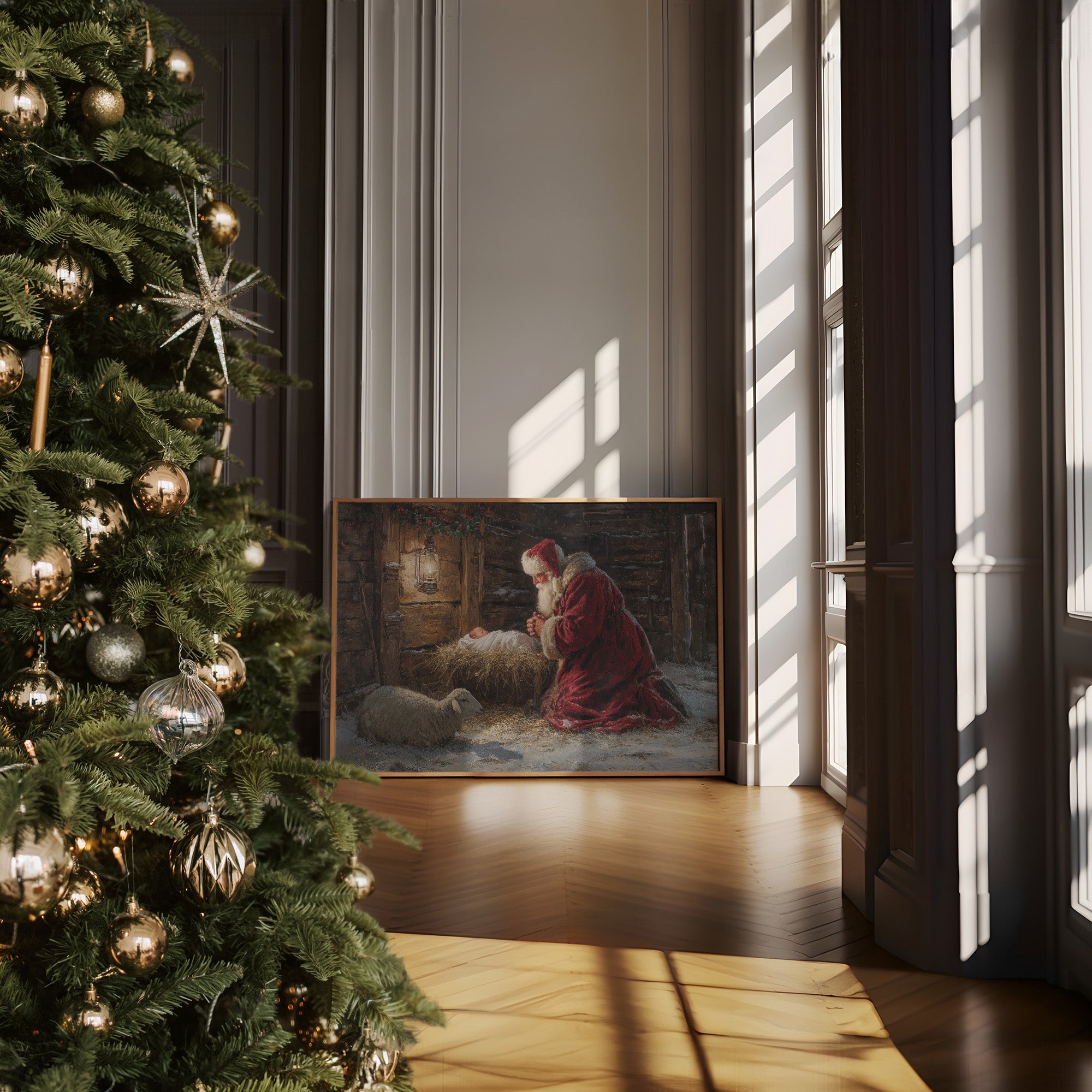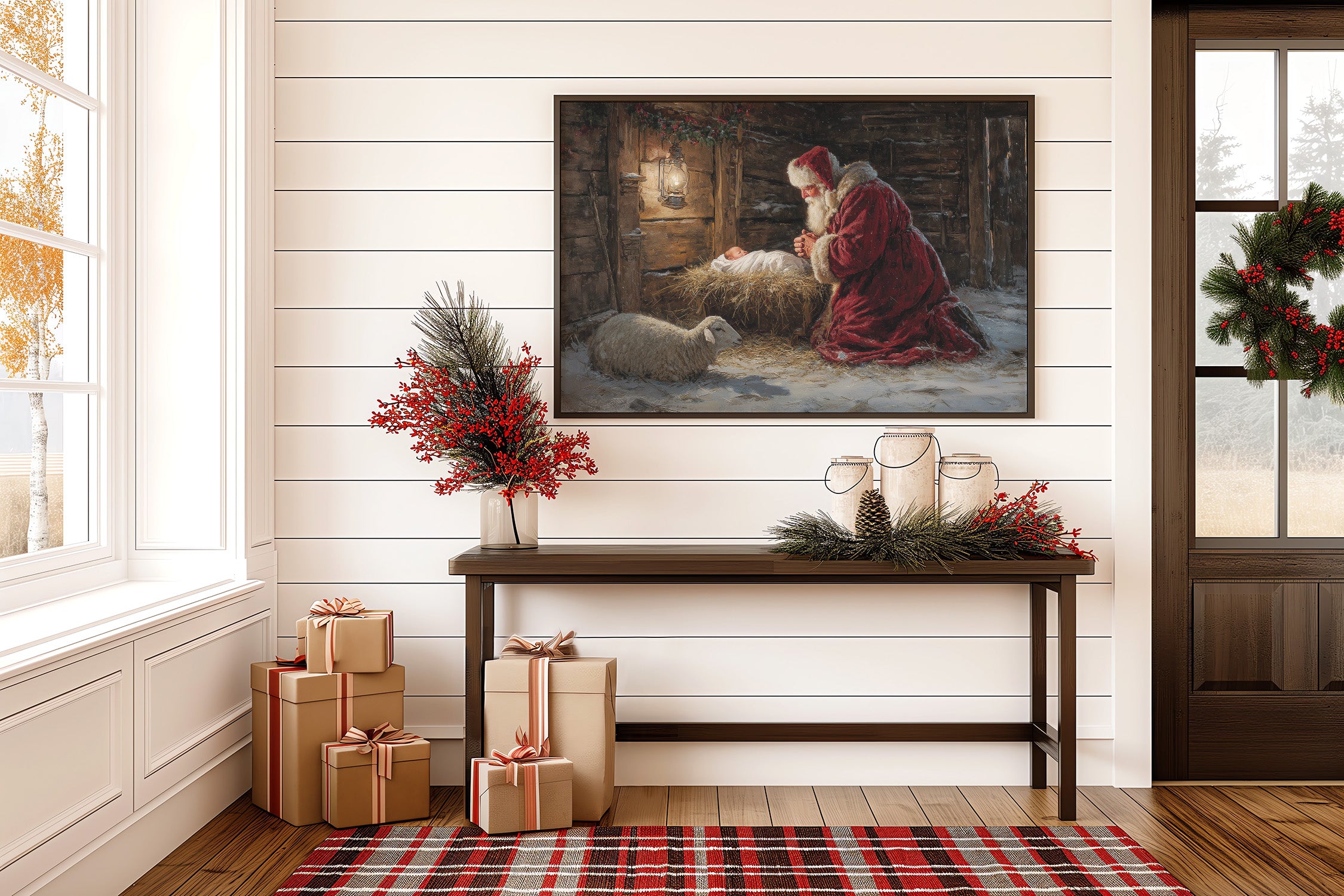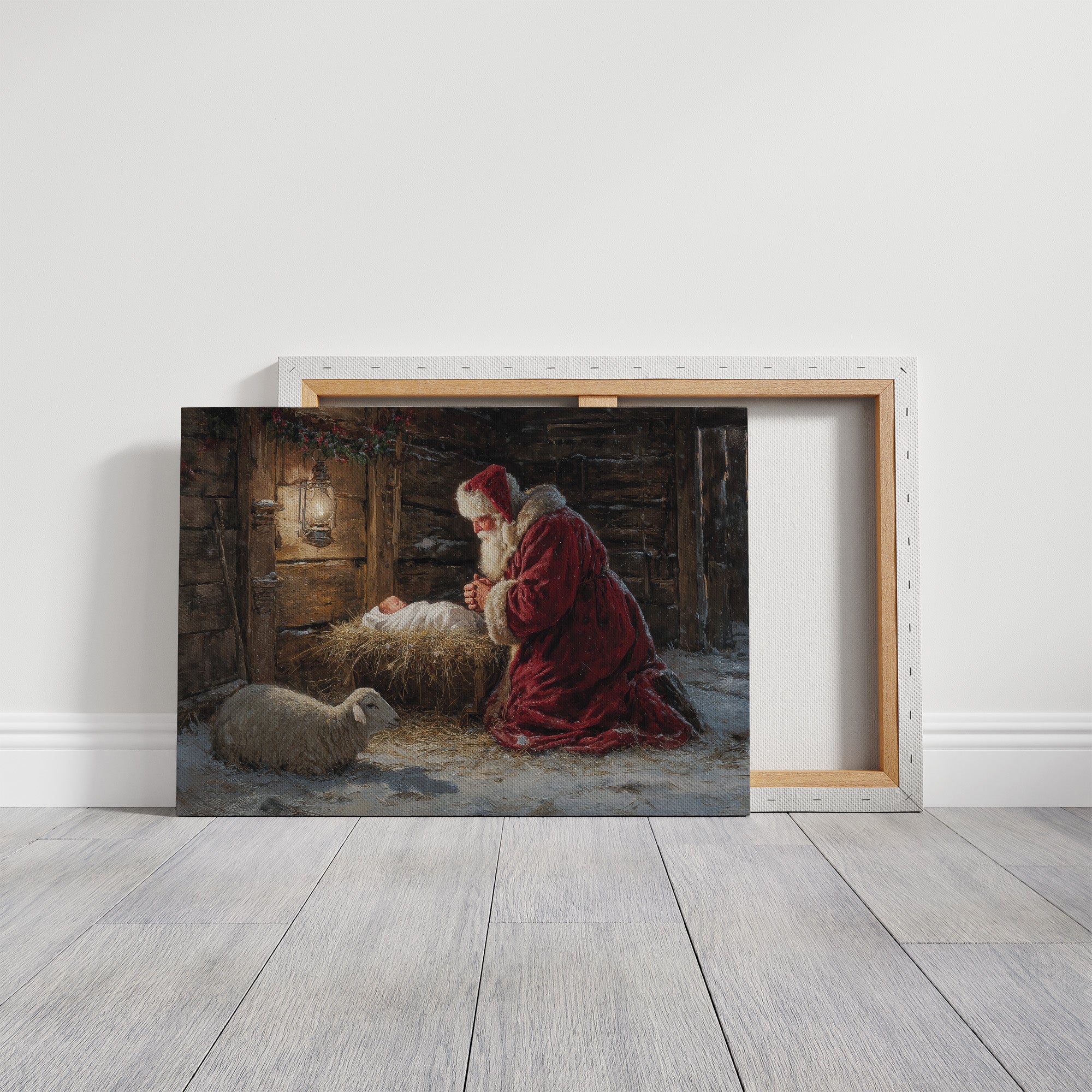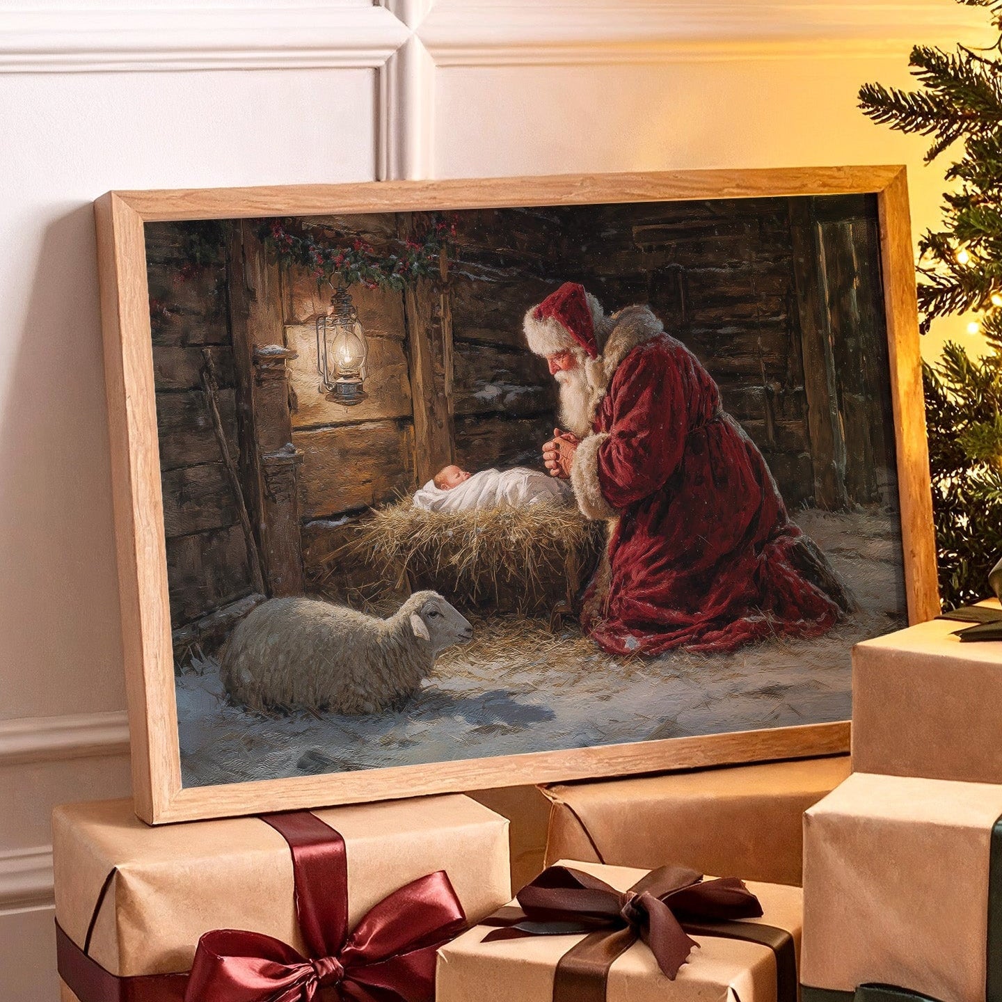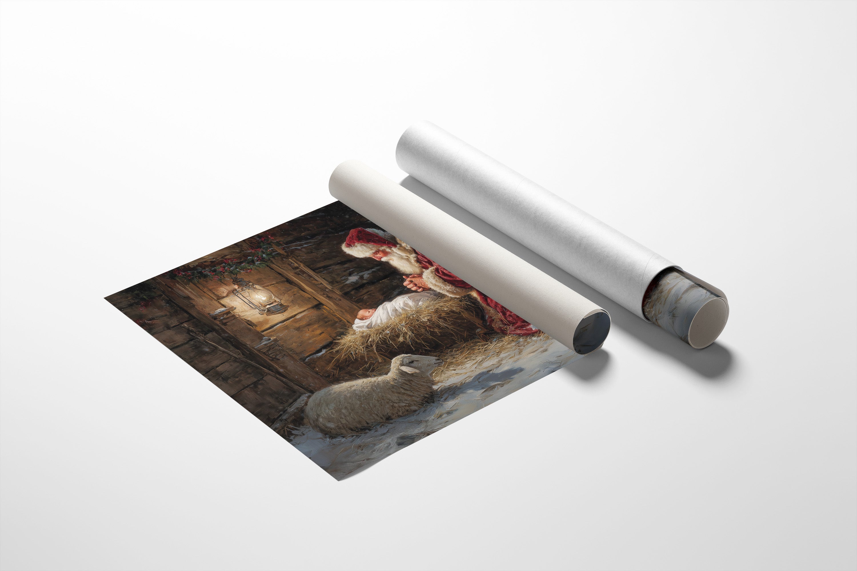 In the gentle glow of a lantern's flame, a moment of pure reverence unfolds in a humble stable. Rich crimson robes contrast against weathered wood walls, while soft hay and woolen fleece create a scene of rustic warmth. The interplay of shadow and golden light captures an intimate tableau of devotion, with each careful brushstroke revealing the tender atmosphere of this midnight encounter. This evocative piece brings a timeless spirit to any space, particularly suited for a cozy reading nook or as a seasonal centerpiece in a family gathering area.