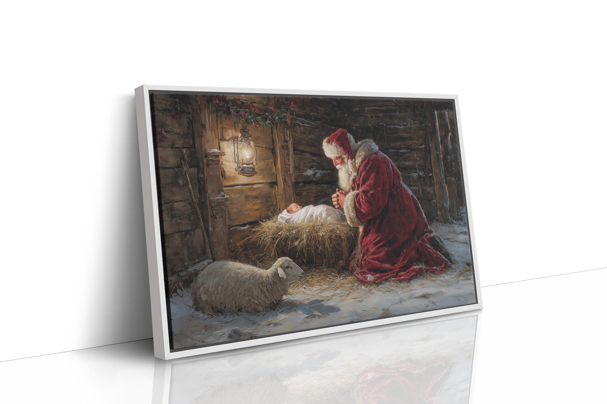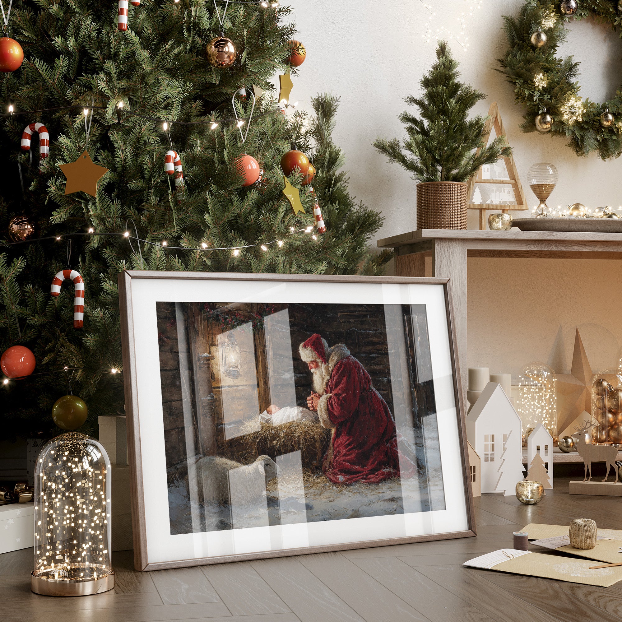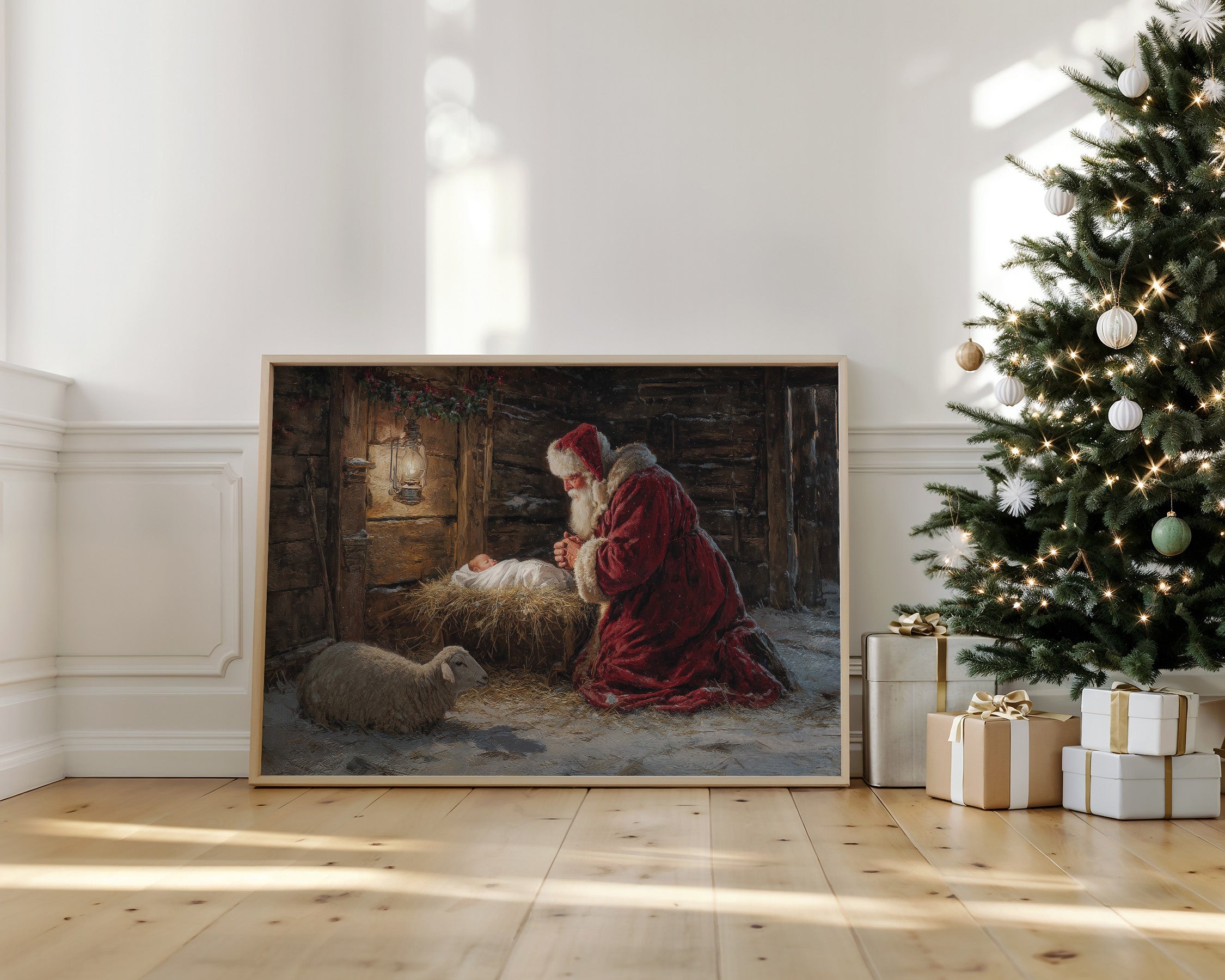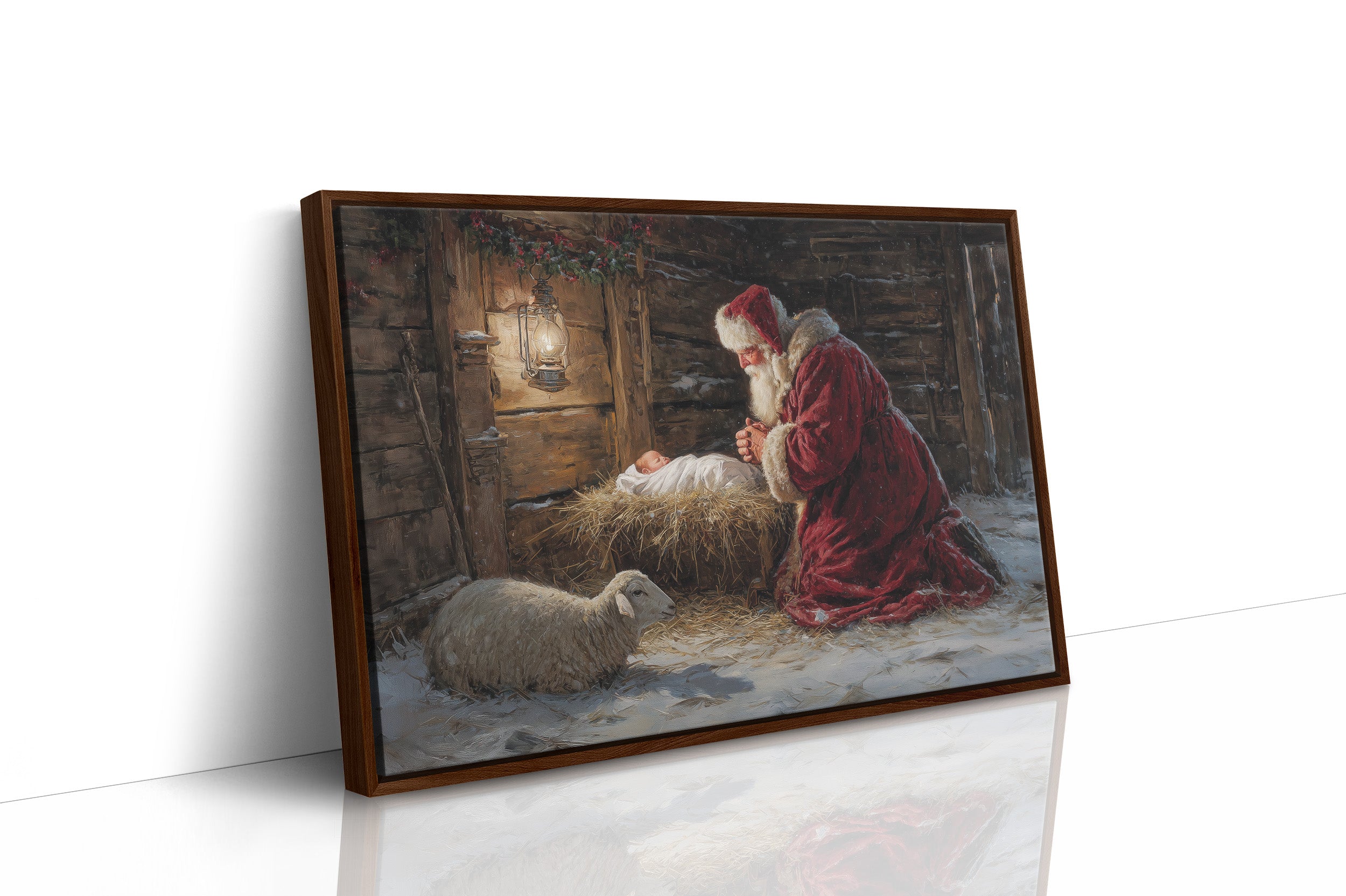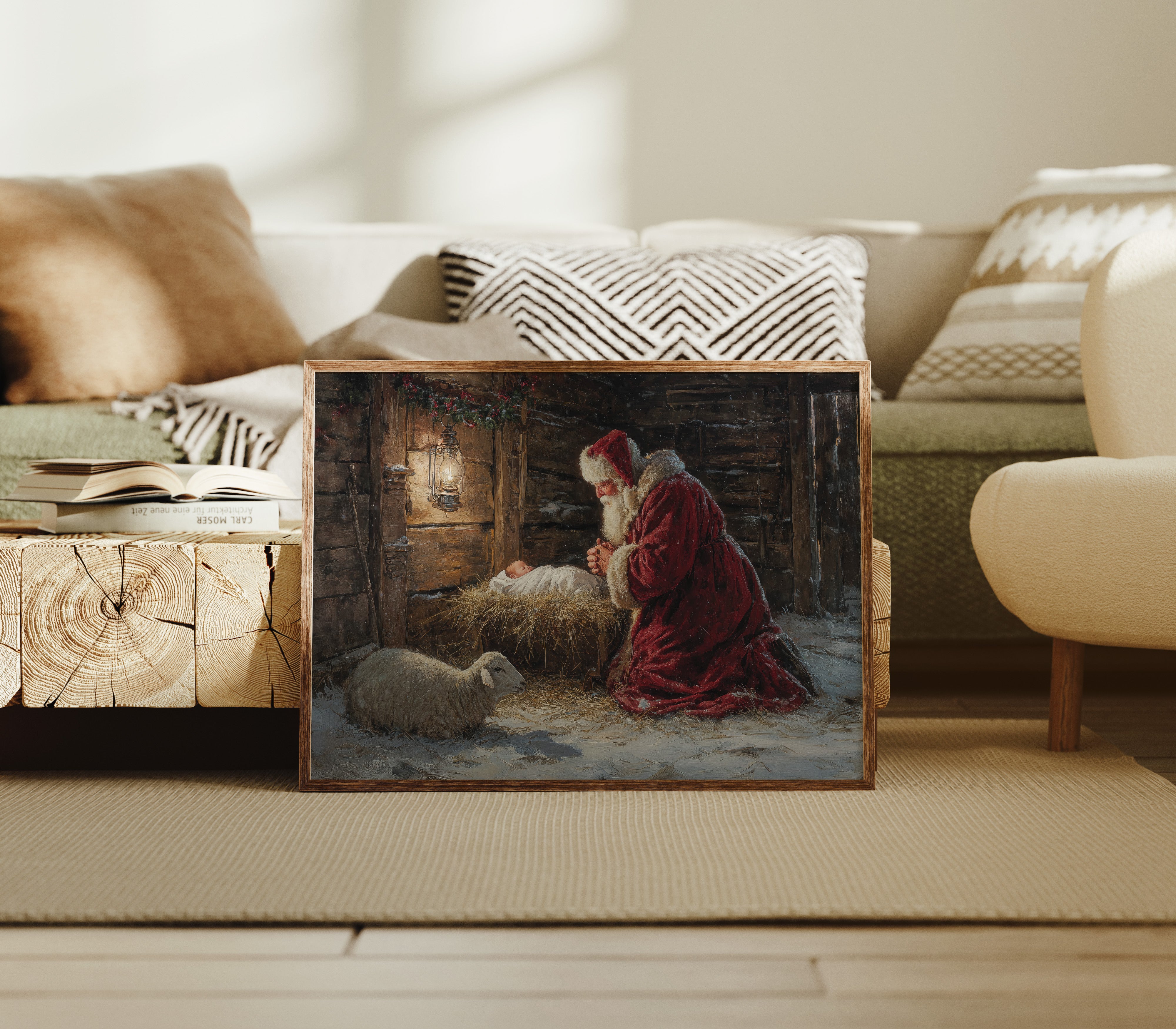 In the gentle glow of a lantern's flame, a moment of pure reverence unfolds in a humble stable. Rich crimson robes contrast against weathered wood walls, while soft hay and woolen fleece create a scene of rustic warmth. The interplay of shadow and golden light captures an intimate tableau of devotion, with each careful brushstroke revealing the tender atmosphere of this midnight encounter. This evocative piece brings a timeless spirit to any space, particularly suited for a cozy reading nook or as a seasonal centerpiece in a family gathering area.