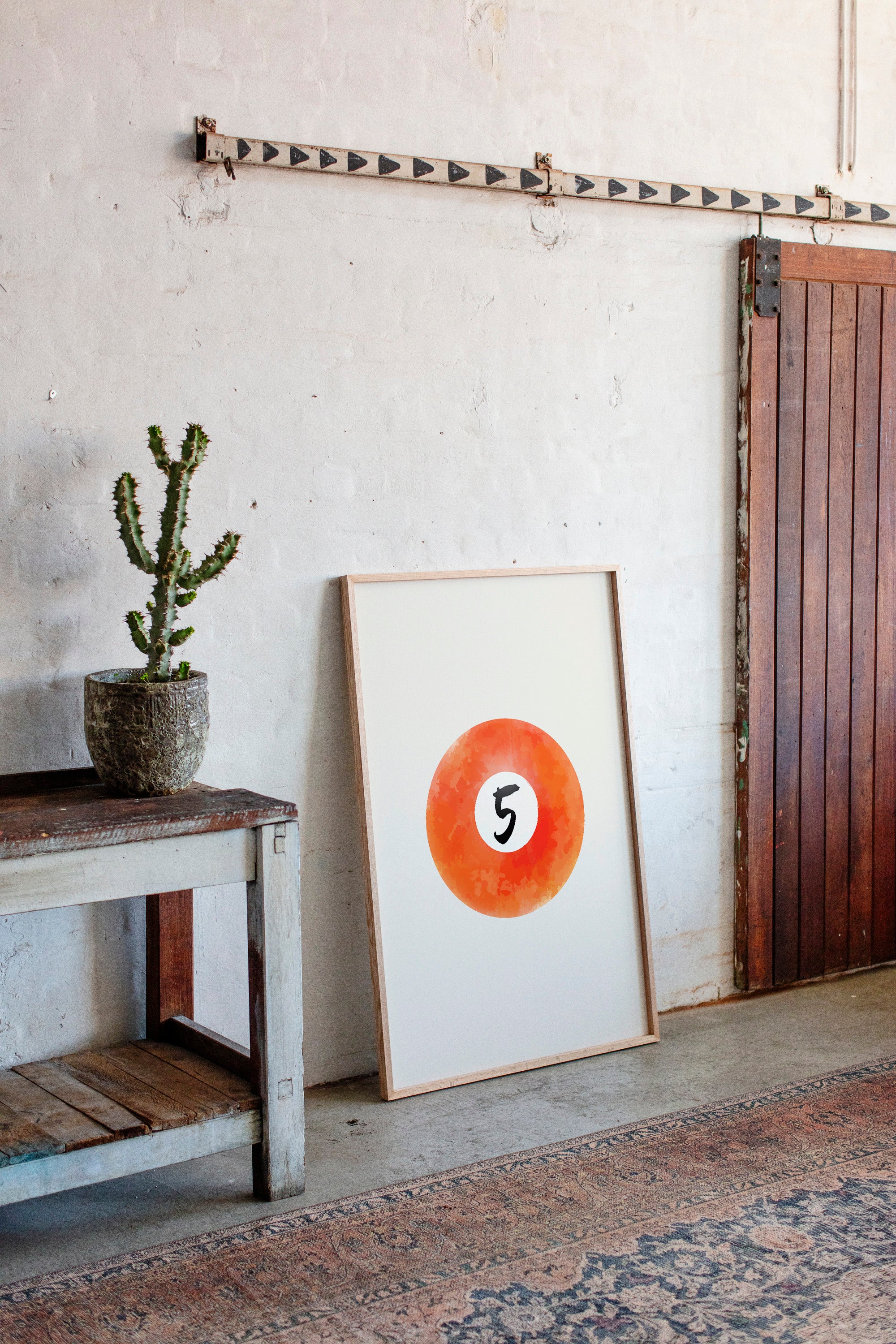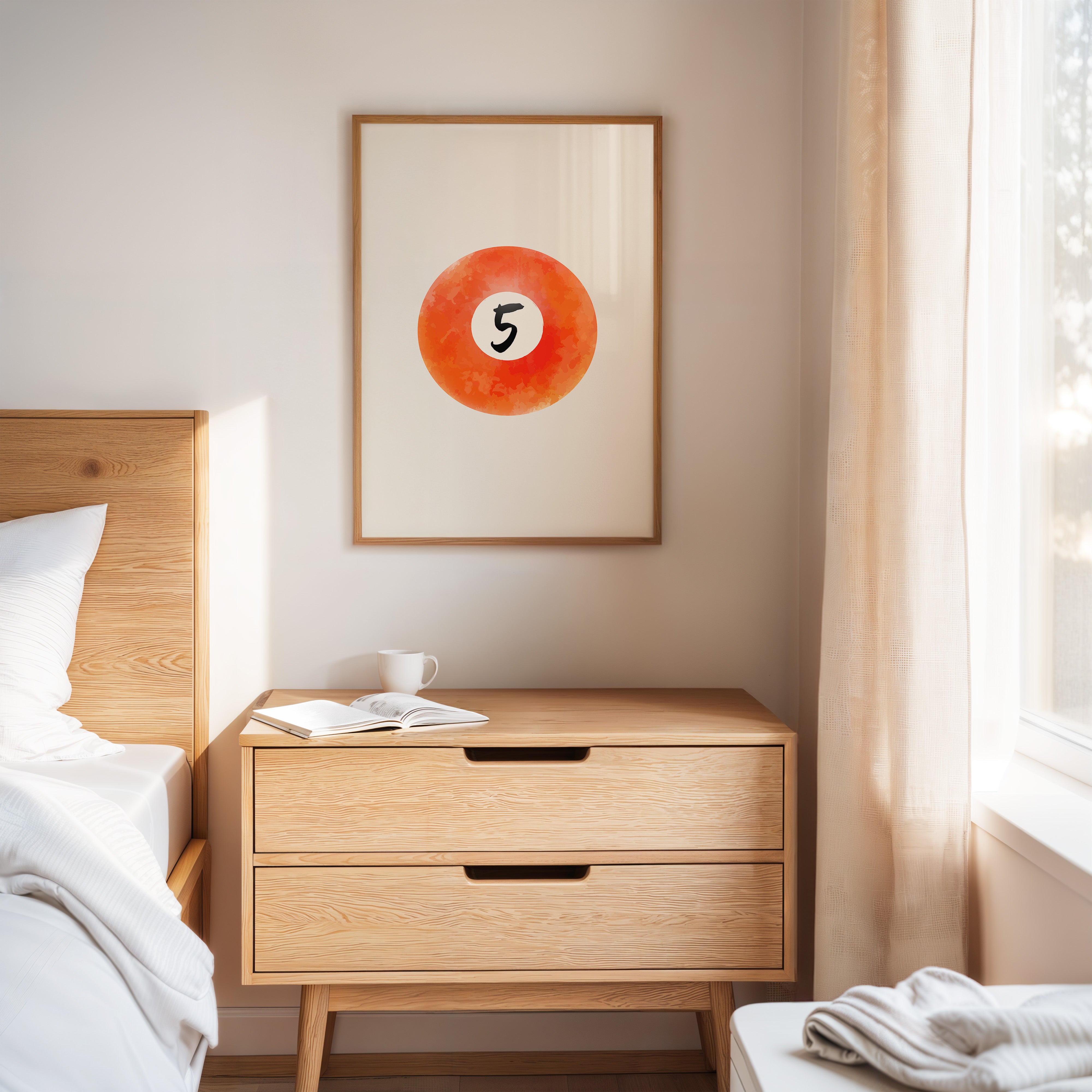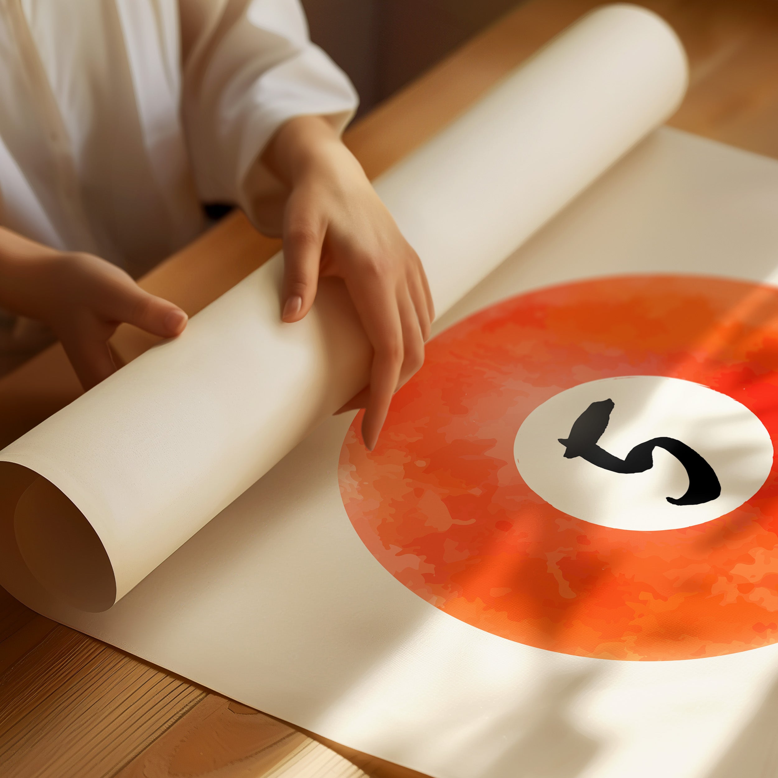A brilliant orange orb floats in pristine space, its watercolor edges bleeding into white like a sun dissolving into dawn. This piece from our Contemporary collection marries minimalist design with bold, energetic color. The number five stands strong at its center, a stark contrast in bold black brushstrokes against pure white, while surrounding it, vibrant tangerine hues swirl and blend in ethereal patterns. The interplay between precise geometry and organic watercolor creates a mesmerizing focal point that draws the eye inward. Perfect for modern spaces seeking a punch of energy, this piece commands attention in home offices or creative studios where inspiration is essential. Its clean lines and vivid palette bring warmth and sophistication to any contemporary interior.