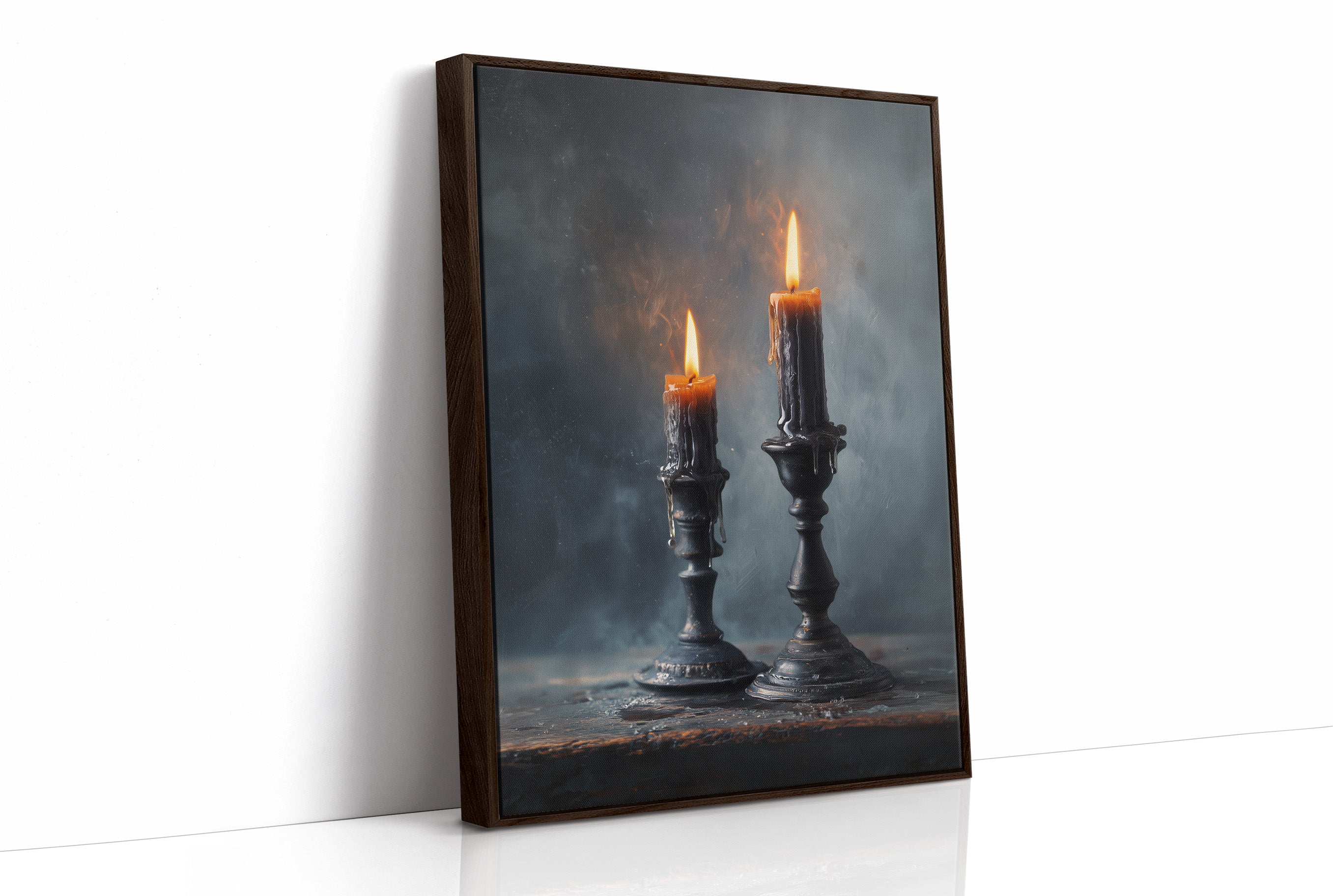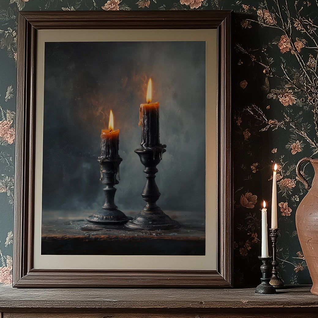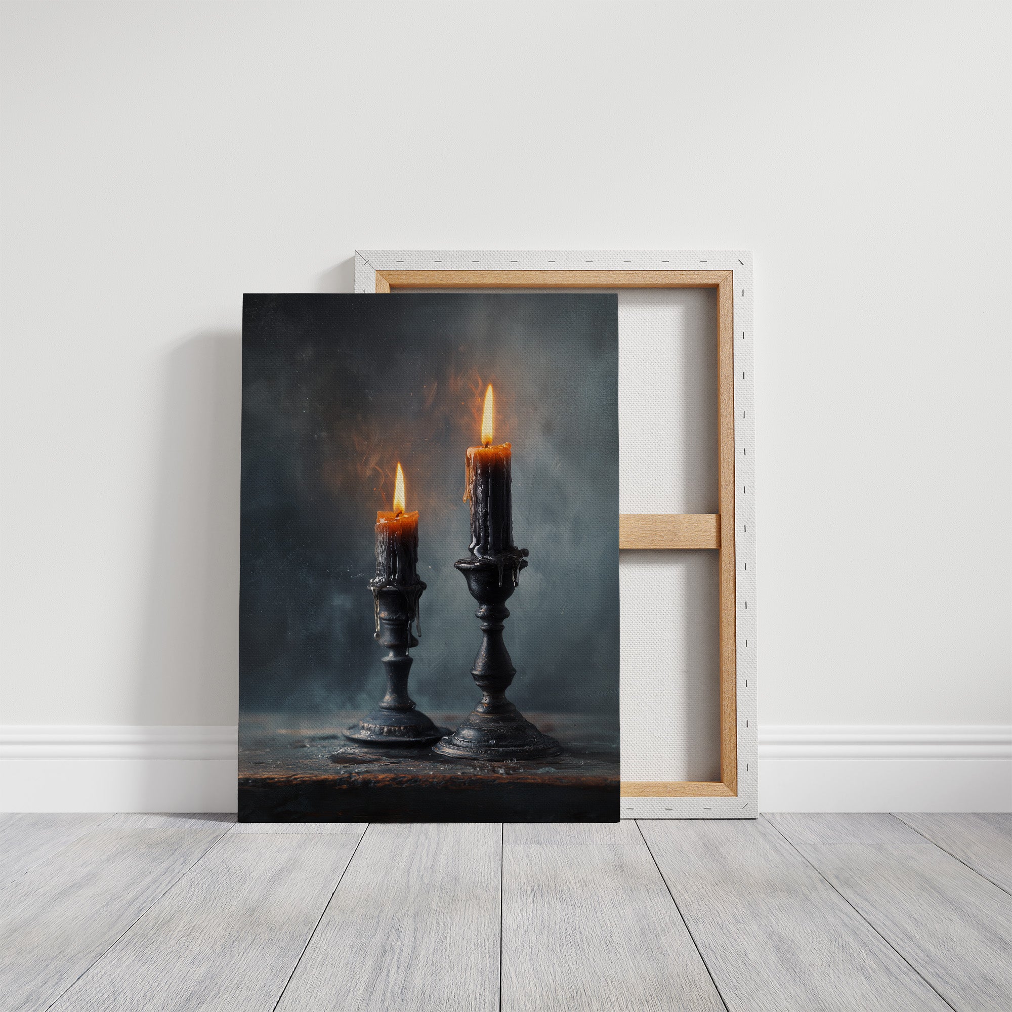 Two candles burn with quiet defiance against a smoky backdrop, their melted wax telling stories of time's slow passage. The metallic candlesticks reflect soft golden light, creating an intimate dialogue between shadow and flame in this moody still life. This atmospheric piece brings sophisticated drama to dining rooms, reading nooks, or any space where contemplative elegance is desired.