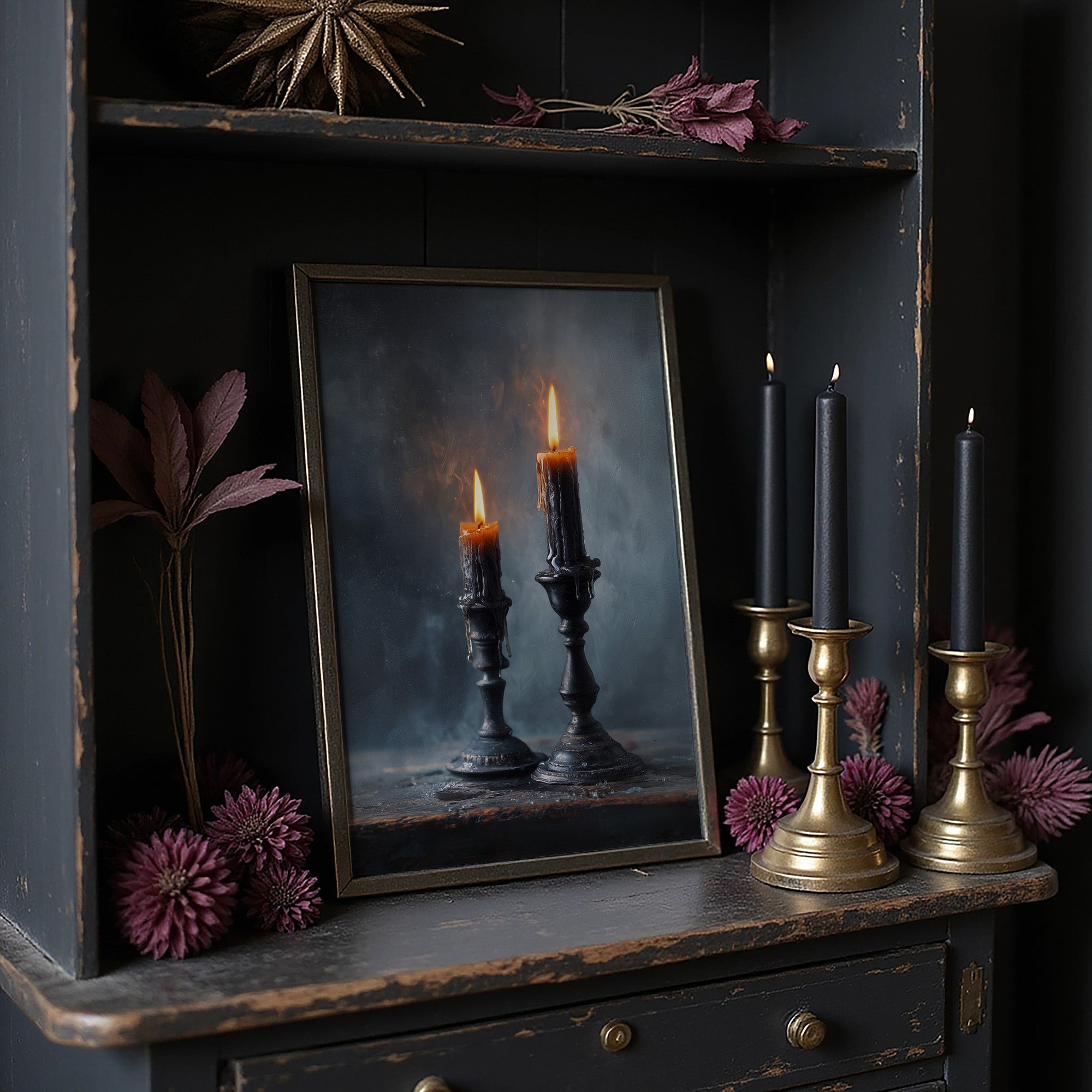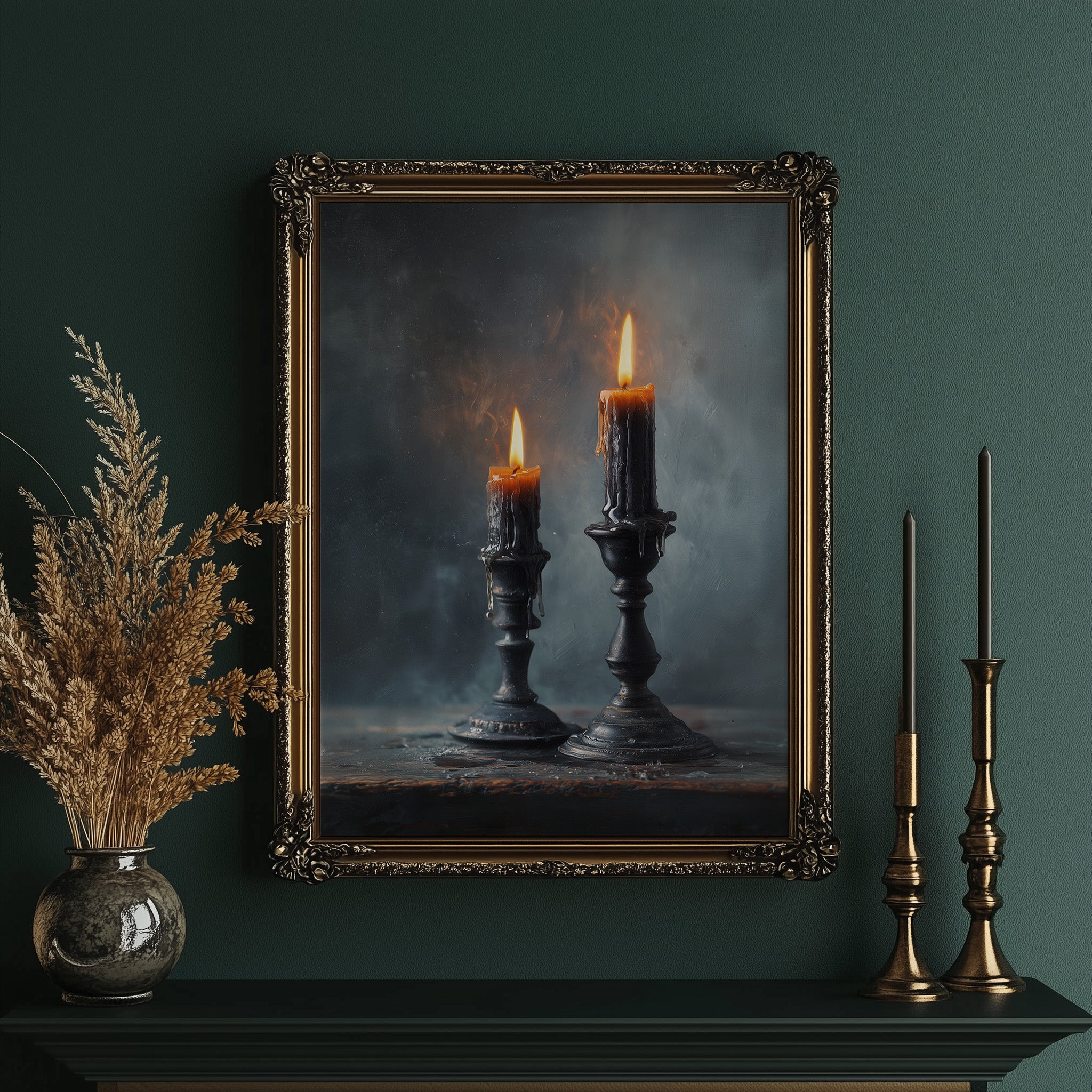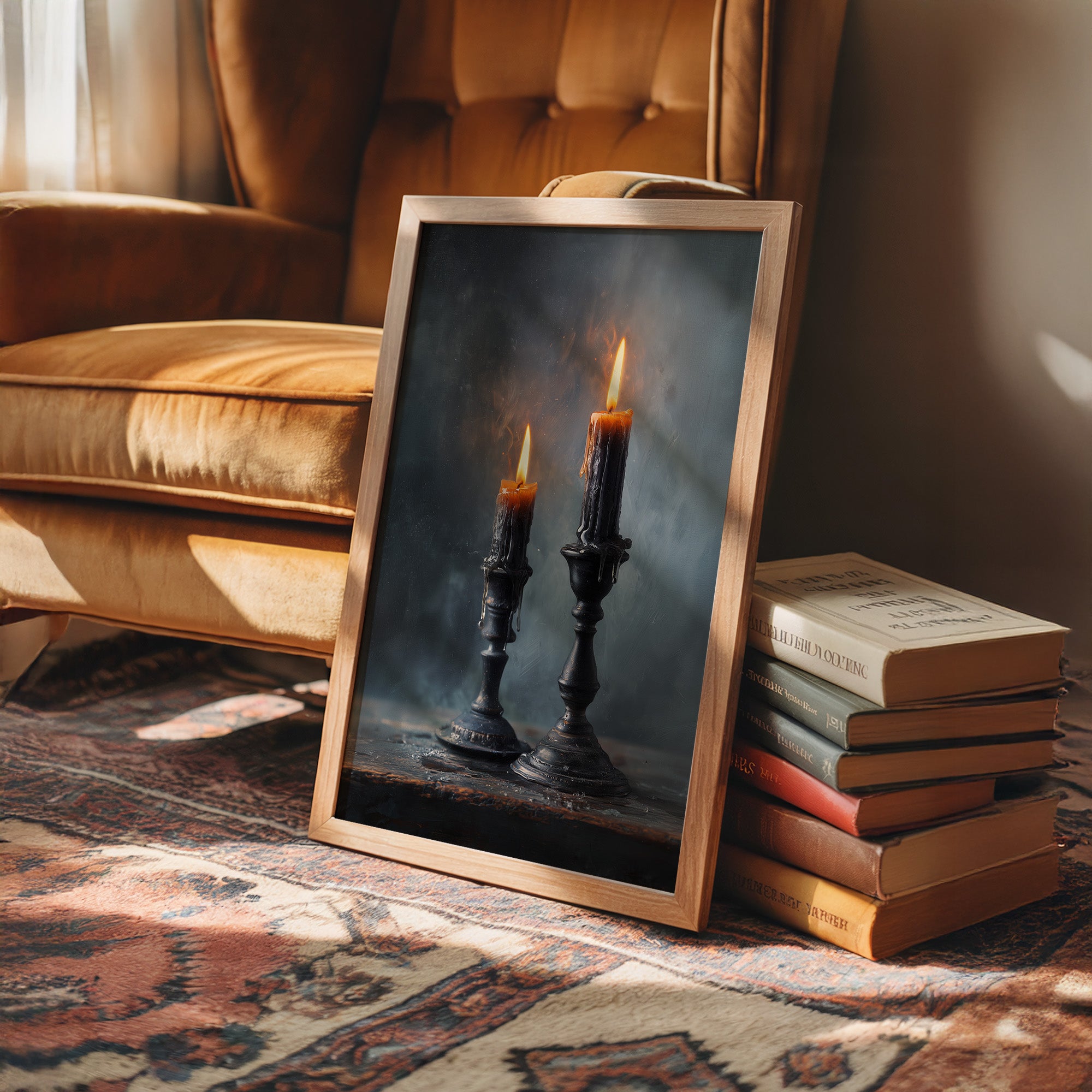 Two candles burn with quiet defiance against a smoky backdrop, their melted wax telling stories of time's slow passage. The metallic candlesticks reflect soft golden light, creating an intimate dialogue between shadow and flame in this moody still life. This atmospheric piece brings sophisticated drama to dining rooms, reading nooks, or any space where contemplative elegance is desired.