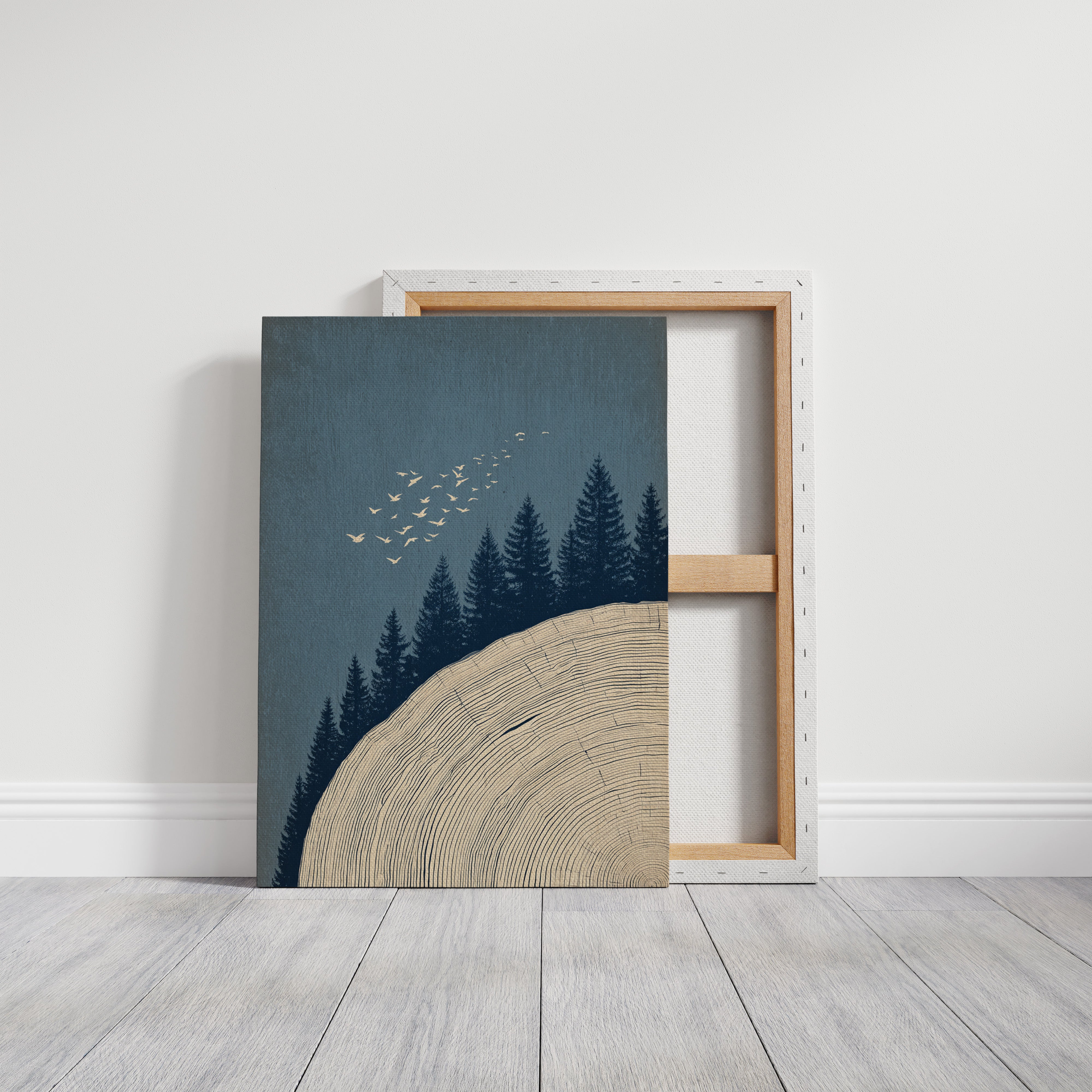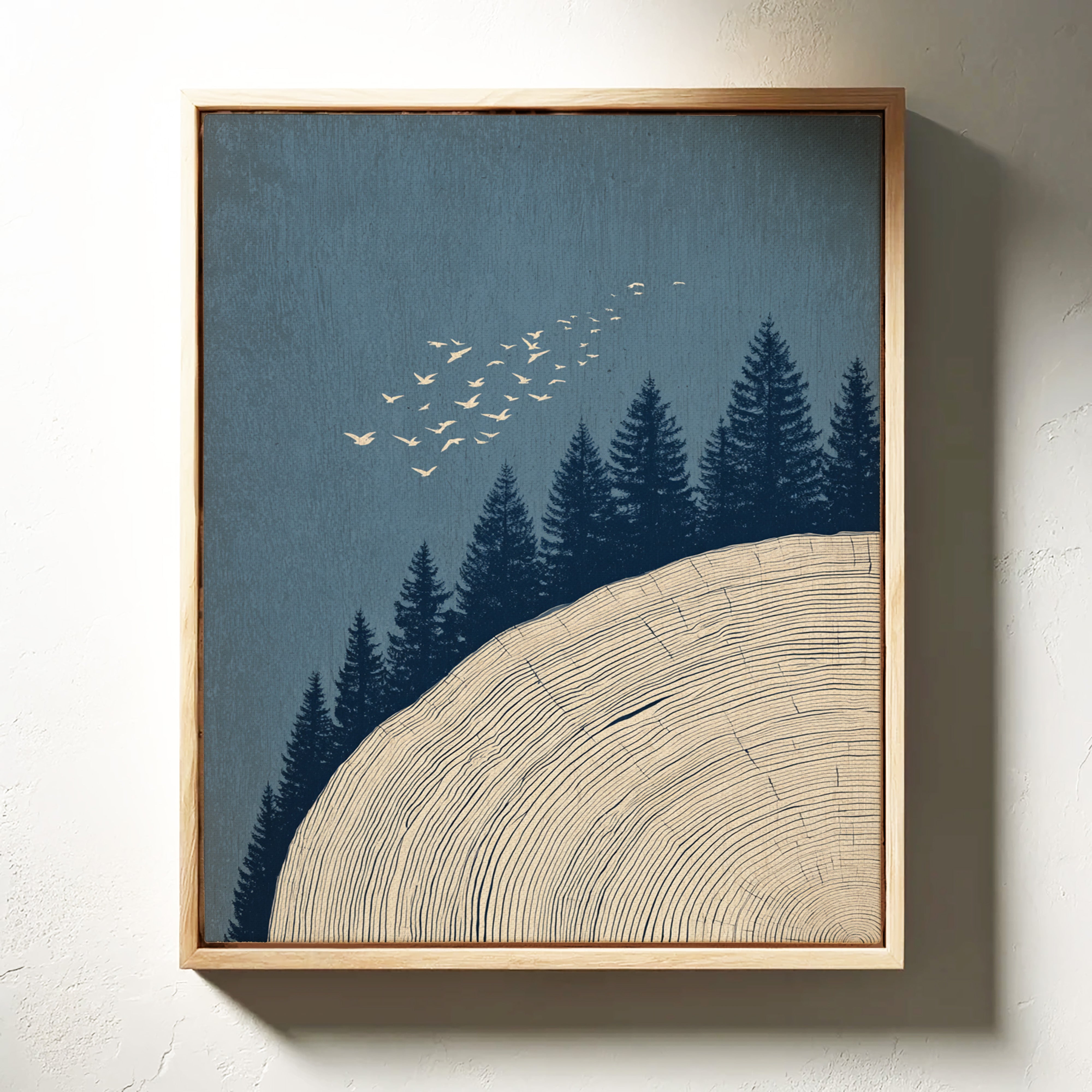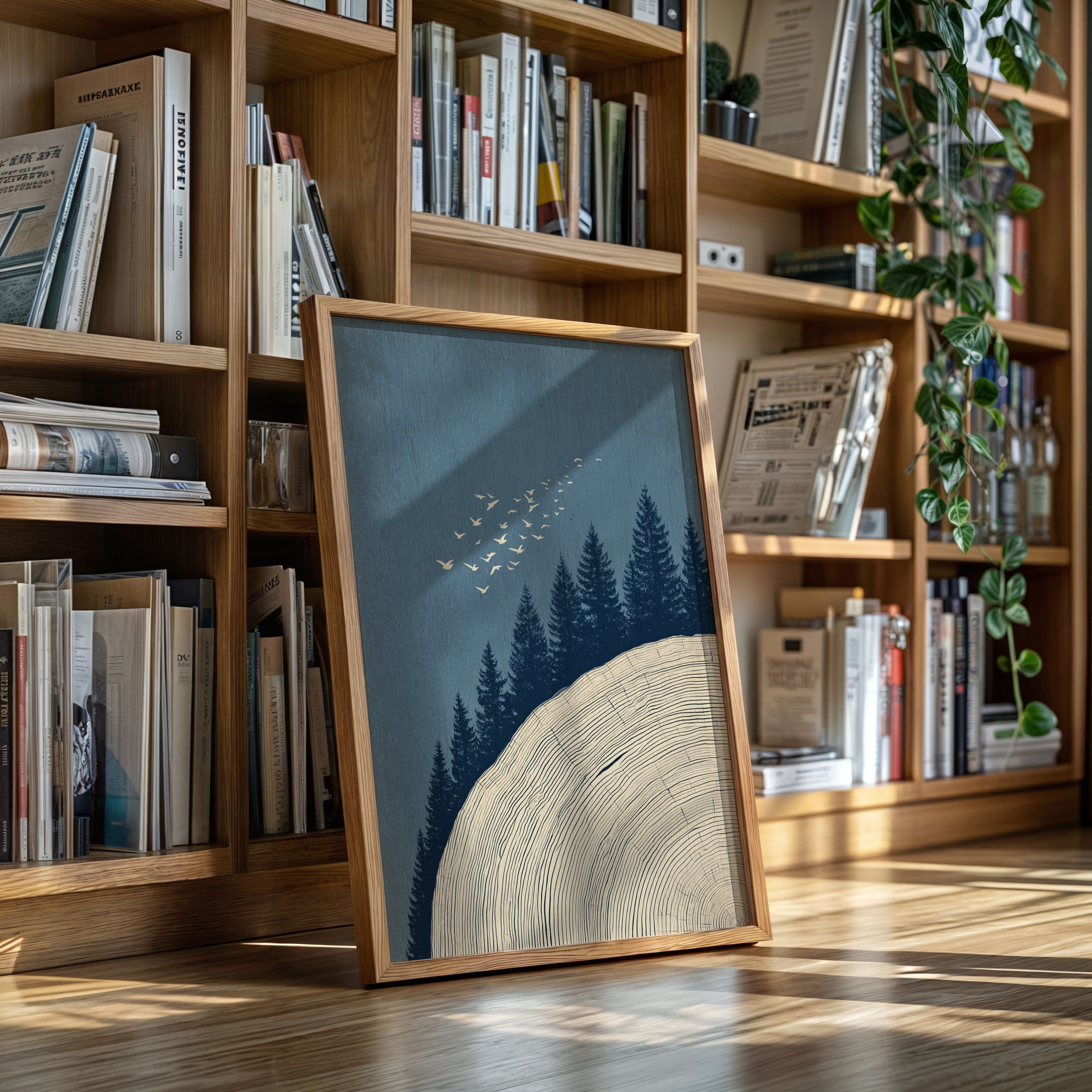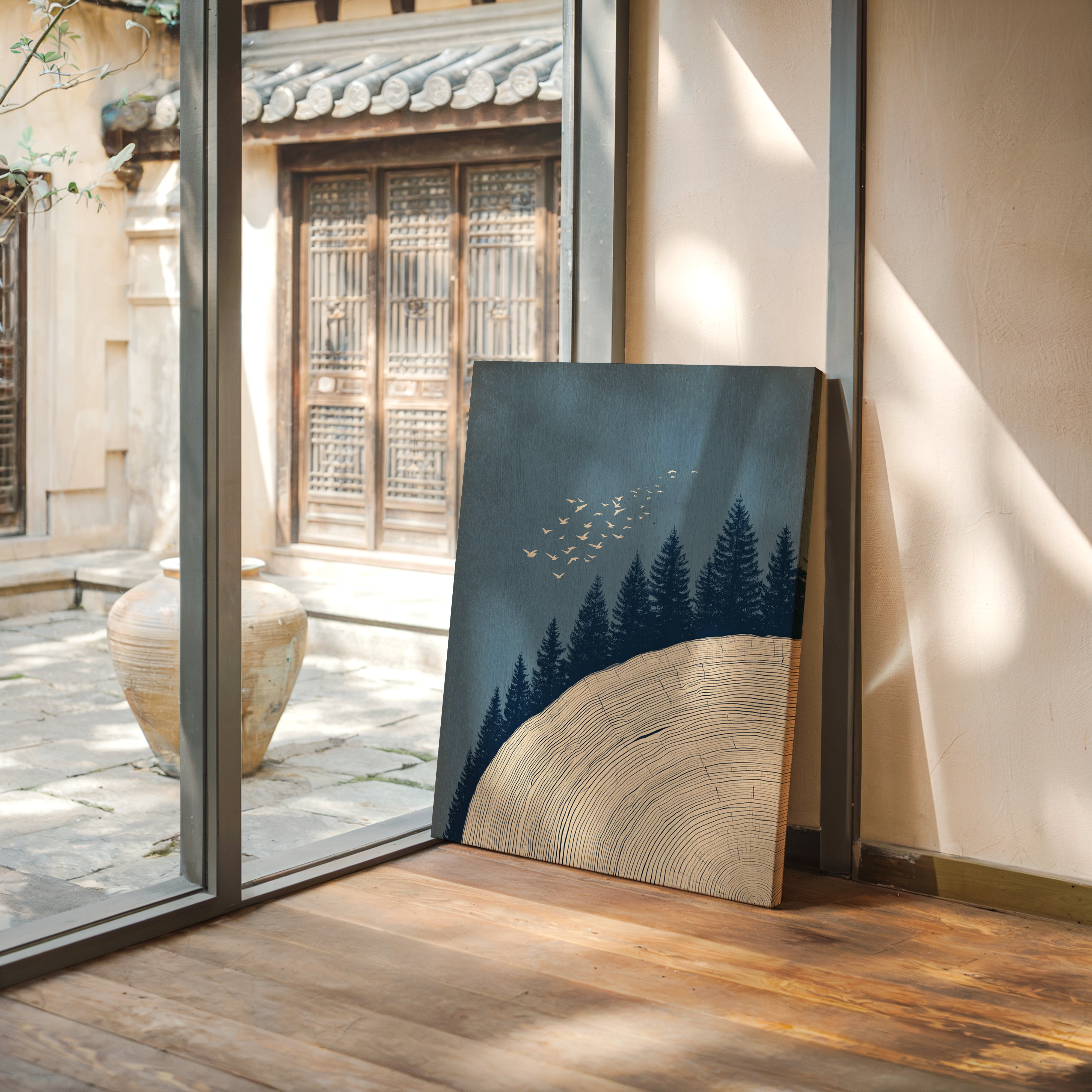 A tranquil moment unfolds as birds cascade into the sky, leaving behind the tales etched in the rings of a timeworn tree. This piece captures the serene essence of natures cycles, harmonizing rustic beauty with a sense of freedom. The deep blues contrast beautifully with the warm, golden hues of the tree trunk, inviting the viewer to reflect on the passage of time and the stories held within. Perfect for a cozy reading nook or a serene bedroom, this artwork inspires introspection and peace.