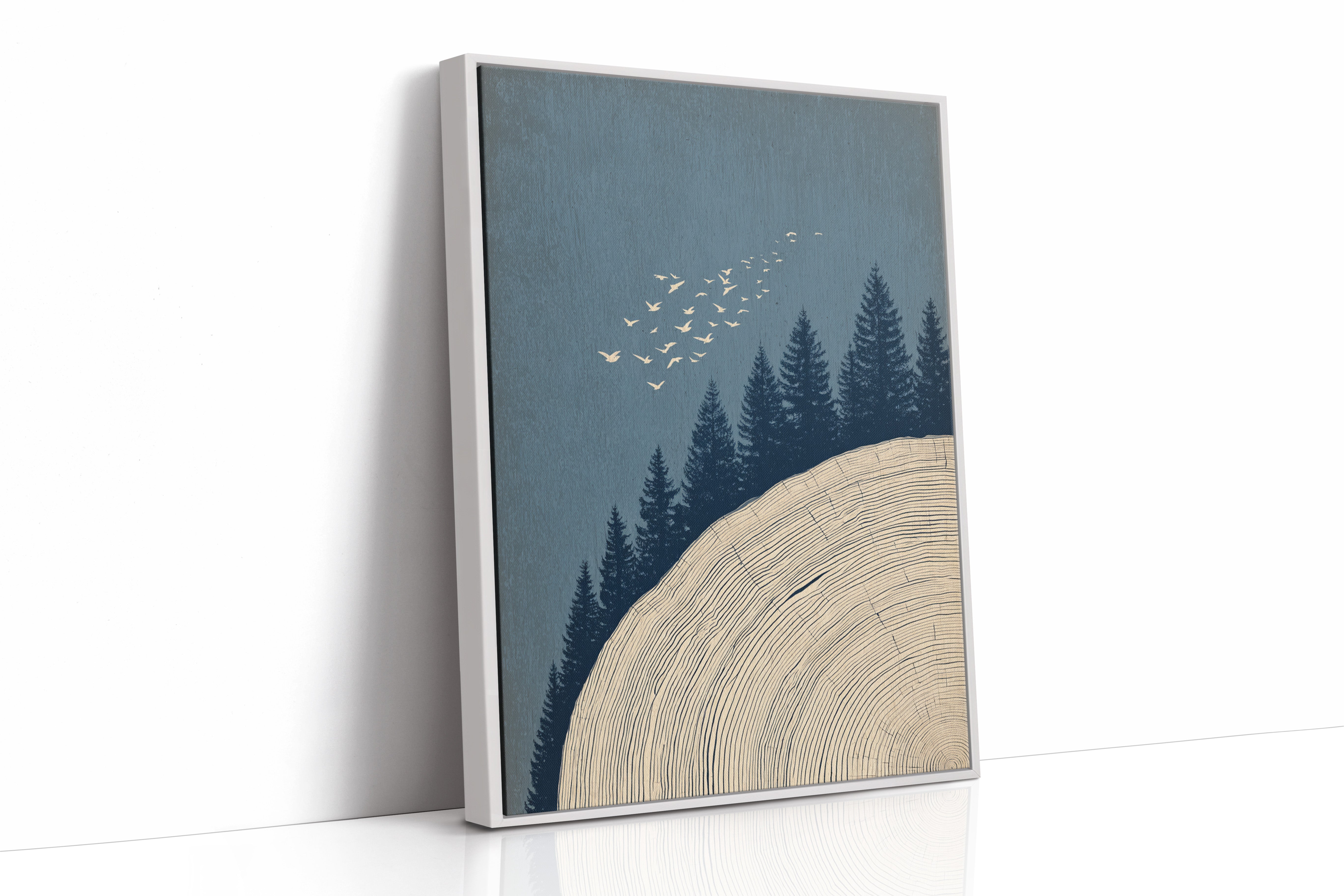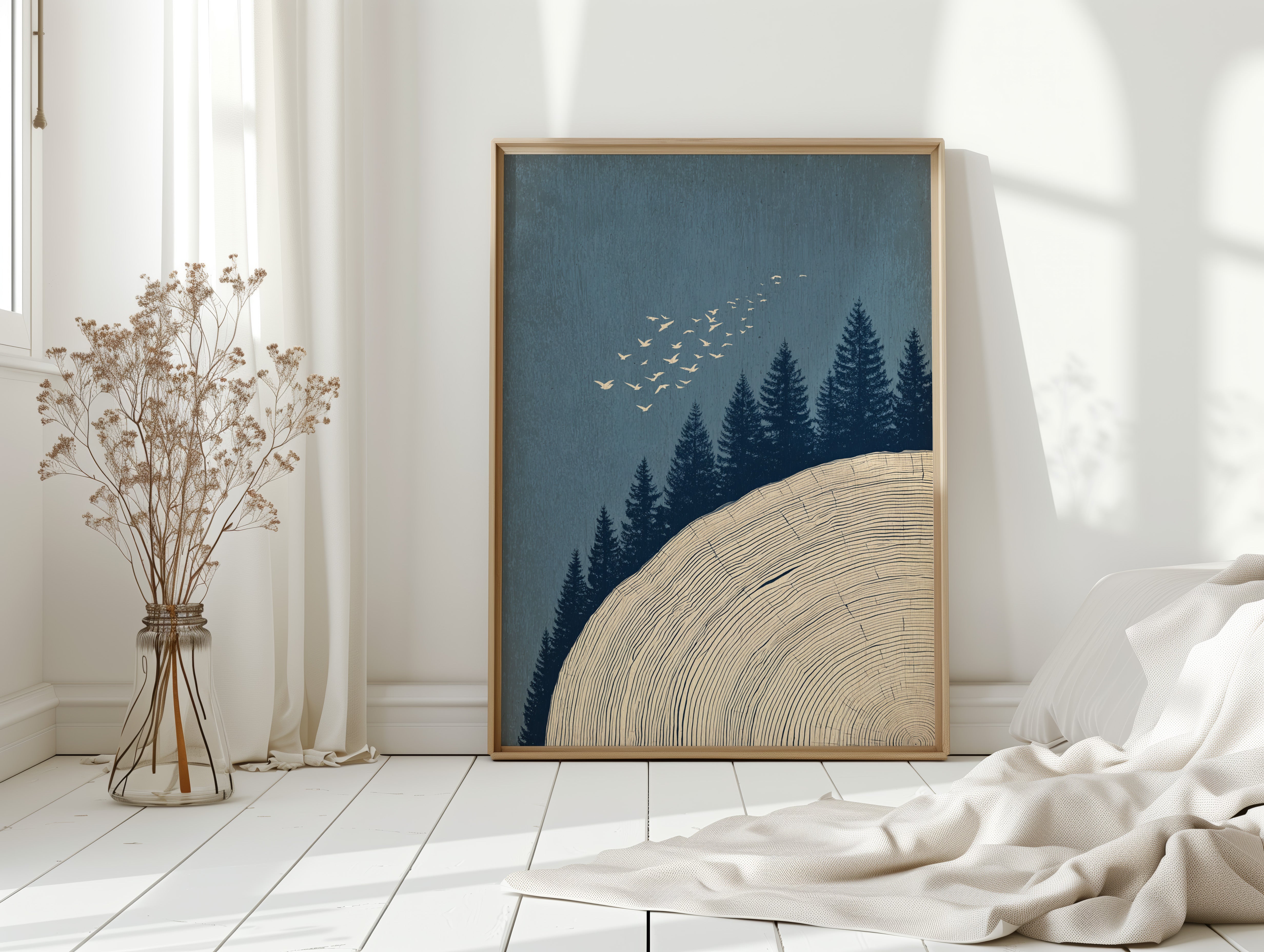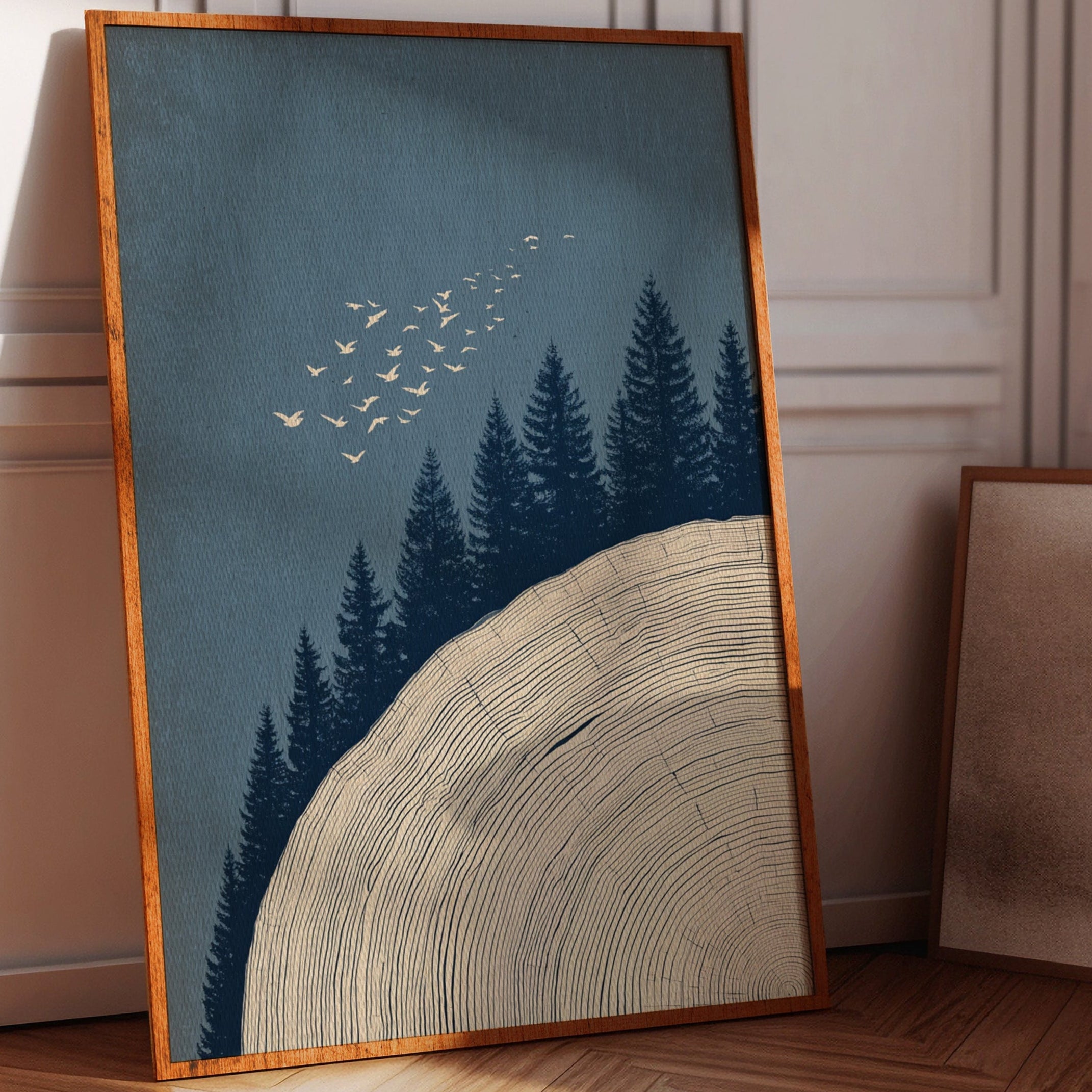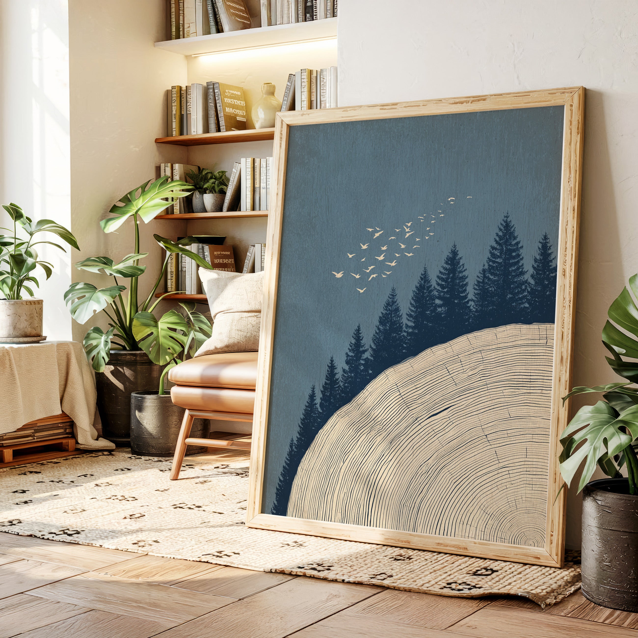 A tranquil moment unfolds as birds cascade into the sky, leaving behind the tales etched in the rings of a timeworn tree. This piece captures the serene essence of natures cycles, harmonizing rustic beauty with a sense of freedom. The deep blues contrast beautifully with the warm, golden hues of the tree trunk, inviting the viewer to reflect on the passage of time and the stories held within. Perfect for a cozy reading nook or a serene bedroom, this artwork inspires introspection and peace.