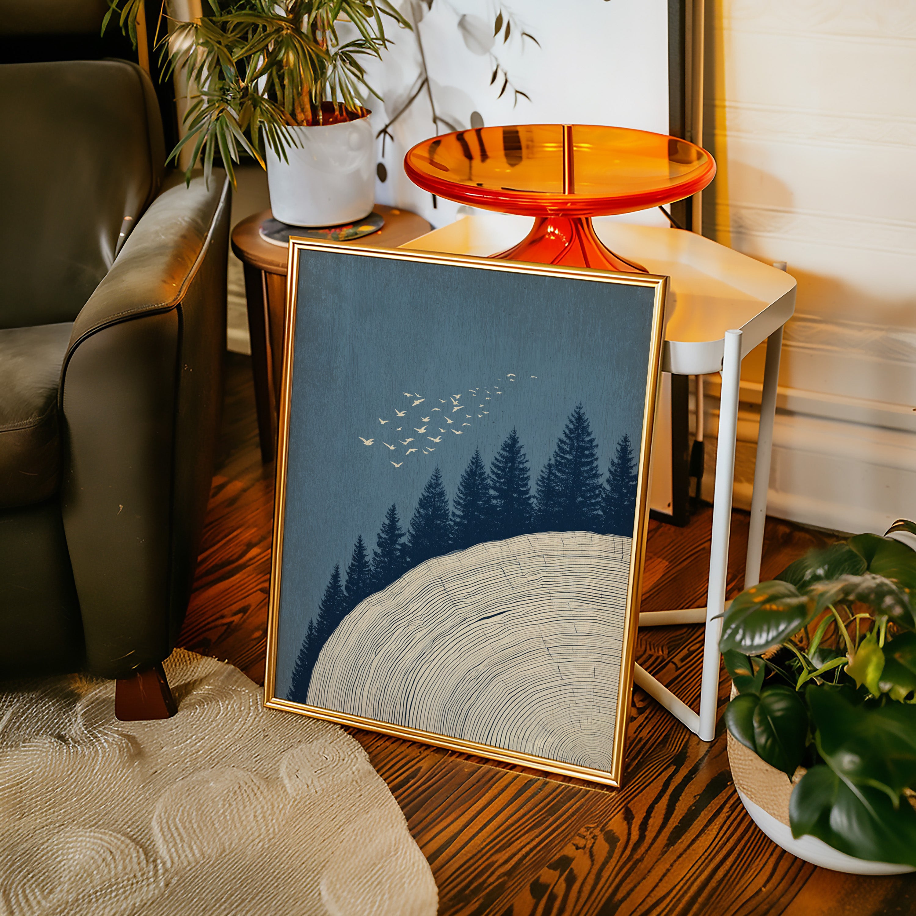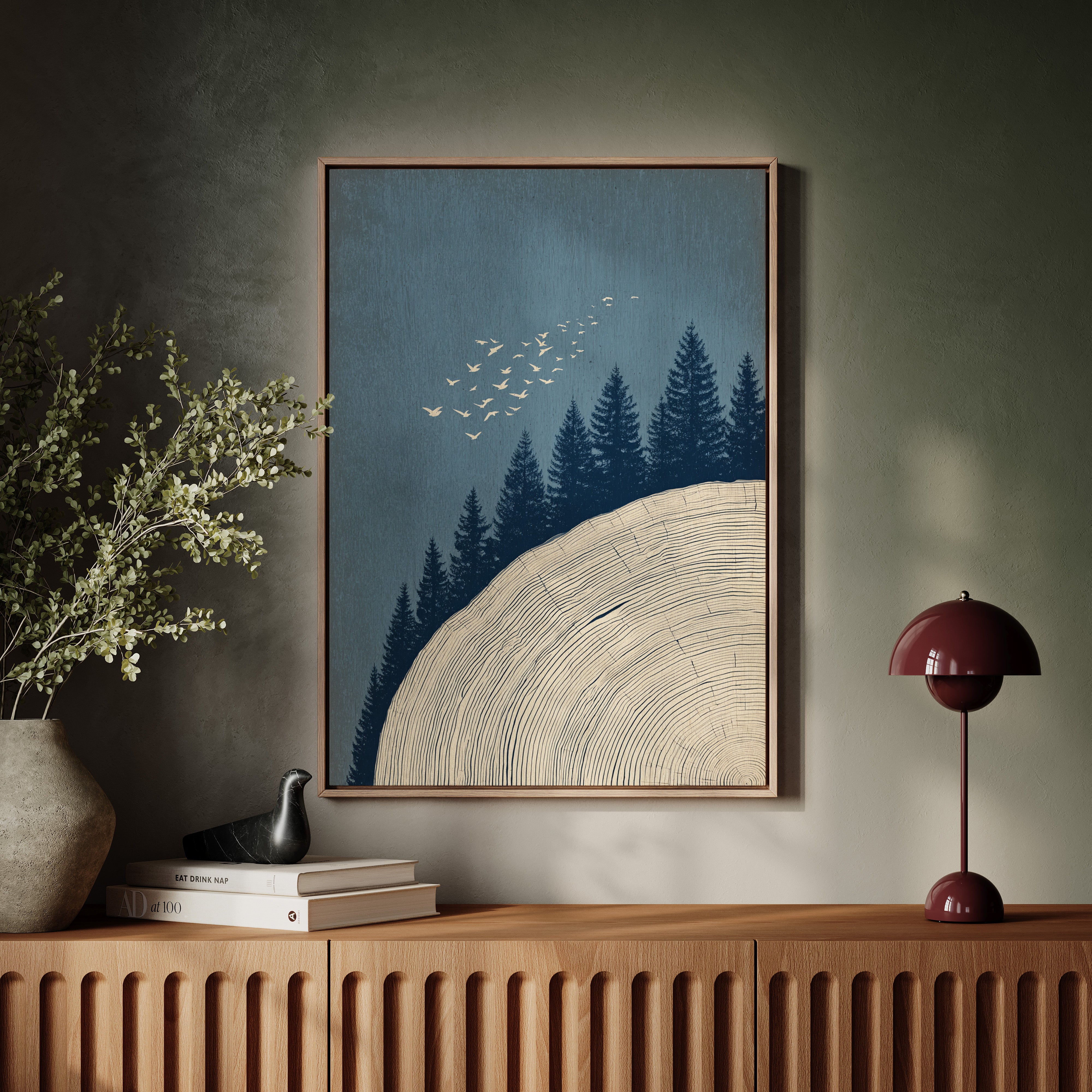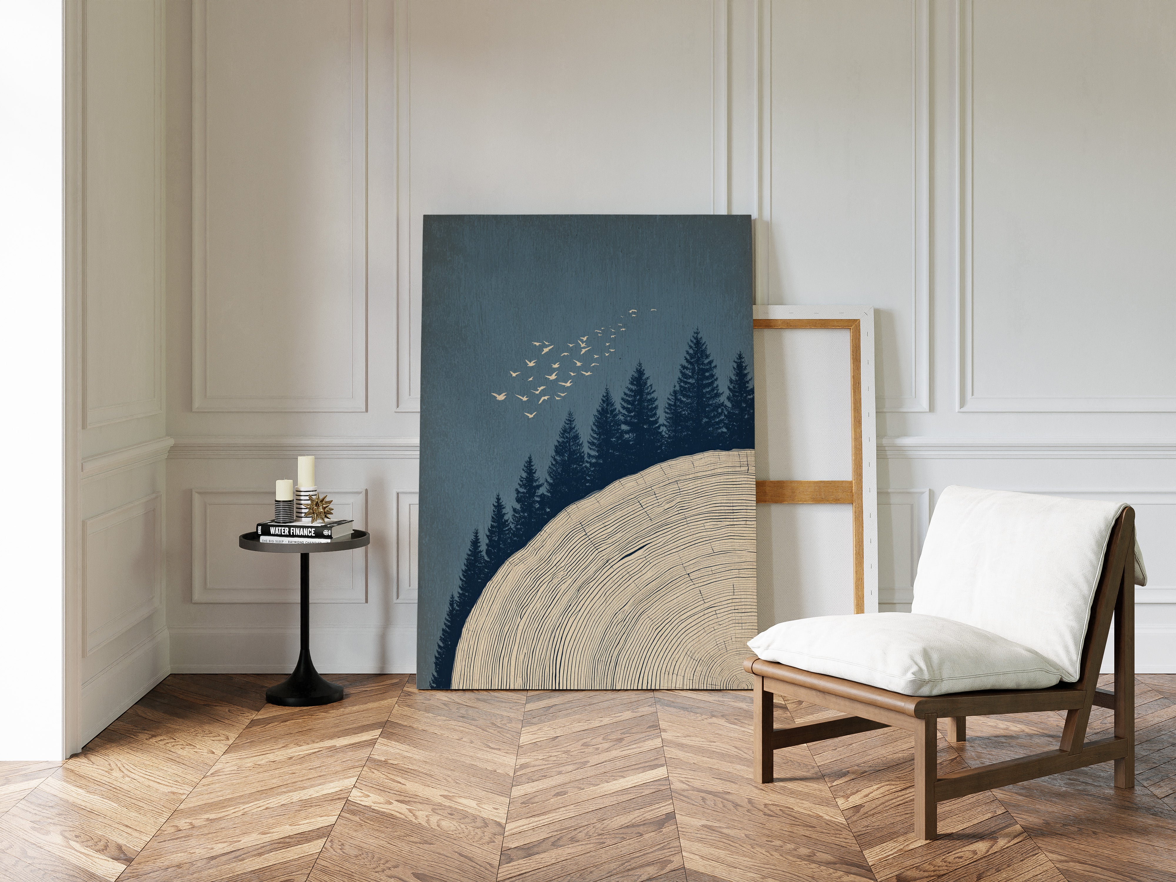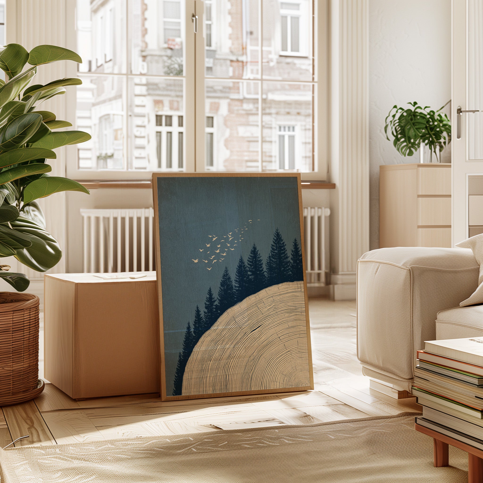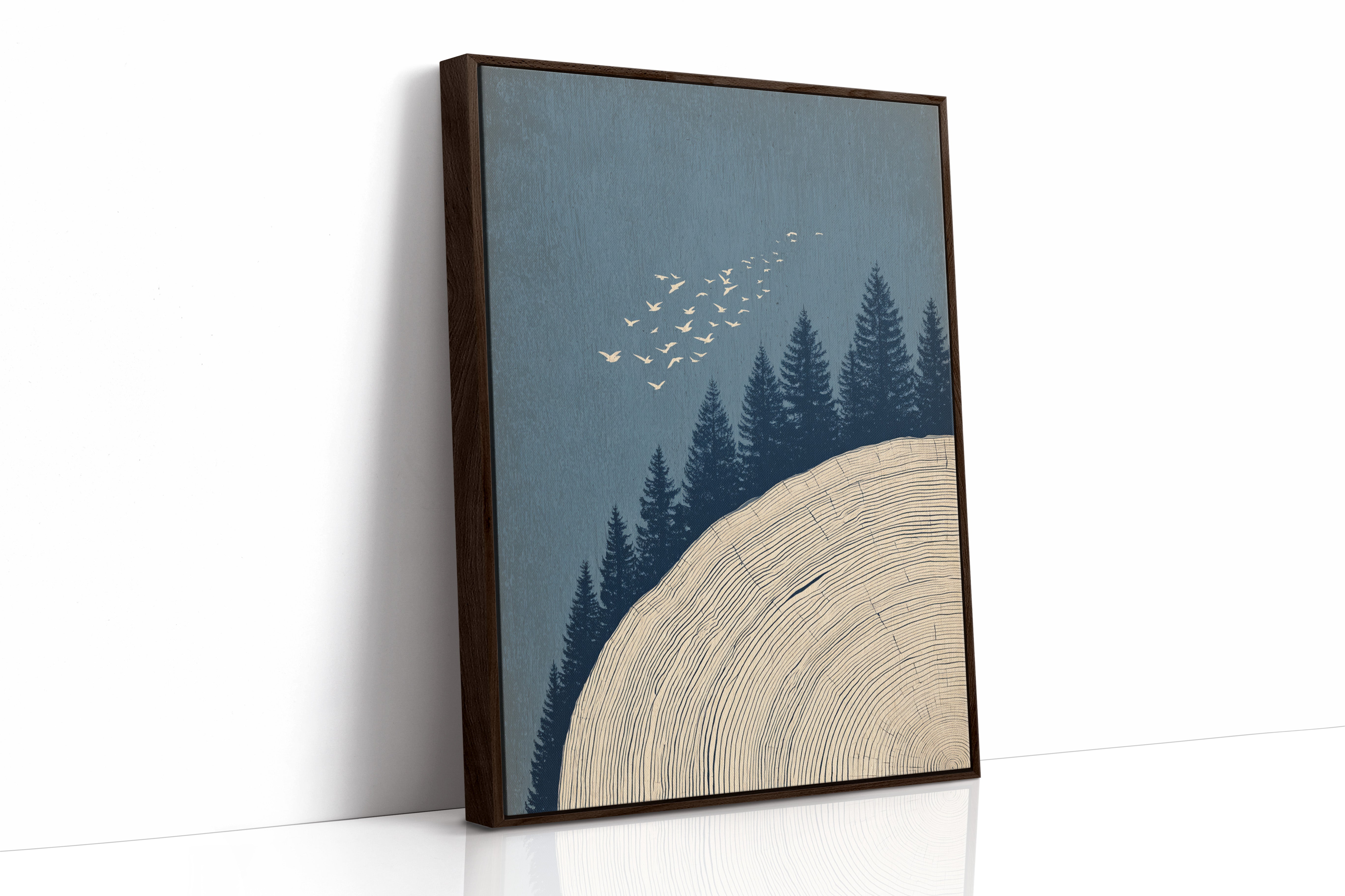 A tranquil moment unfolds as birds cascade into the sky, leaving behind the tales etched in the rings of a timeworn tree. This piece captures the serene essence of natures cycles, harmonizing rustic beauty with a sense of freedom. The deep blues contrast beautifully with the warm, golden hues of the tree trunk, inviting the viewer to reflect on the passage of time and the stories held within. Perfect for a cozy reading nook or a serene bedroom, this artwork inspires introspection and peace.