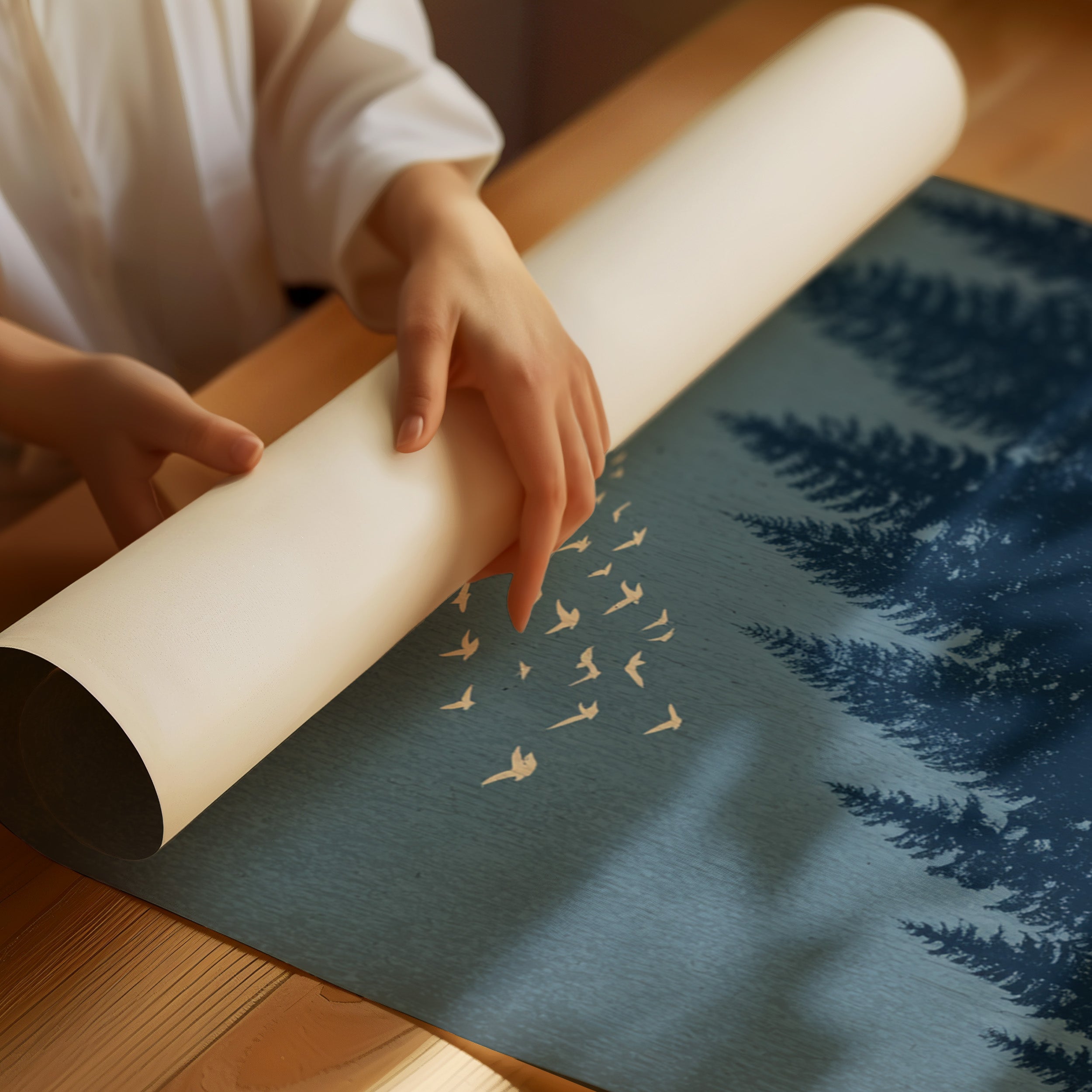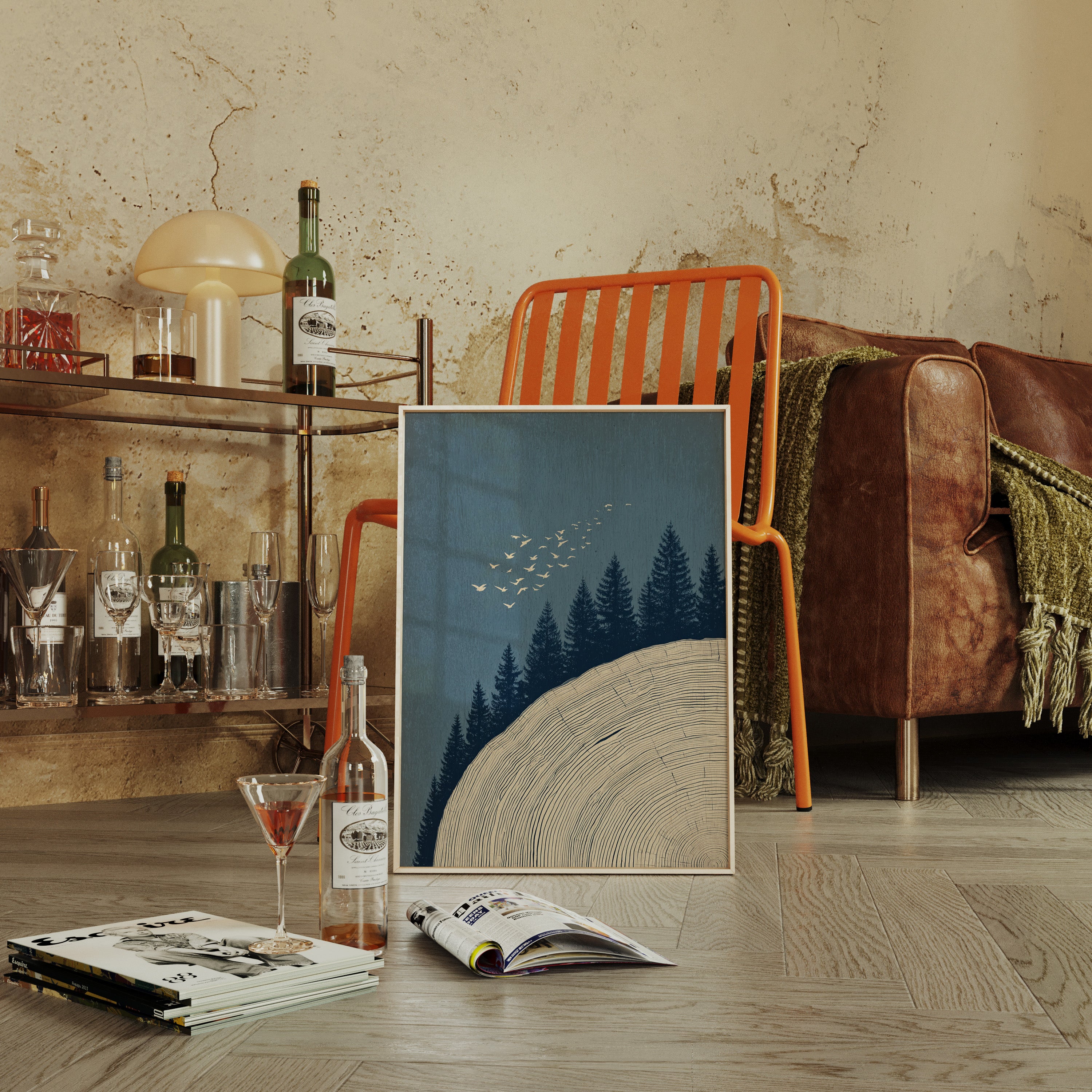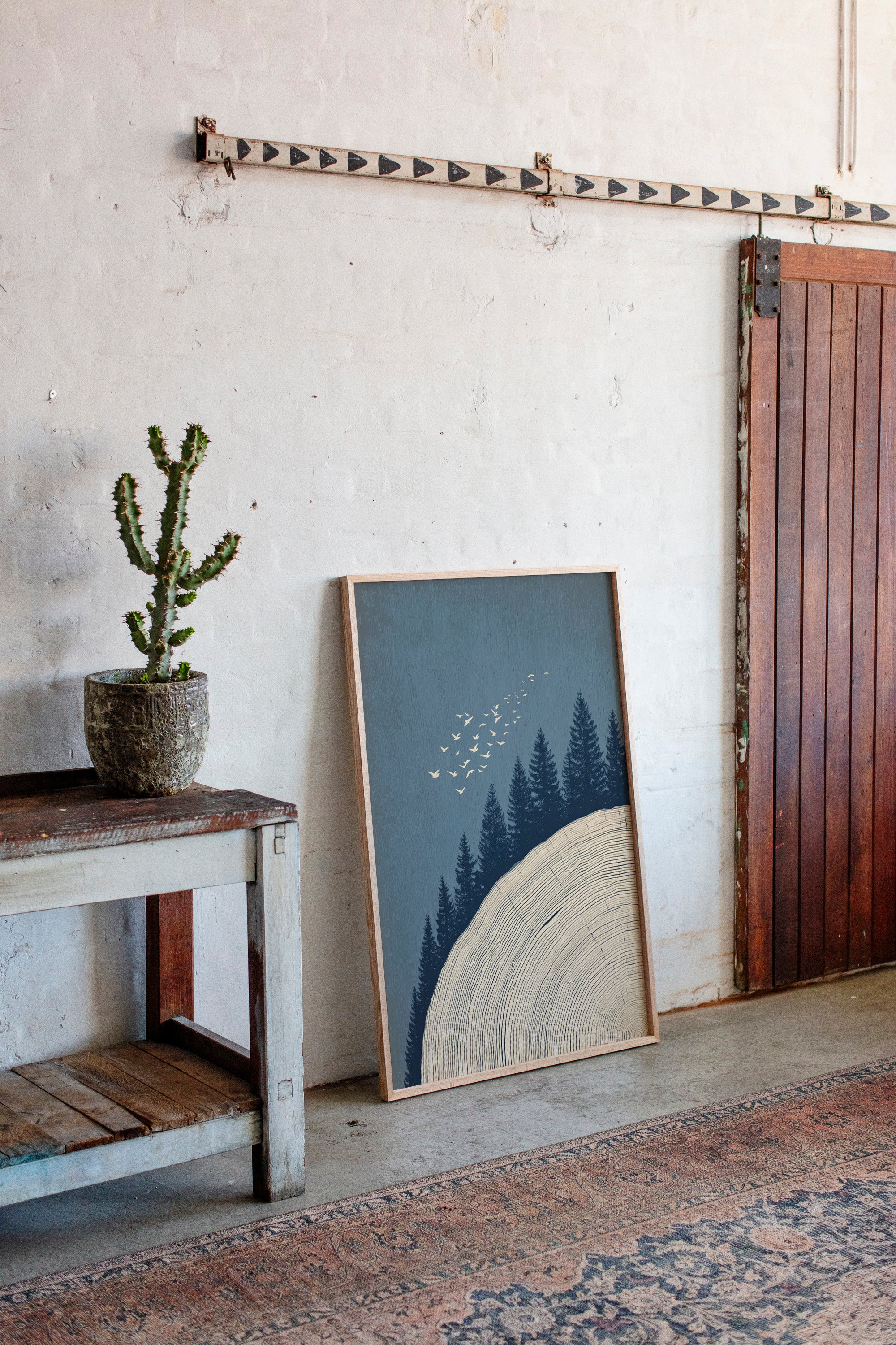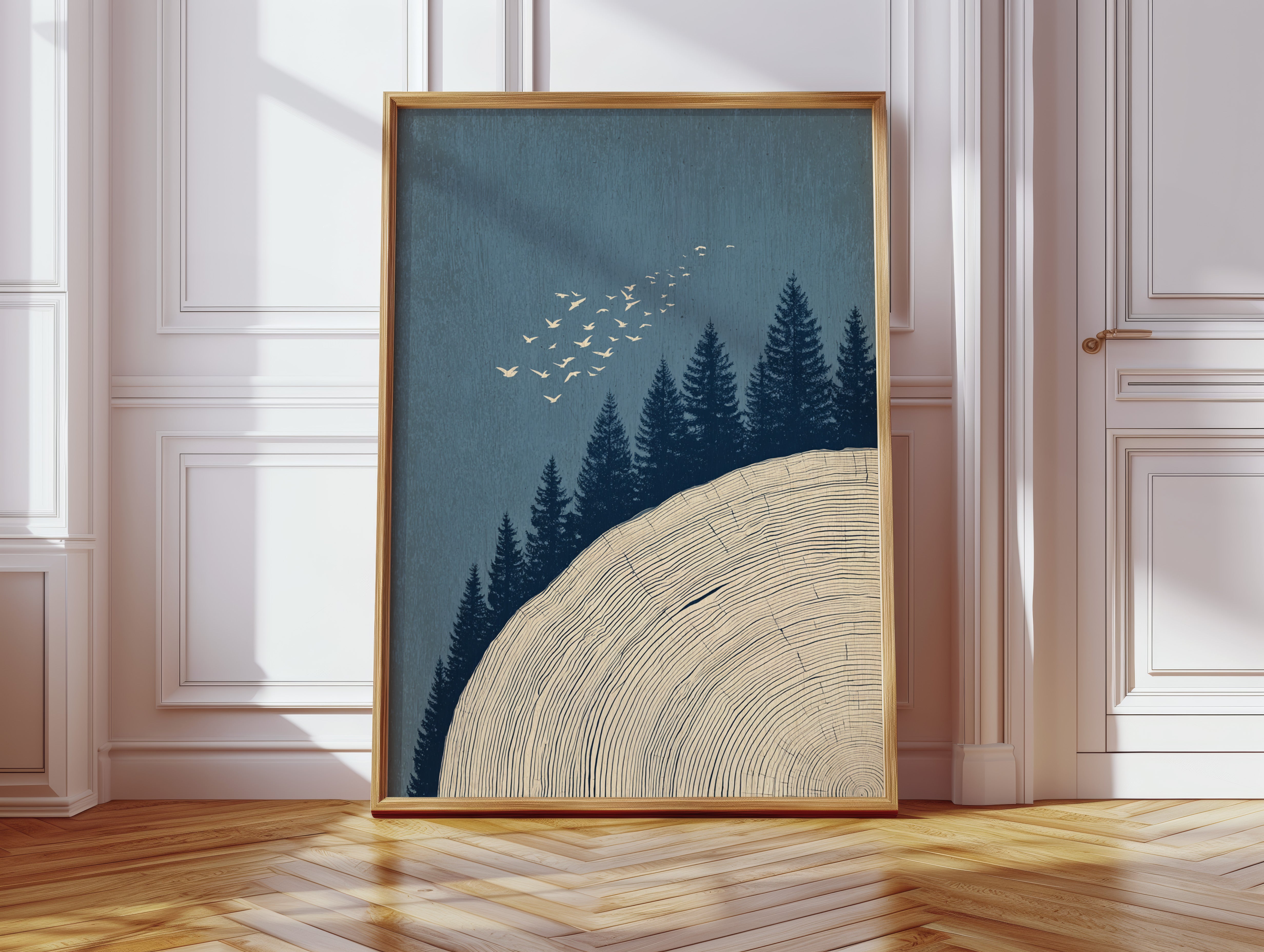 A tranquil moment unfolds as birds cascade into the sky, leaving behind the tales etched in the rings of a timeworn tree. This piece captures the serene essence of natures cycles, harmonizing rustic beauty with a sense of freedom. The deep blues contrast beautifully with the warm, golden hues of the tree trunk, inviting the viewer to reflect on the passage of time and the stories held within. Perfect for a cozy reading nook or a serene bedroom, this artwork inspires introspection and peace.