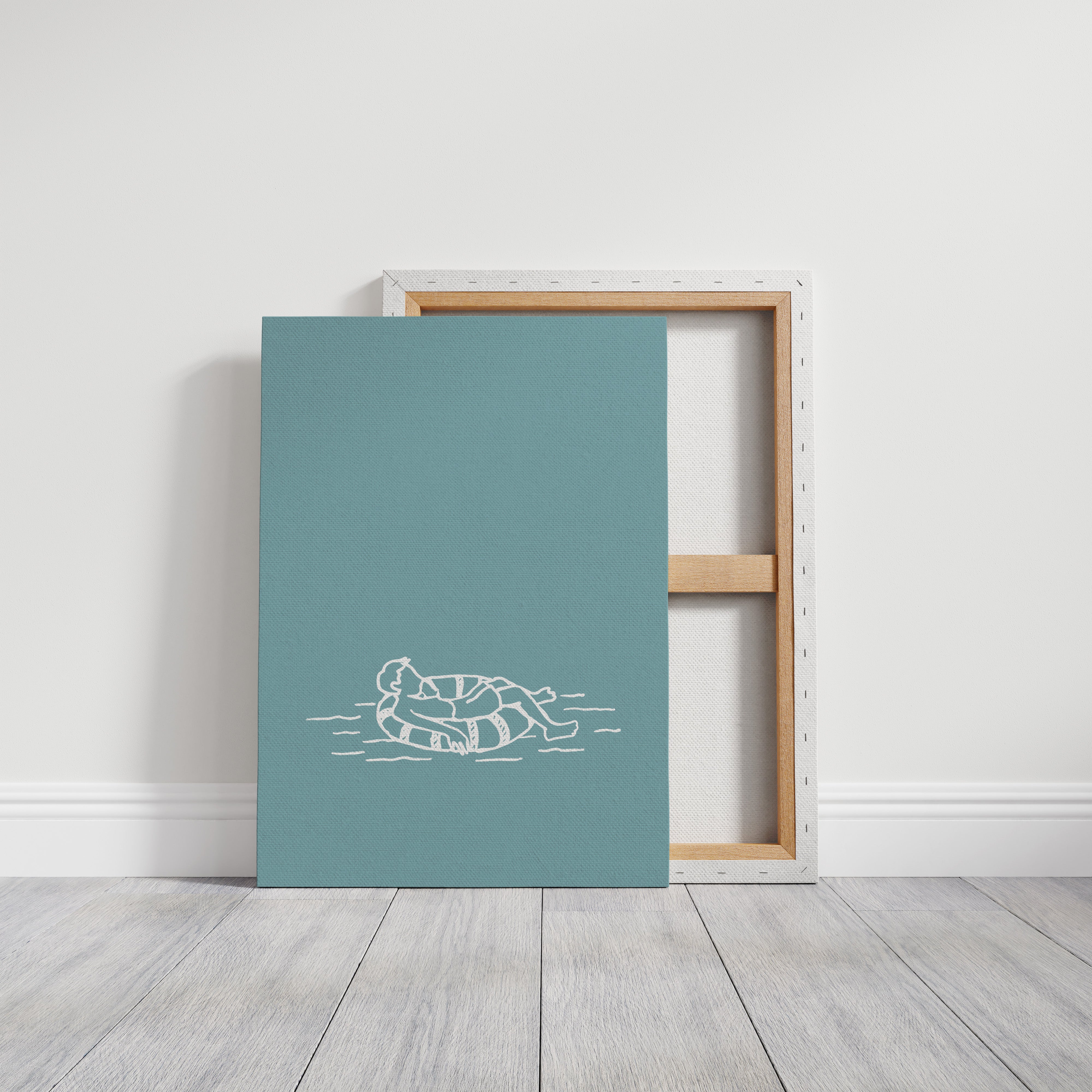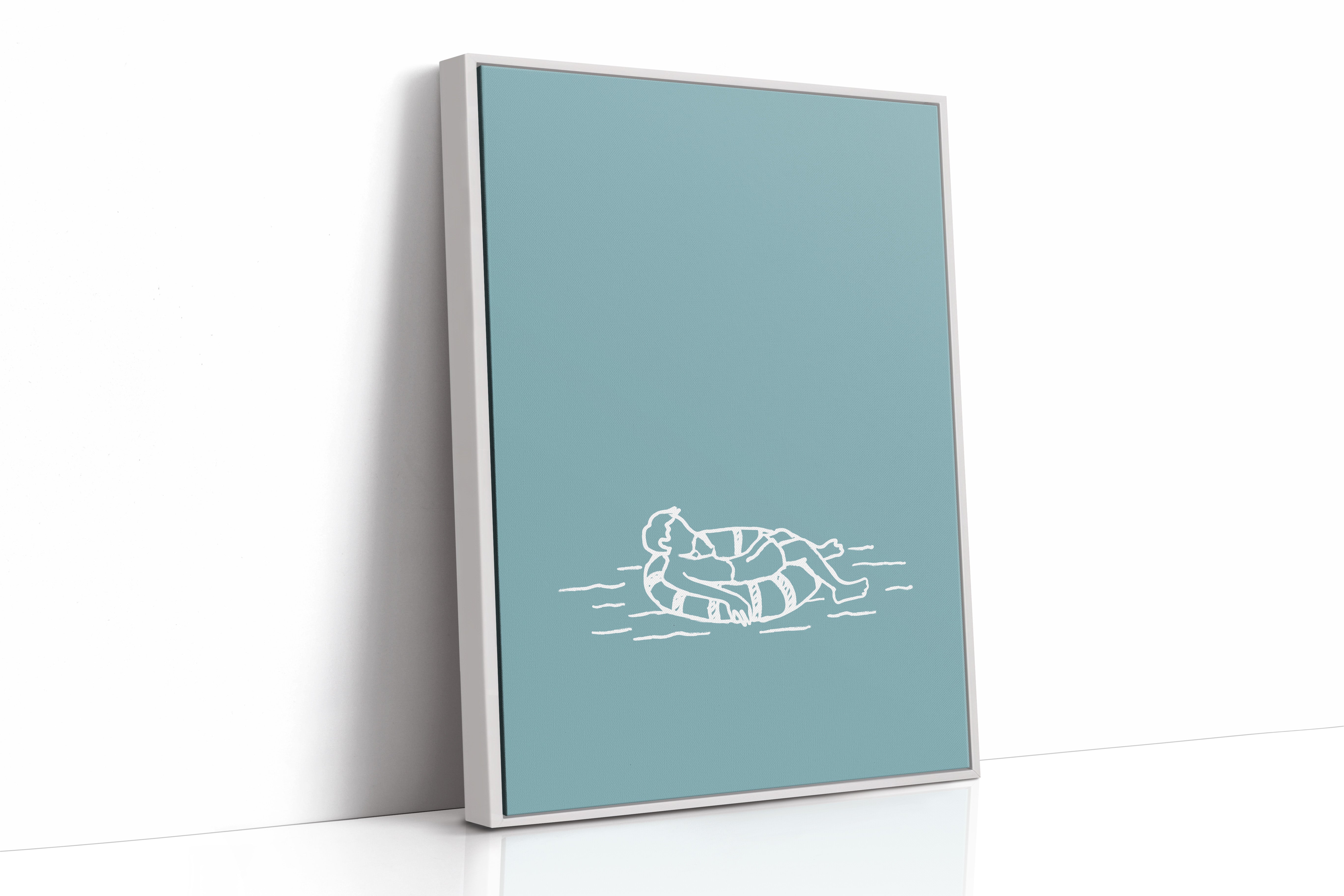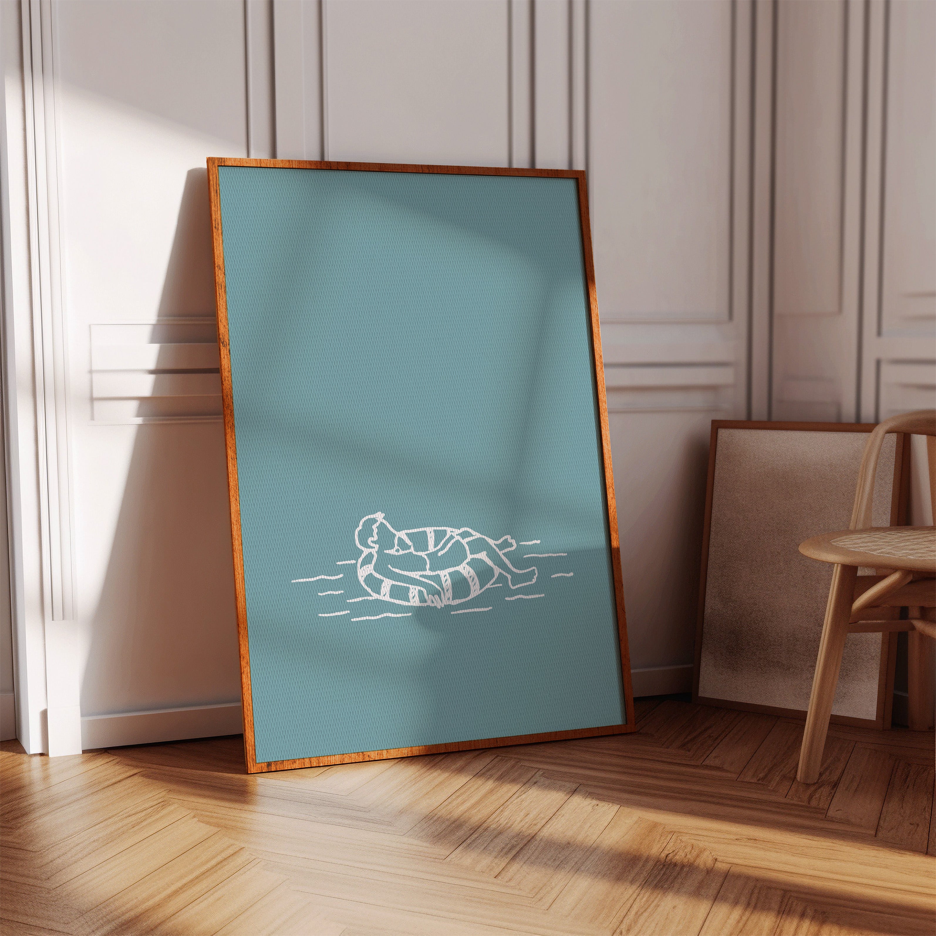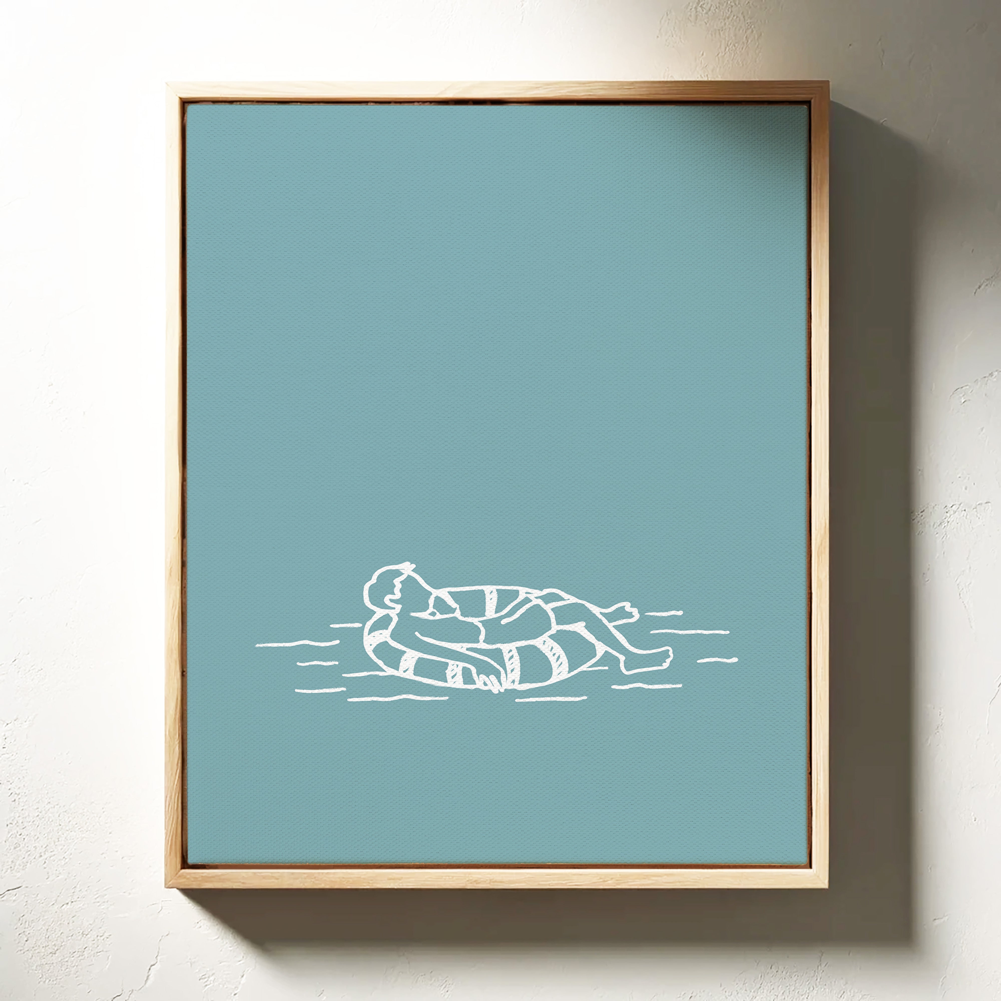 A moment of pure serenity captured in simple white lines against a sea of tranquil aqua, where leisure meets weightlessness. This piece from our Contemporary collection celebrates the minimalist beauty of carefree summer moments. The gentle illustration depicts a figure drifting peacefully on a pool float, creating a story of relaxation and escape through clean, purposeful strokes. The soothing aqua backdrop washes the scene in calm, while the white linear drawing adds a playful, modern touch. Perfect for bringing a sense of peace and summer nostalgia to a bathroom, pool house, or any space seeking a breath of fresh air.