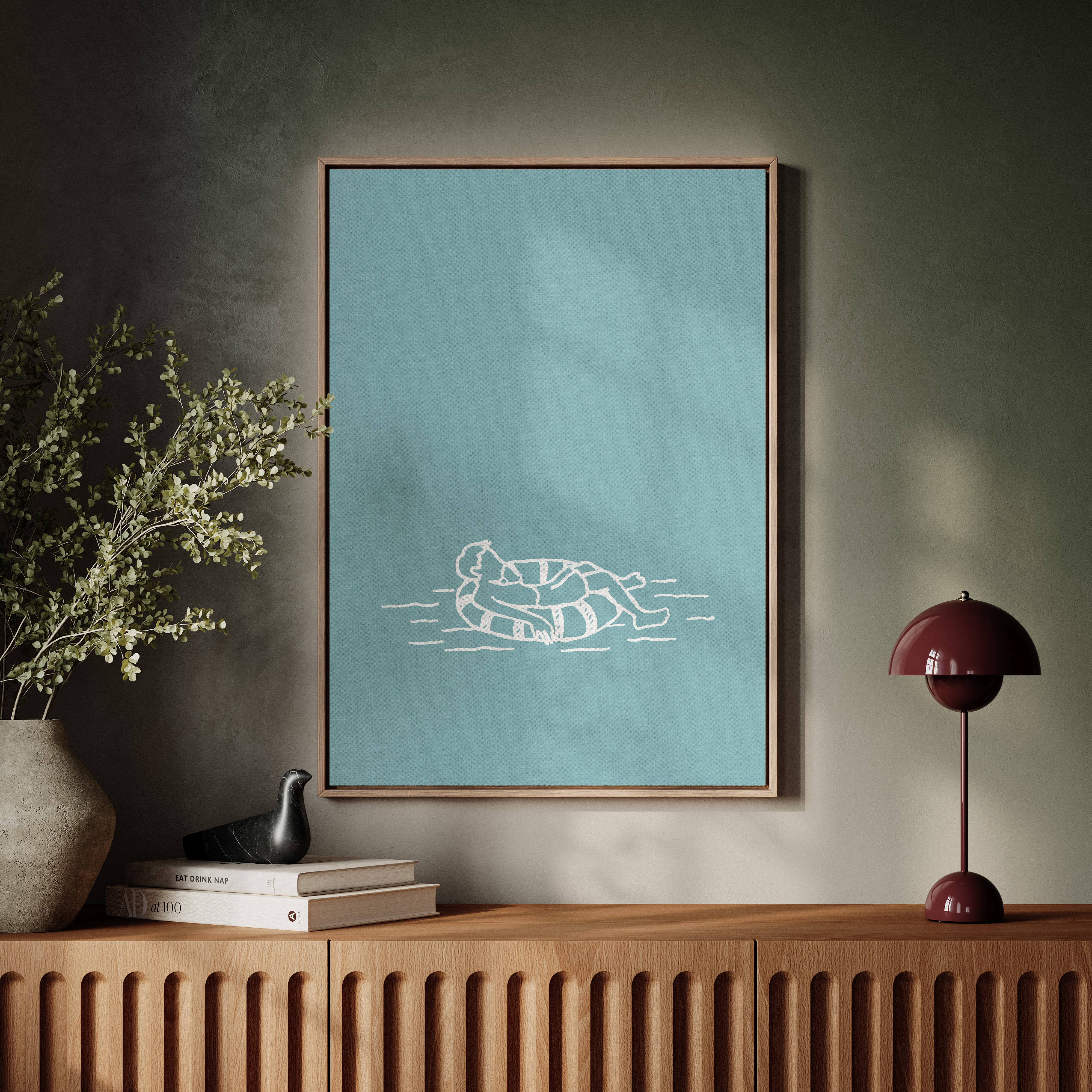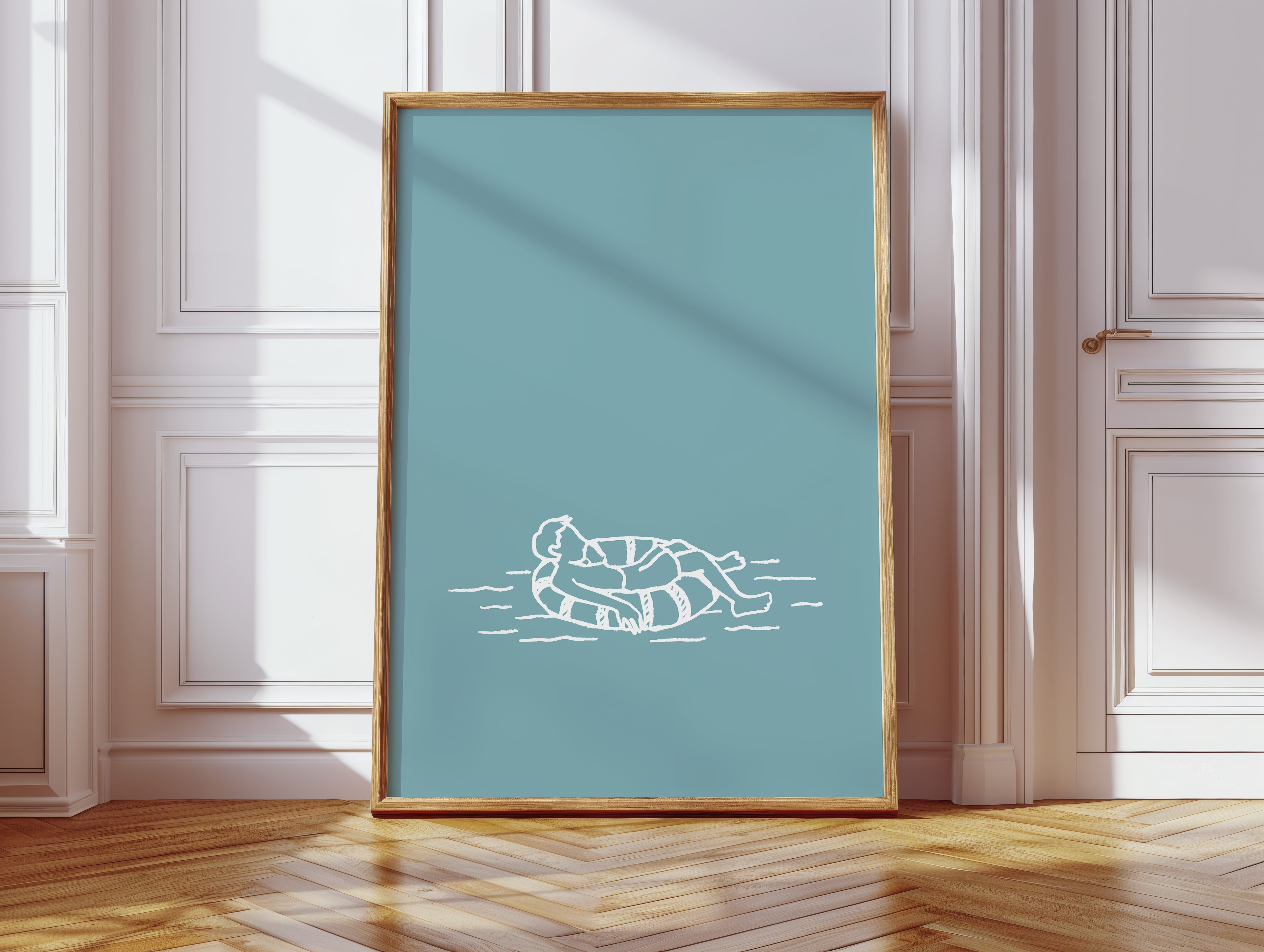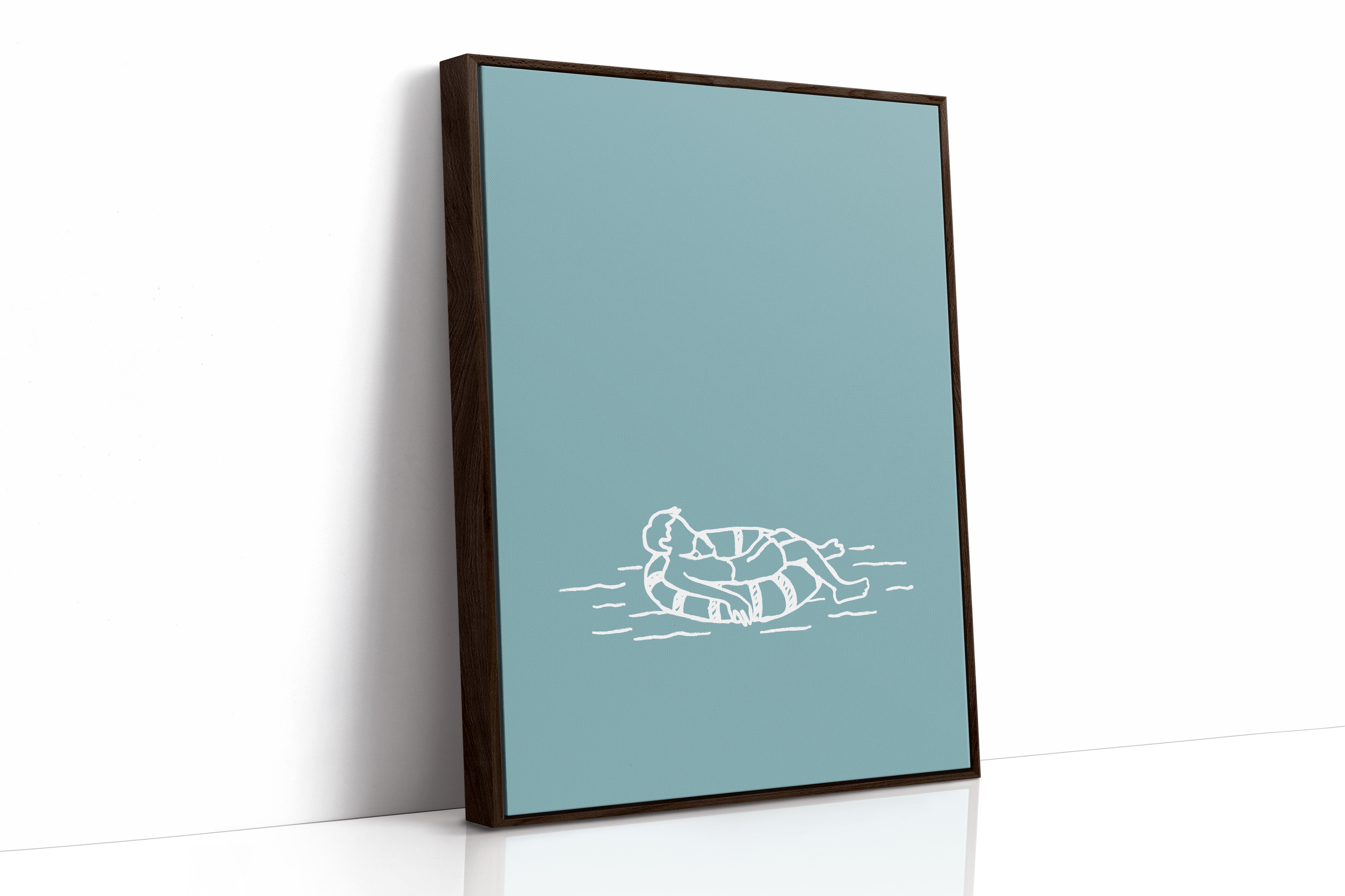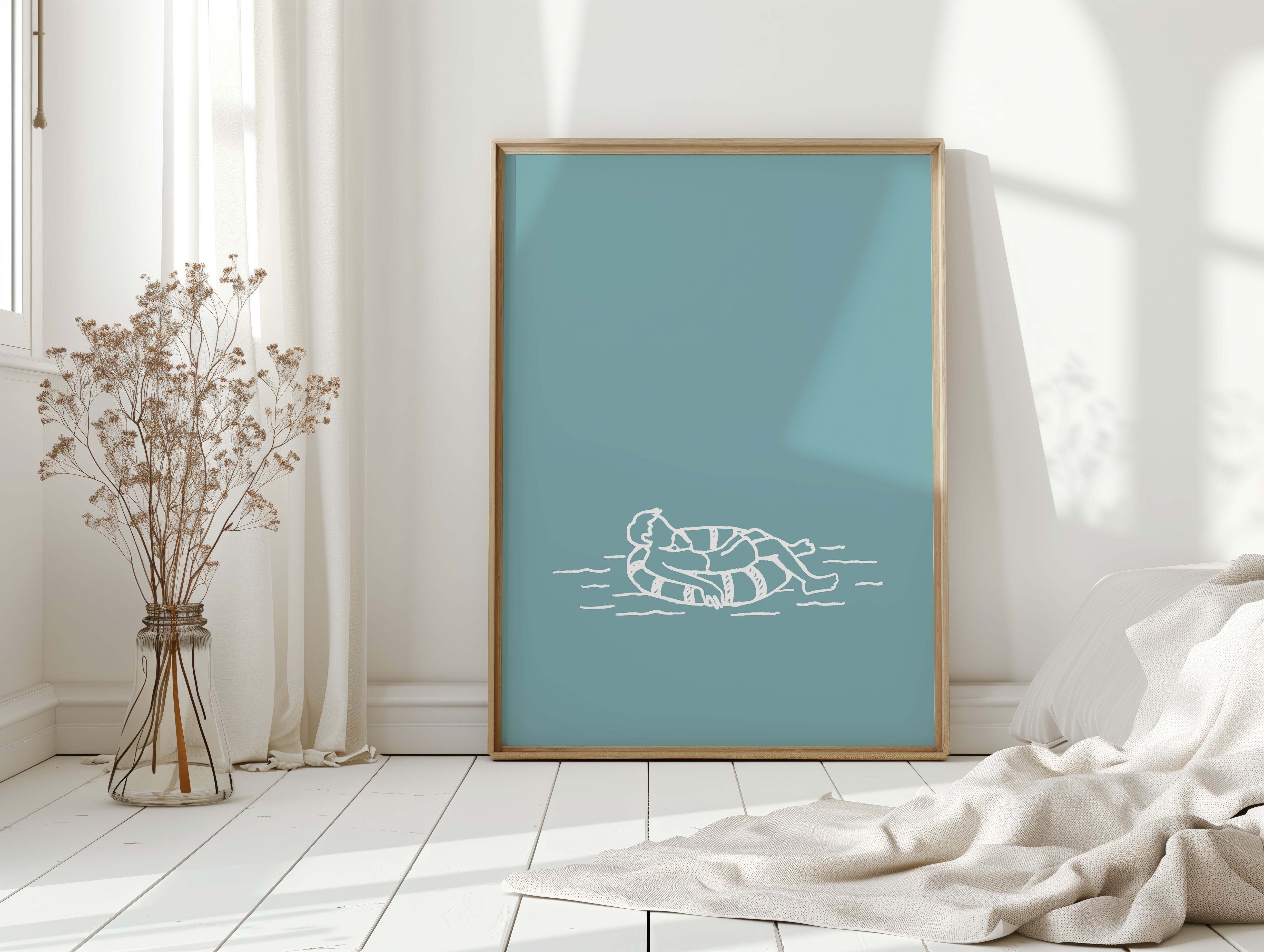 A moment of pure serenity captured in simple white lines against a sea of tranquil aqua, where leisure meets weightlessness. This piece from our Contemporary collection celebrates the minimalist beauty of carefree summer moments. The gentle illustration depicts a figure drifting peacefully on a pool float, creating a story of relaxation and escape through clean, purposeful strokes. The soothing aqua backdrop washes the scene in calm, while the white linear drawing adds a playful, modern touch. Perfect for bringing a sense of peace and summer nostalgia to a bathroom, pool house, or any space seeking a breath of fresh air.