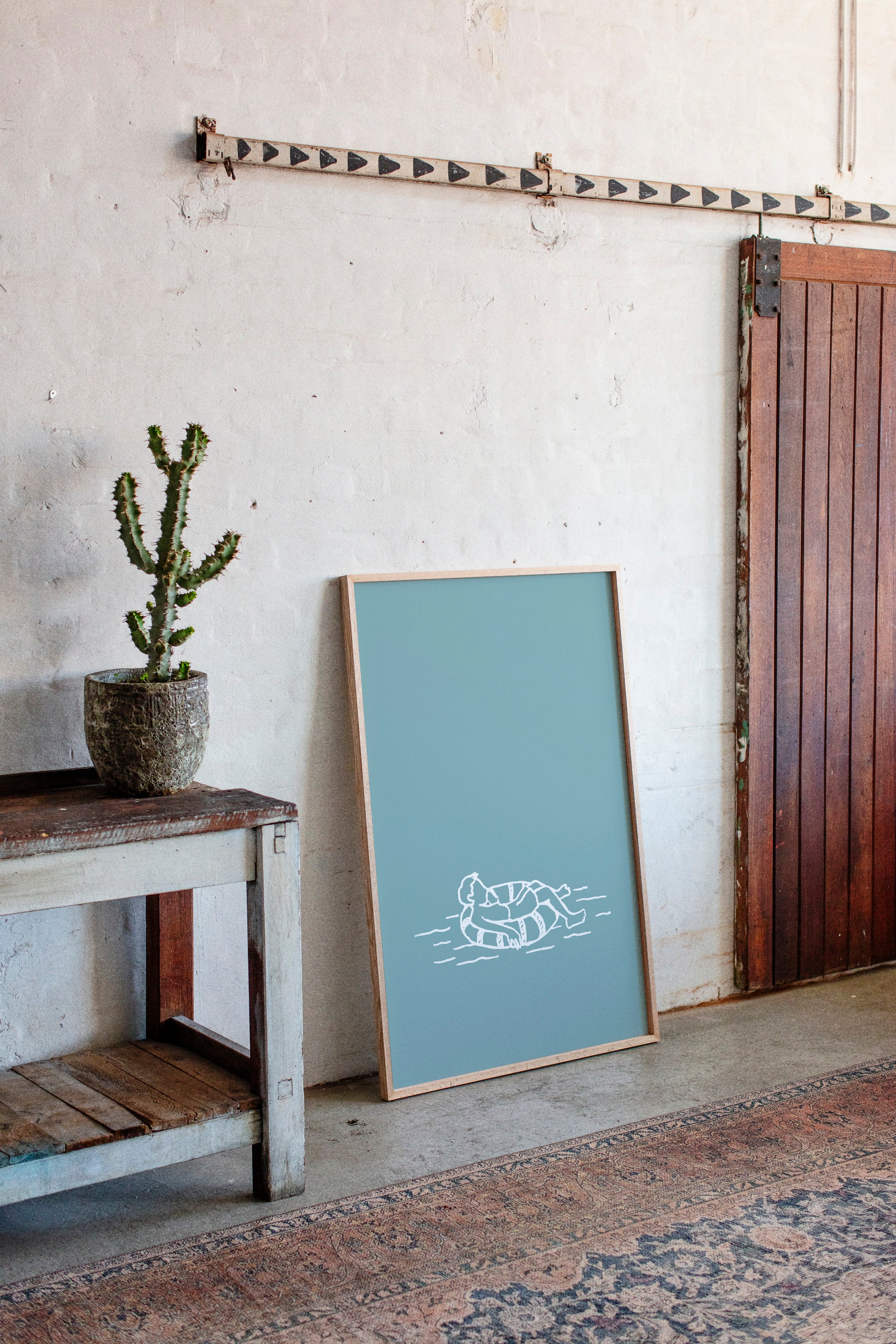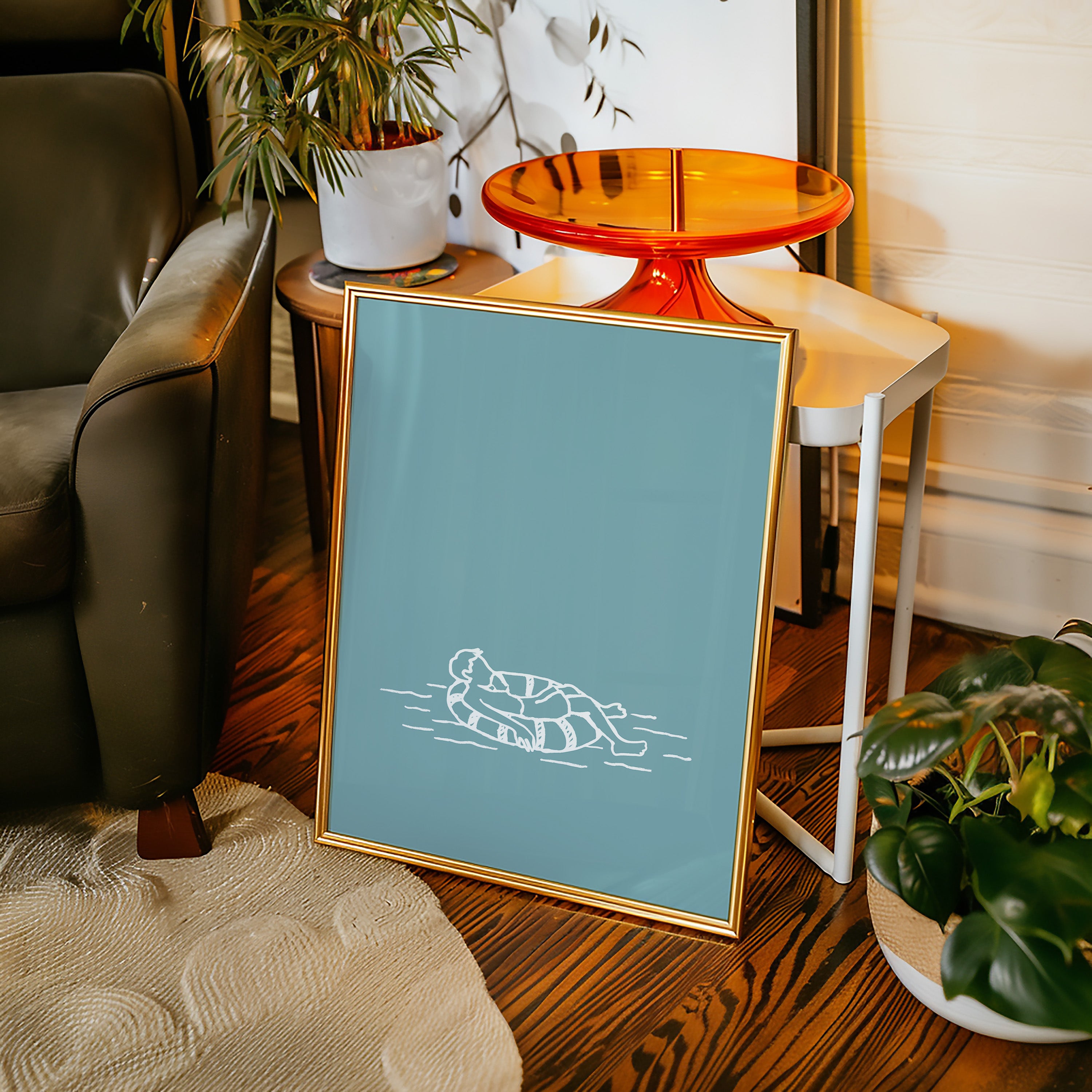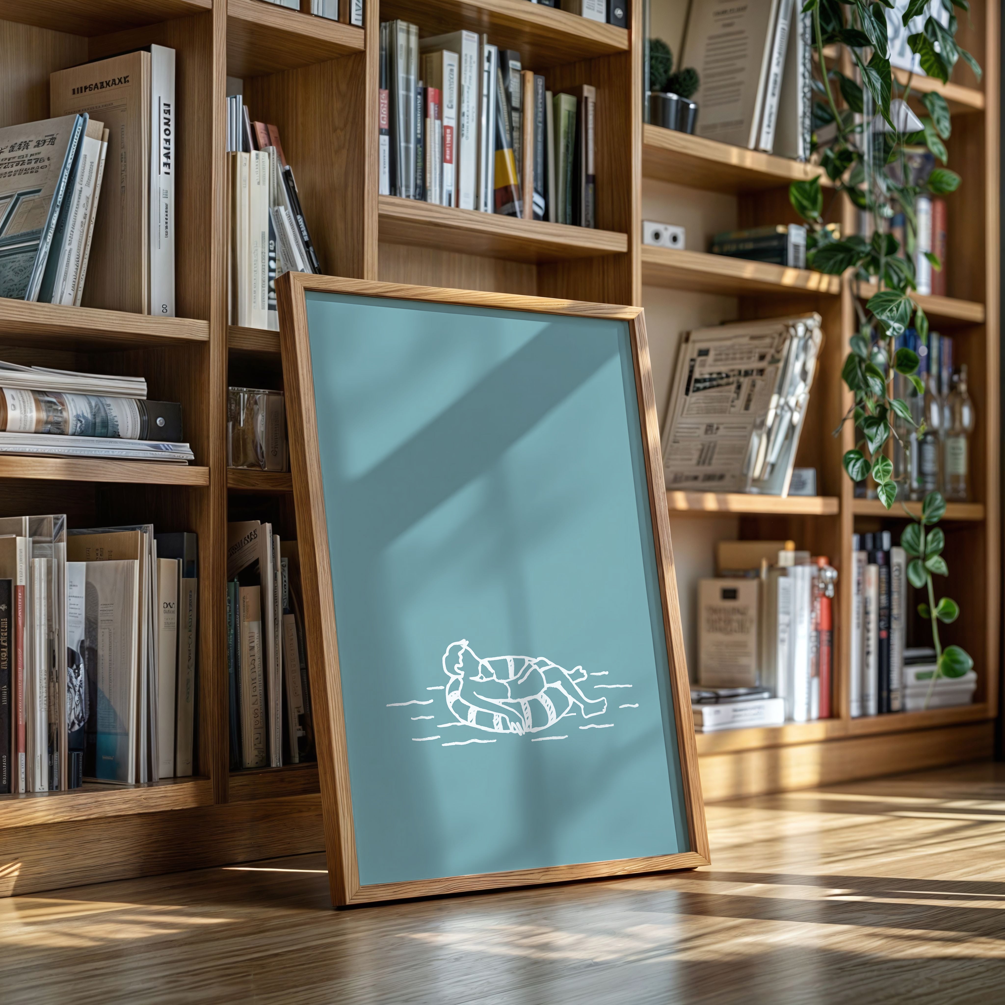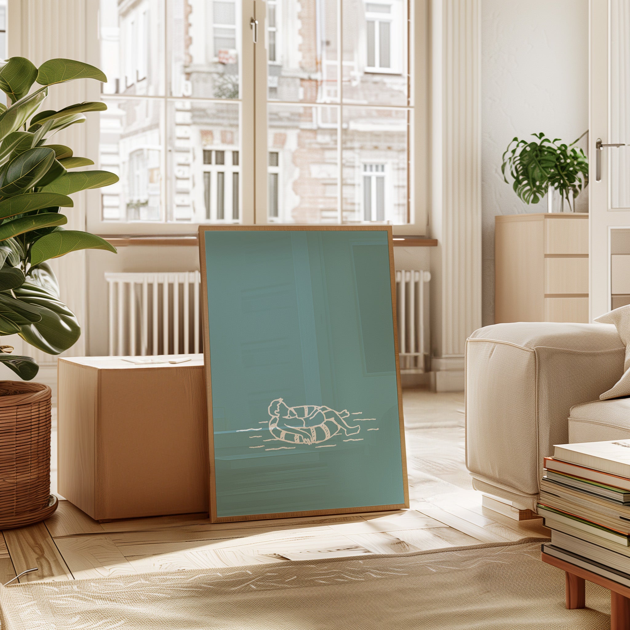 A moment of pure serenity captured in simple white lines against a sea of tranquil aqua, where leisure meets weightlessness. This piece from our Contemporary collection celebrates the minimalist beauty of carefree summer moments. The gentle illustration depicts a figure drifting peacefully on a pool float, creating a story of relaxation and escape through clean, purposeful strokes. The soothing aqua backdrop washes the scene in calm, while the white linear drawing adds a playful, modern touch. Perfect for bringing a sense of peace and summer nostalgia to a bathroom, pool house, or any space seeking a breath of fresh air.