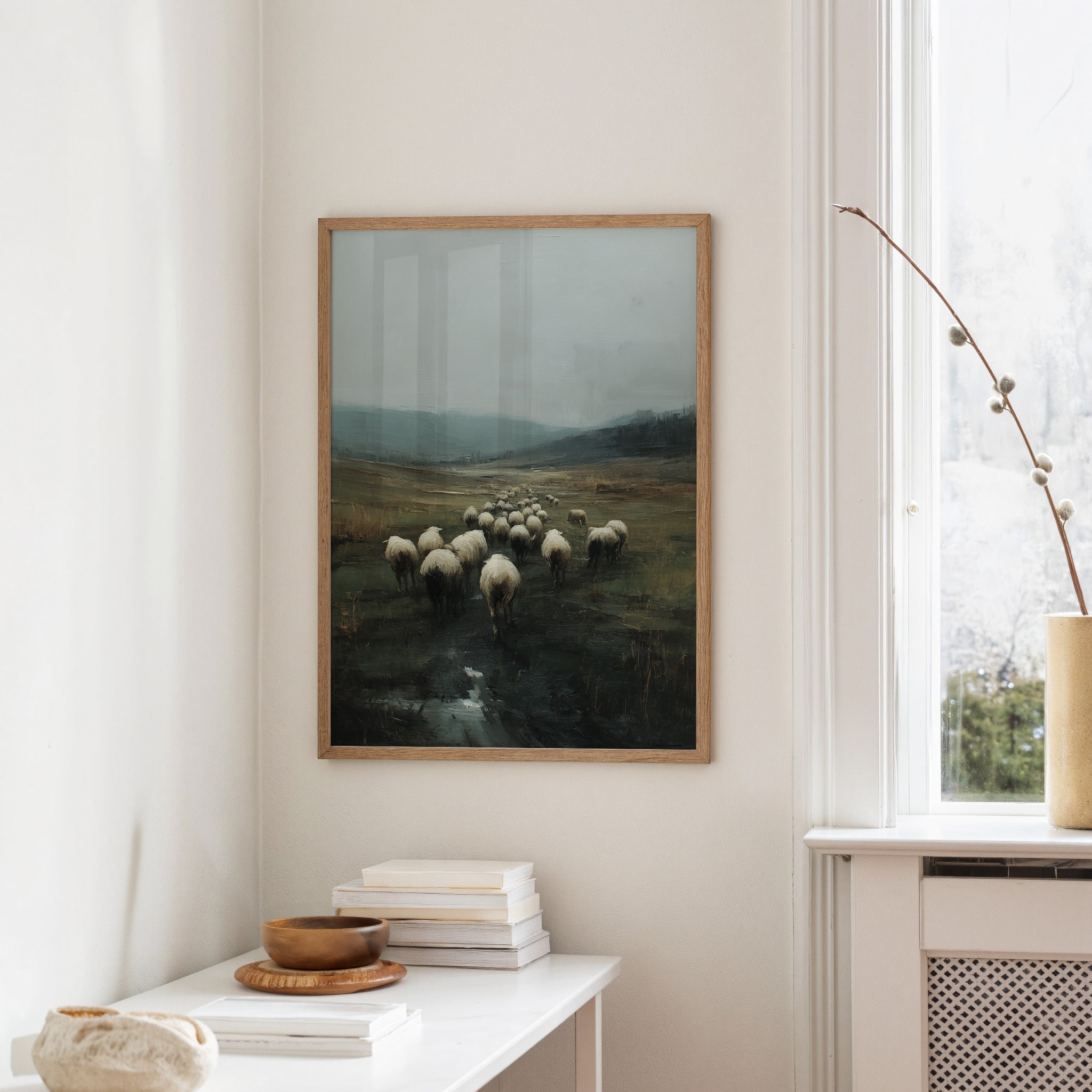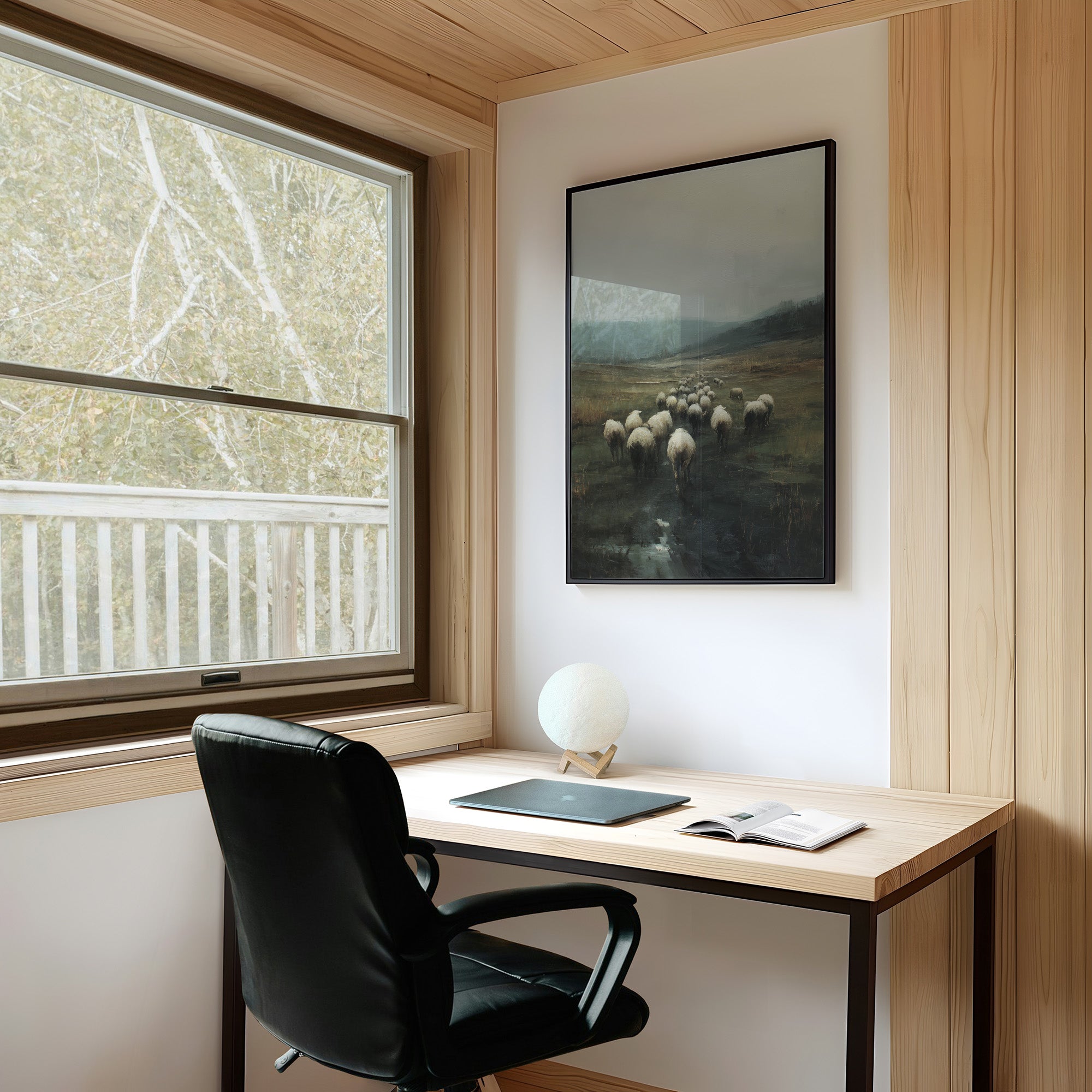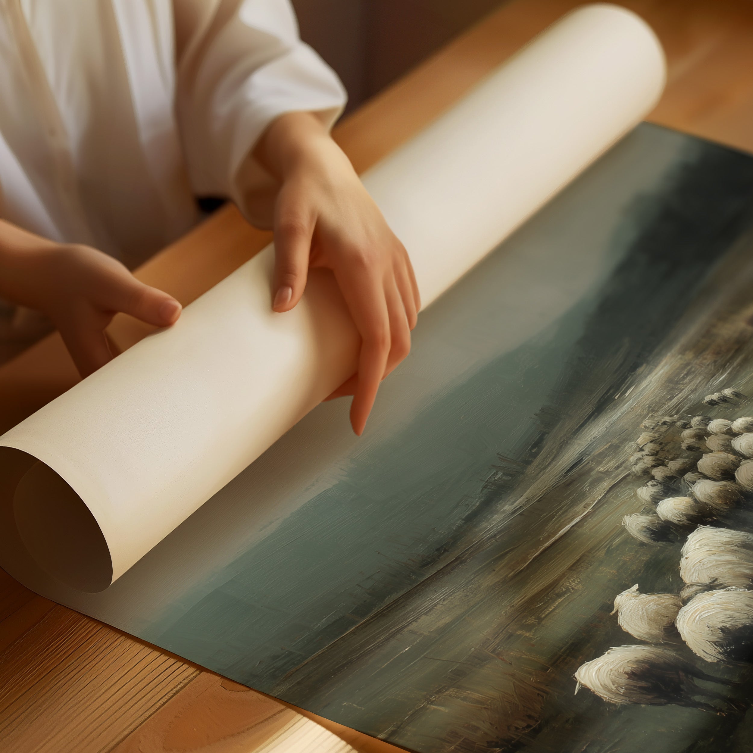 Morning fog hangs heavy over the landscape, shrouding the world in quiet mystery as sheep traverse the dampened earth. The muted palette of grays and deep greens creates a somber yet peaceful scene, where time seems suspended between dawn and day. The painting rests on a rustic wooden table, inviting contemplation alongside morning coffee and the gentle presence of nearby greenery. This piece brings the tranquility of pastoral life into contemporary living spaces.
