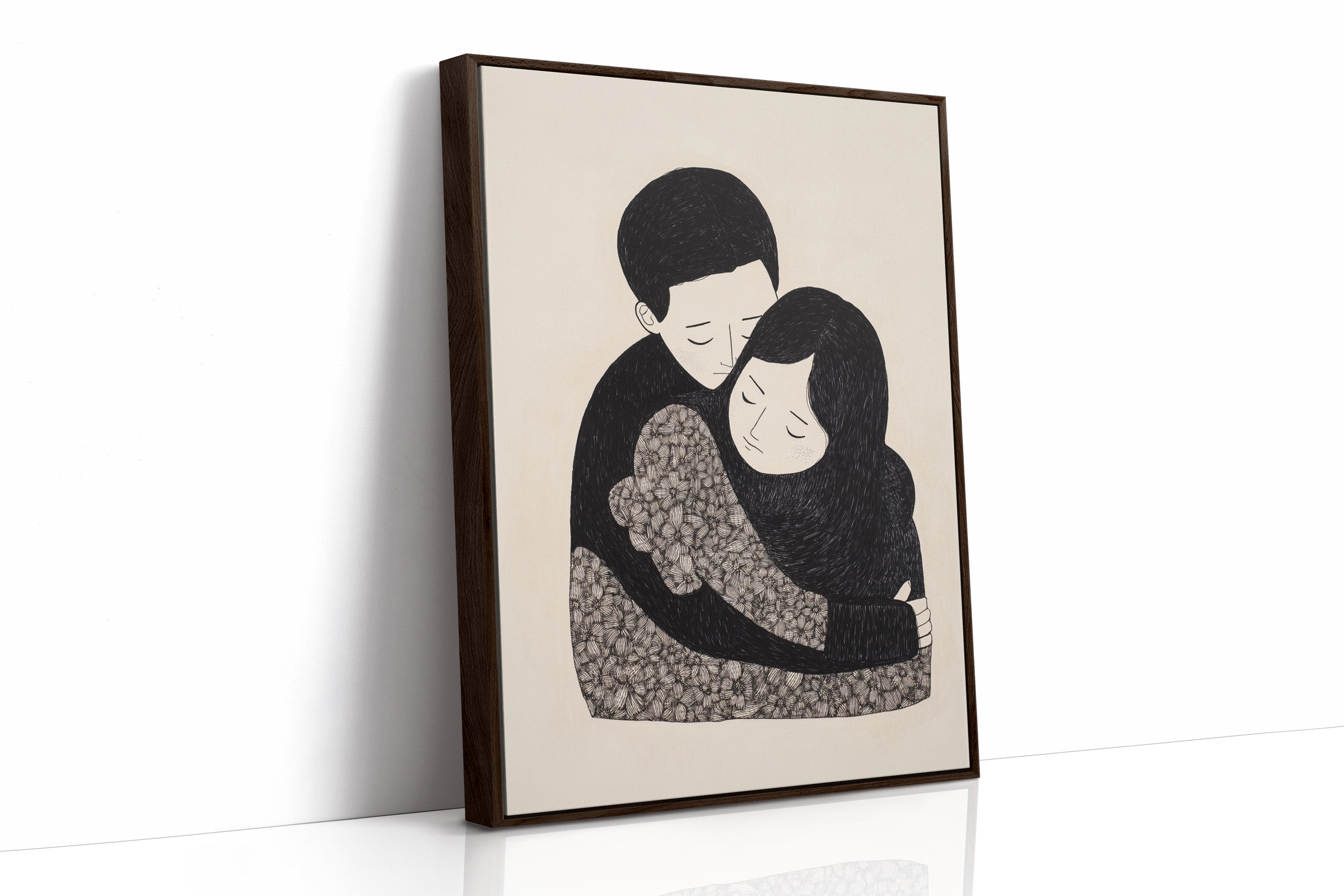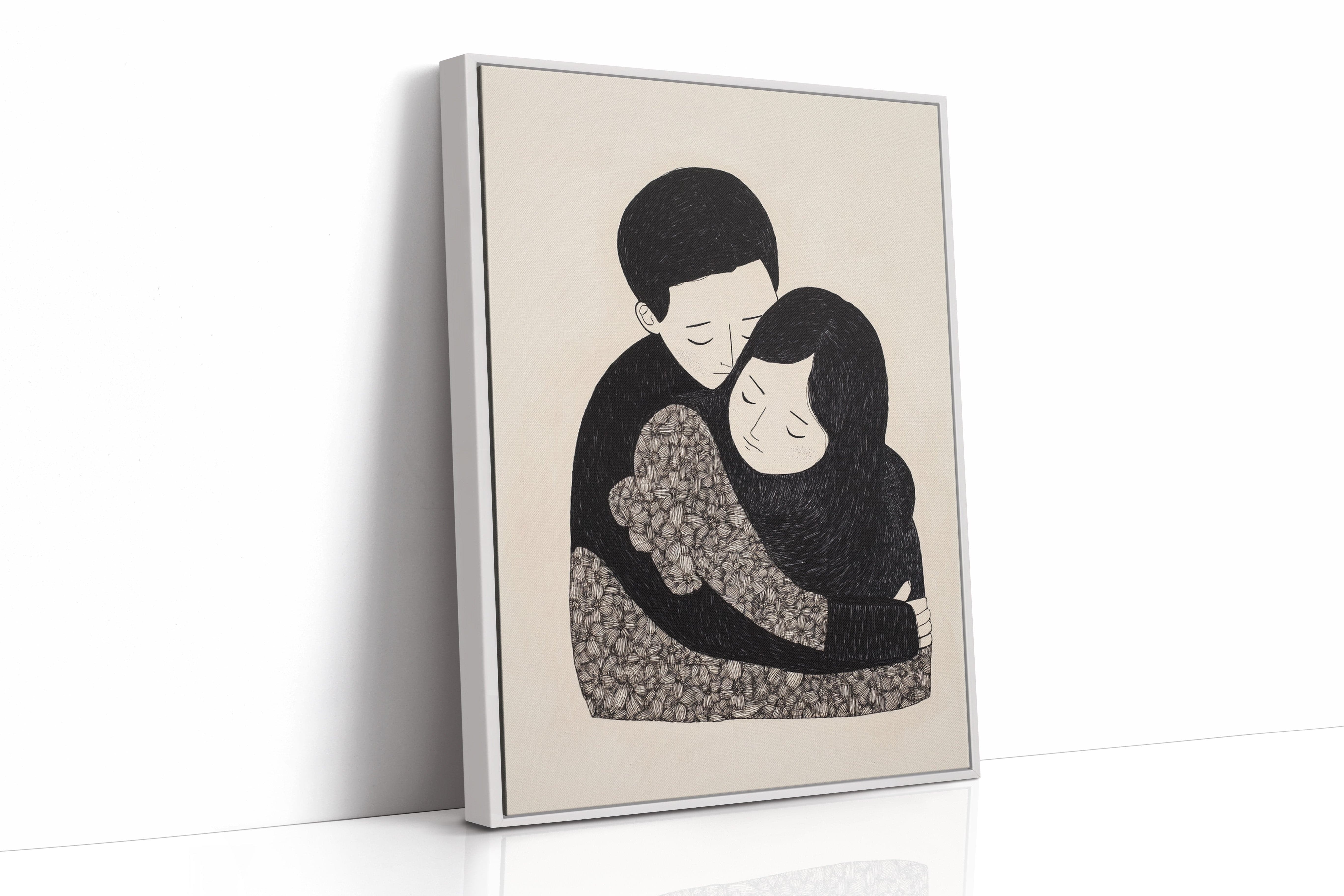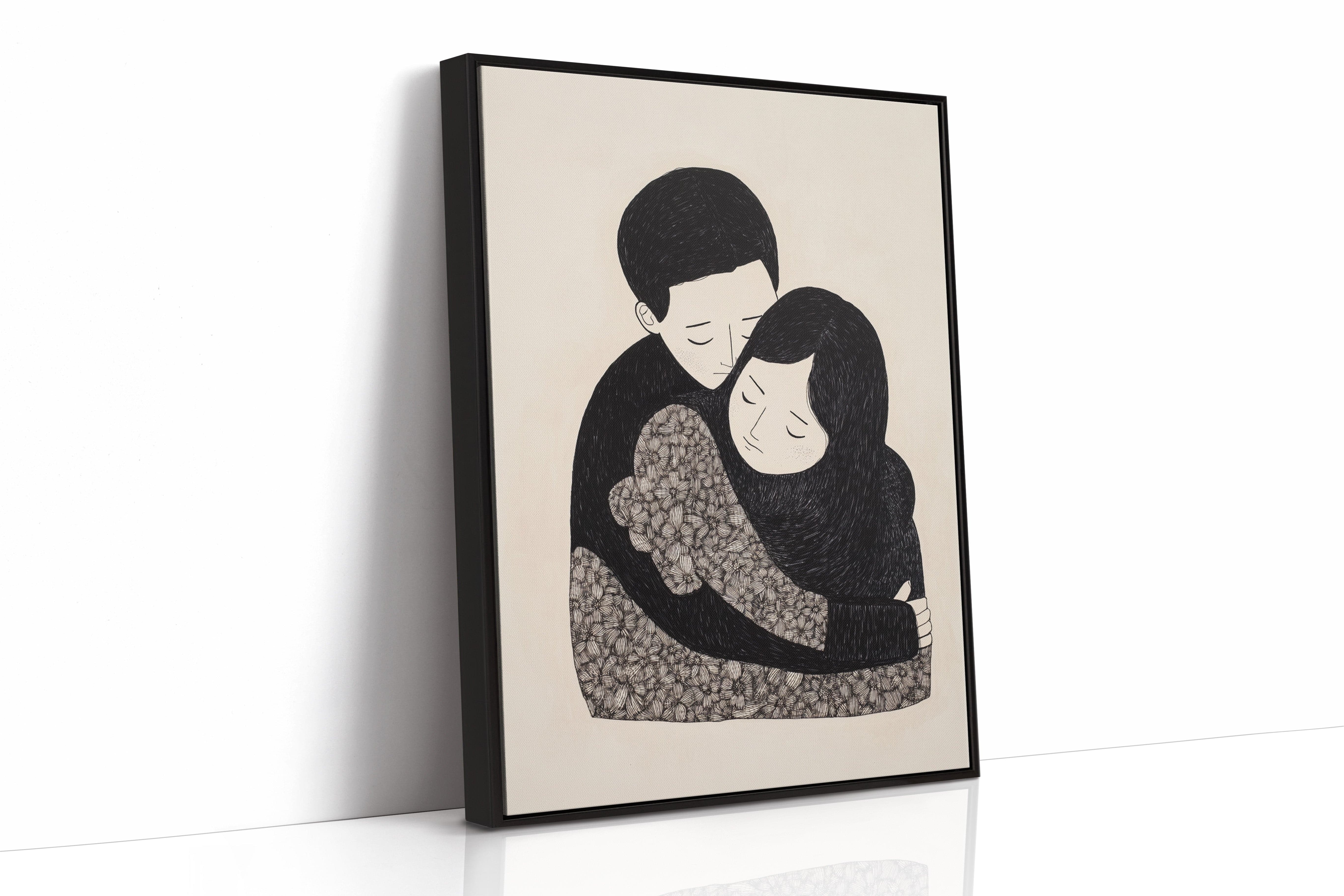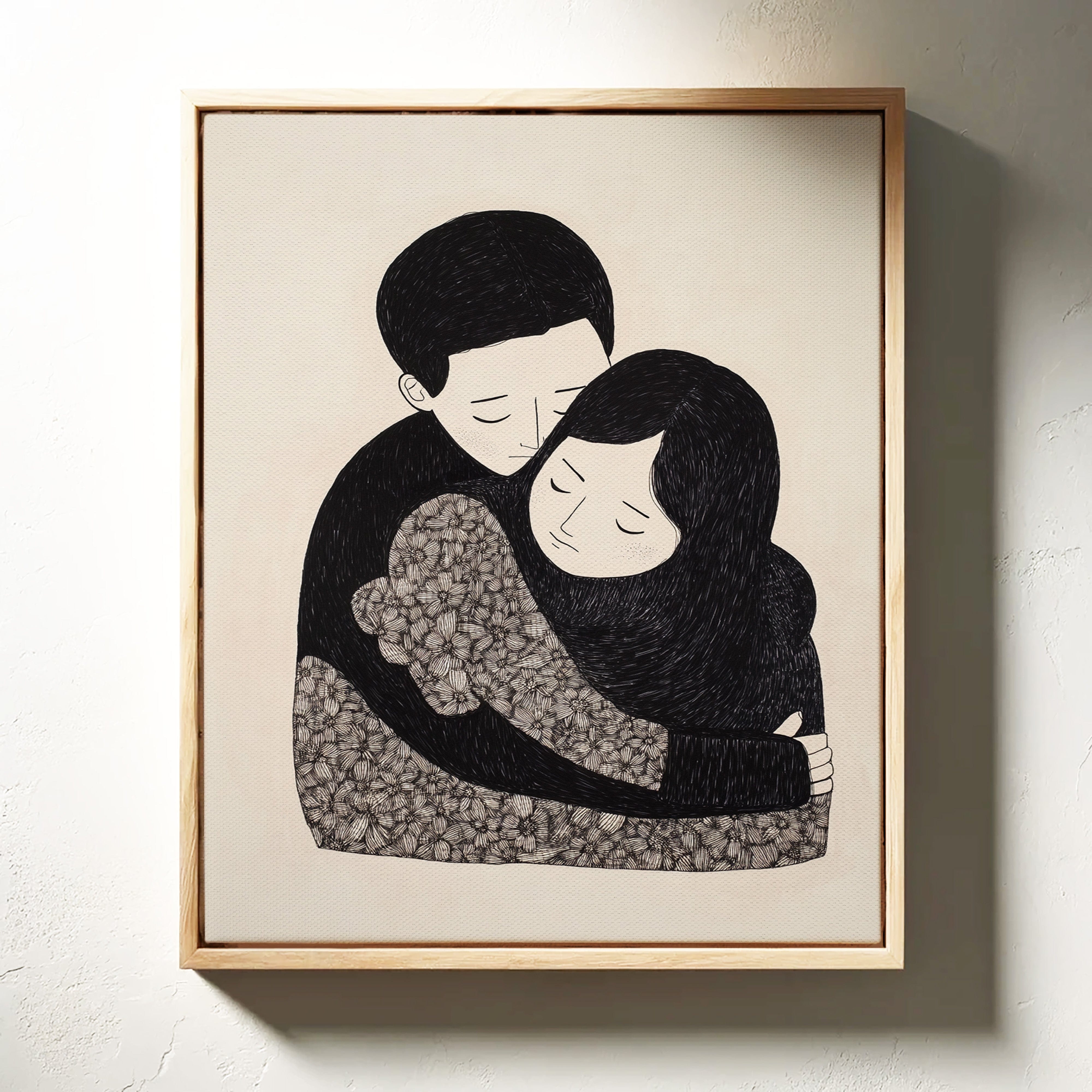 In the gentle stillness of a shared moment, two figures find solace in each other's presence. The stark contrast of black lines against cream creates an intimate portrait, while delicate floral patterns weave through their embrace like memories made tangible. Their closed eyes and peaceful expressions speak of complete trust and understanding, captured in a minimalist style that emphasizes emotional connection over detail. This piece would bring a touch of tender storytelling to a bedroom or reading nook, where its quiet beauty can be appreciated in moments of reflection.