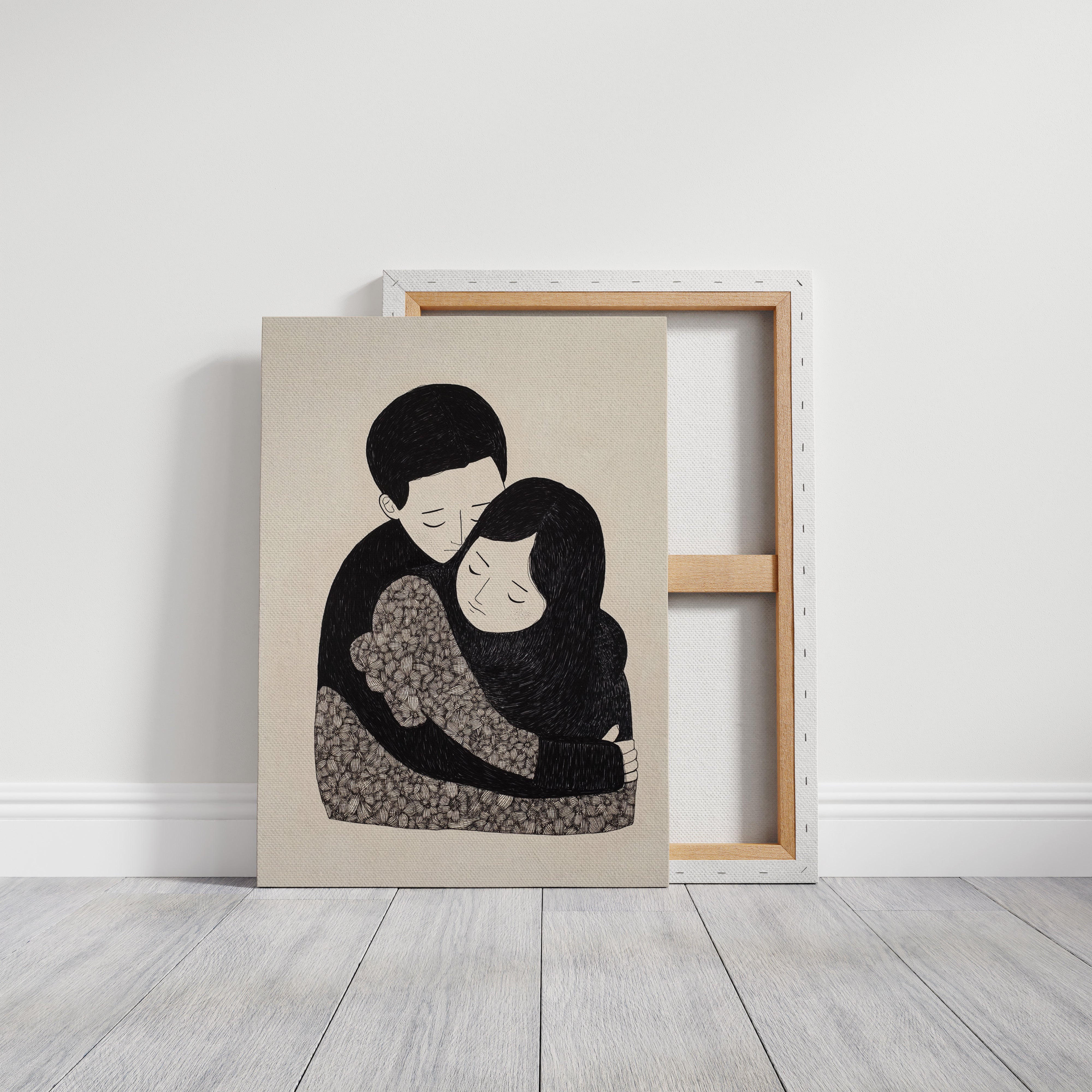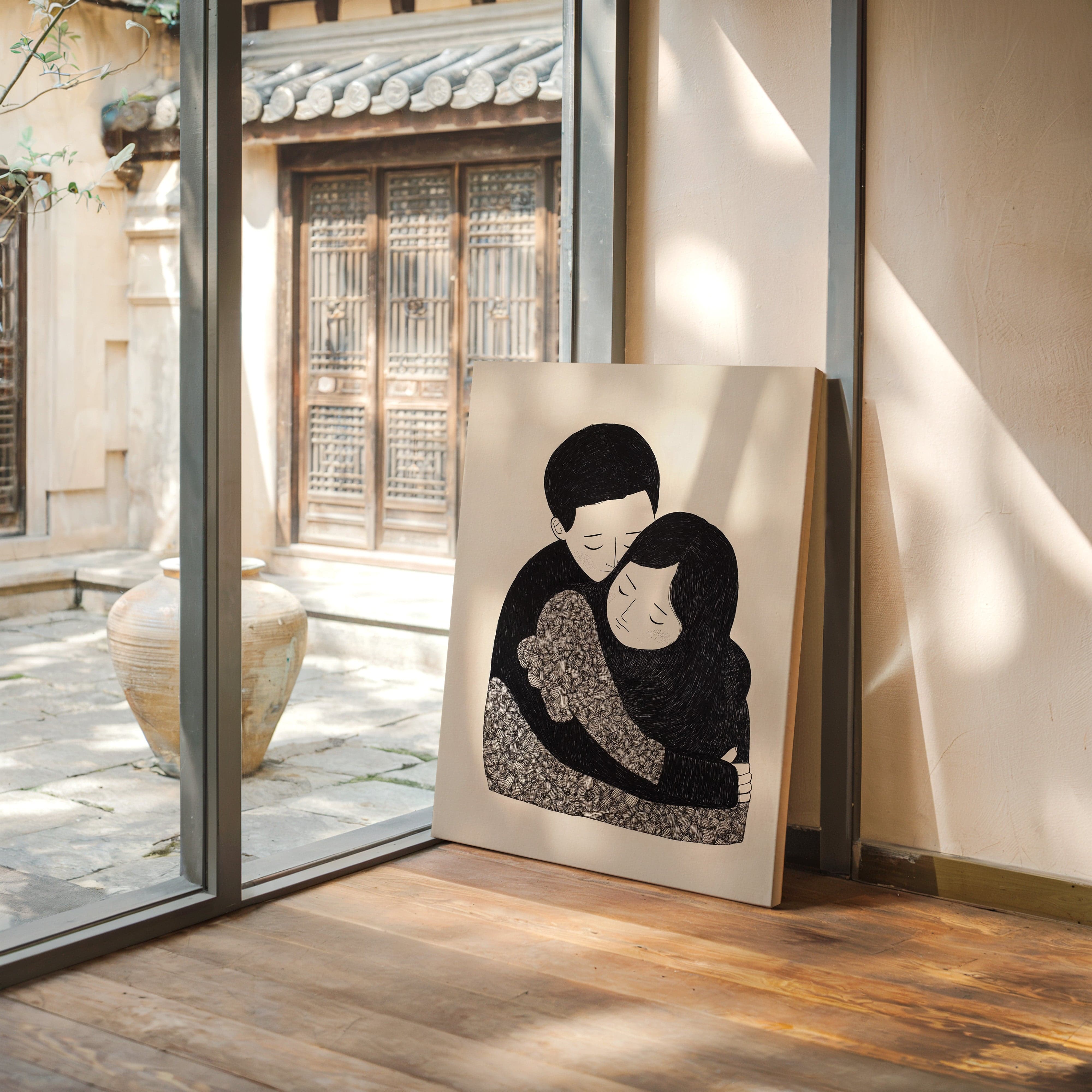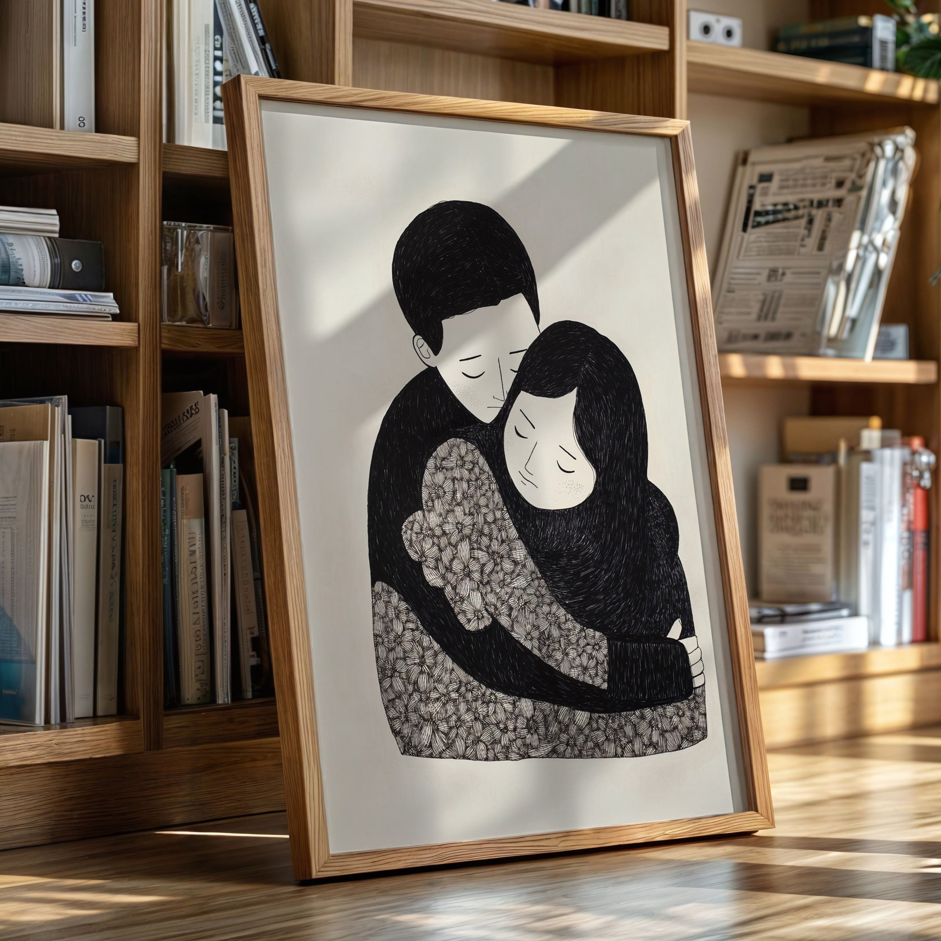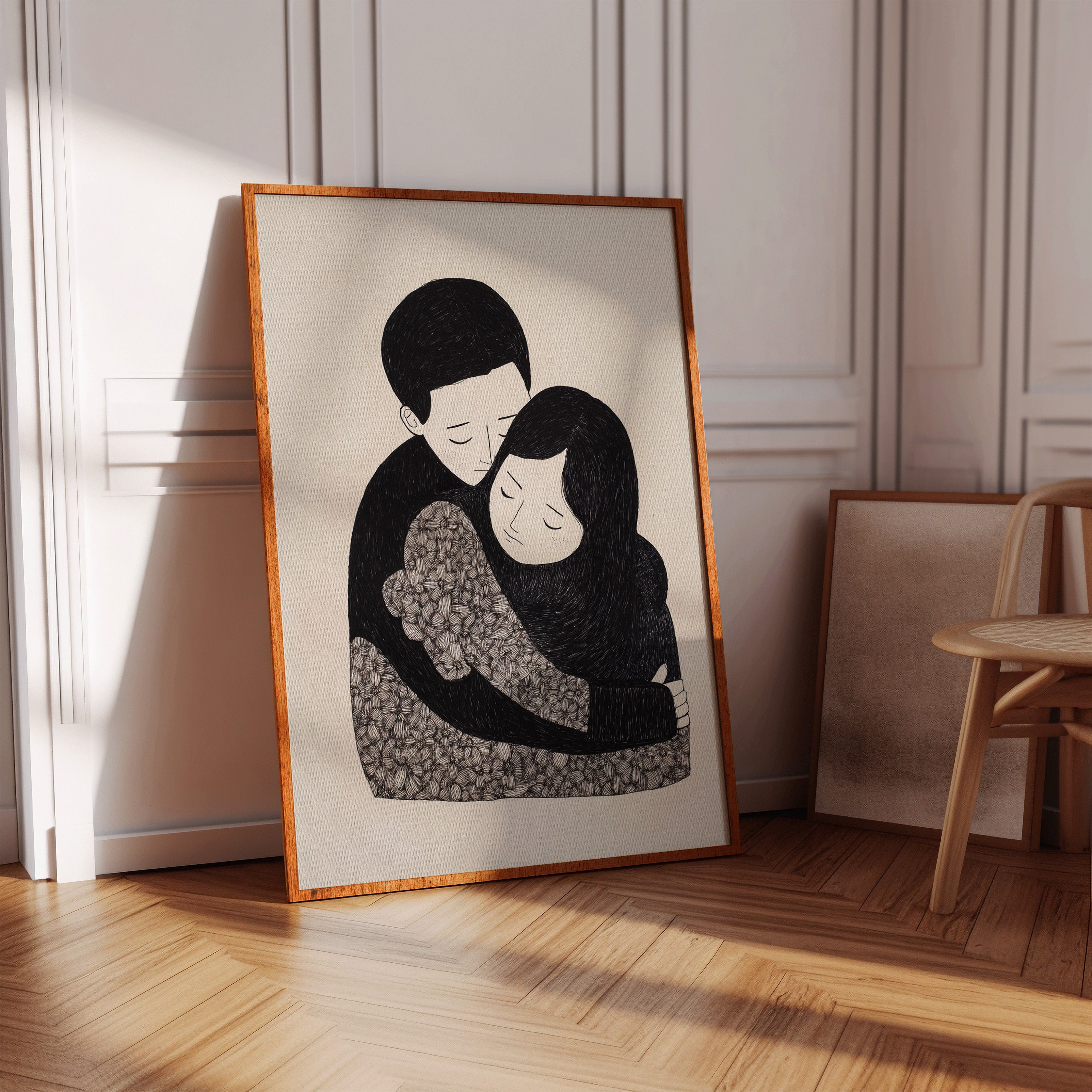 In the gentle stillness of a shared moment, two figures find solace in each other's presence. The stark contrast of black lines against cream creates an intimate portrait, while delicate floral patterns weave through their embrace like memories made tangible. Their closed eyes and peaceful expressions speak of complete trust and understanding, captured in a minimalist style that emphasizes emotional connection over detail. This piece would bring a touch of tender storytelling to a bedroom or reading nook, where its quiet beauty can be appreciated in moments of reflection.