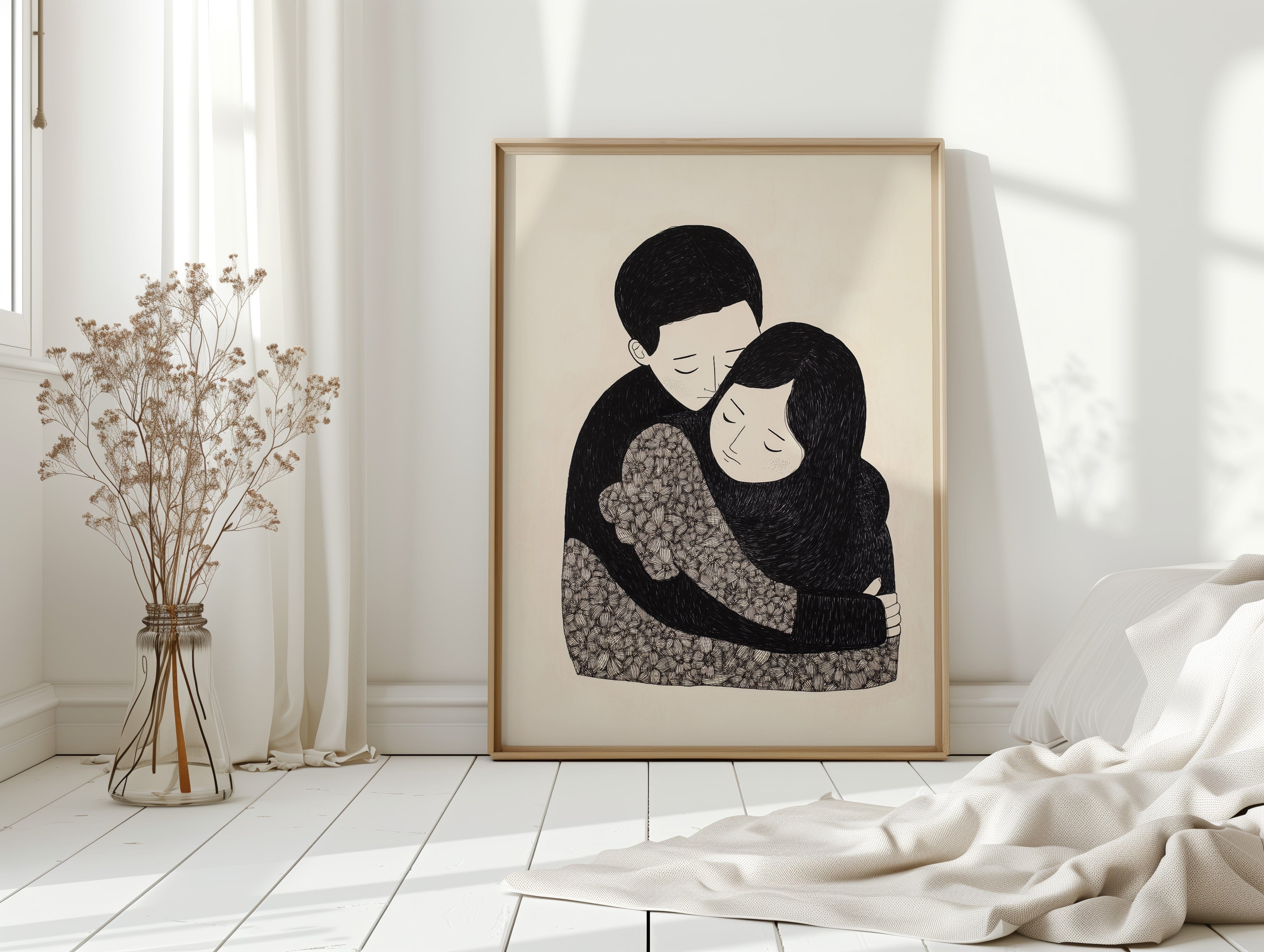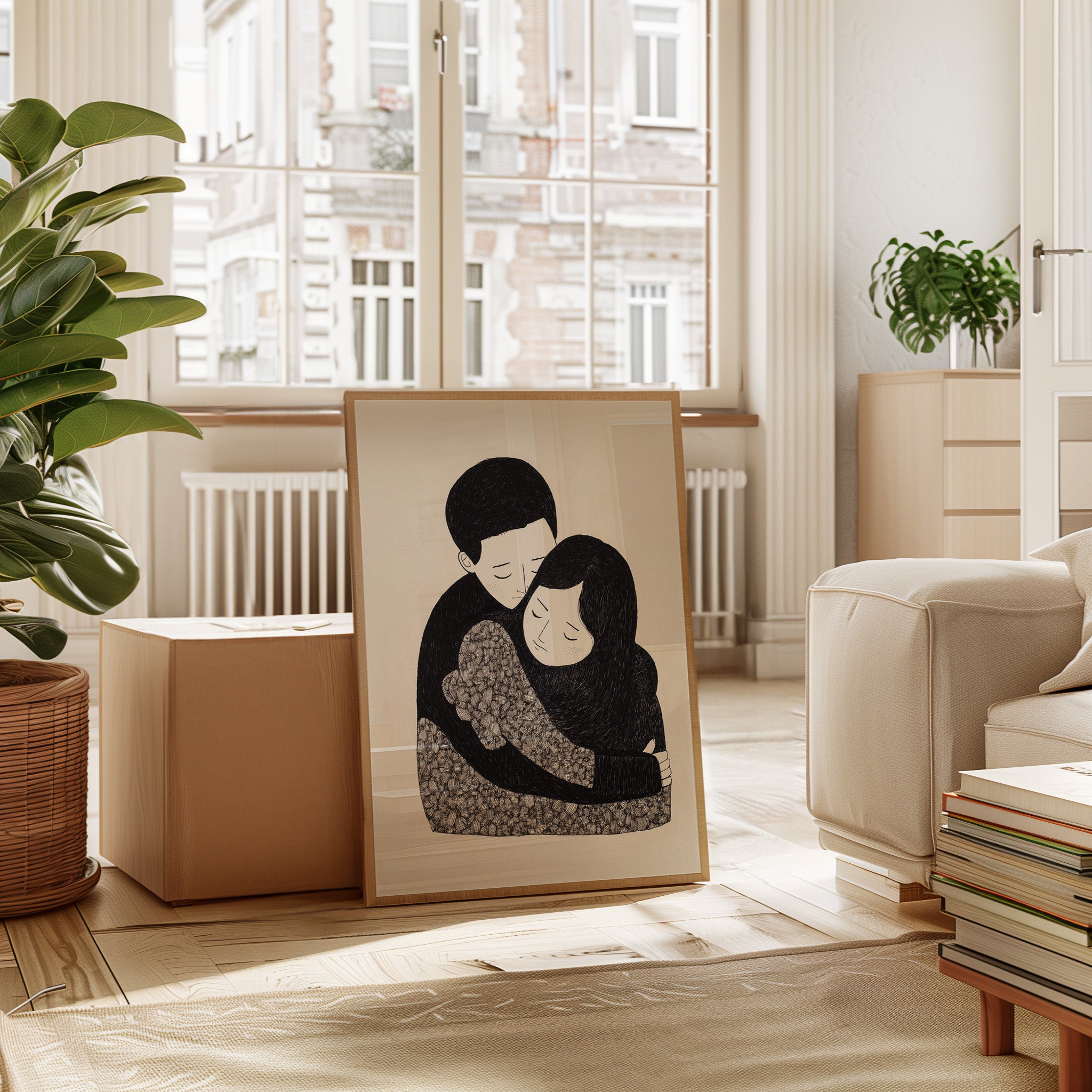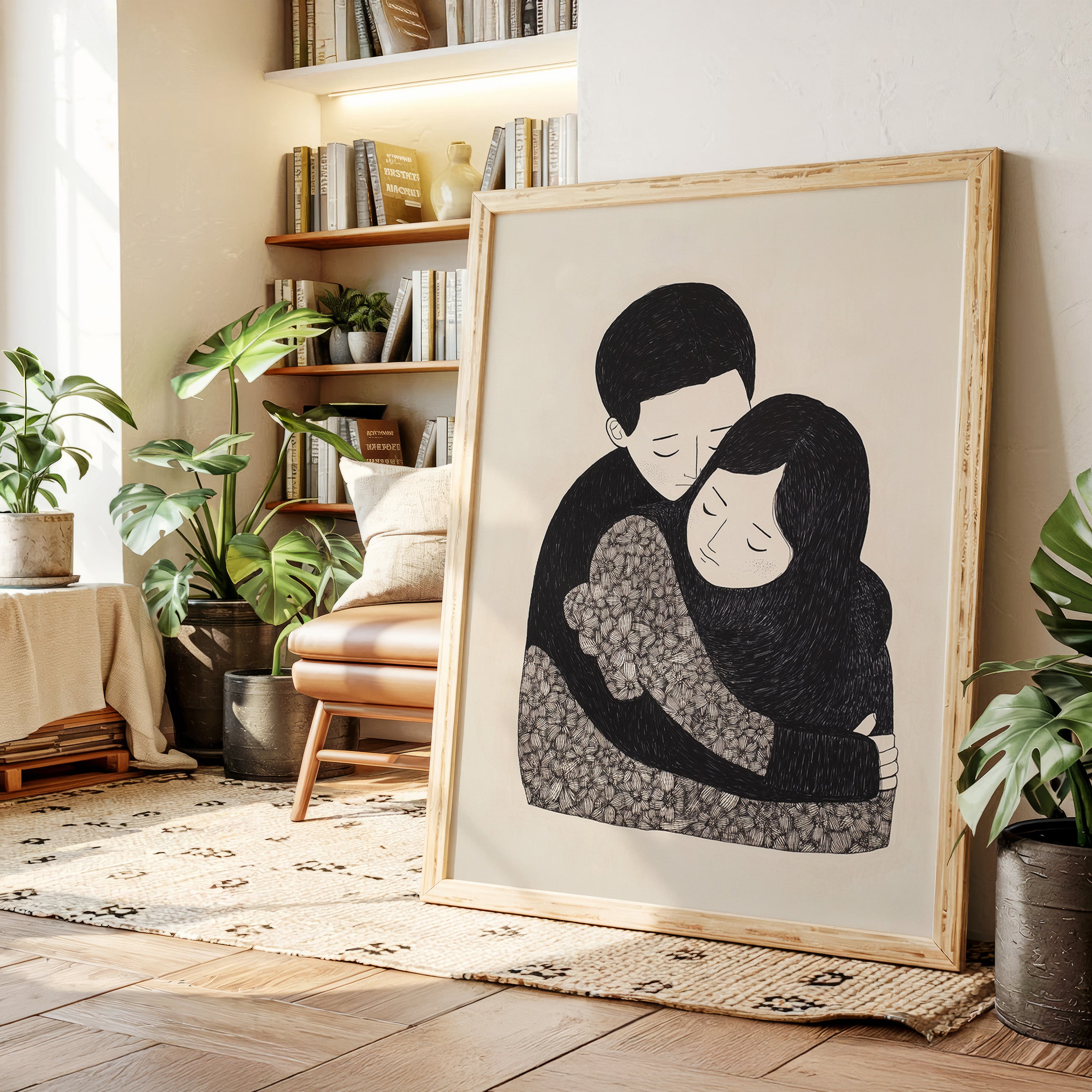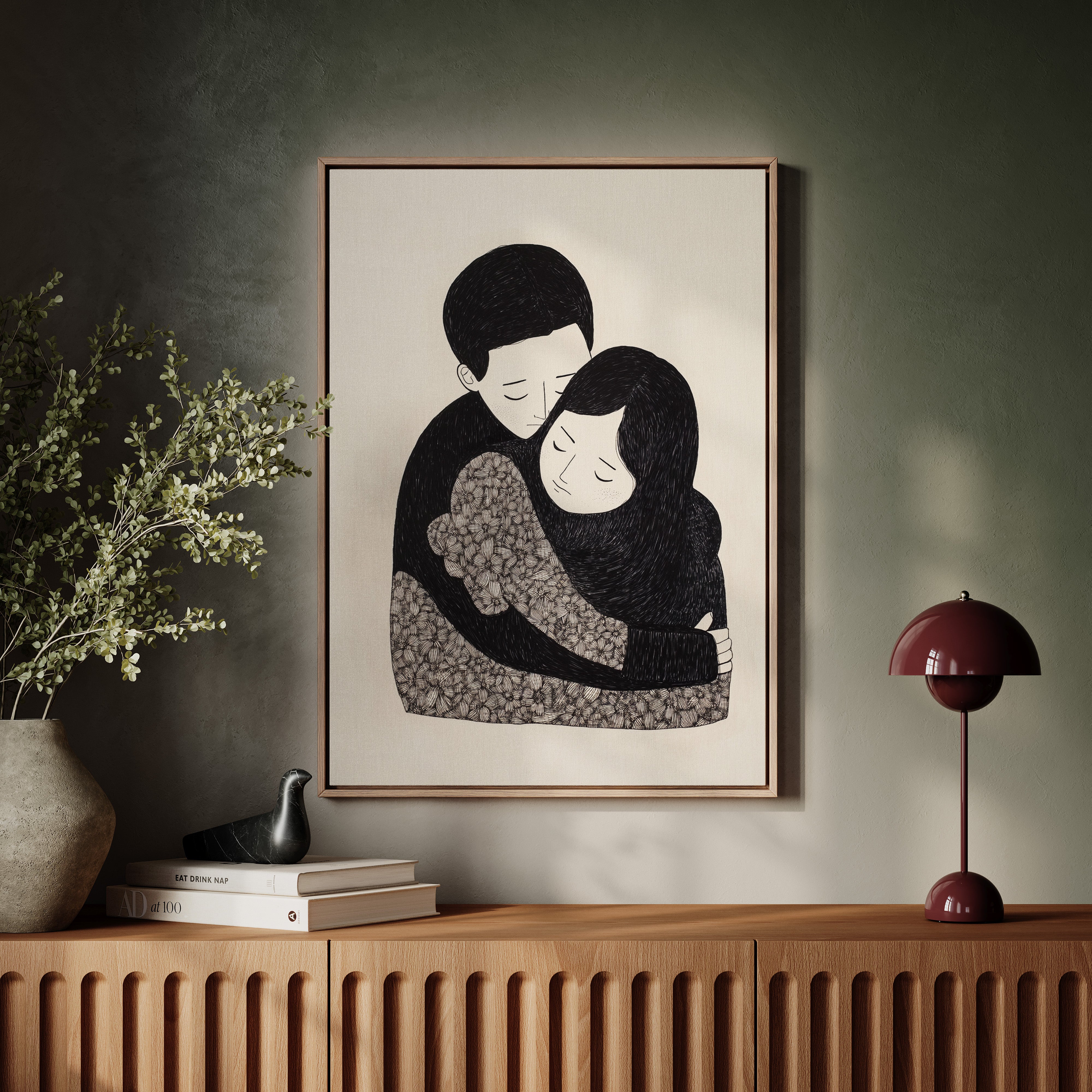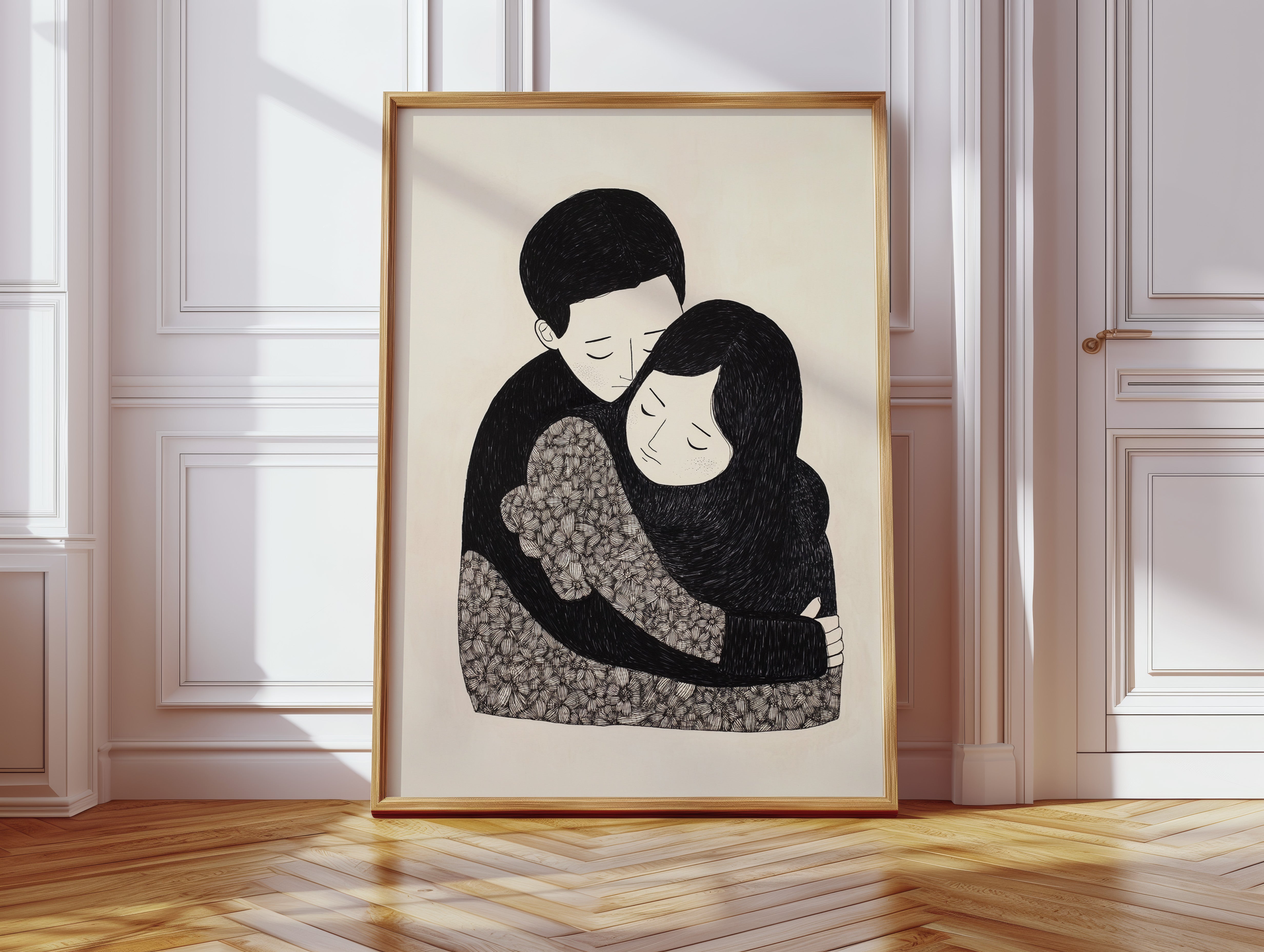 In the gentle stillness of a shared moment, two figures find solace in each other's presence. The stark contrast of black lines against cream creates an intimate portrait, while delicate floral patterns weave through their embrace like memories made tangible. Their closed eyes and peaceful expressions speak of complete trust and understanding, captured in a minimalist style that emphasizes emotional connection over detail. This piece would bring a touch of tender storytelling to a bedroom or reading nook, where its quiet beauty can be appreciated in moments of reflection.