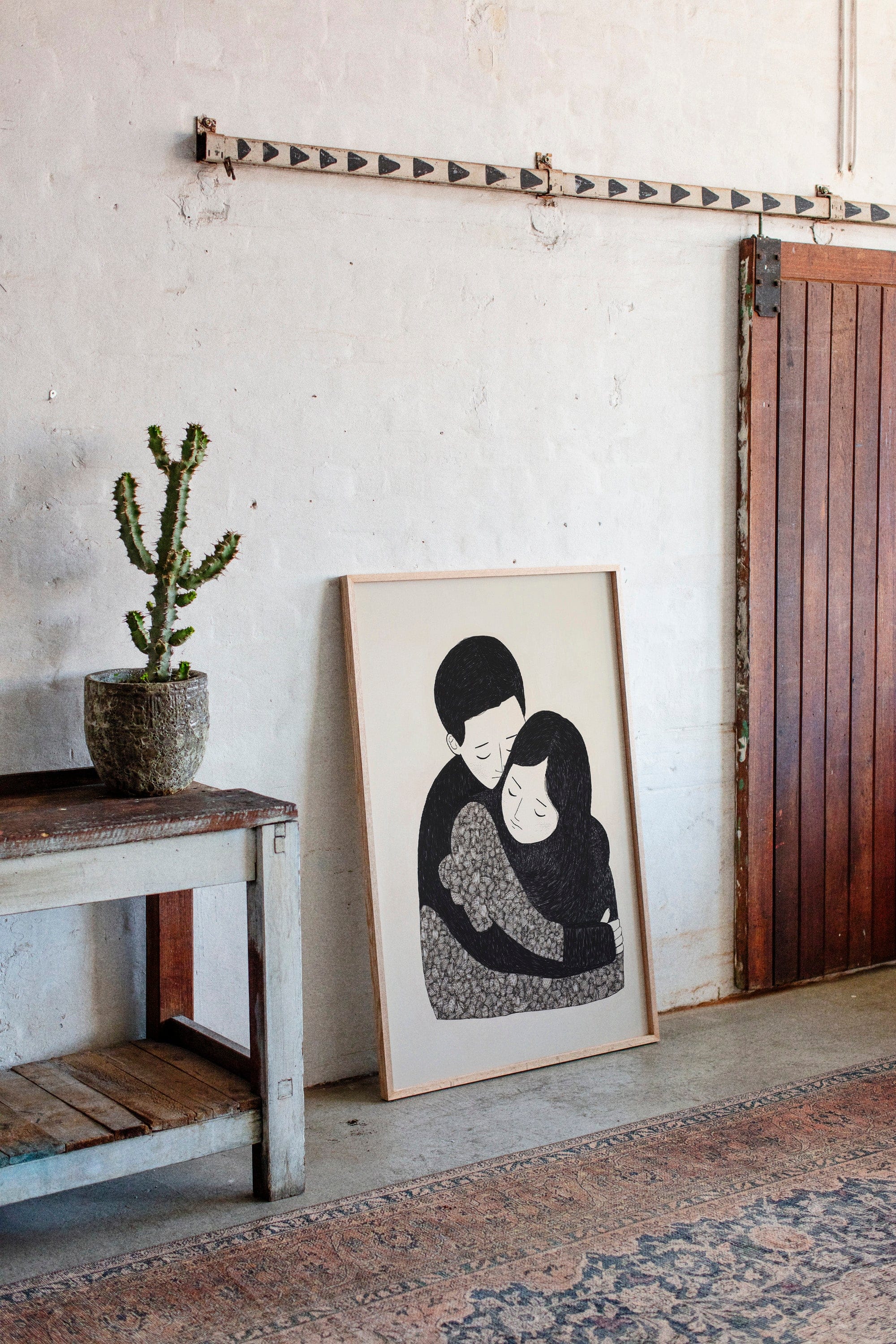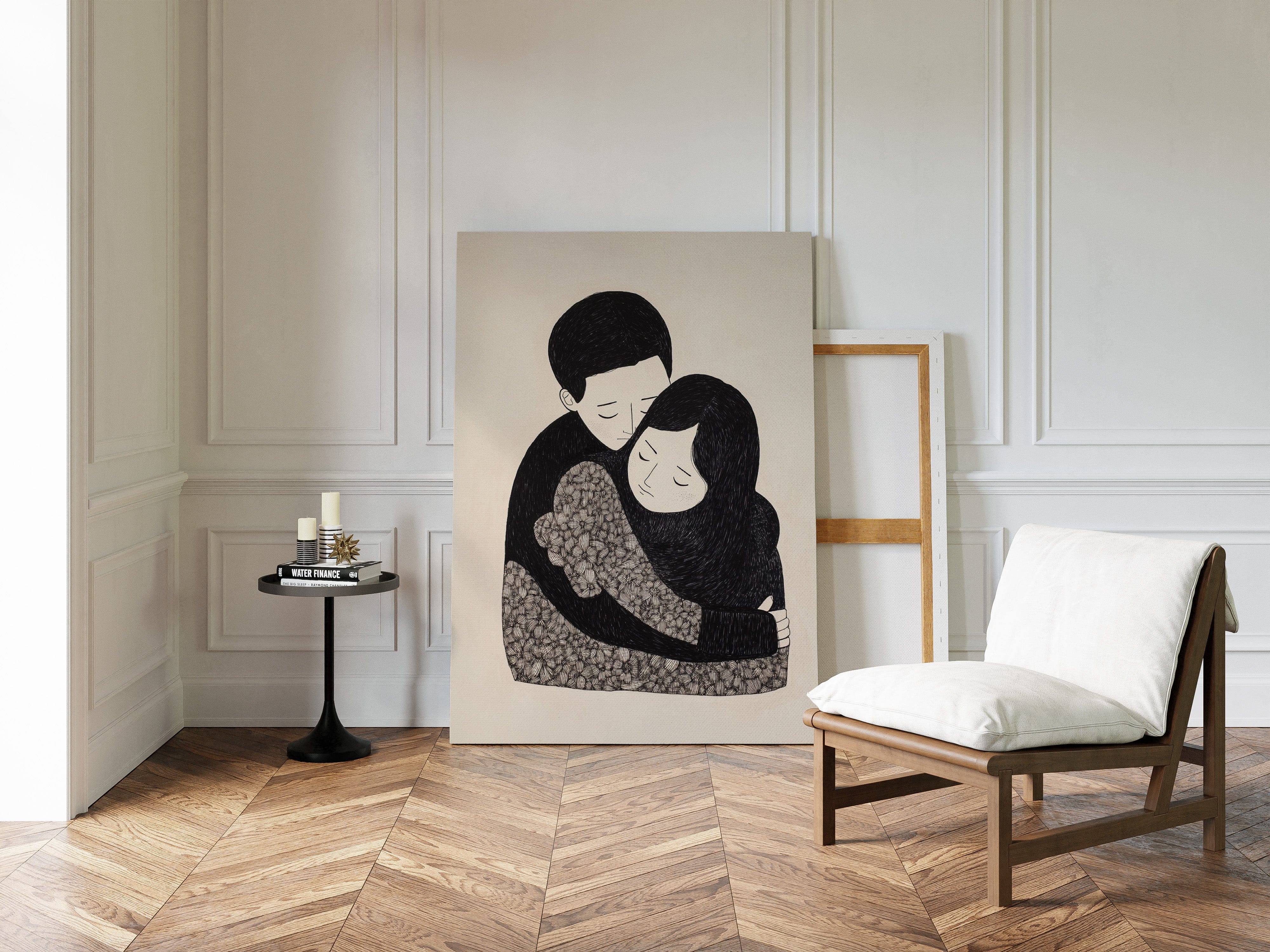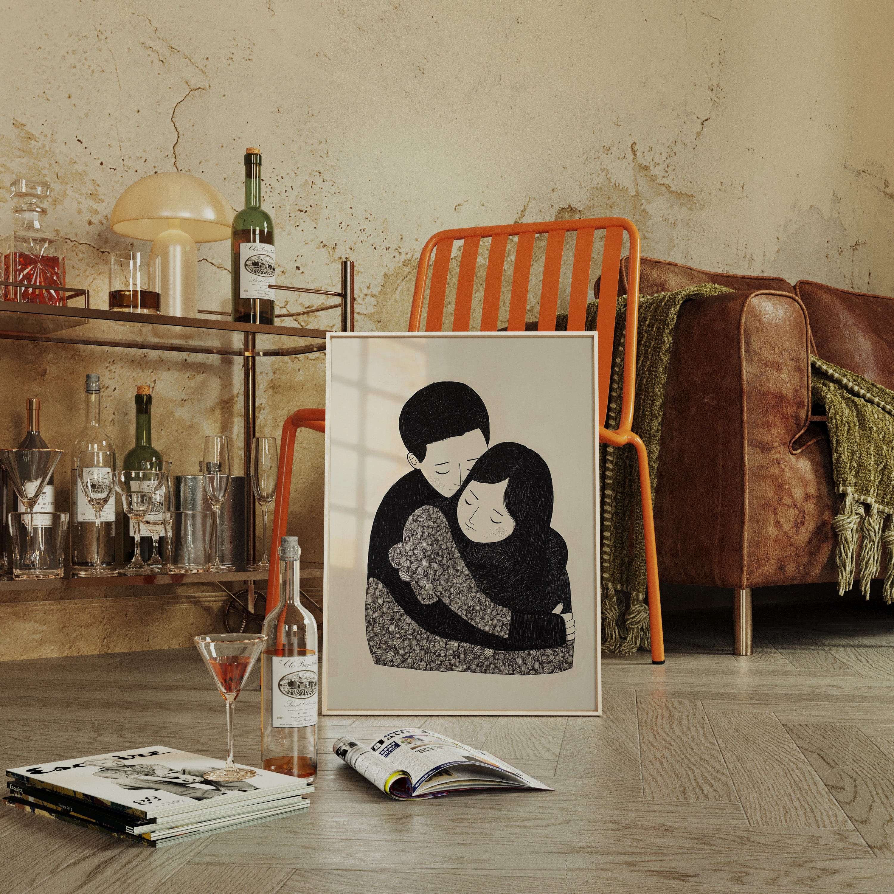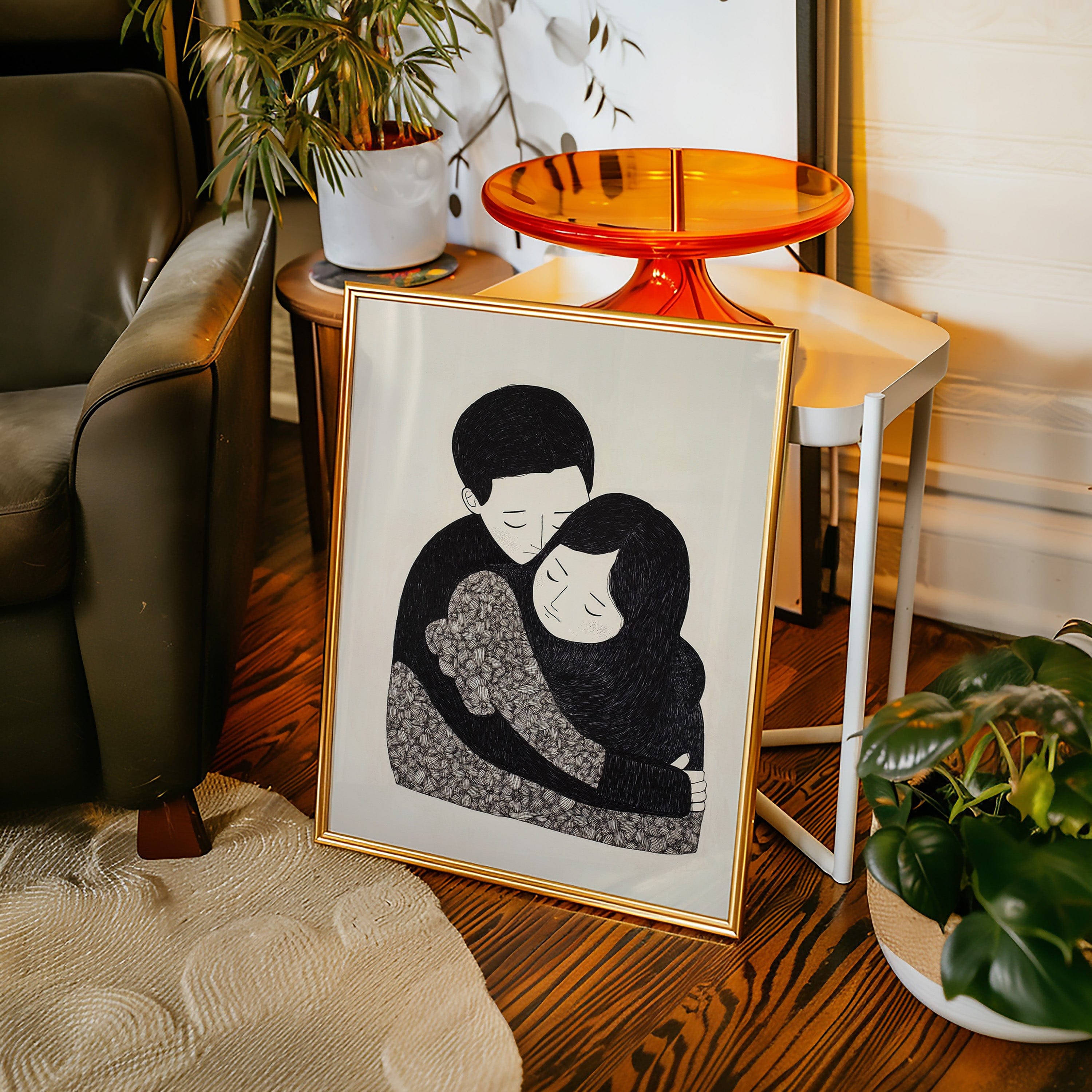 In the gentle stillness of a shared moment, two figures find solace in each other's presence. The stark contrast of black lines against cream creates an intimate portrait, while delicate floral patterns weave through their embrace like memories made tangible. Their closed eyes and peaceful expressions speak of complete trust and understanding, captured in a minimalist style that emphasizes emotional connection over detail. This piece would bring a touch of tender storytelling to a bedroom or reading nook, where its quiet beauty can be appreciated in moments of reflection.