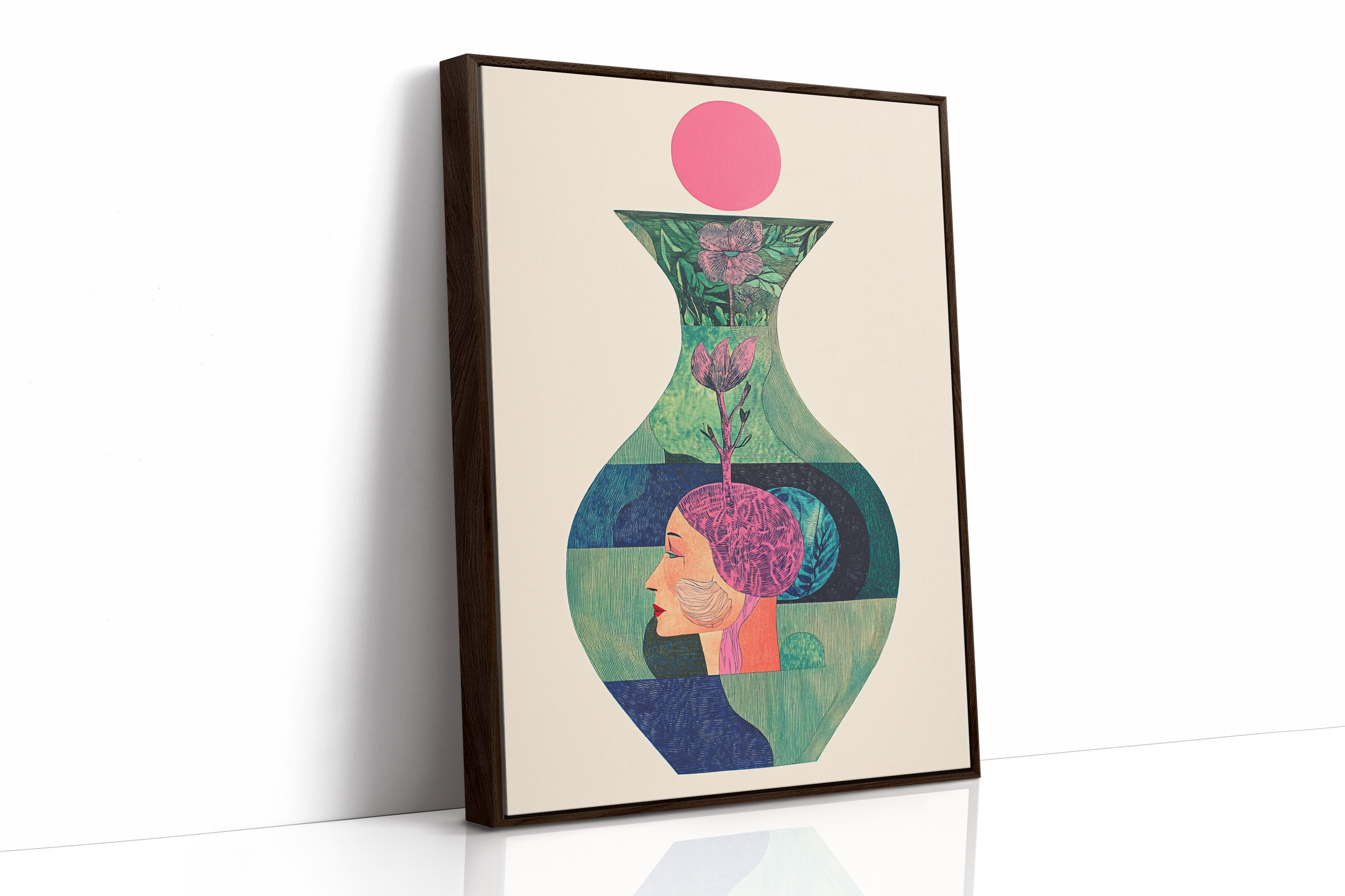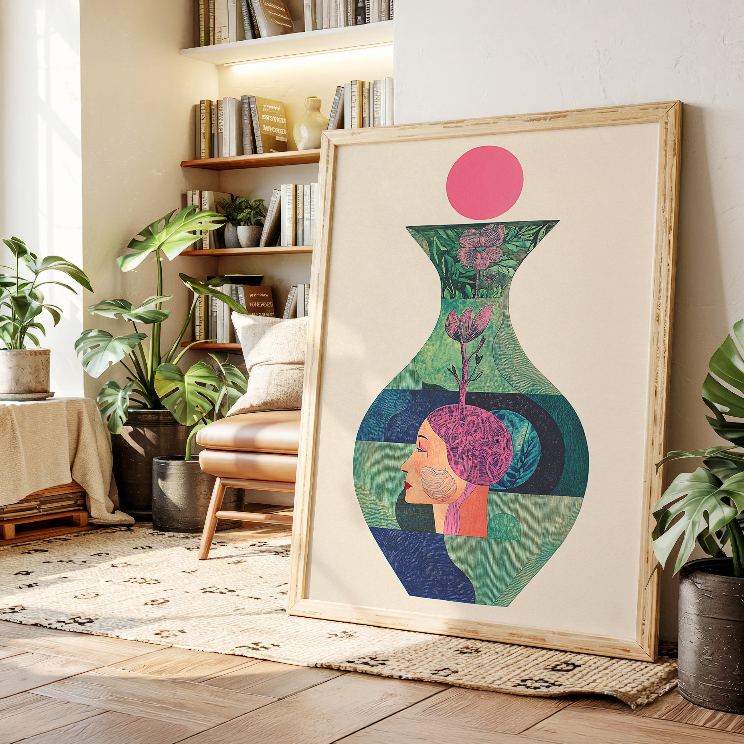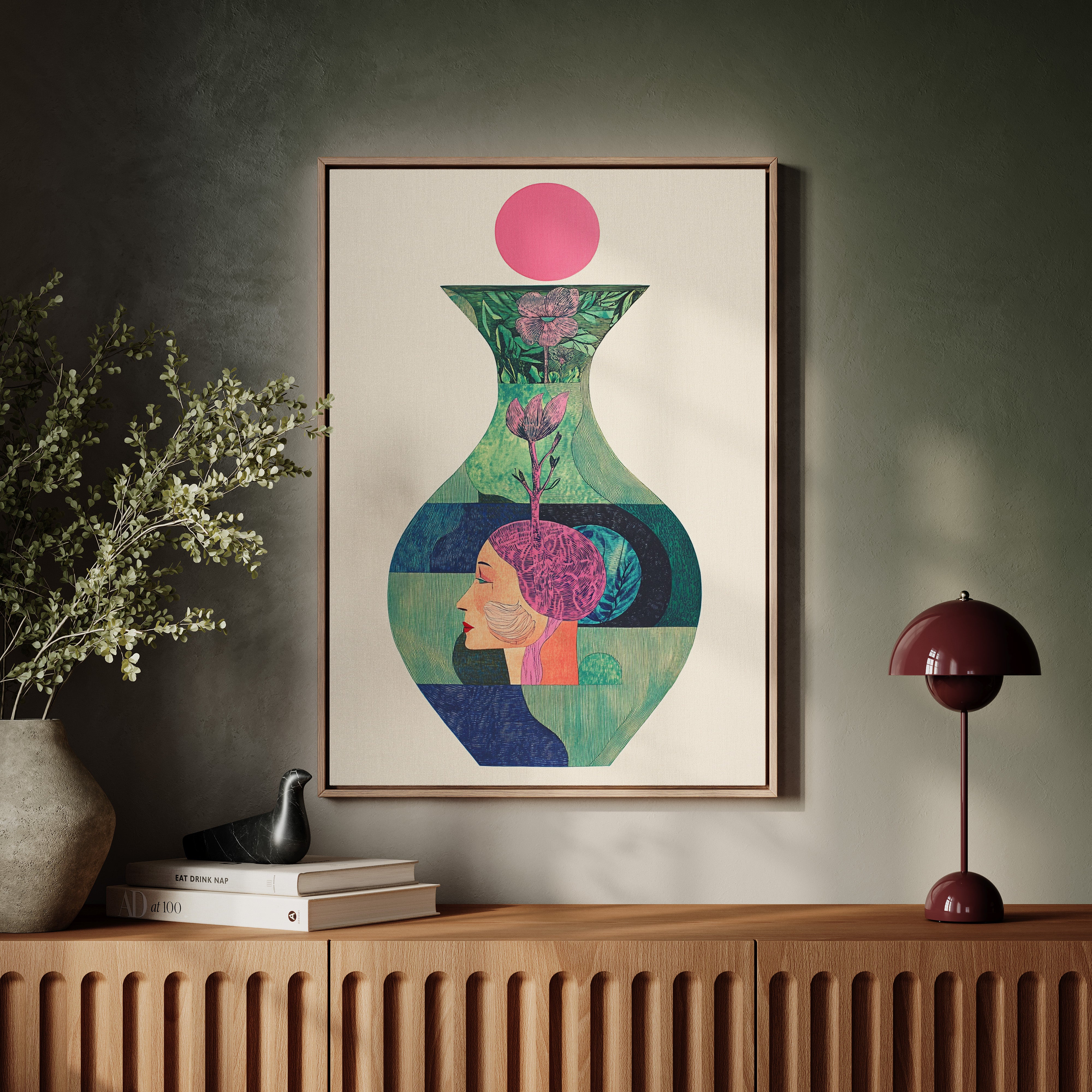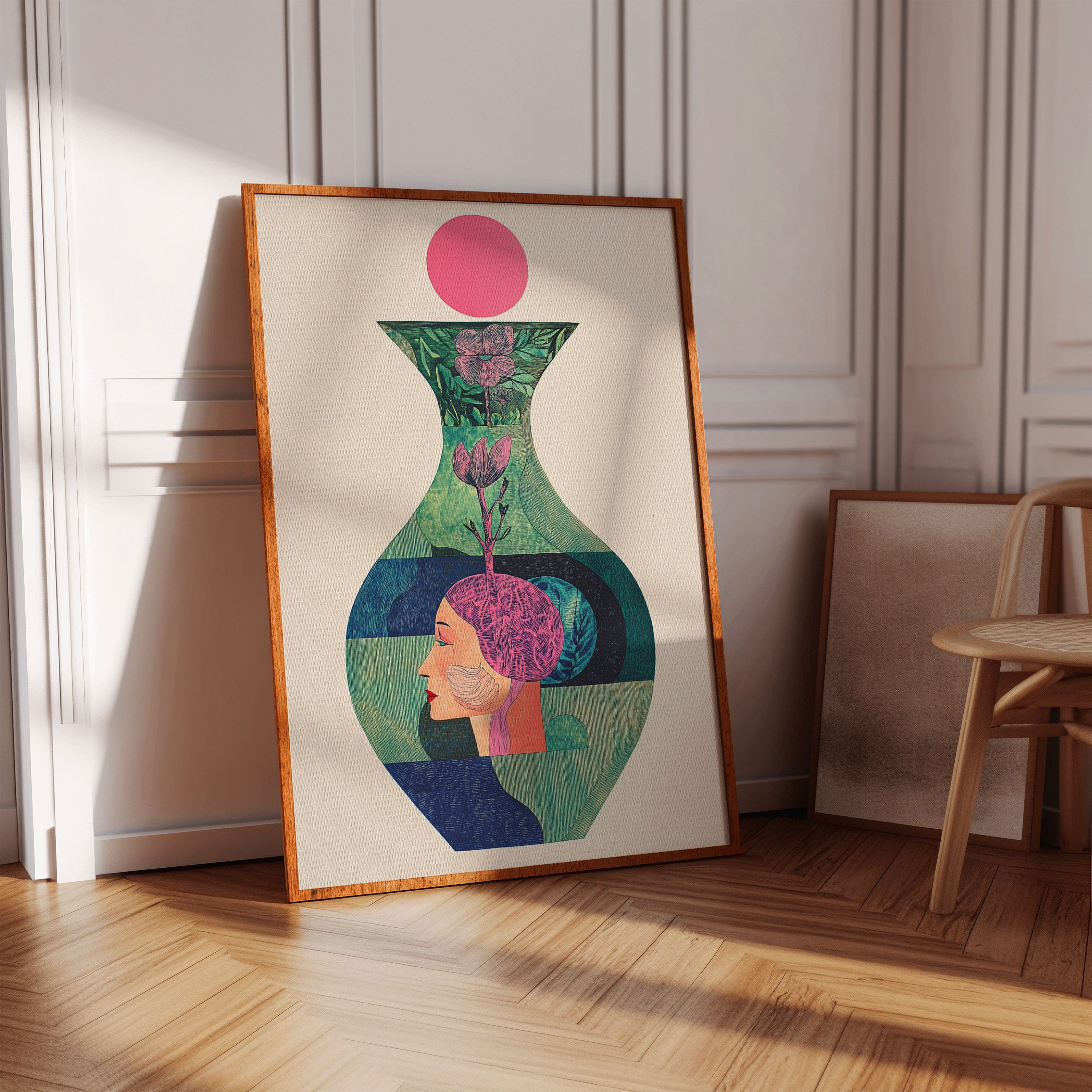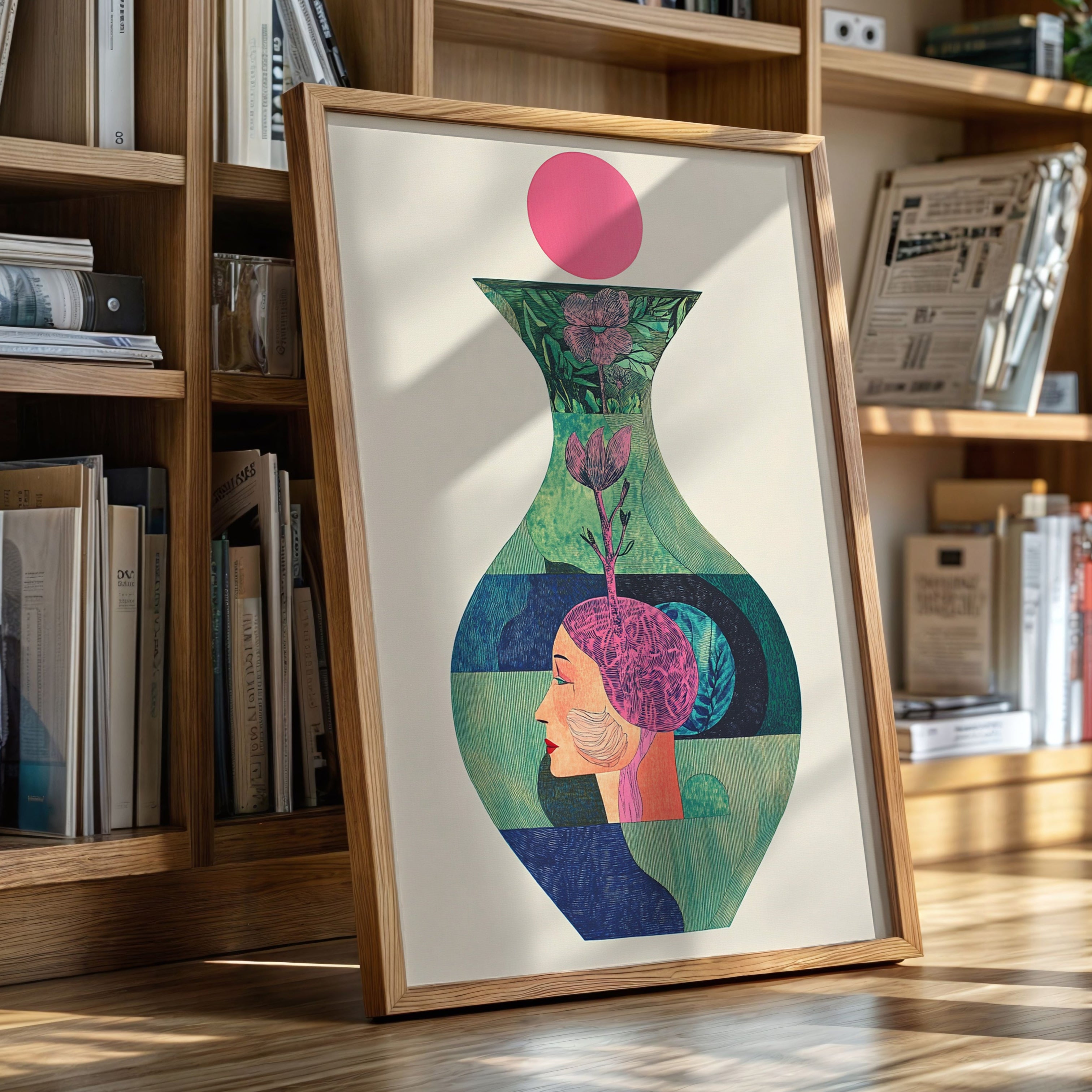 A surreal fusion of feminine grace and botanical wonder unfolds within the curves of an elegant vase. The profile of a woman emerges in coral tones, her thoughts blooming into delicate pink flowers that reach toward an ethereal rose-colored moon. Deep emerald foliage and navy geometric patterns create a modernist landscape, where nature and human consciousness intertwine in perfect harmony. The intricate linework and thoughtful color palette speak to both Japanese woodblock traditions and contemporary design sensibilities. This piece would bring a sophisticated yet whimsical energy to a reading nook, meditation space, or creative studio.