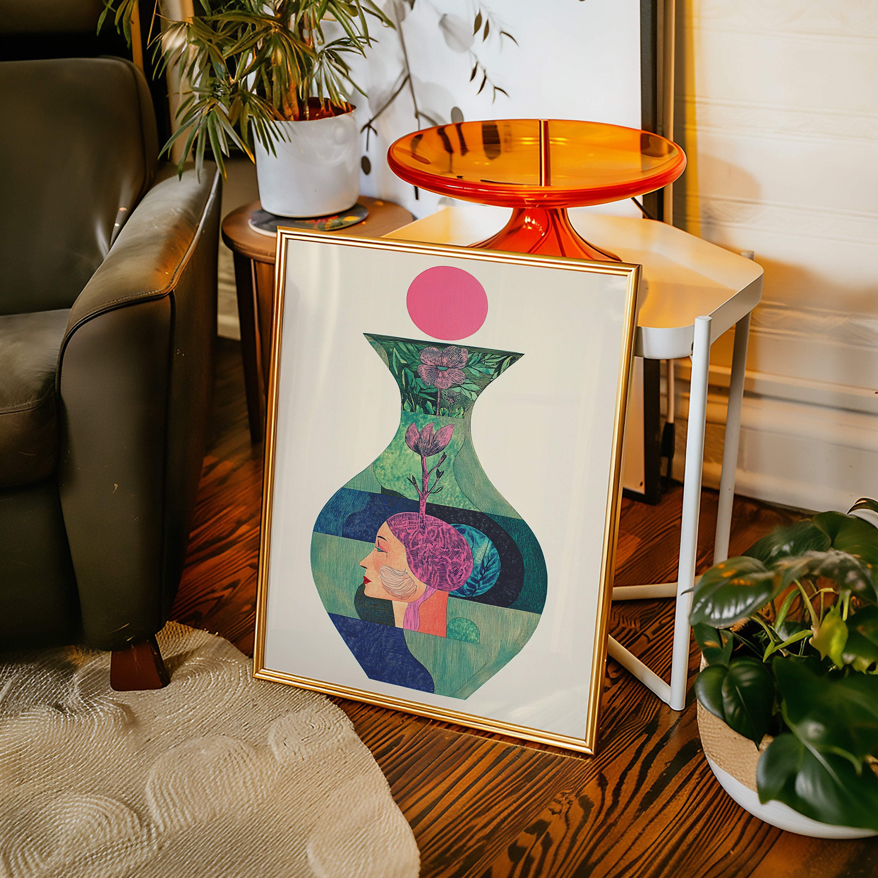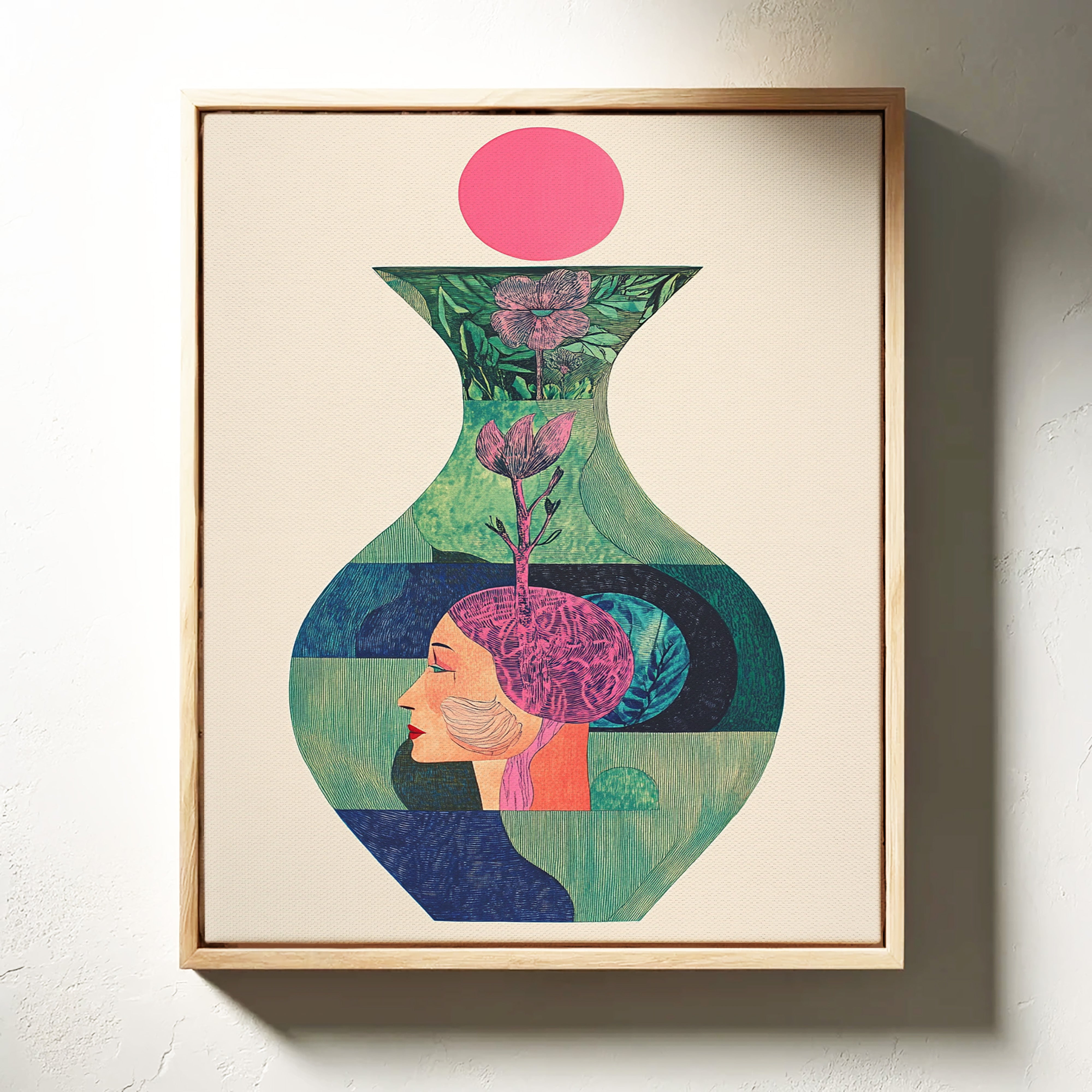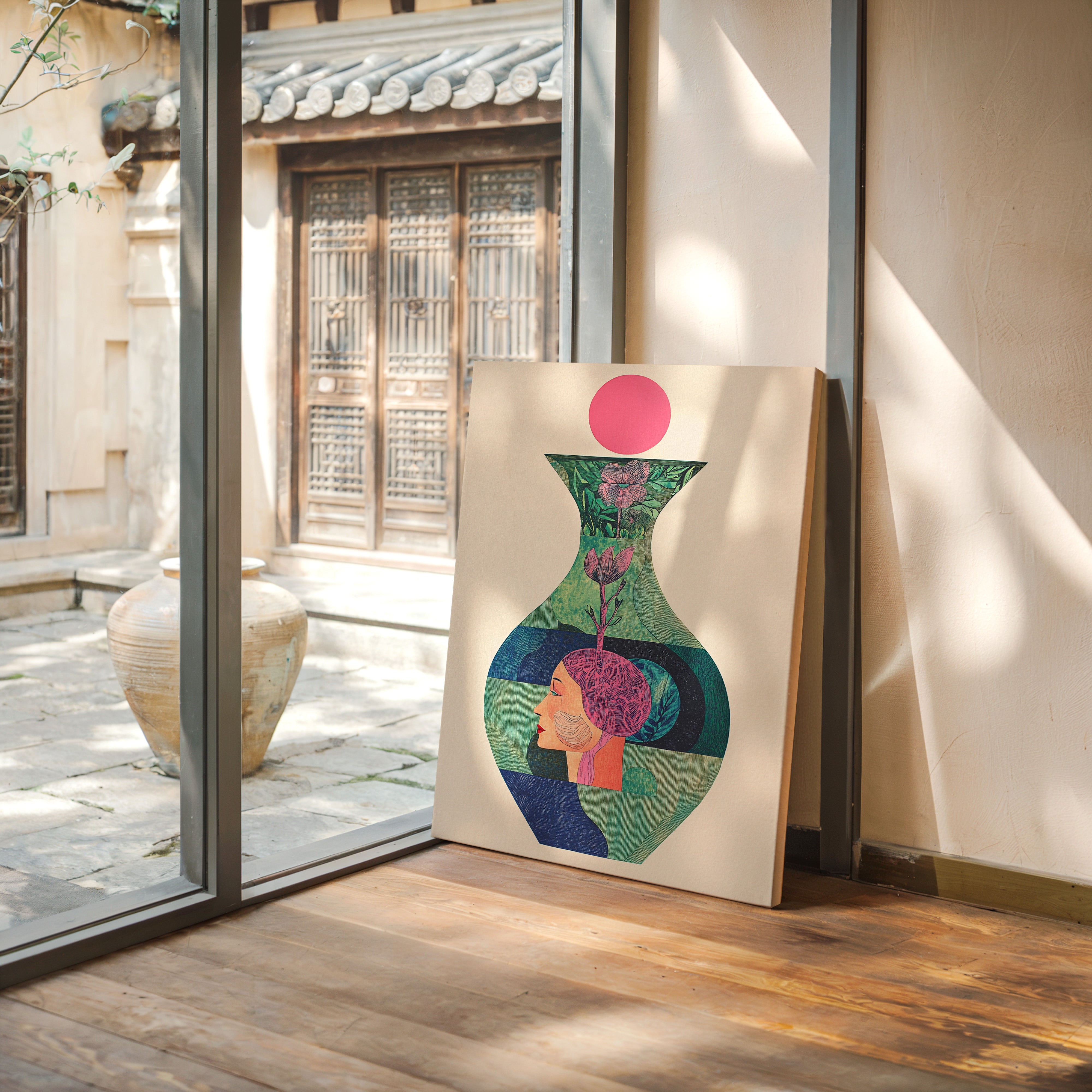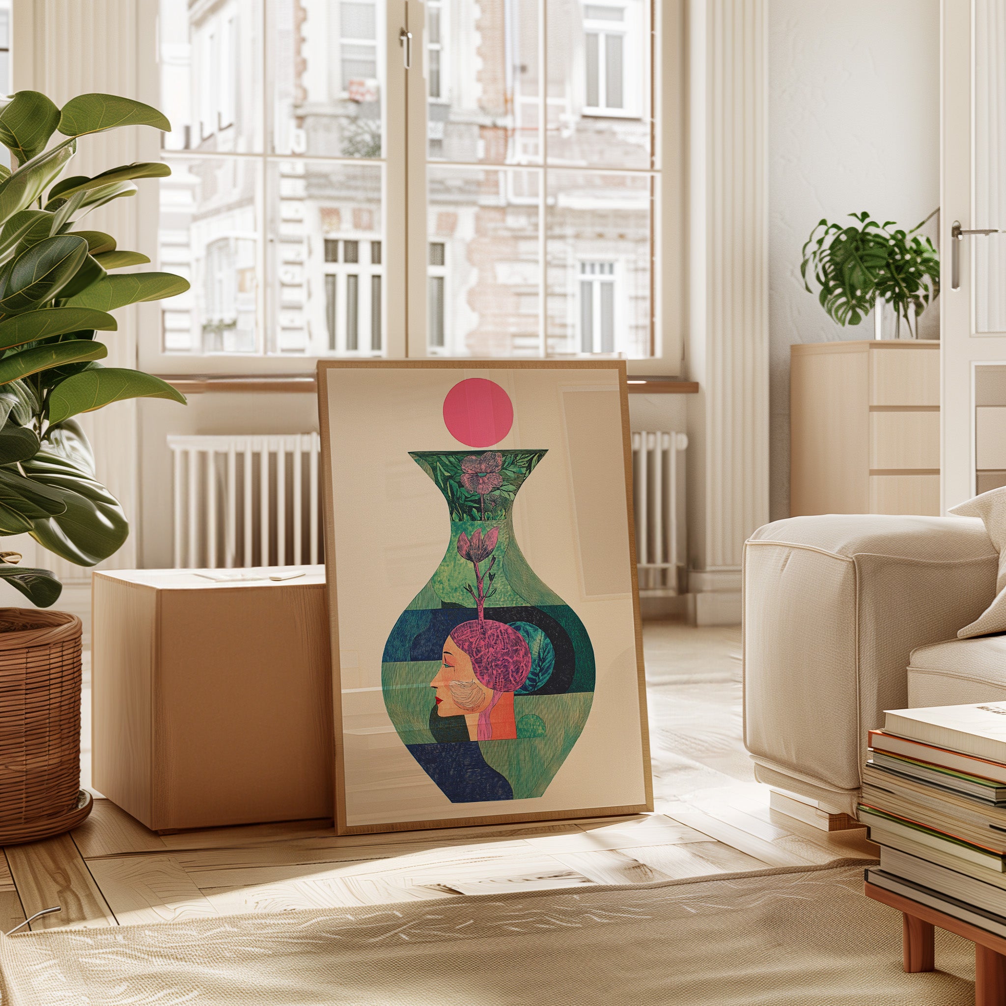 A surreal fusion of feminine grace and botanical wonder unfolds within the curves of an elegant vase. The profile of a woman emerges in coral tones, her thoughts blooming into delicate pink flowers that reach toward an ethereal rose-colored moon. Deep emerald foliage and navy geometric patterns create a modernist landscape, where nature and human consciousness intertwine in perfect harmony. The intricate linework and thoughtful color palette speak to both Japanese woodblock traditions and contemporary design sensibilities. This piece would bring a sophisticated yet whimsical energy to a reading nook, meditation space, or creative studio.