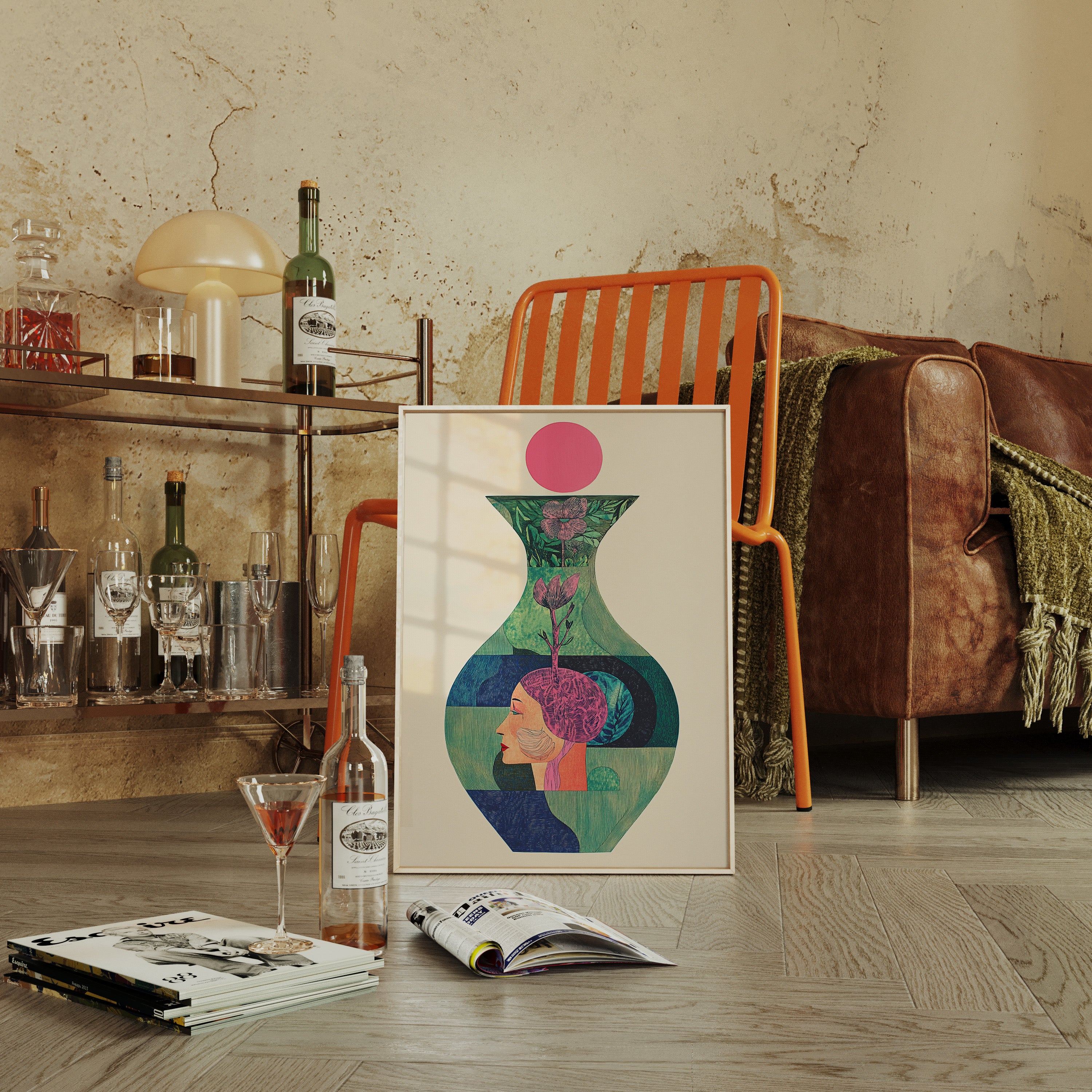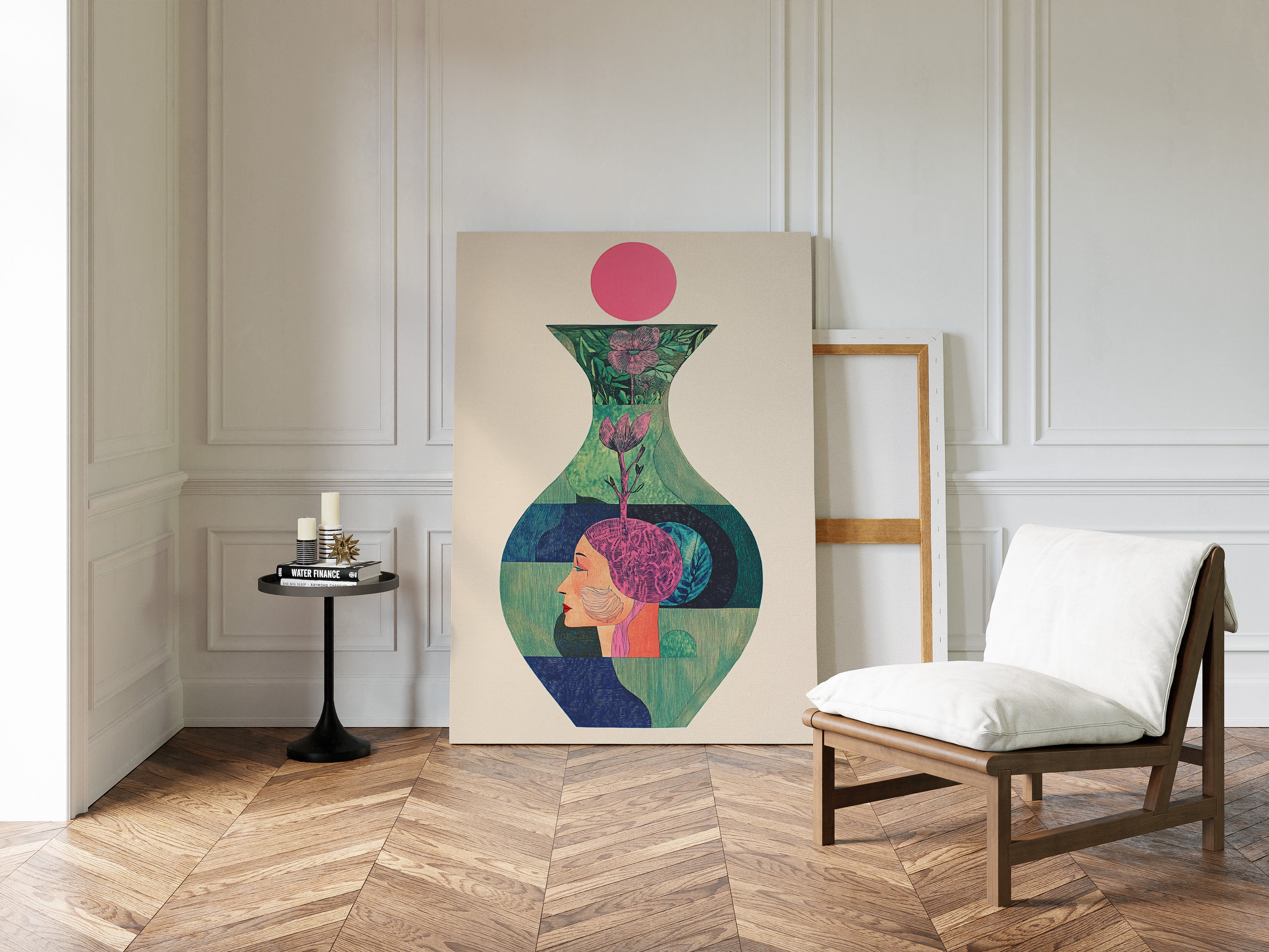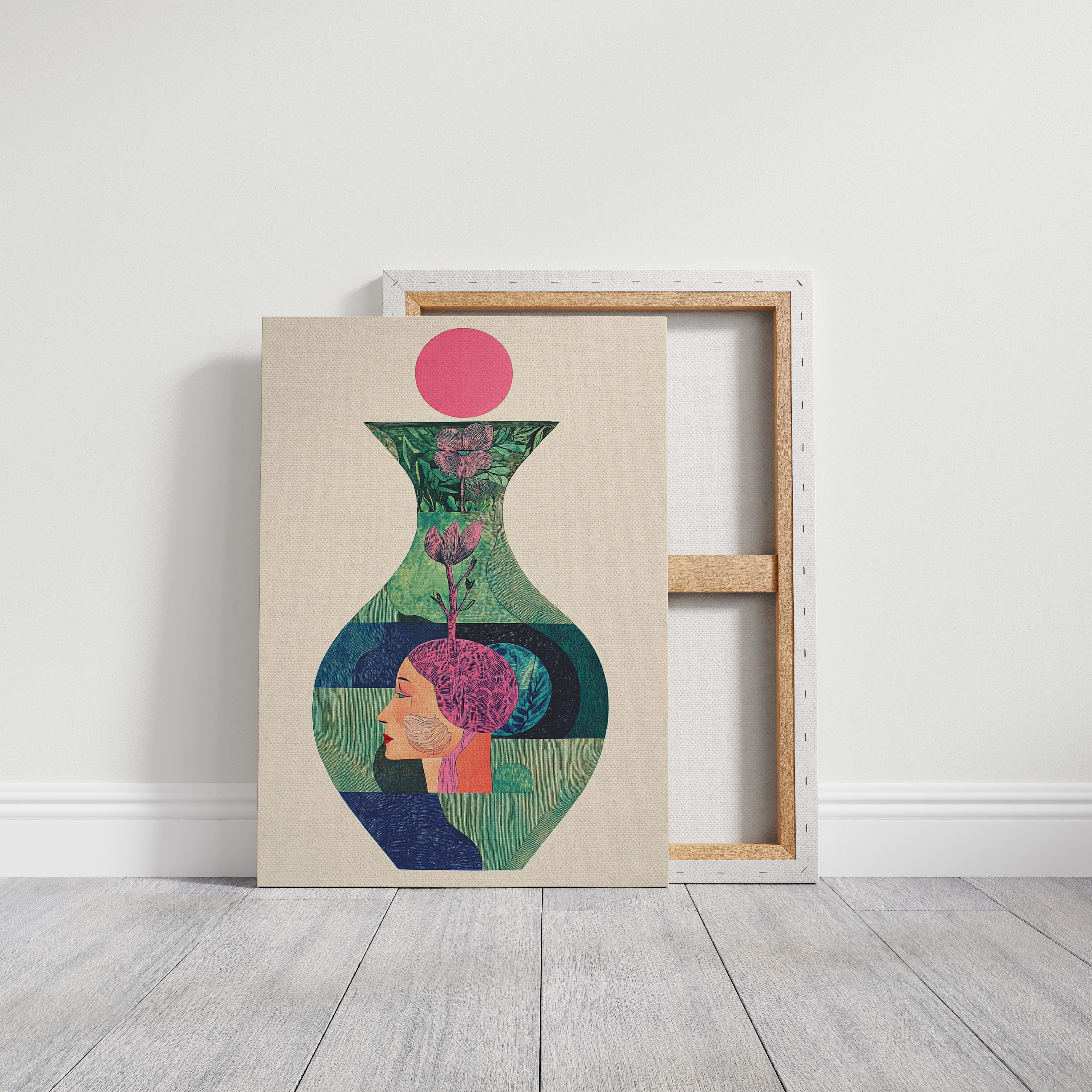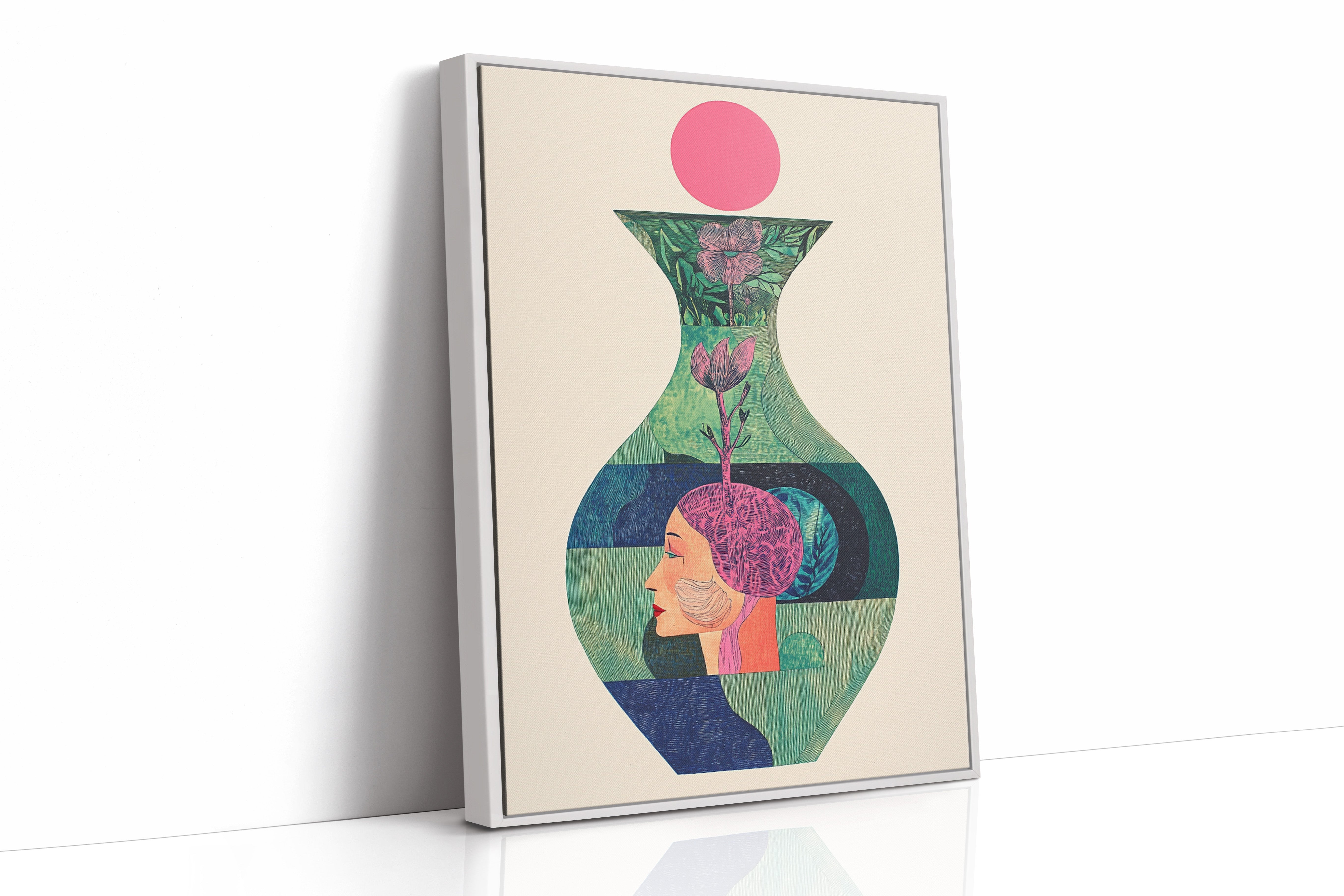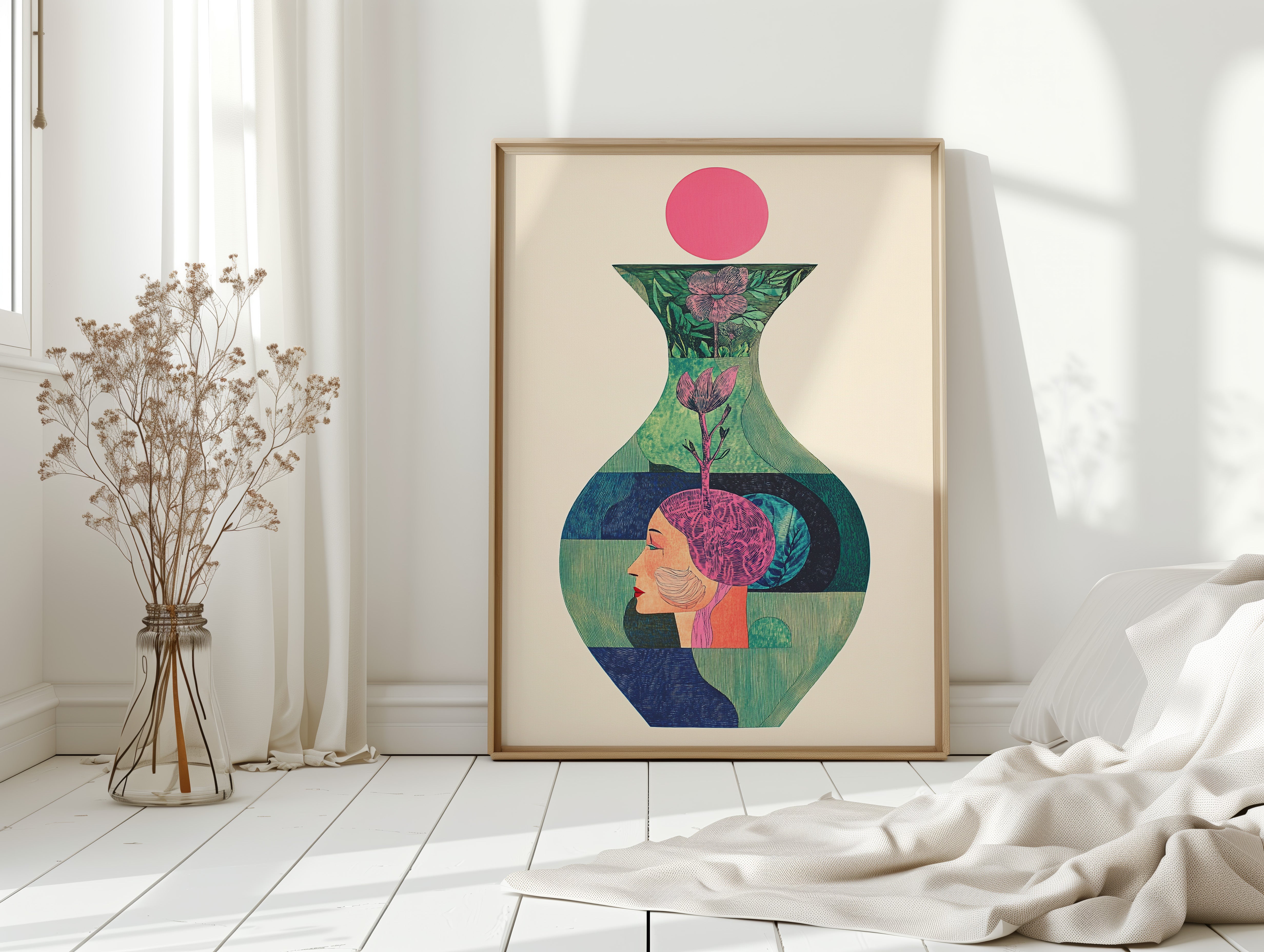 A surreal fusion of feminine grace and botanical wonder unfolds within the curves of an elegant vase. The profile of a woman emerges in coral tones, her thoughts blooming into delicate pink flowers that reach toward an ethereal rose-colored moon. Deep emerald foliage and navy geometric patterns create a modernist landscape, where nature and human consciousness intertwine in perfect harmony. The intricate linework and thoughtful color palette speak to both Japanese woodblock traditions and contemporary design sensibilities. This piece would bring a sophisticated yet whimsical energy to a reading nook, meditation space, or creative studio.