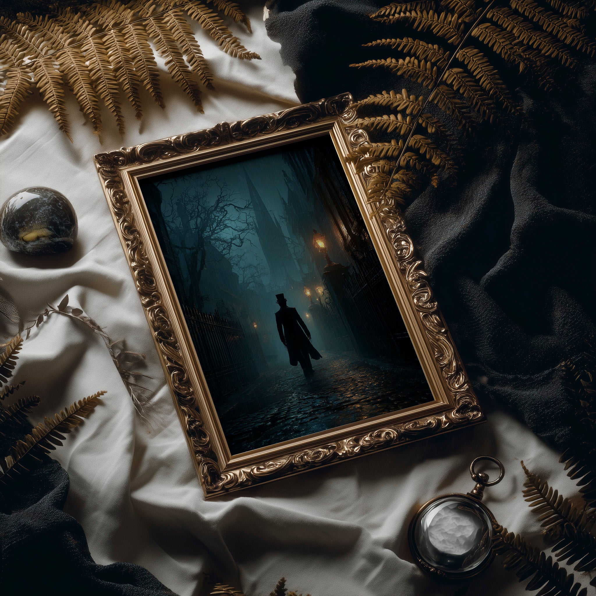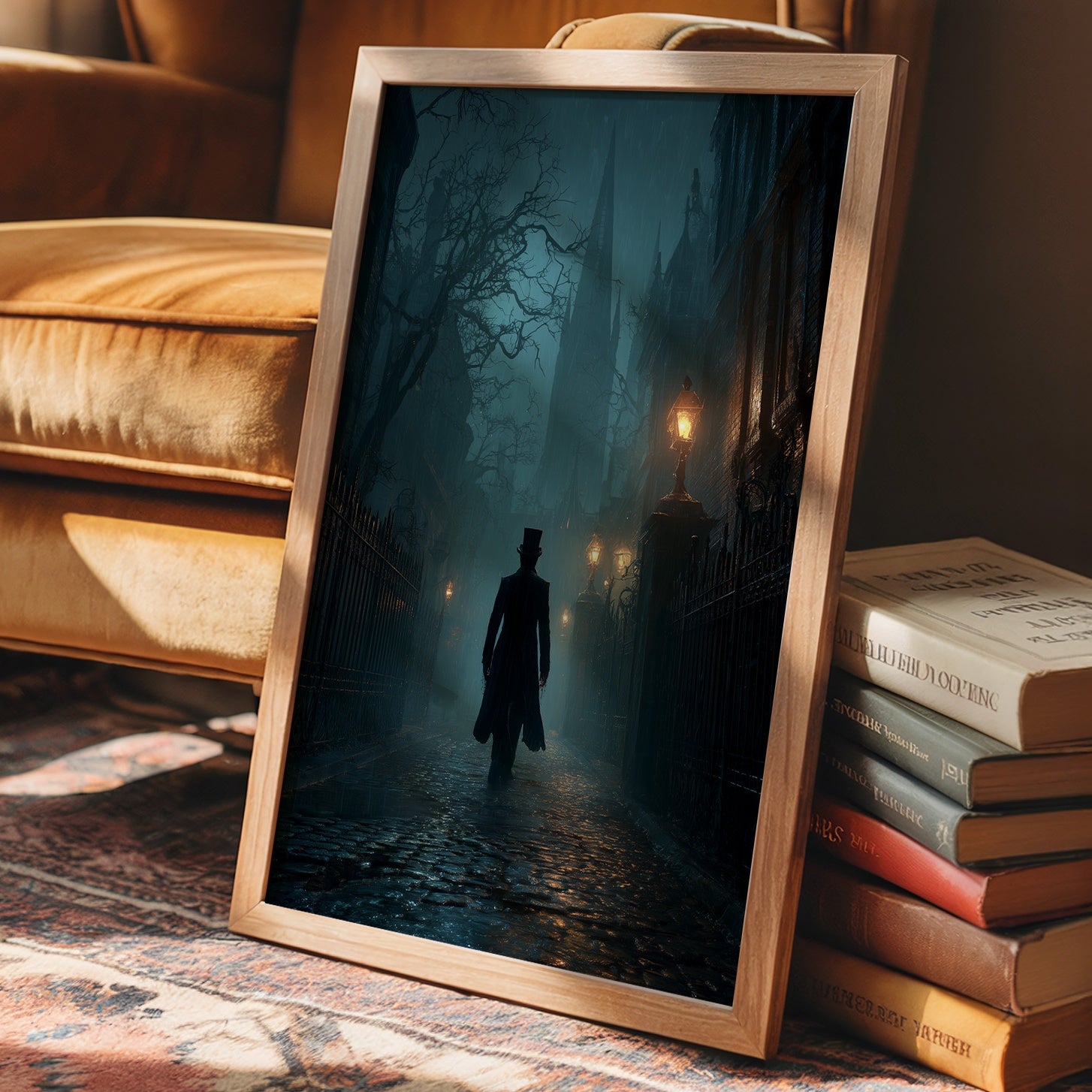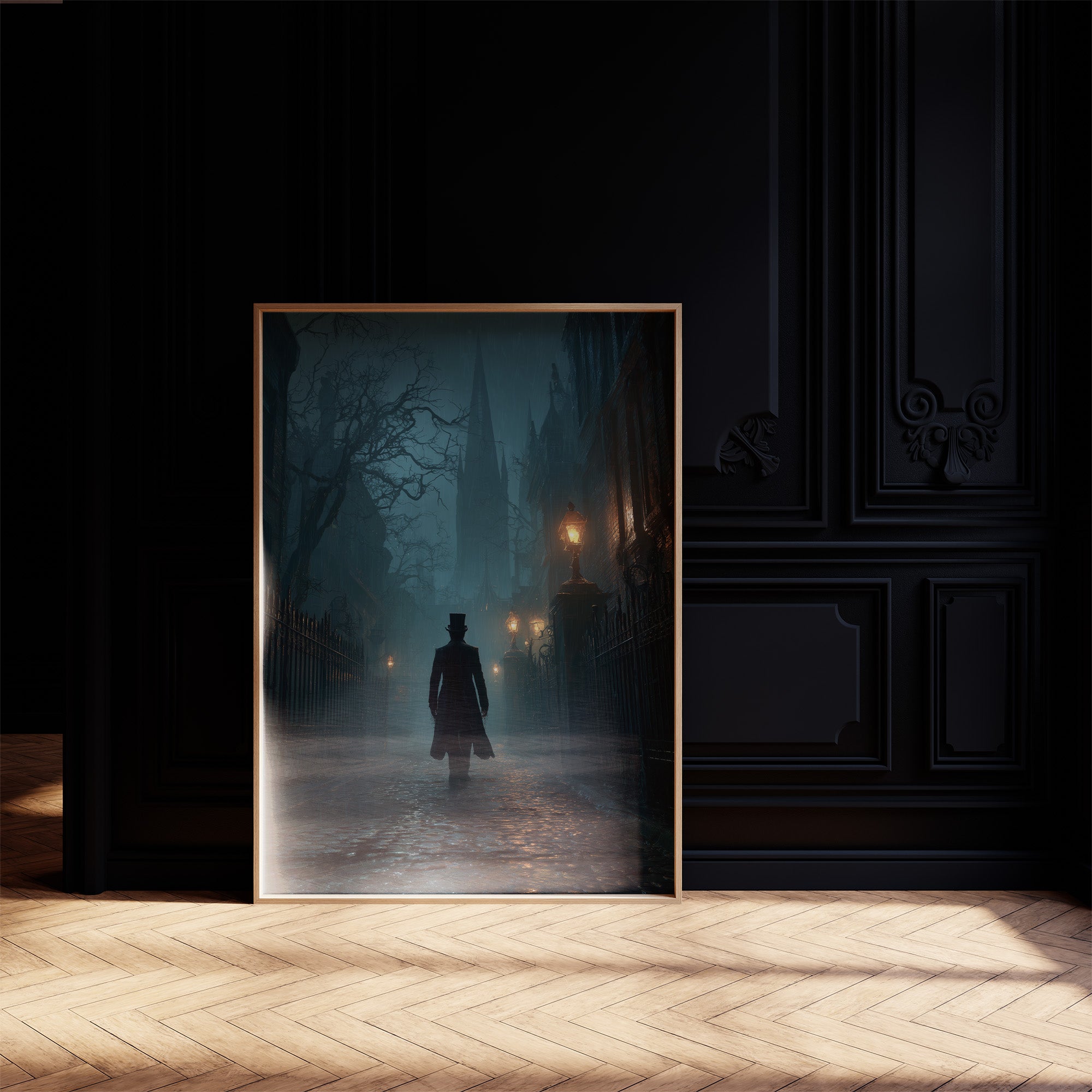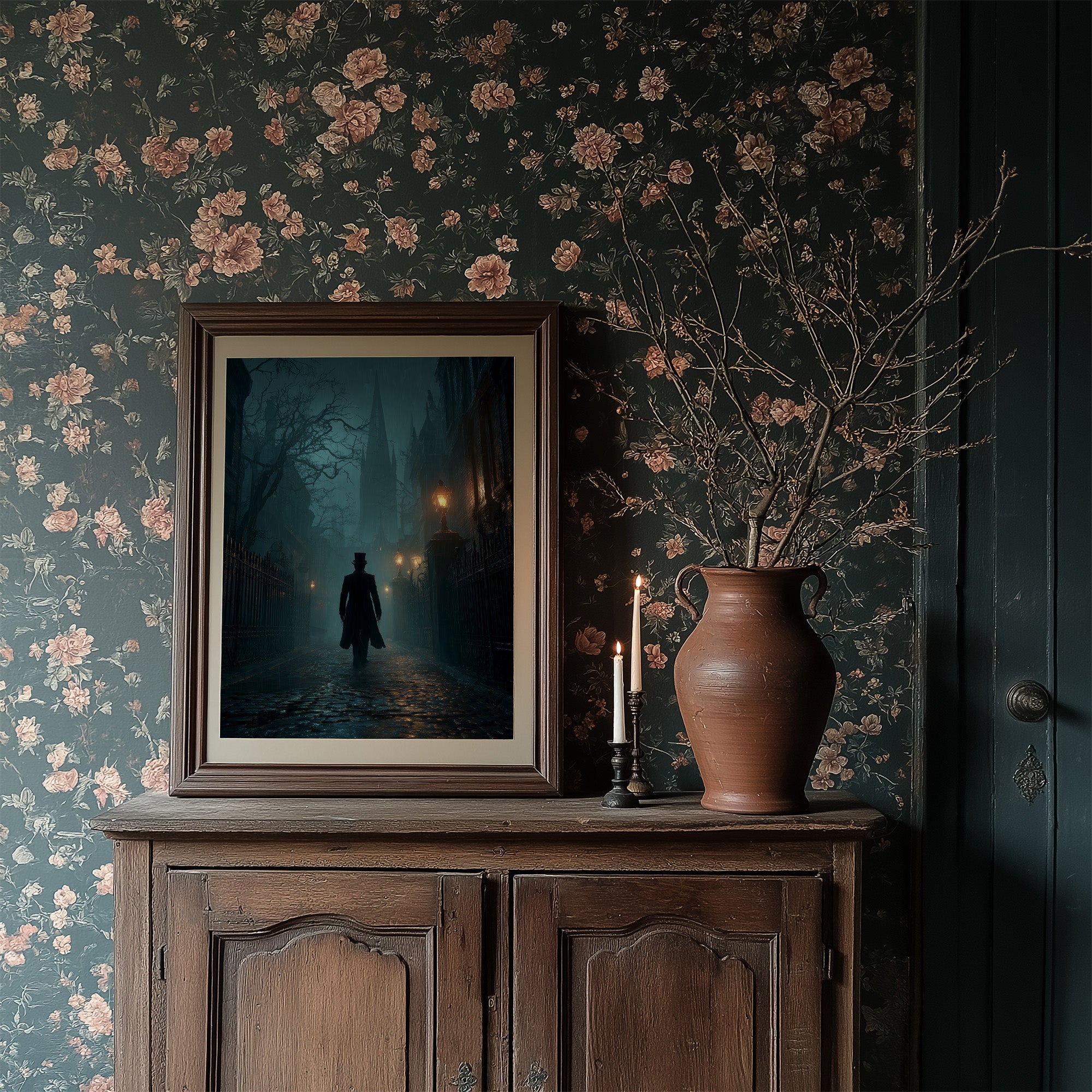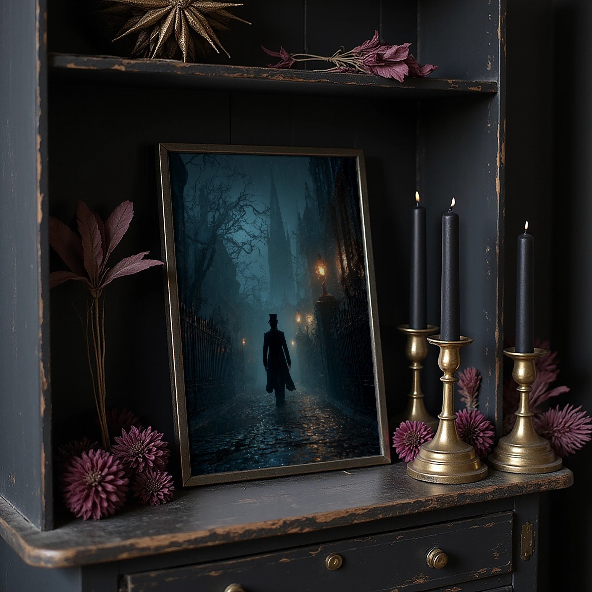 Mist swallows the cobblestone path as a solitary figure stands transfixed between worlds of light and shadow. The teal-tinged darkness wraps around gothic spires and bare branches, while golden gaslights punctuate the haze with their warm defiance. The mysterious silhouette in formal attire seems caught between advancing toward the cathedral's ghostly outline or retreating into the comfort of lamplight, creating tension in this atmospheric nocturnal scene.