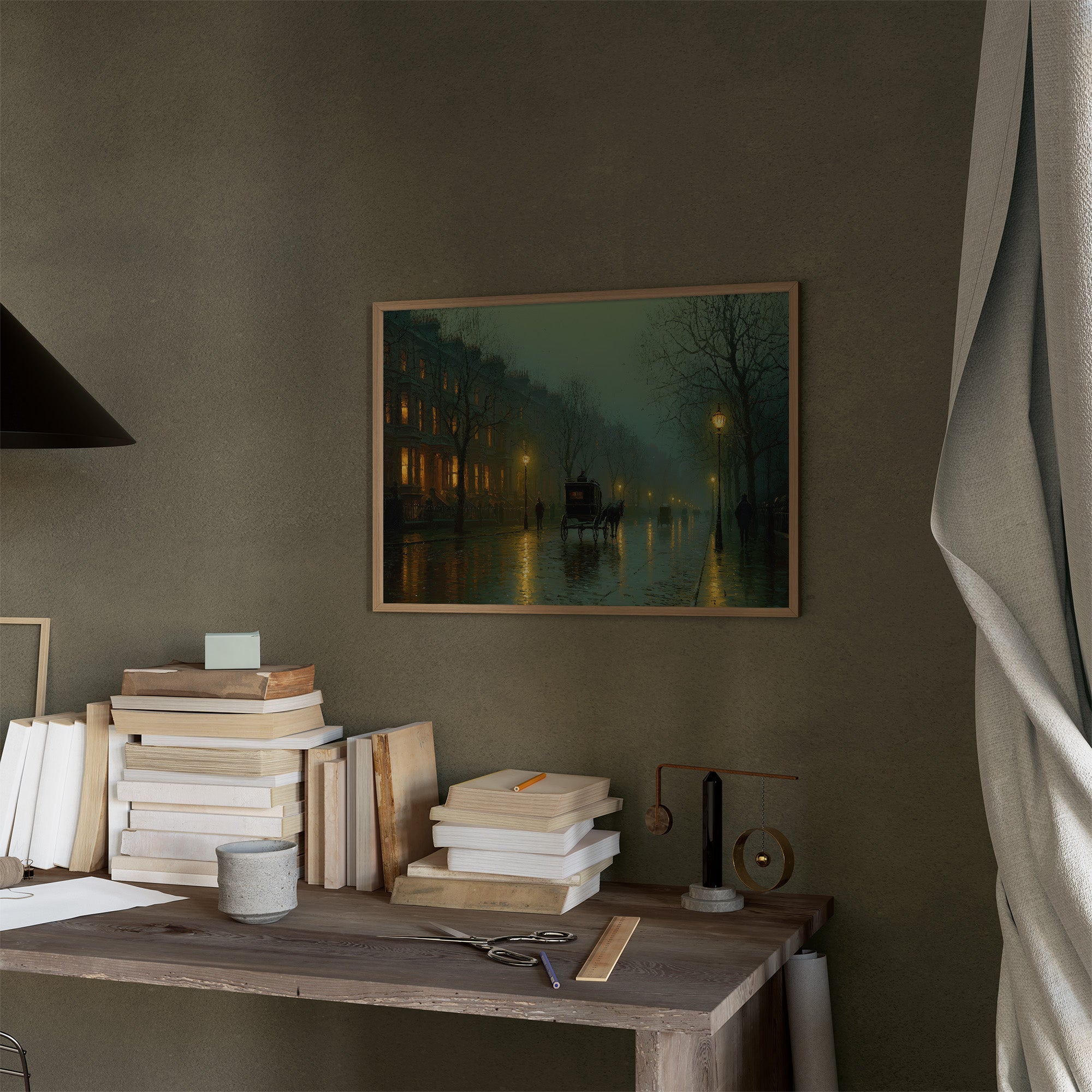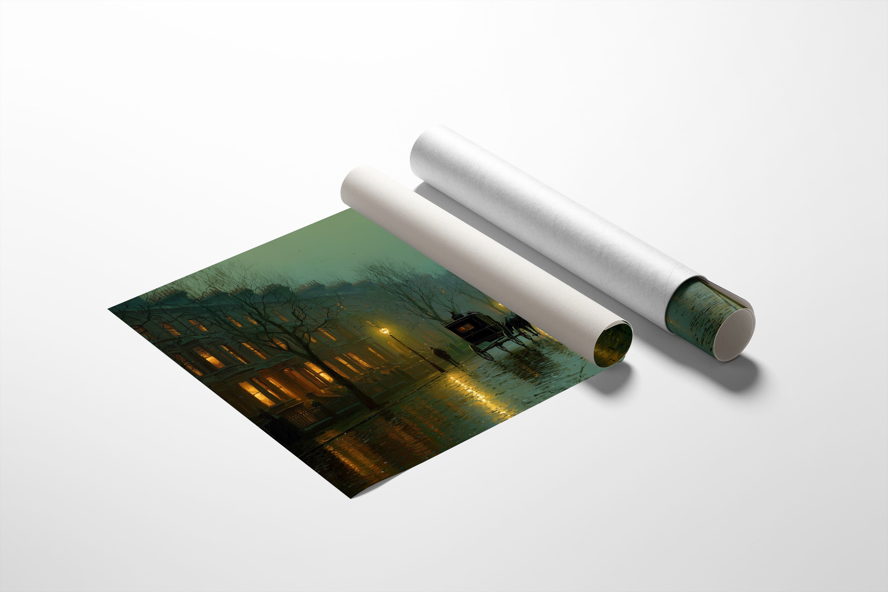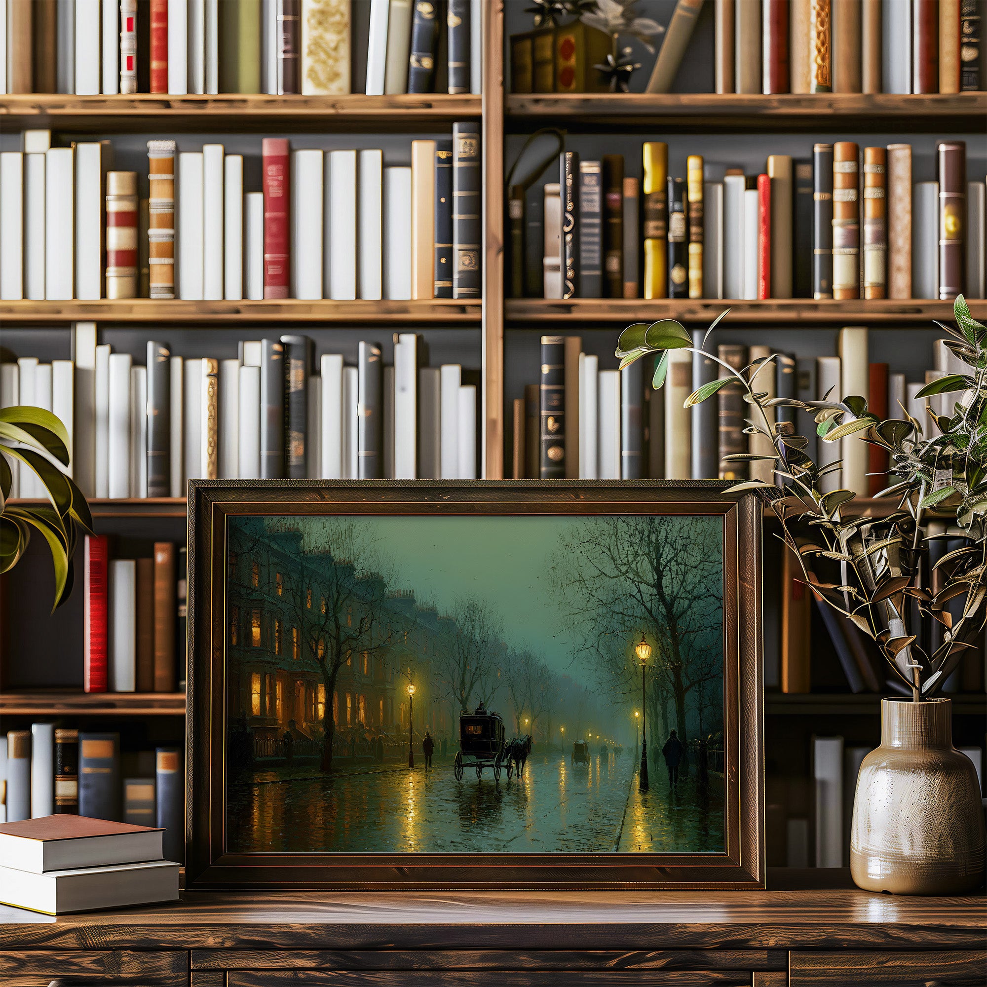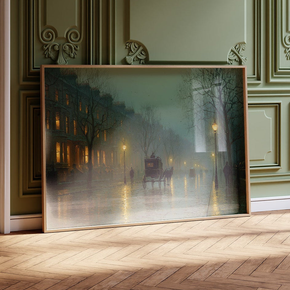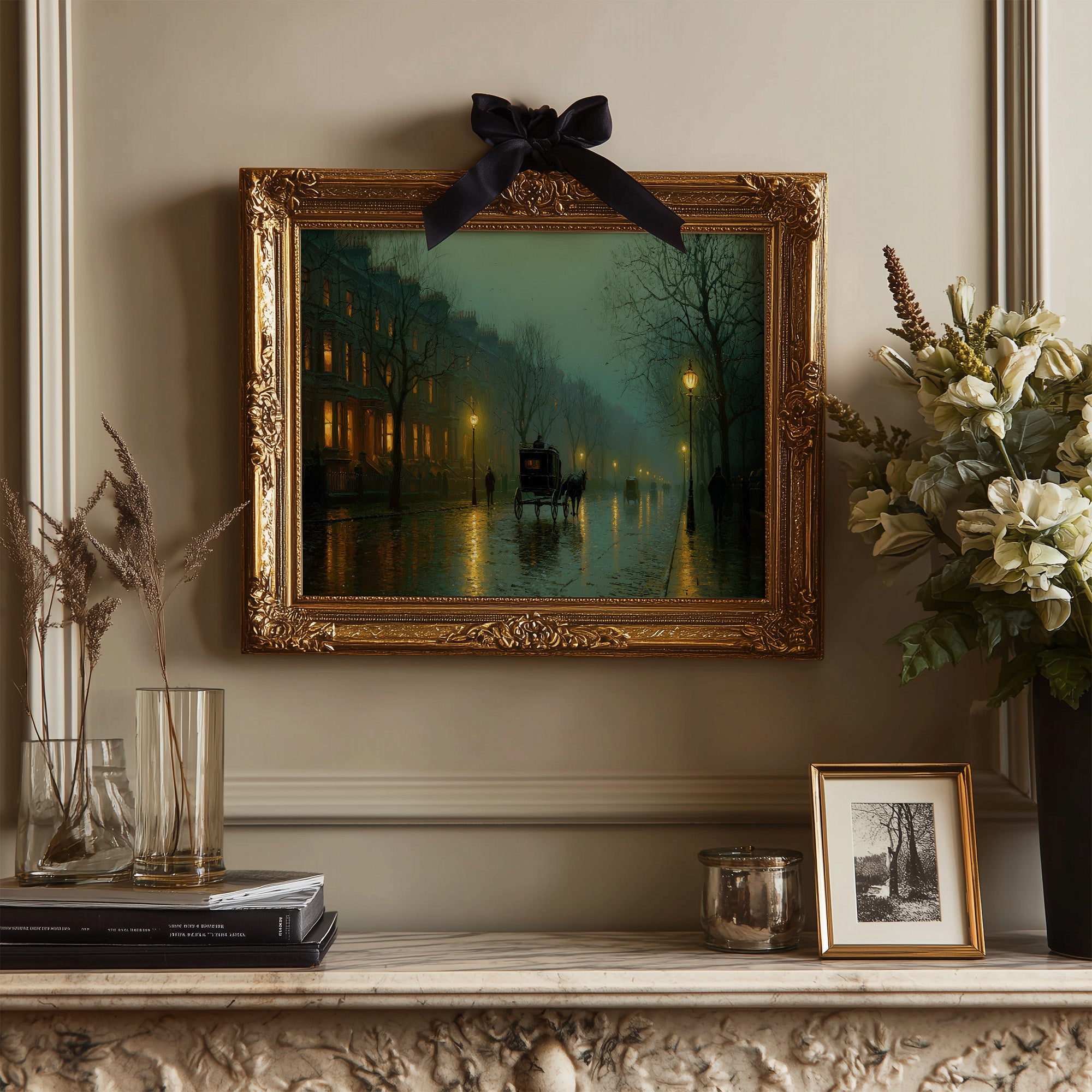 Lamplight pierces the emerald mist, creating golden pools upon rain-slicked cobblestones. A solitary carriage makes its way through the atmospheric haze, where grand townhouses stand sentinel with their warm windows glowing against the night. The painting captures that liminal moment where evening transforms into mystery, rendered in rich teal and amber tones that speak of nostalgia and quiet contemplation.