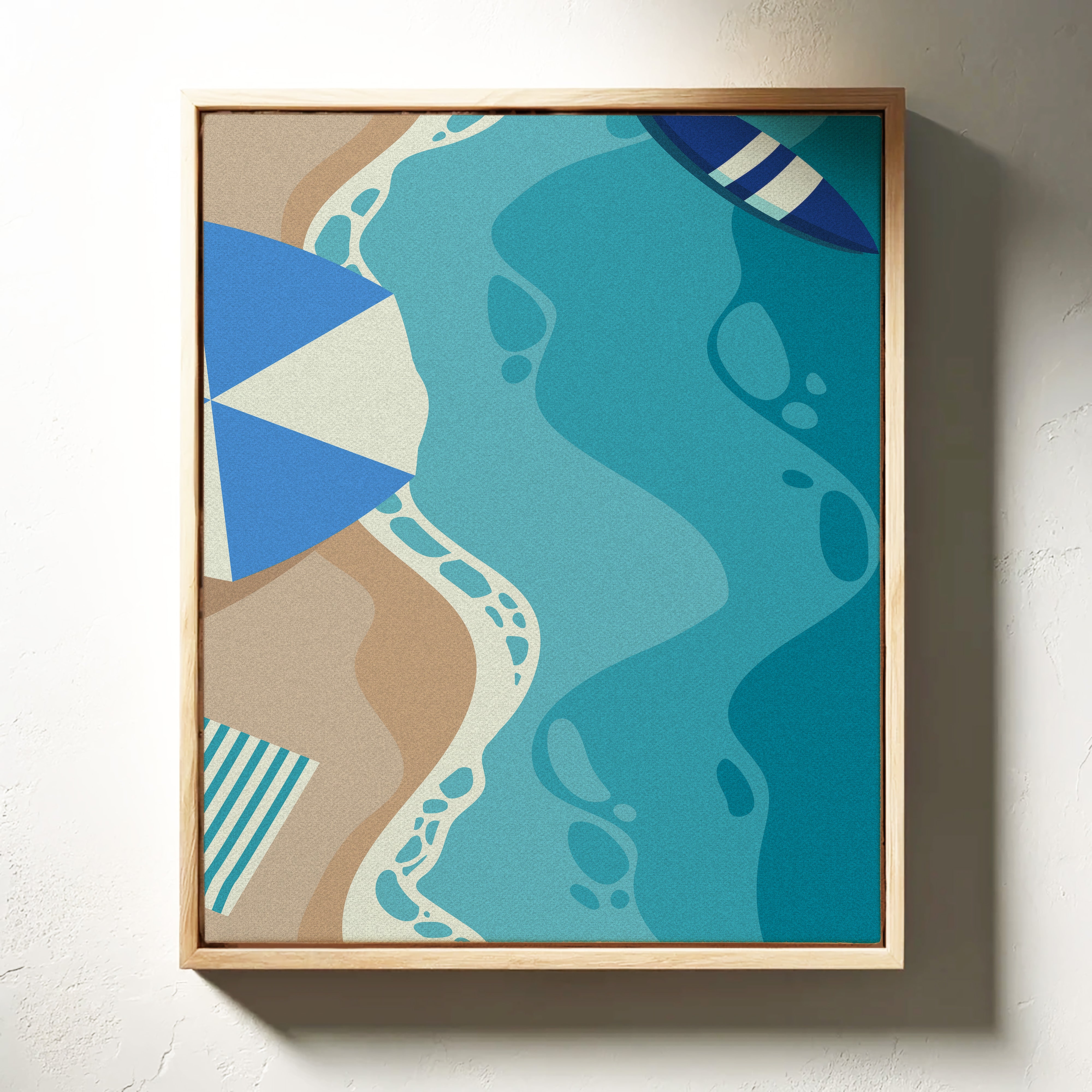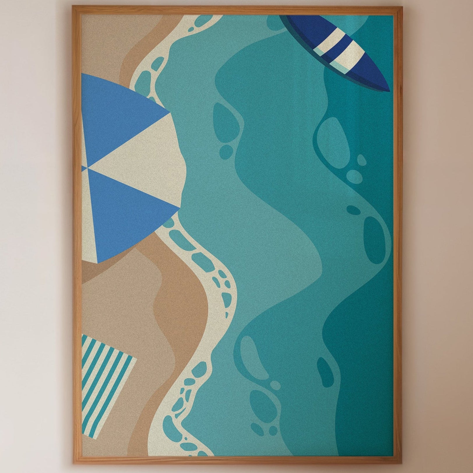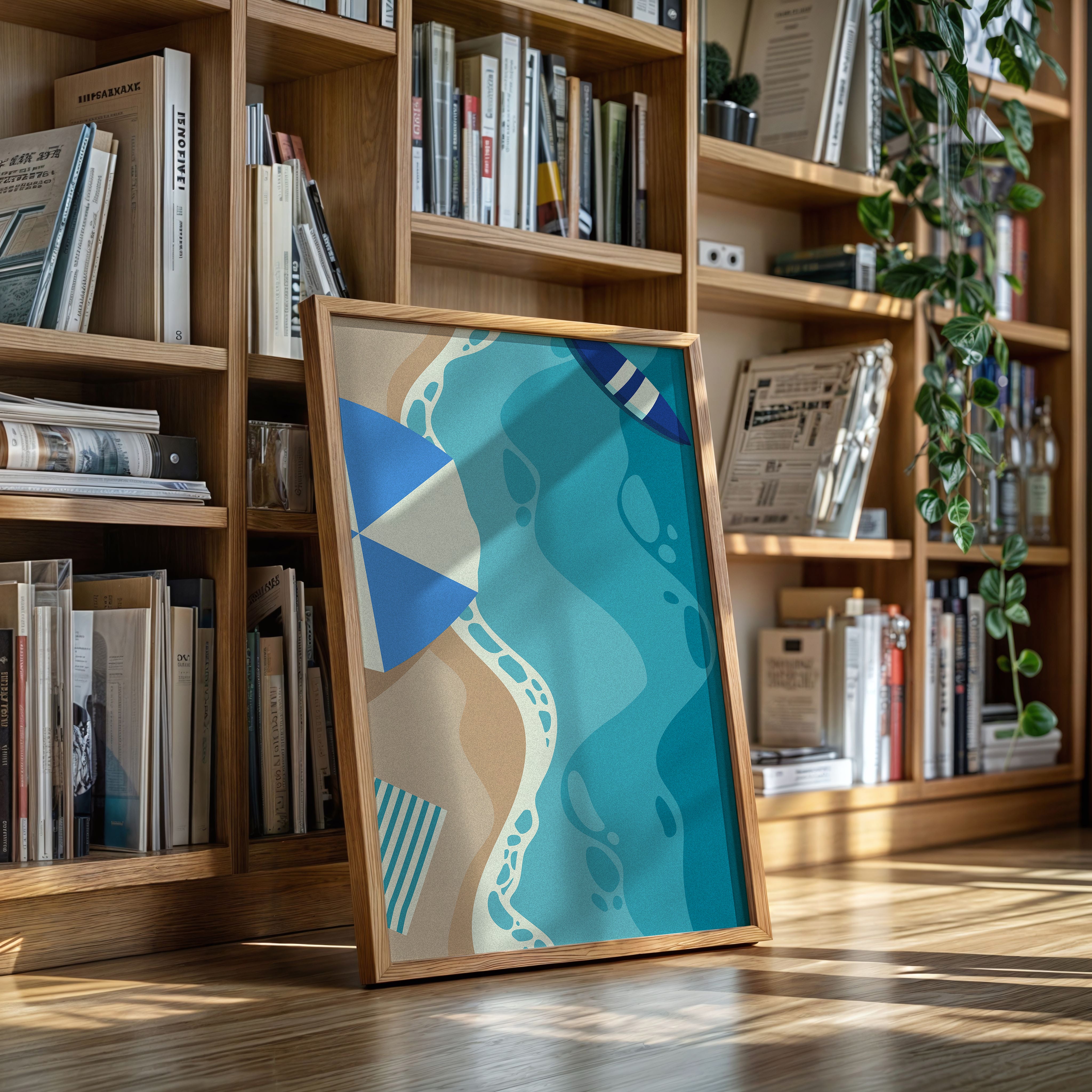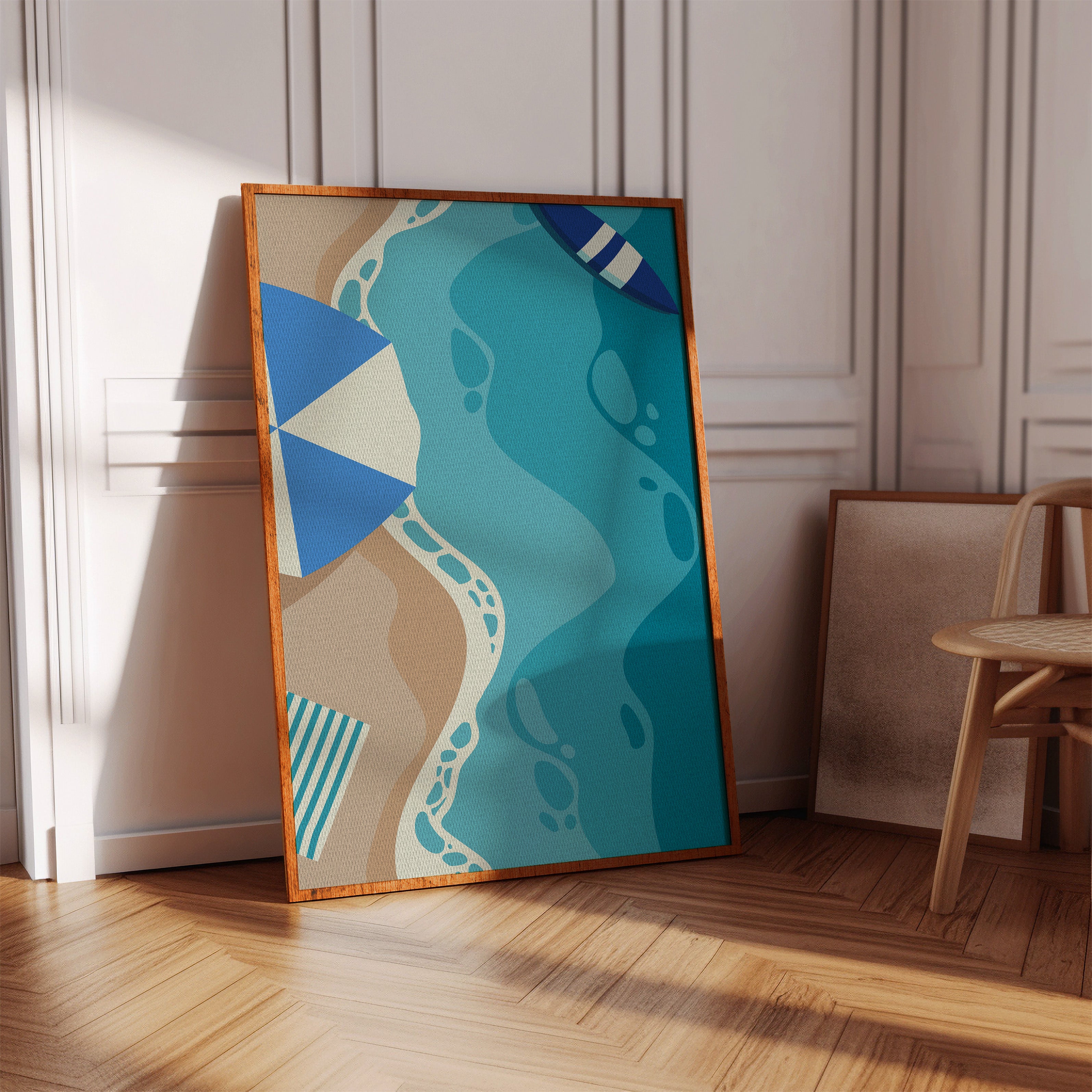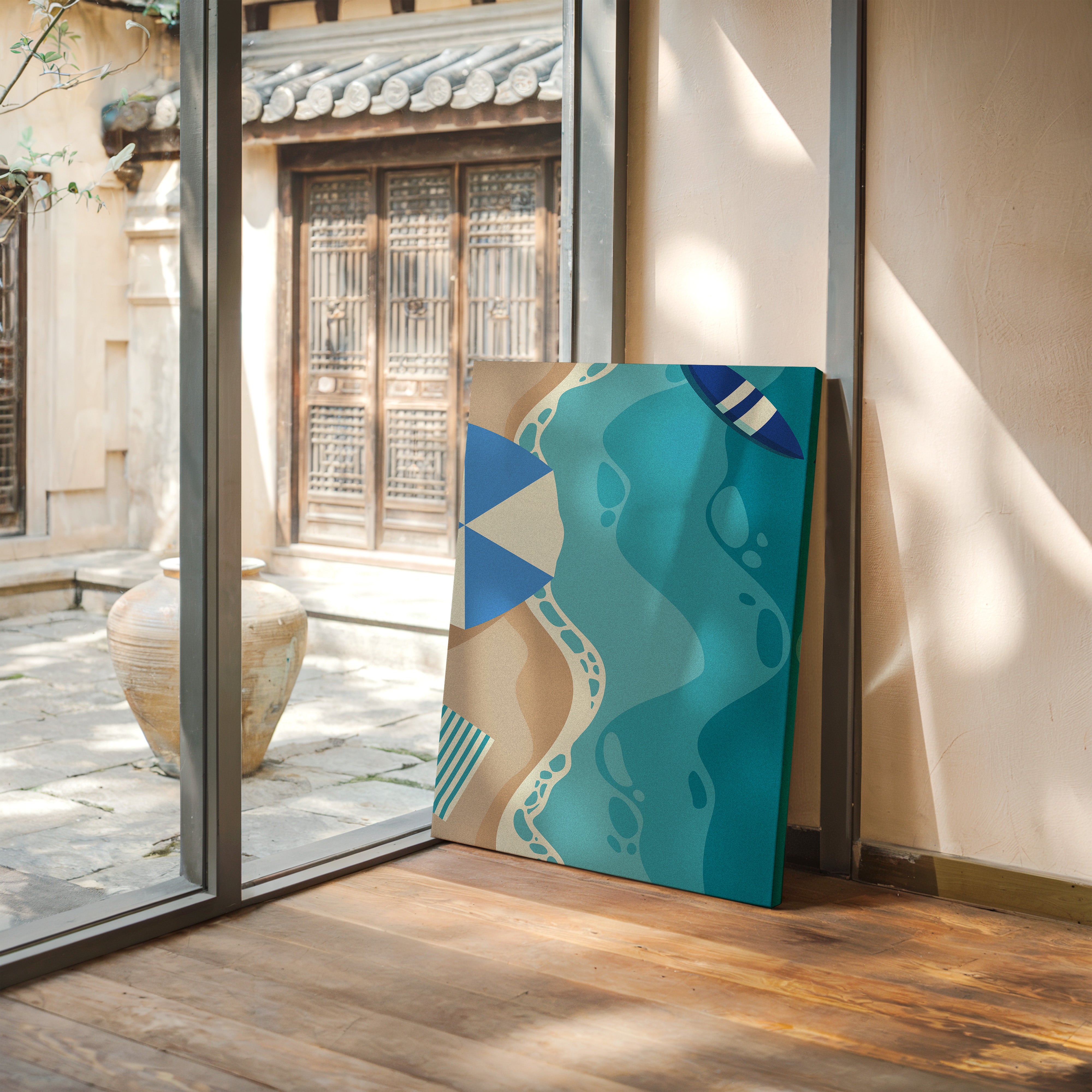 Gentle waves of turquoise and sand merge in an abstract dance, capturing the essence of a sun-soaked beach day. This contemporary piece from our coastal-inspired collection brings modern sophistication to seaside memories. Geometric shapes in navy and cream create playful contrast against flowing aqua forms, while subtle footprint patterns trace invisible journeys along imagined shores. The composition's organic movement suggests tides meeting sand, creating a peaceful rhythm that soothes the soul. Perfect for bringing a sense of coastal serenity to modern living spaces, especially in minimalist bedrooms or airy home offices where its calming presence can inspire daily reflection.
