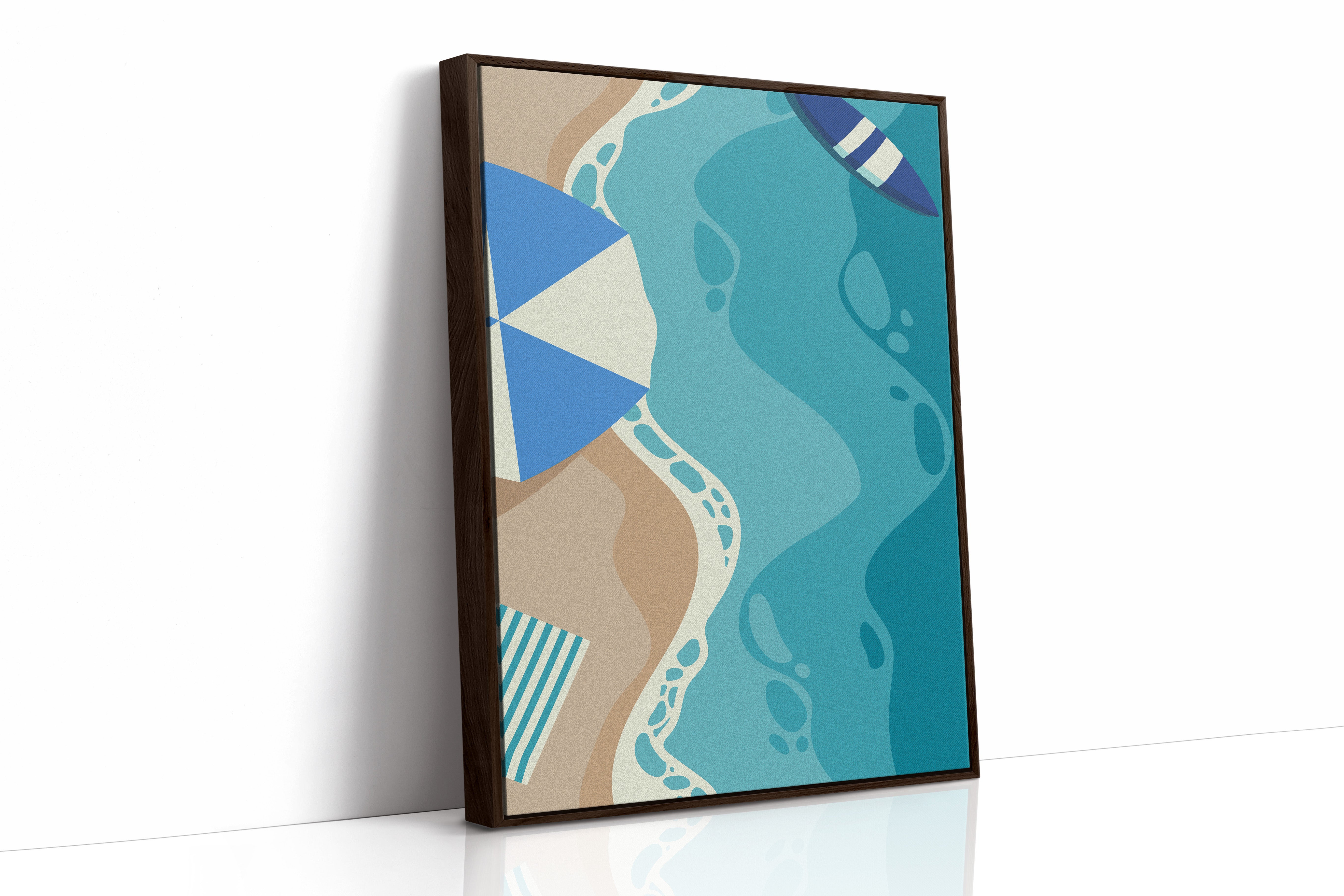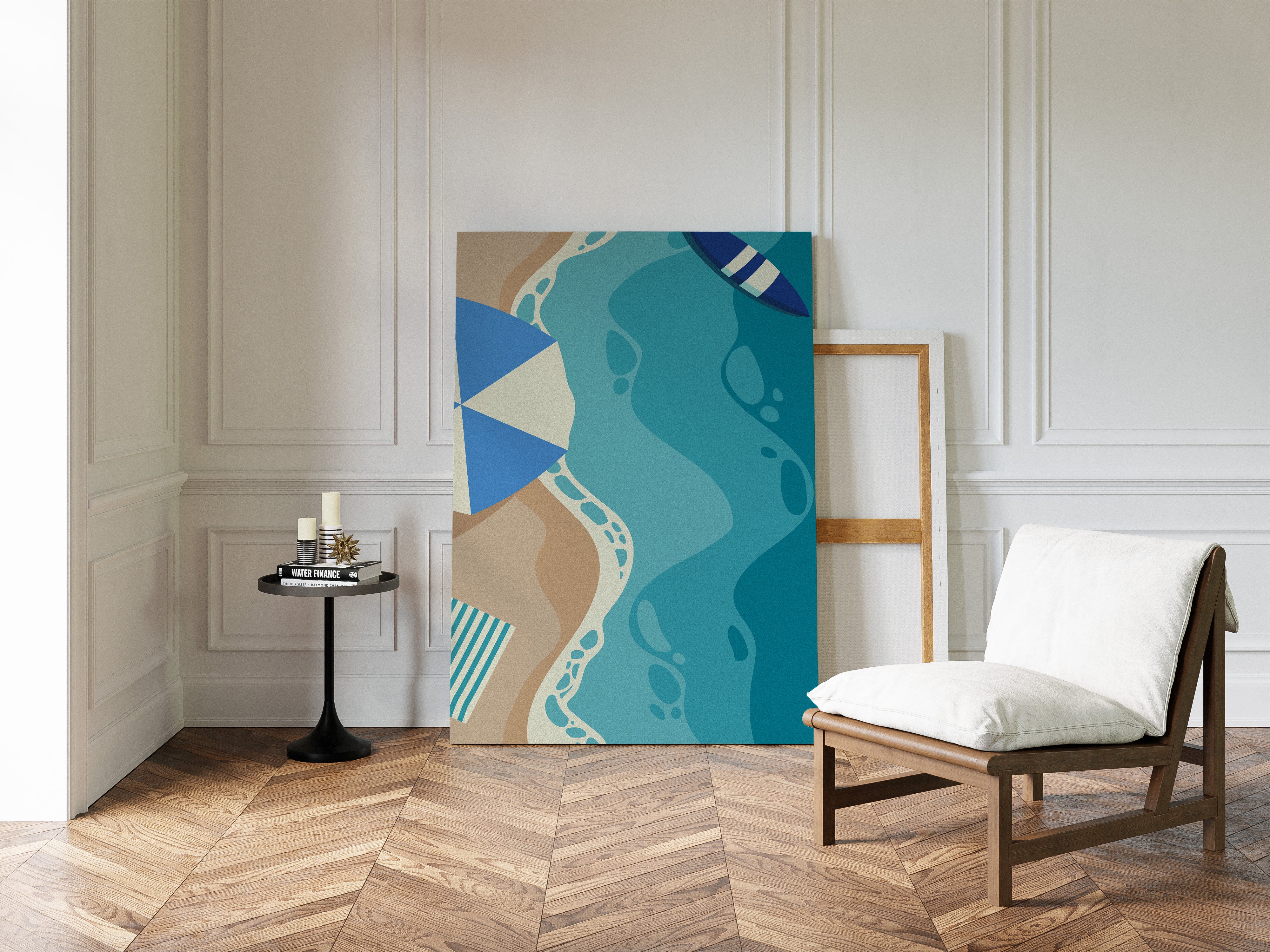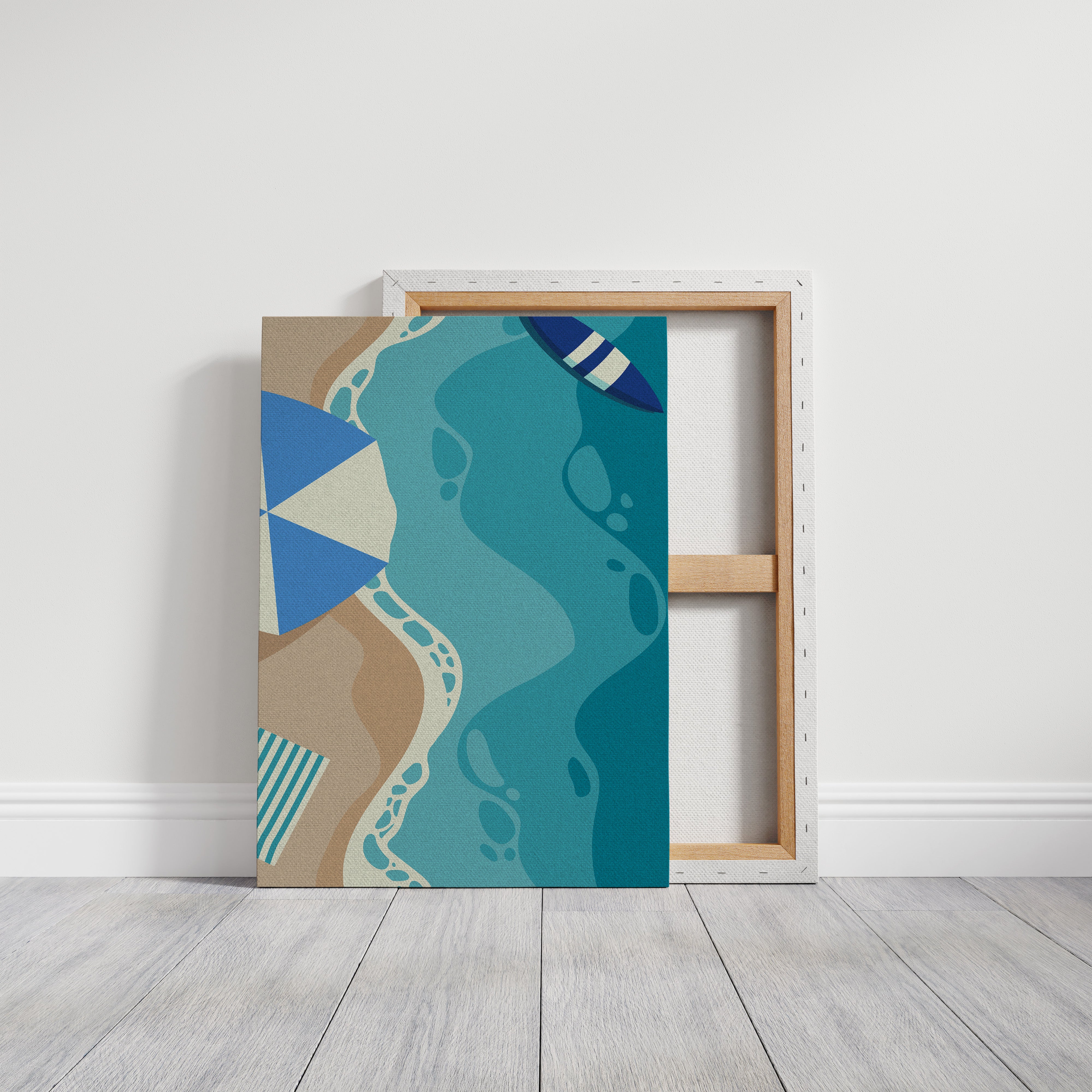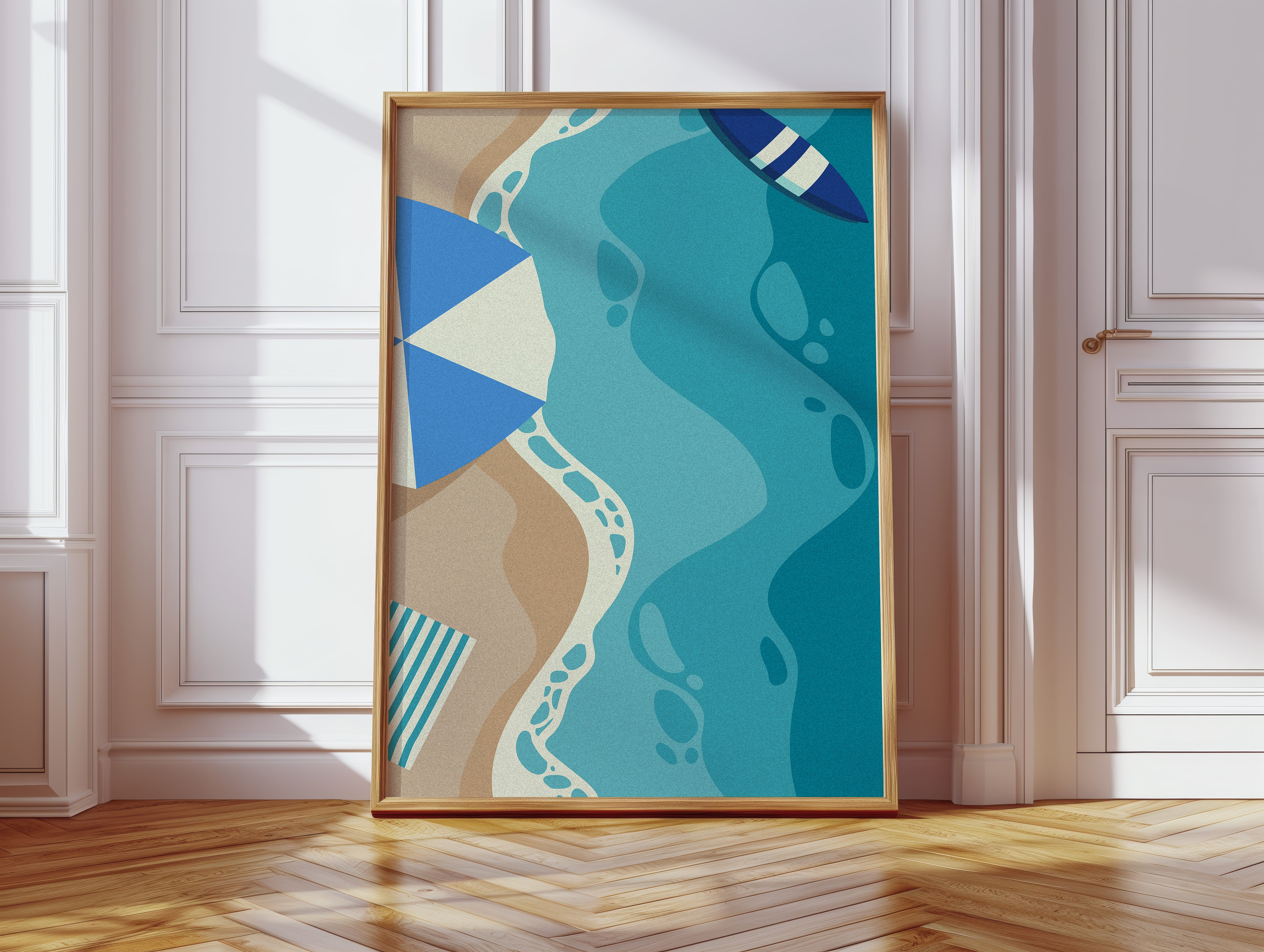 Gentle waves of turquoise and sand merge in an abstract dance, capturing the essence of a sun-soaked beach day. This contemporary piece from our coastal-inspired collection brings modern sophistication to seaside memories. Geometric shapes in navy and cream create playful contrast against flowing aqua forms, while subtle footprint patterns trace invisible journeys along imagined shores. The composition's organic movement suggests tides meeting sand, creating a peaceful rhythm that soothes the soul. Perfect for bringing a sense of coastal serenity to modern living spaces, especially in minimalist bedrooms or airy home offices where its calming presence can inspire daily reflection.