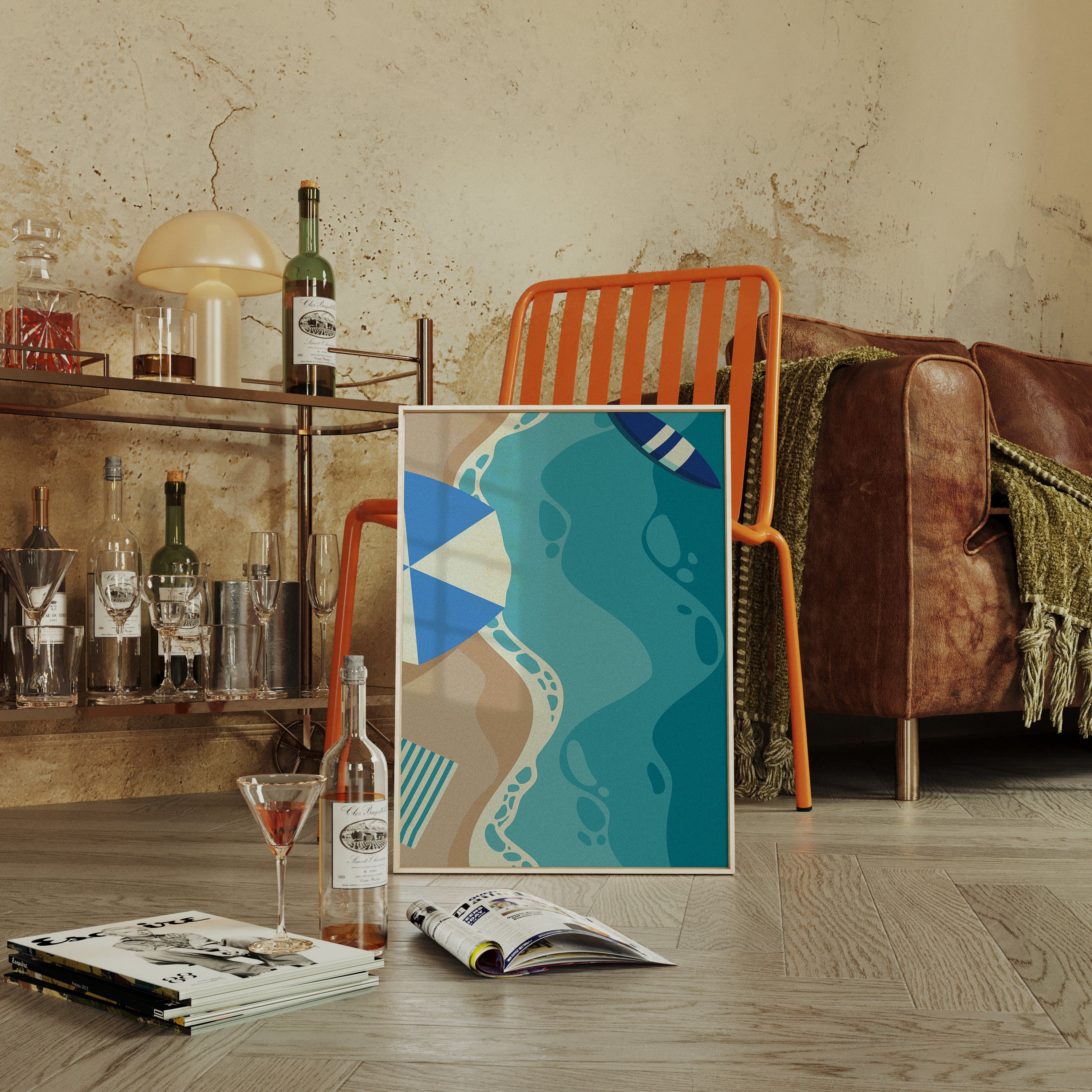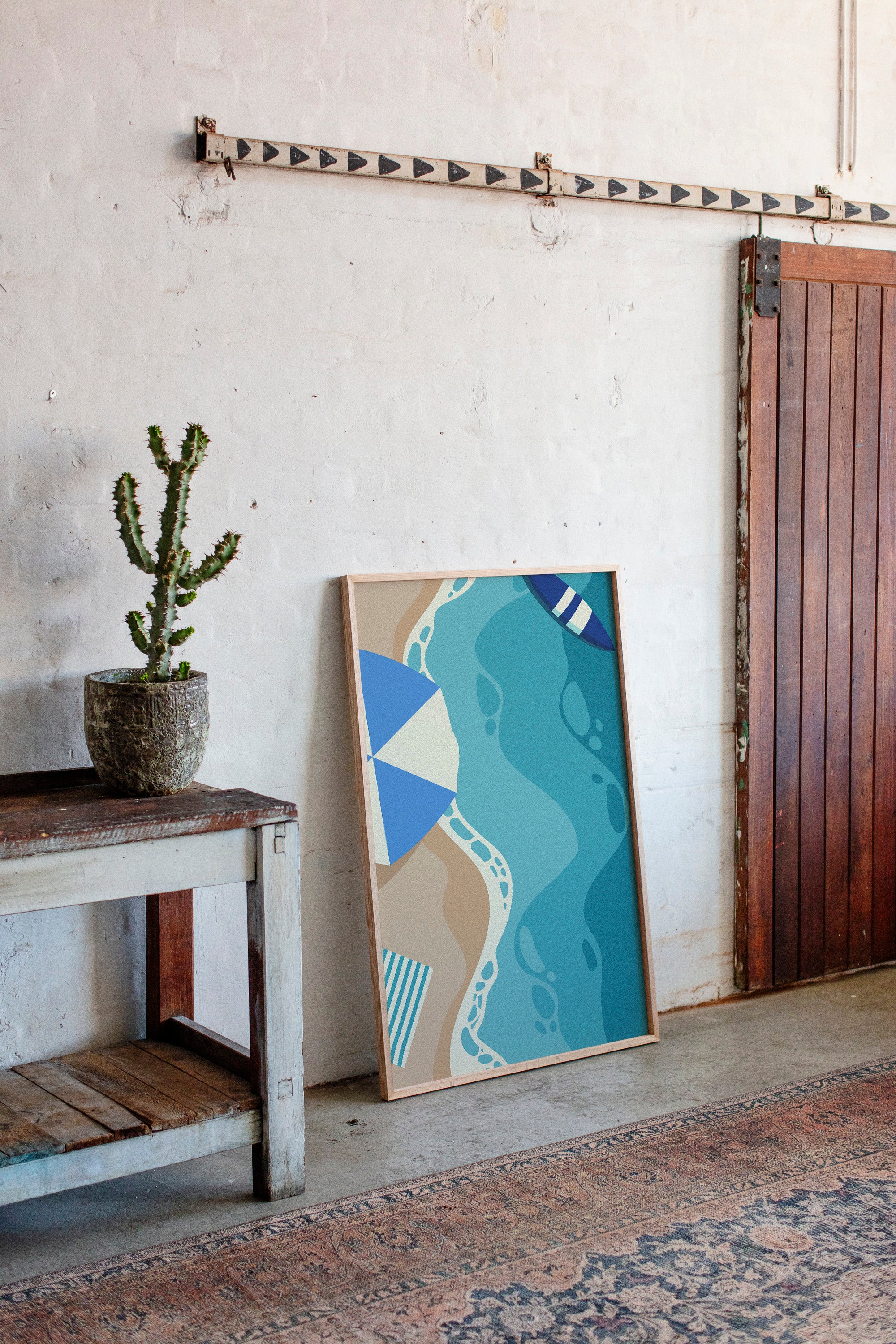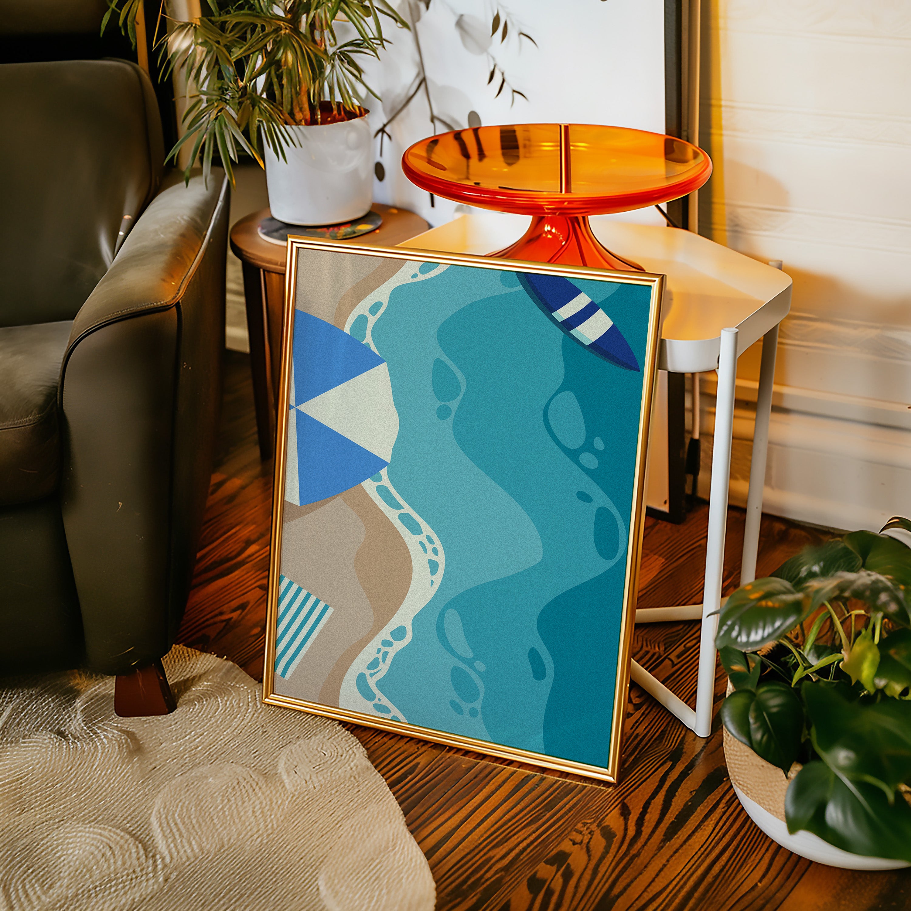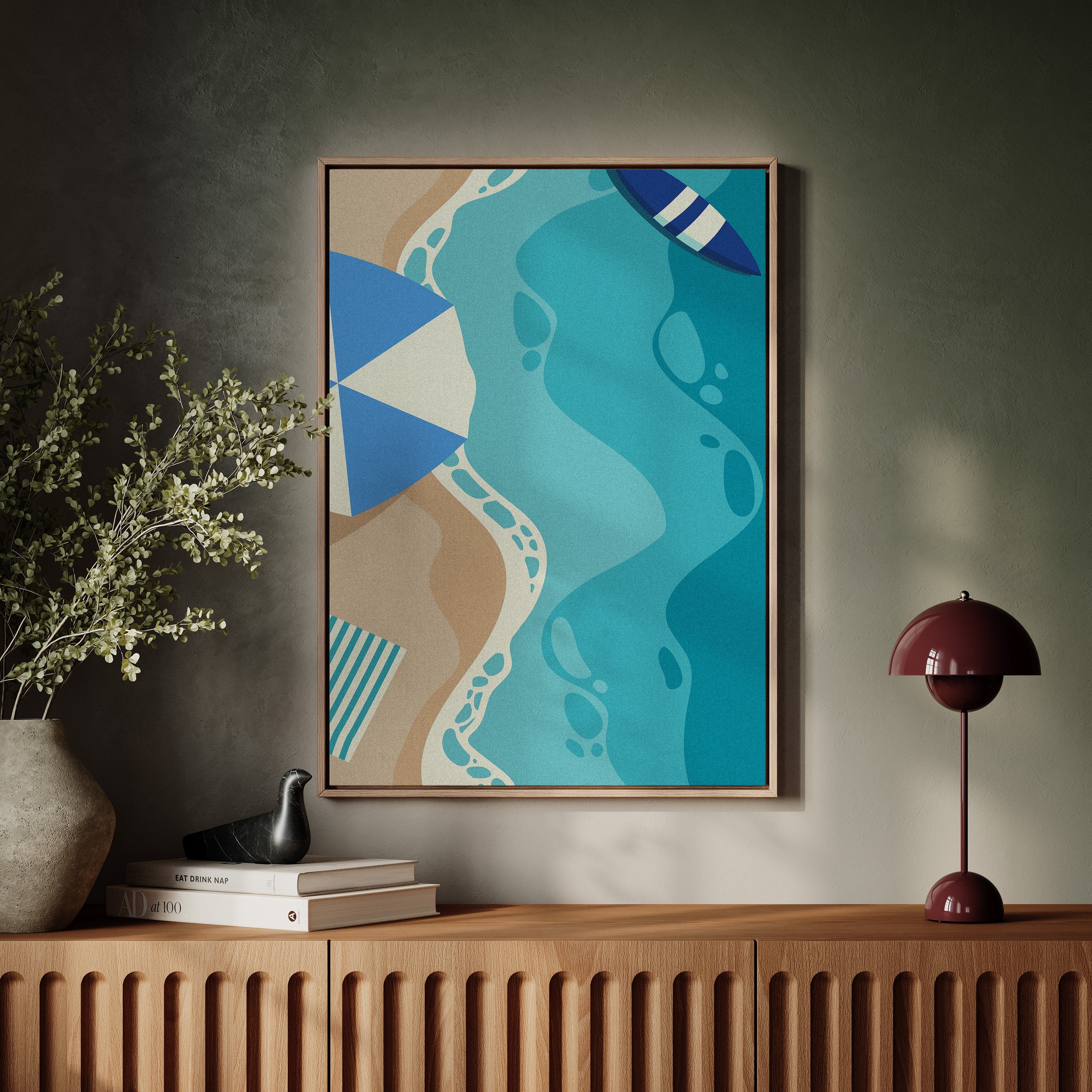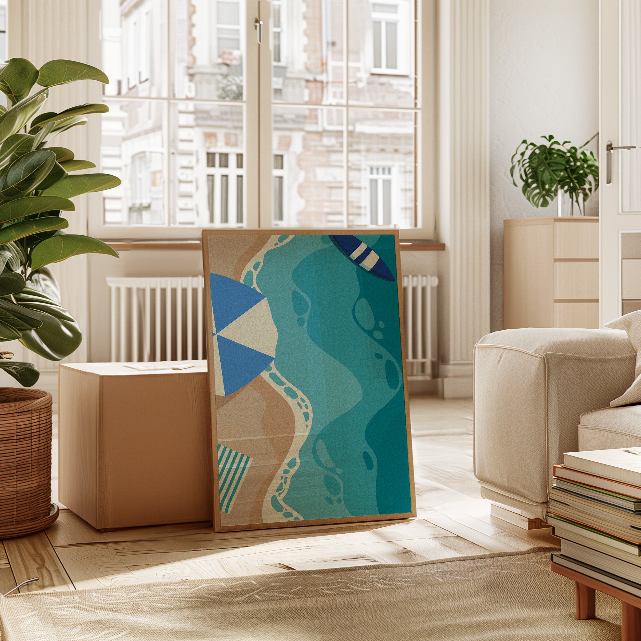 Gentle waves of turquoise and sand merge in an abstract dance, capturing the essence of a sun-soaked beach day. This contemporary piece from our coastal-inspired collection brings modern sophistication to seaside memories. Geometric shapes in navy and cream create playful contrast against flowing aqua forms, while subtle footprint patterns trace invisible journeys along imagined shores. The composition's organic movement suggests tides meeting sand, creating a peaceful rhythm that soothes the soul. Perfect for bringing a sense of coastal serenity to modern living spaces, especially in minimalist bedrooms or airy home offices where its calming presence can inspire daily reflection.
