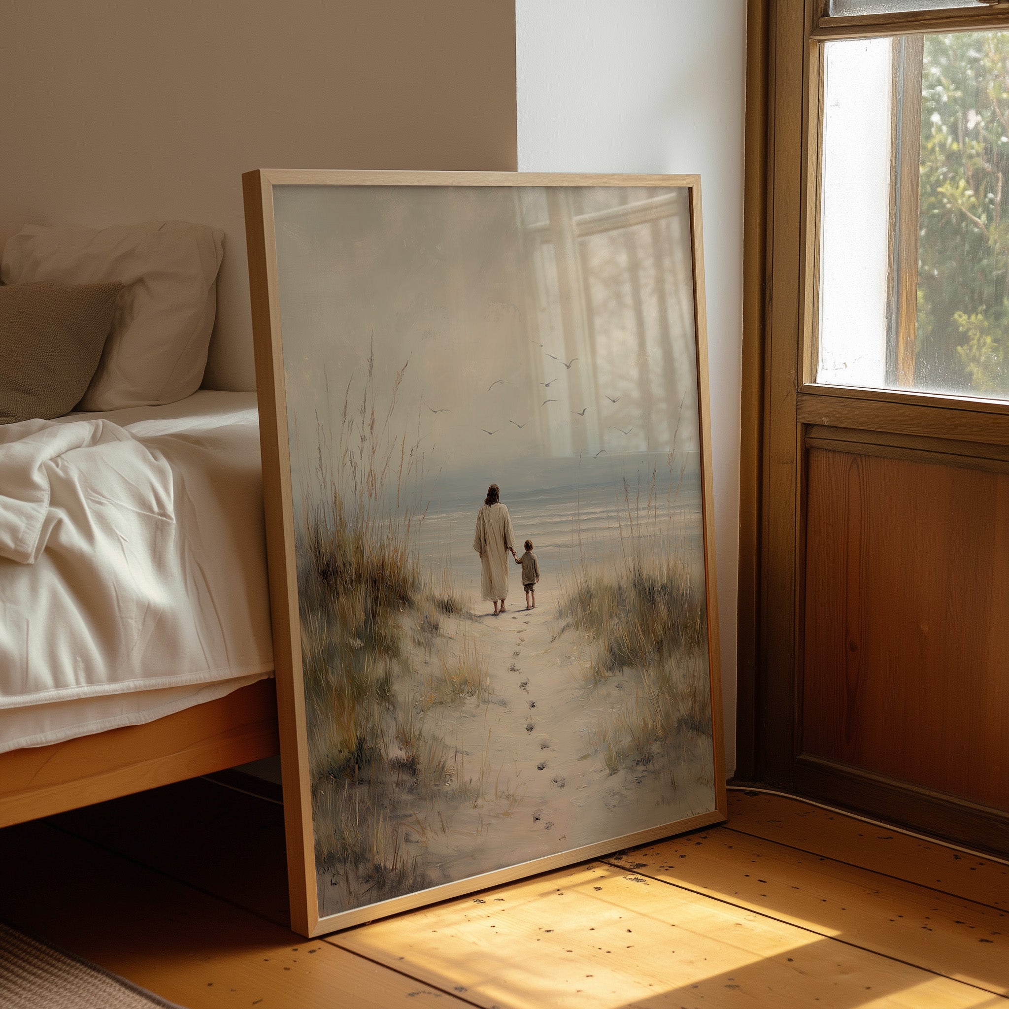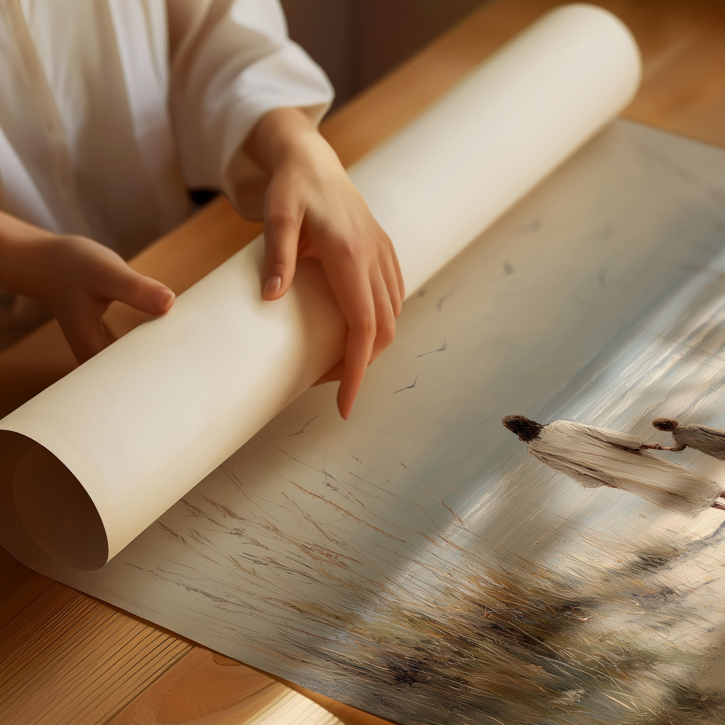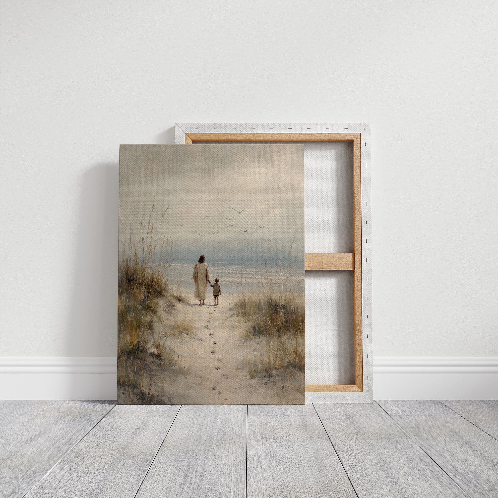 Gentle morning light bathes the sandy path where two figures walk hand in hand toward the endless horizon. Coastal grasses sway in the salt-tinged breeze, framing their journey through dunes that have witnessed countless stories. The muted palette of ivory, soft blue, and wheat creates a timeless scene of connection between generations, their footprints trailing behind as testament to shared moments. This serene coastal narrative brings tranquil elegance to living rooms or bedrooms where quiet contemplation is treasured.